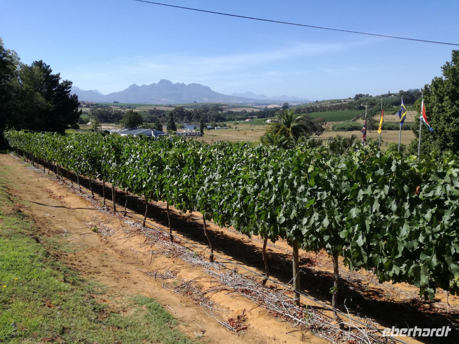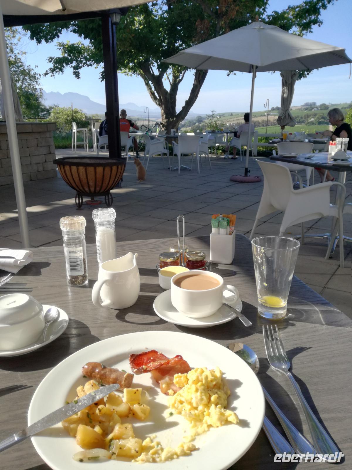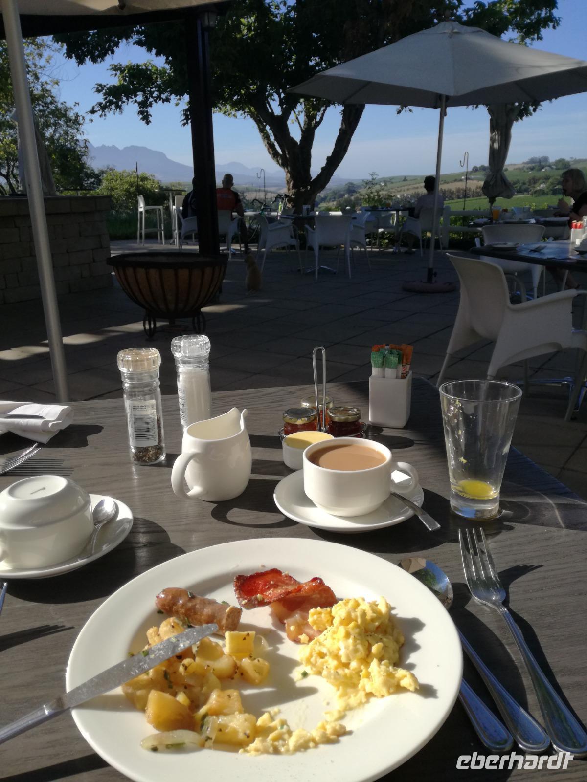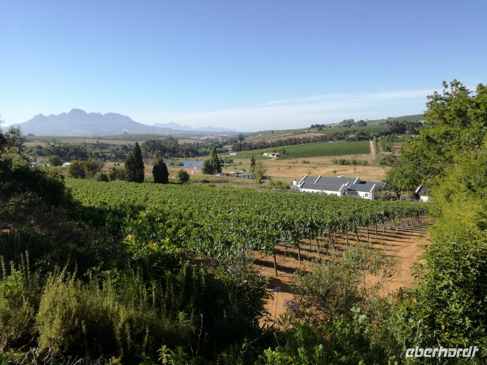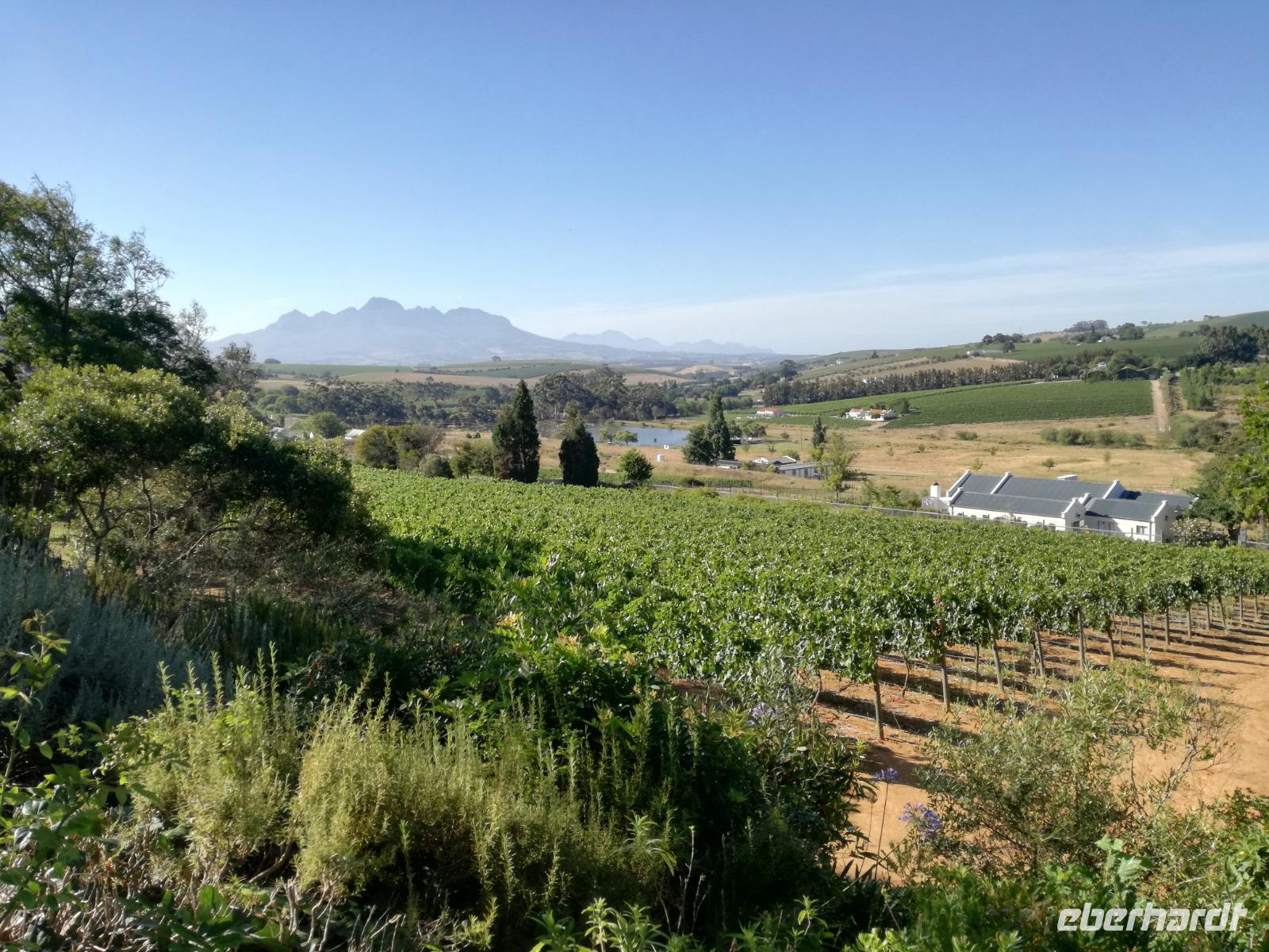 Am Morgen genossen wir erstmal das leckere Frühstück auf der Terrasse unseres Hotels mit Blick auf die wundervolle Landschaft und den Weinfeldern. Unser erster Tagespunkt war das bezaubernde Örtchen Franschhoeck. Übersetzt bedeutet der Name „Französisches Eck". Der Ort wurde im Jahr 1688 von den Hugenotten gegründet. Die Hugenotten wurden in Frankreich wegen ihrer calvinistisch-protestantischen verfolgt und nahmen die Einladung der Holländer nach Südafrika zukommen gerne an. Hier am Kap wurde die fleißigen und kenntnisreichen Siedler sesshaft und förderten durch ihr Wissen den Weinanbau der Region. Das Örtchen Franschhoeck bietet neben den Denkmal für die Hugenotten, unzählige Cafés, kleine Geschäfte und Restaurant. Nach einem ausgiebigen Bummel durch das romantische Örtchen, fuhren wir zum Weingut Blauklippen. Sonntags befindet sich hier ein Bauernmarkt mit vielen Zelten und Spielwiesen für die Kinder. Zunächst schauten wir uns um, bevor unsere Weinprobe und Kellertour begann. Eine Angestellte des Gutes führte an herum und erklärte uns die Geschichte des Gutes, des Herrenhauses und des Weines. Im Keller beschrieb sie uns die einzelnen Vorgänge des Weines und die einzelnen Fässer des Gutes. Anschließend durften wir die einzelnen Weine verkosten und ein leckeres Mittagessen verspeisen. Nach dem schönen Aufenthalt auf dem Weingut machten wir uns auf dem Weg nach Stellenbosch. Stellenbosch wurde 1679 gegründet und gilt als zweitälteste Stadt des Landes. Vor allem wurde das Land aufgrund des fruchtbaren Landes entlang des Eerste Rivers gegründet. Viele Häuser sind noch heute im Kolonialstil gebaut und erhalten. Hier ließ uns leider das Heimatmuseum im Stich und hatte trotz Absprache geschlossen. Wir spazierten durch die Holländisch geprägte Stadt. Hier gibt es unter anderem eine Universität mit vielen ausländischen Studenten und viele kleinere Weingüter und Restaurants. Den Nachmittag stand im Zeichen von Kraft tanken am Hotelpool und Schlaf vom Nachtflug nachholen. Am Abend organisierten wir uns einen Transfer zurück nach Stellenbosch. Hier aßen wir im ausgezeichneten Restaurant Wijnhuis zu Abend und probierte weitere Weine oder das heimische Bier. Gesättigt, zufrieden und müde fuhren wir zurück in unser Hotel.