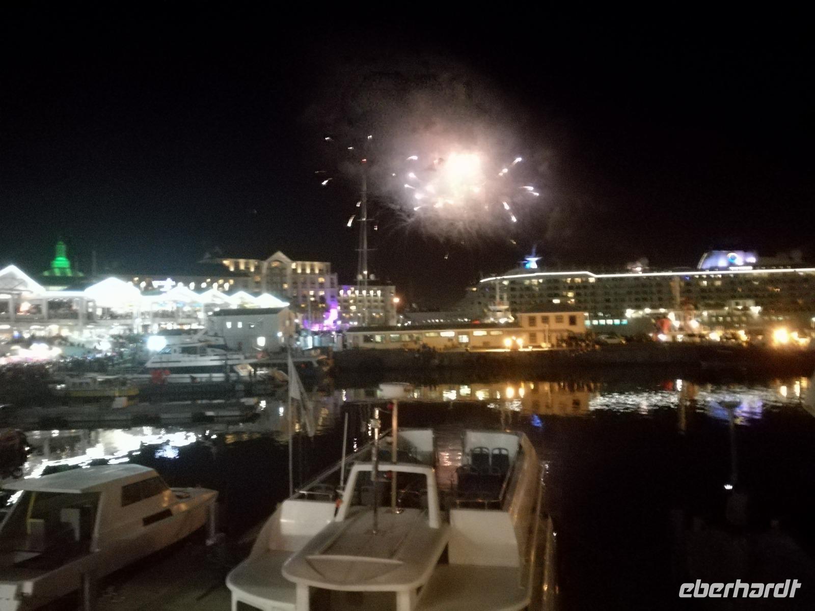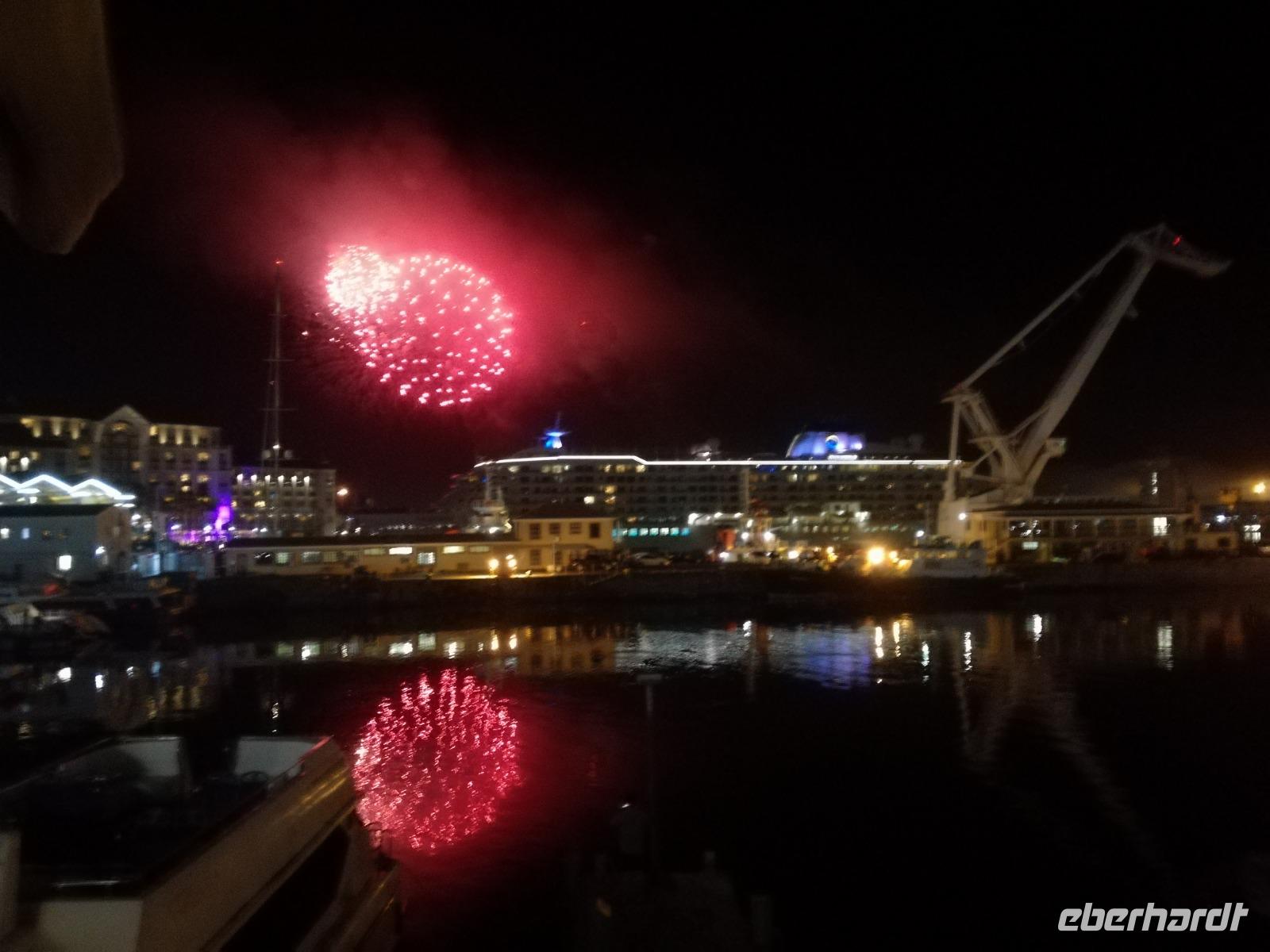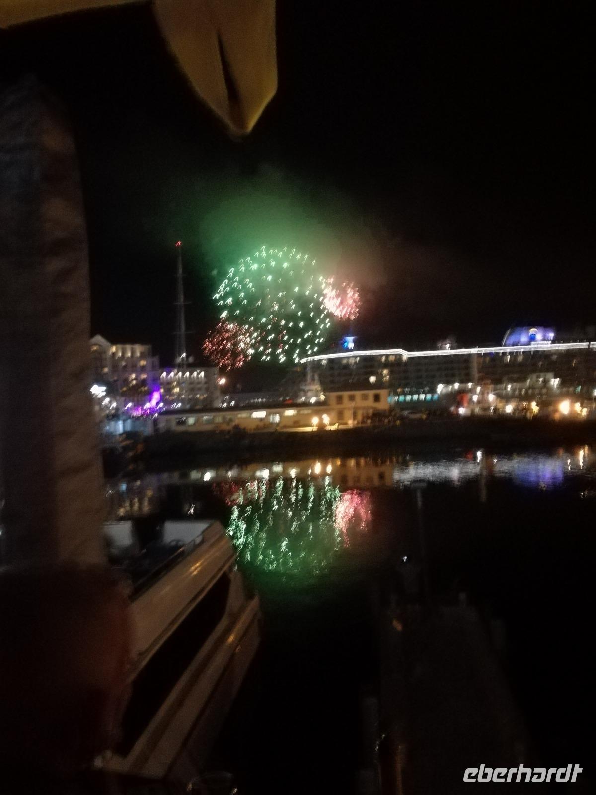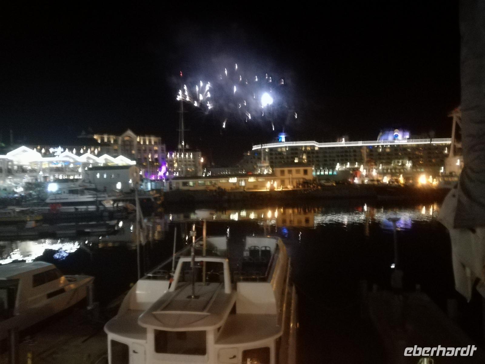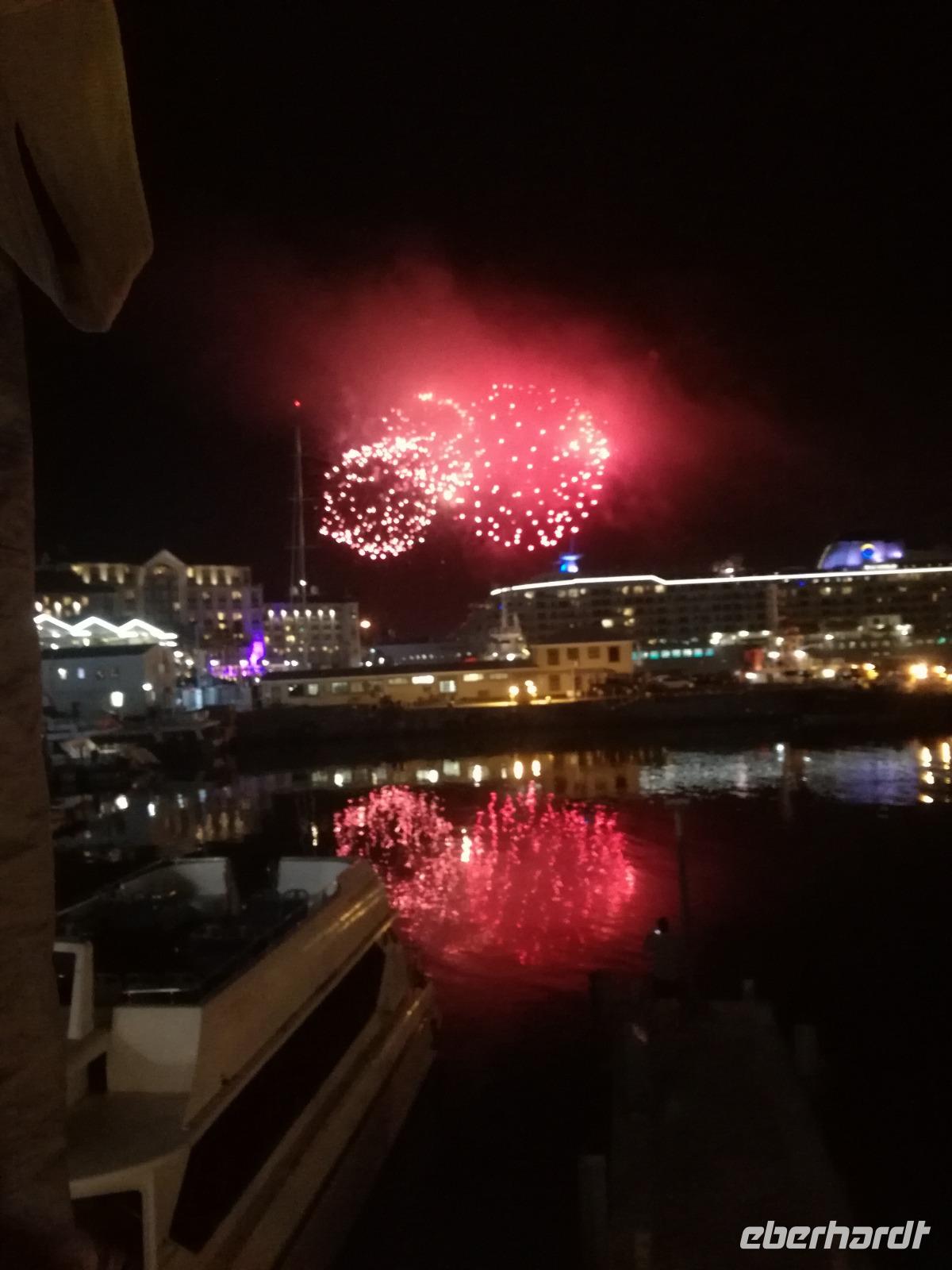 Der letzte Tag des Jahres wurde wieder mit einem ausgiebigen Frühstück gestartet. Zügig machten wir uns auf dem Weg in Richtung Kapstadt. Heute hatten wir uns fest vorgenommen, den Tafelberg zu erklimmen. Unterhalb des Berges erwartete uns wieder eine größere Schlange. Aber wir waren ja vorbereitet. Während ich mich in der Schlange anstellte, besuchte die restliche Gruppe mitsamt unserem örtlichen Guide Herbie den Signal Hill. Nach dem Tafelberg ist der Signal Hill der bekannteste Aussichtspunkt der Stadt. Von hier aus hatten wir einen tollen 360 Grad Rundblick über die Stadt, Camps Bay und auf dem Tafelberg. Hier gab es genügend Zeit für unzählige Bilder und wir genossen das Wetter und den Blick. Zurück am Tafelberg angekommen, hatte ich mich in der Zeit bis fast nach vorne gearbeitet. Inzwischen war hier ein Radiosender stationiert und sorgte für gute Musik und eine feierliche Stimmung. Das erleichterte uns die letzten Meter bis zur Seilbahn. In der sich drehenden Seilbahn konnte jeder die Aussicht auf den Berg und auf die Stadt genießen. Die Fahrt mit der Seilbahn dauerte ca. 15 Minuten und wir erreichten die Station des Tafelberges auf 1.087 Meter Höhe. Neben dem guten Wetter empfang uns der Tafelberg auch mit einem fantastischen Blick auf Kapstadt, dem neuen Stadion das zur WM errichtet wurde, den Nachbarberg Lions Head, Robben Island (die Insel vor der Stadt, wo Nelson Mandela inhaftiert wurde), die Waterfront und Camps Bay, der Umgebung der Südafrikanischen Hauptstadt. Nach unserem ausführlichen und heißen Aufenthalt auf den Tafelberg, stellten wir uns wieder in der Schlange an und fuhren wir wieder mit der Seilbahn hinunter. Da es nun Nachmittag war fuhren wir in unser Hotel, direkt an der Waterfront von Kapstadt. Nach dem Check-In verabredeten wir uns für einen Spaziergang zur Waterfront. Hier angekommen aßen wir zunächst in einer ausgebauten Lagerhalle im Foodcorner heimische Snacks und stimmten uns auf die Neujahrsfeier ein. Im Anschluss gab es genügend Zeit, um sich für den Abend zu schonen, recht zu machen oder die Waterfront zu genießen. Am Abend machten wir uns auf zu unserem Hotel Four Quay an der Waterfront. Das Restaurant hatte sich heraus geputzt und auch unsere Tische waren für die Feier geschmückt. Wir genossen den Abend in einer herrlichen Atmosphäre. Bei ausreichend Wein, Bier und Amarula ließen wir den letzten Abend des Jahres ausklingen. Um Mittagnacht zog es uns auf den Balkon des Hotels und stießen mit Sekt auf das neue Jahr an. Das Feuerwerk an der Waterfront war sehr spektakulär und die Stimmung hervorragend. Auch das Personal feierte mit uns und freute sich auf neue Jahr. Dann wurden die beiden Tische zusammen geschoben und wir feierten noch ein wenig ins Jahr 2019. Auf dem Weg zum Hotel spazierten wir nochmal durch das Viertel und bestaunten die Einheimischen Südafrikaner, wie sie locker leicht singend und tanzend ins neue Jahr feierten. Ein schöner Tag mit einem super Jahresausklang ging nun zu Ende.
