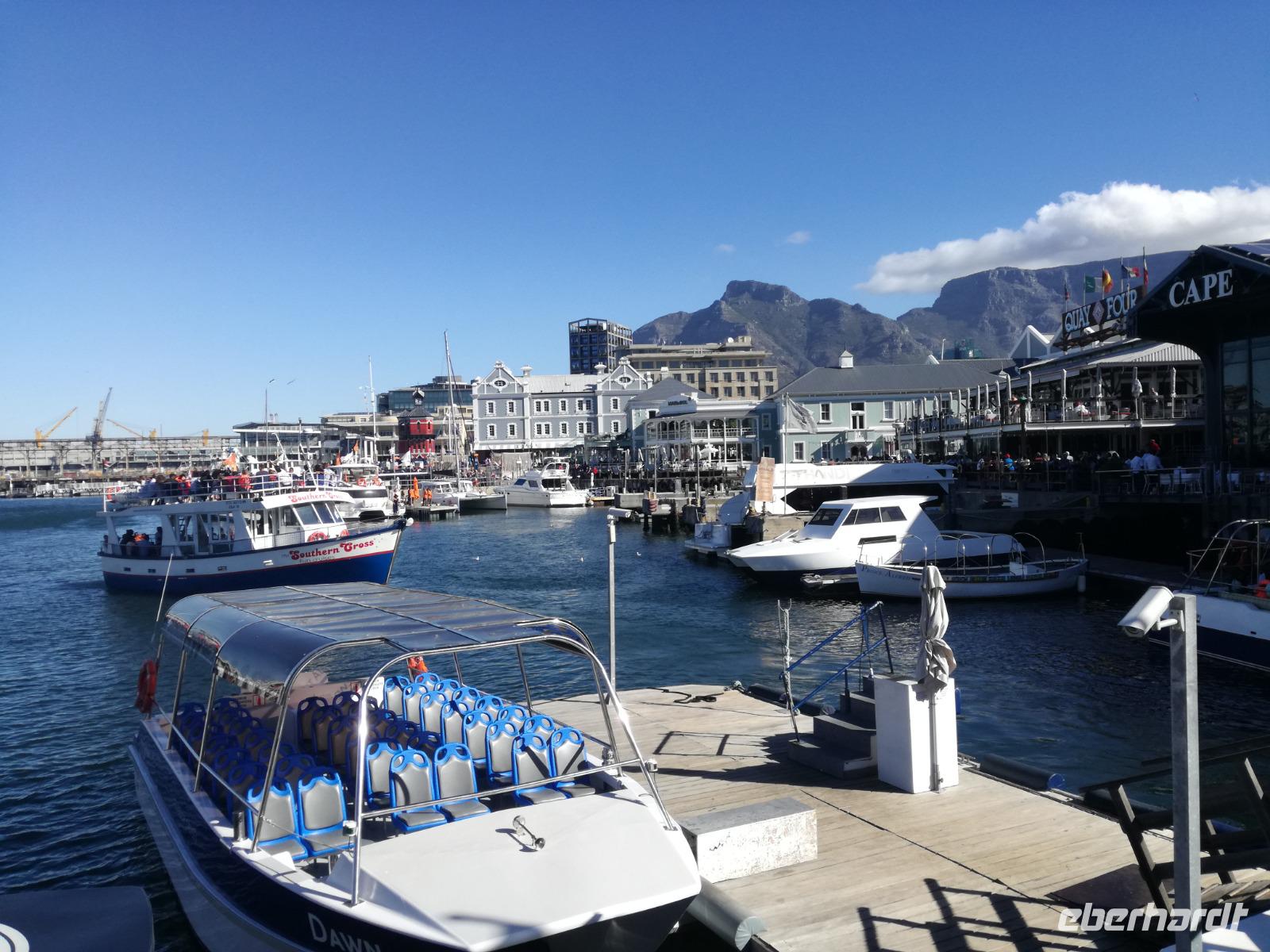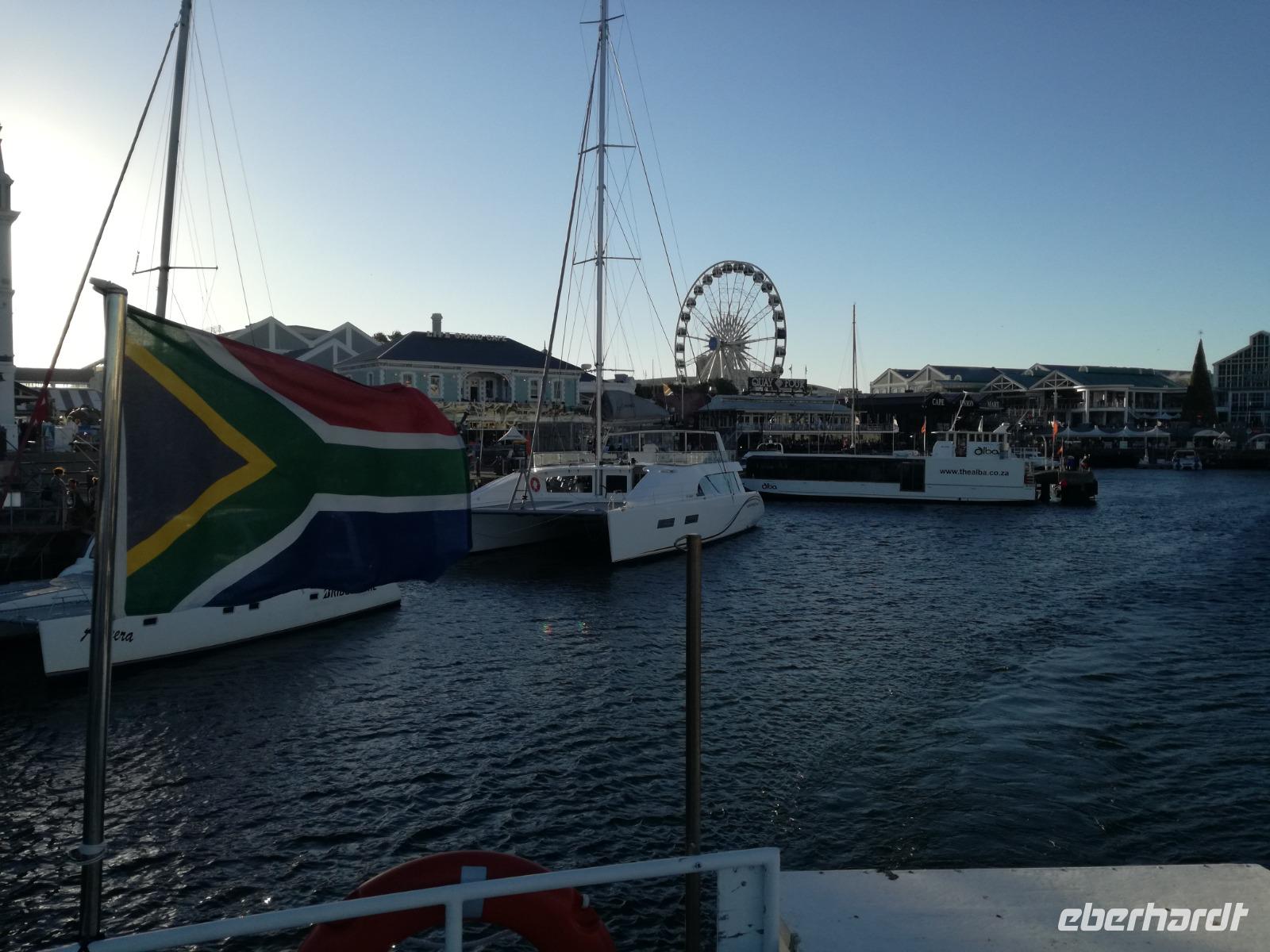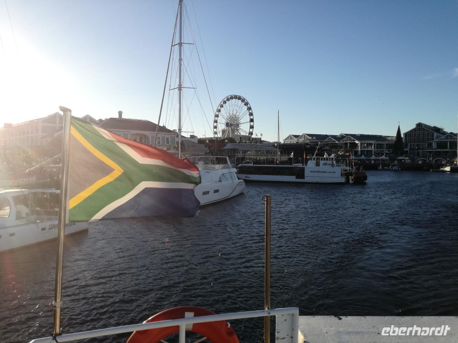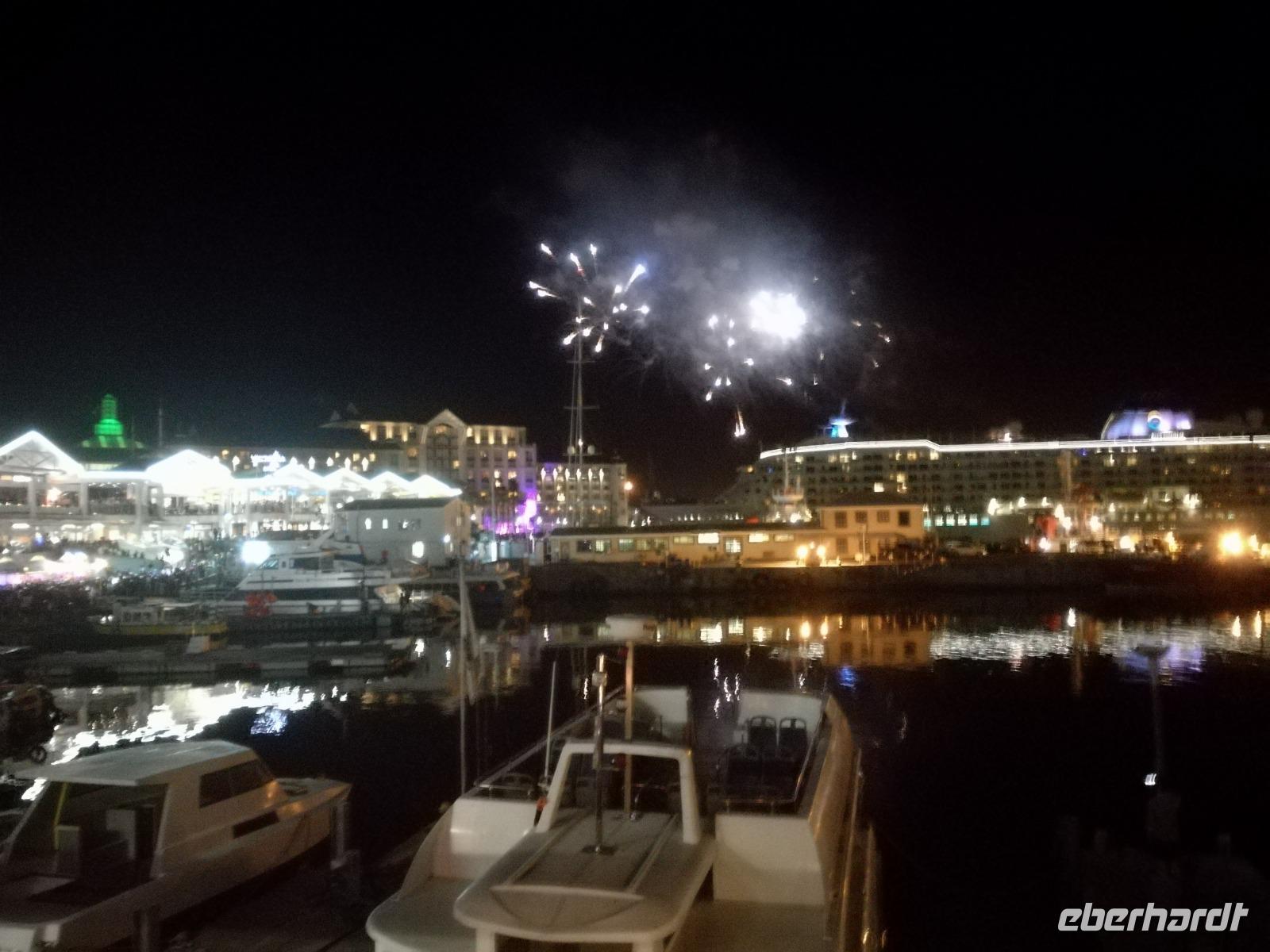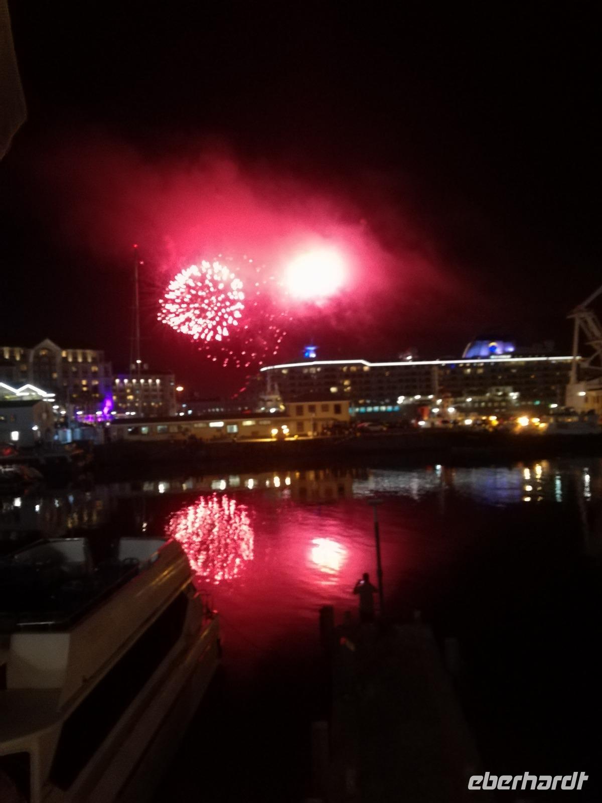 Der letzte Tag des Jahres wurde wieder mit einem ausgiebigen Frühstück gestartet. Zügig machten wir uns auf dem Weg in Richtung Kapstadt. Heute hatten wir uns fest vorgenommen, den Tafelberg zu erklimmen. Unterhalb des Berges erwartete uns wieder eine größere Schlange. Aber wir waren ja vorbereitet. Während ich mich in der Schlange anstellte, besuchte die restliche Gruppe mitsamt unserem örtlichen Guide Herbie den Signal Hill. Nach dem Tafelberg ist der Signal Hill der bekannteste Aussichtspunkt der Stadt. Von hier aus hatten wir einen tollen 360 Grad Rundblick über die Stadt, Camps Bay und auf dem Tafelberg. Hier gab es genügend Zeit für unzählige Bilder und wir genossen das Wetter und den Blick. Zurück am Tafelberg angekommen, hatte ich mich in der Zeit bis fast nach vorne gearbeitet. Inzwischen war hier ein Radiosender stationiert und sorgte für gute Musik und eine feierliche Stimmung. Das erleichterte uns die letzten Meter bis zur Seilbahn. In der sich drehenden Seilbahn konnte jeder die Aussicht auf den Berg und auf die Stadt genießen. Die Fahrt mit der Seilbahn dauerte ca. 15 Minuten und wir erreichten die Station des Tafelberges auf 1.087 Meter Höhe. Neben dem guten Wetter empfang uns der Tafelberg auch mit einem fantastischen Blick auf Kapstadt, dem neuen Stadion das zur WM errichtet wurde, den Nachbarberg Lions Head, Robben Island (die Insel vor der Stadt, wo Nelson Mandela inhaftiert wurde), die Waterfront und Camps Bay, der Umgebung der Südafrikanischen Hauptstadt. Nach unserem ausführlichen und heißen Aufenthalt auf den Tafelberg, stellten wir uns wieder in der Schlange an und fuhren wir wieder mit der Seilbahn hinunter. Da es nun Nachmittag war fuhren wir in unser Hotel, direkt an der Waterfront von Kapstadt. Nach dem Check-In verabredeten wir uns für einen Spaziergang zur Waterfront. Hier angekommen aßen wir zunächst in einer ausgebauten Lagerhalle im Foodcorner heimische Snacks und stimmten uns auf die Neujahrsfeier ein. Im Anschluss gab es genügend Zeit, um sich für den Abend zu schonen, recht zu machen oder die Waterfront zu genießen. Am Abend machten wir uns auf zu unserem Hotel Four Quay an der Waterfront. Das Restaurant hatte sich heraus geputzt und auch unsere Tische waren für die Feier geschmückt. Wir genossen den Abend in einer herrlichen Atmosphäre. Bei ausreichend Wein, Bier und Amarula ließen wir den letzten Abend des Jahres ausklingen. Um Mittagnacht zog es uns auf den Balkon des Hotels und stießen mit Sekt auf das neue Jahr an. Das Feuerwerk an der Waterfront war sehr spektakulär und die Stimmung hervorragend. Auch das Personal feierte mit uns und freute sich auf neue Jahr. Dann wurden die beiden Tische zusammen geschoben und wir feierten noch ein wenig ins Jahr 2019. Auf dem Weg zum Hotel spazierten wir nochmal durch das Viertel und bestaunten die Einheimischen Südafrikaner, wie sie locker leicht singend und tanzend ins neue Jahr feierten. Ein schöner Tag mit einem super Jahresausklang ging nun zu Ende.