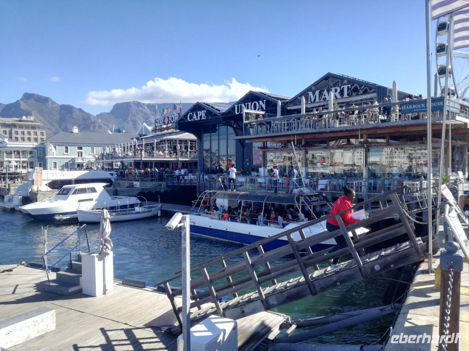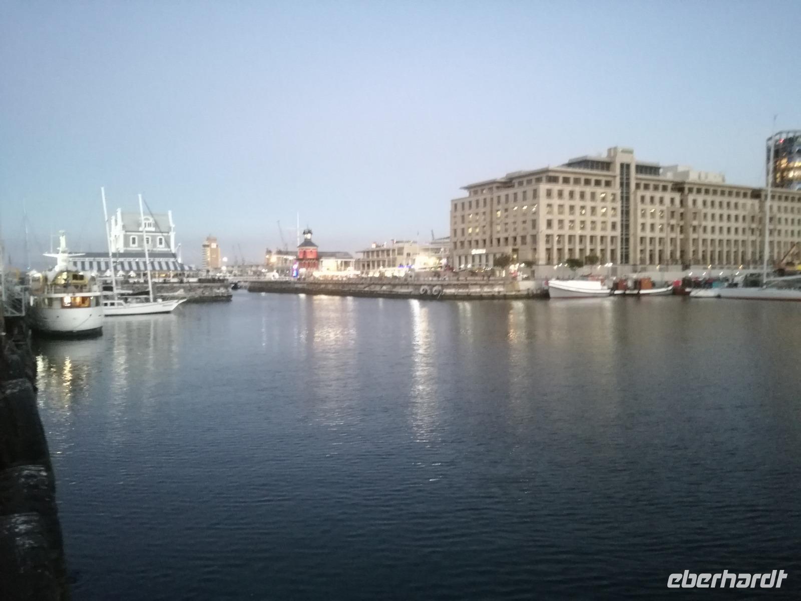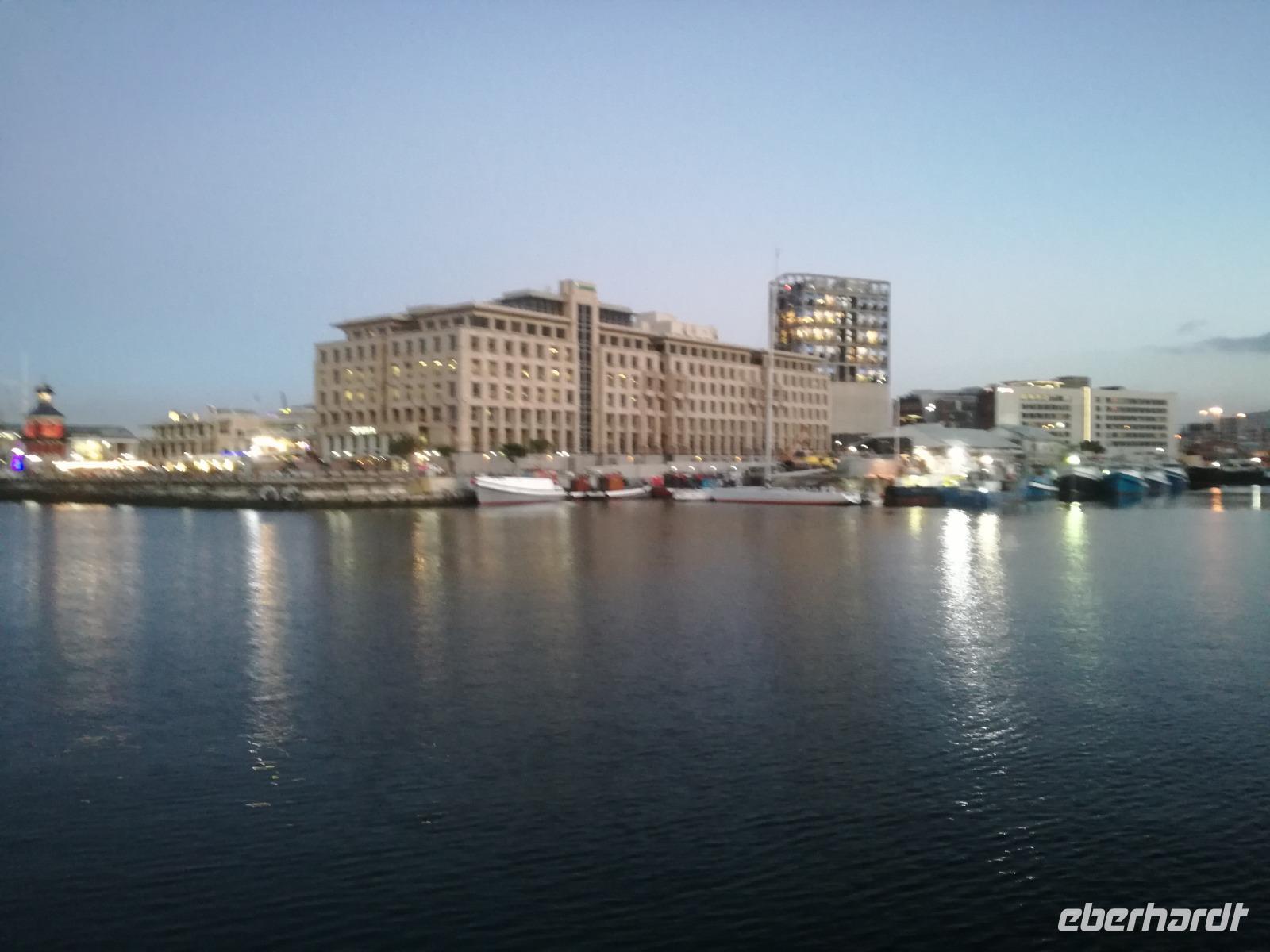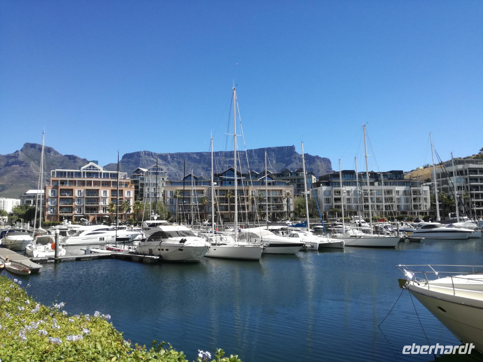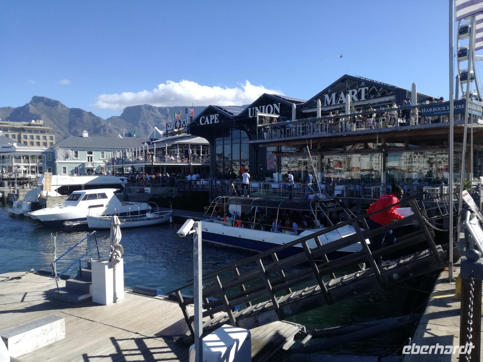 Der letzte Tag des Jahres wurde wieder mit einem ausgiebigen Frühstück gestartet. Zügig machten wir uns auf dem Weg in Richtung Kapstadt. Heute hatten wir uns fest vorgenommen, den Tafelberg zu erklimmen. Unterhalb des Berges erwartete uns wieder eine größere Schlange. Aber wir waren ja vorbereitet. Während ich mich in der Schlange anstellte, besuchte die restliche Gruppe mitsamt unserem örtlichen Guide Herbie den Signal Hill. Nach dem Tafelberg ist der Signal Hill der bekannteste Aussichtspunkt der Stadt. Von hier aus hatten wir einen tollen 360 Grad Rundblick über die Stadt, Camps Bay und auf dem Tafelberg. Hier gab es genügend Zeit für unzählige Bilder und wir genossen das Wetter und den Blick. Zurück am Tafelberg angekommen, hatte ich mich in der Zeit bis fast nach vorne gearbeitet. Inzwischen war hier ein Radiosender stationiert und sorgte für gute Musik und eine feierliche Stimmung. Das erleichterte uns die letzten Meter bis zur Seilbahn. In der sich drehenden Seilbahn konnte jeder die Aussicht auf den Berg und auf die Stadt genießen. Die Fahrt mit der Seilbahn dauerte ca. 15 Minuten und wir erreichten die Station des Tafelberges auf 1.087 Meter Höhe. Neben dem guten Wetter empfang uns der Tafelberg auch mit einem fantastischen Blick auf Kapstadt, dem neuen Stadion das zur WM errichtet wurde, den Nachbarberg Lions Head, Robben Island (die Insel vor der Stadt, wo Nelson Mandela inhaftiert wurde), die Waterfront und Camps Bay, der Umgebung der Südafrikanischen Hauptstadt. Nach unserem ausführlichen und heißen Aufenthalt auf den Tafelberg, stellten wir uns wieder in der Schlange an und fuhren wir wieder mit der Seilbahn hinunter. Da es nun Nachmittag war fuhren wir in unser Hotel, direkt an der Waterfront von Kapstadt. Nach dem Check-In verabredeten wir uns für einen Spaziergang zur Waterfront. Hier angekommen aßen wir zunächst in einer ausgebauten Lagerhalle im Foodcorner heimische Snacks und stimmten uns auf die Neujahrsfeier ein. Im Anschluss gab es genügend Zeit, um sich für den Abend zu schonen, recht zu machen oder die Waterfront zu genießen. Am Abend machten wir uns auf zu unserem Hotel Four Quay an der Waterfront. Das Restaurant hatte sich heraus geputzt und auch unsere Tische waren für die Feier geschmückt. Wir genossen den Abend in einer herrlichen Atmosphäre. Bei ausreichend Wein, Bier und Amarula ließen wir den letzten Abend des Jahres ausklingen. Um Mittagnacht zog es uns auf den Balkon des Hotels und stießen mit Sekt auf das neue Jahr an. Das Feuerwerk an der Waterfront war sehr spektakulär und die Stimmung hervorragend. Auch das Personal feierte mit uns und freute sich auf neue Jahr. Dann wurden die beiden Tische zusammen geschoben und wir feierten noch ein wenig ins Jahr 2019. Auf dem Weg zum Hotel spazierten wir nochmal durch das Viertel und bestaunten die Einheimischen Südafrikaner, wie sie locker leicht singend und tanzend ins neue Jahr feierten. Ein schöner Tag mit einem super Jahresausklang ging nun zu Ende.