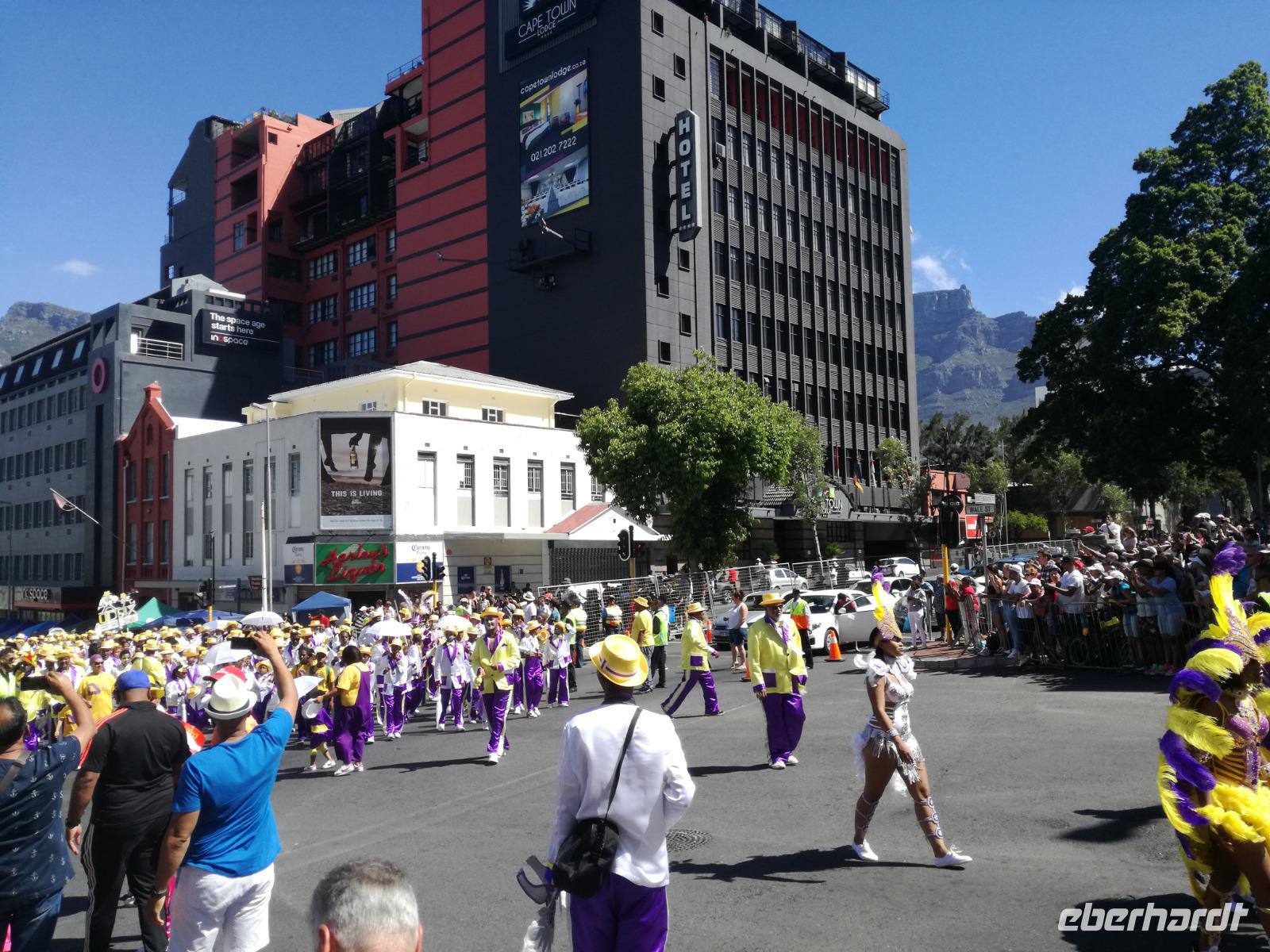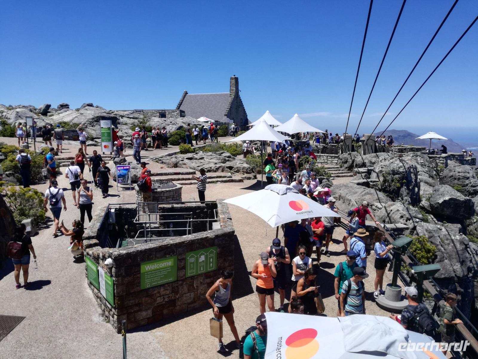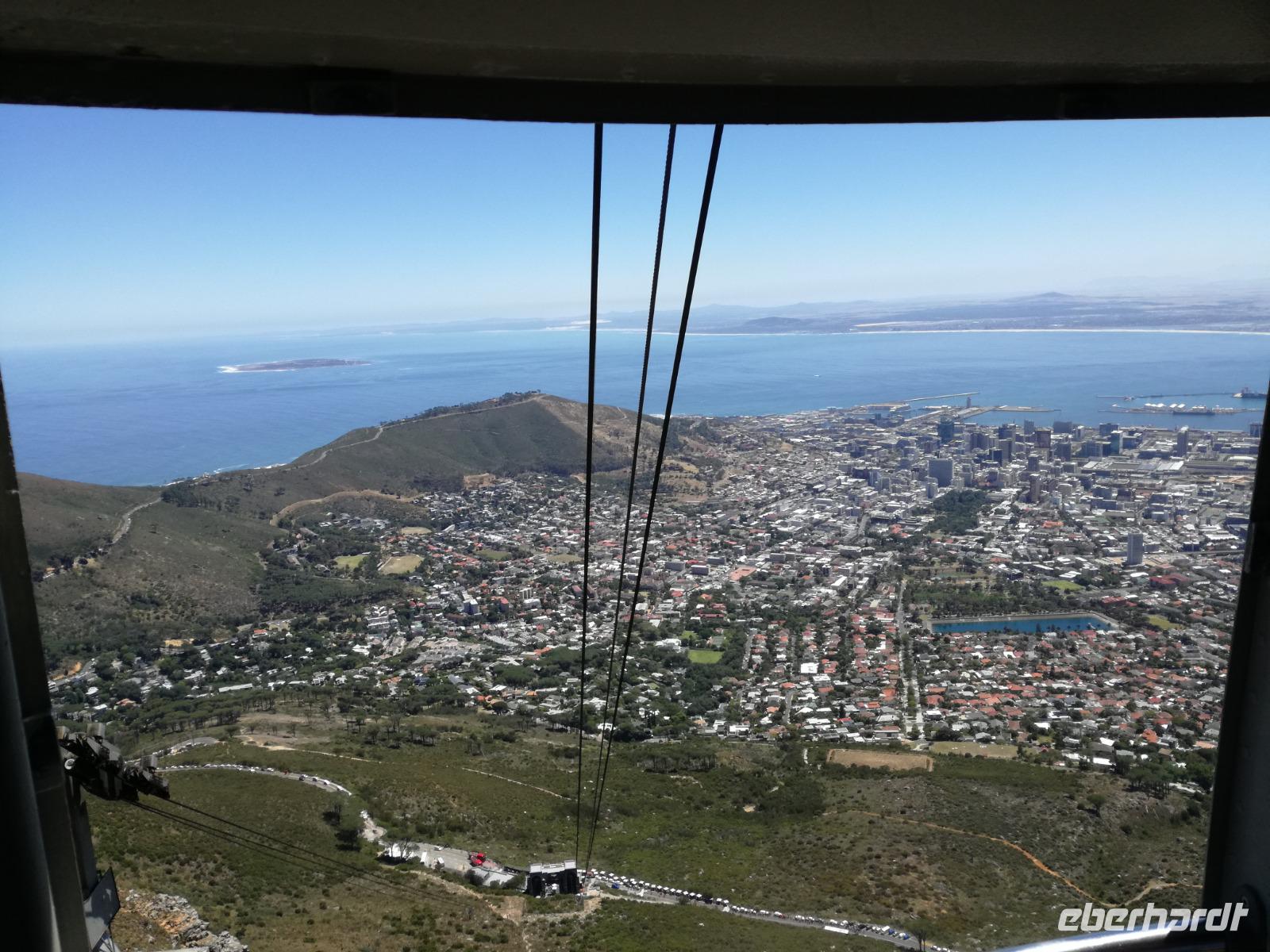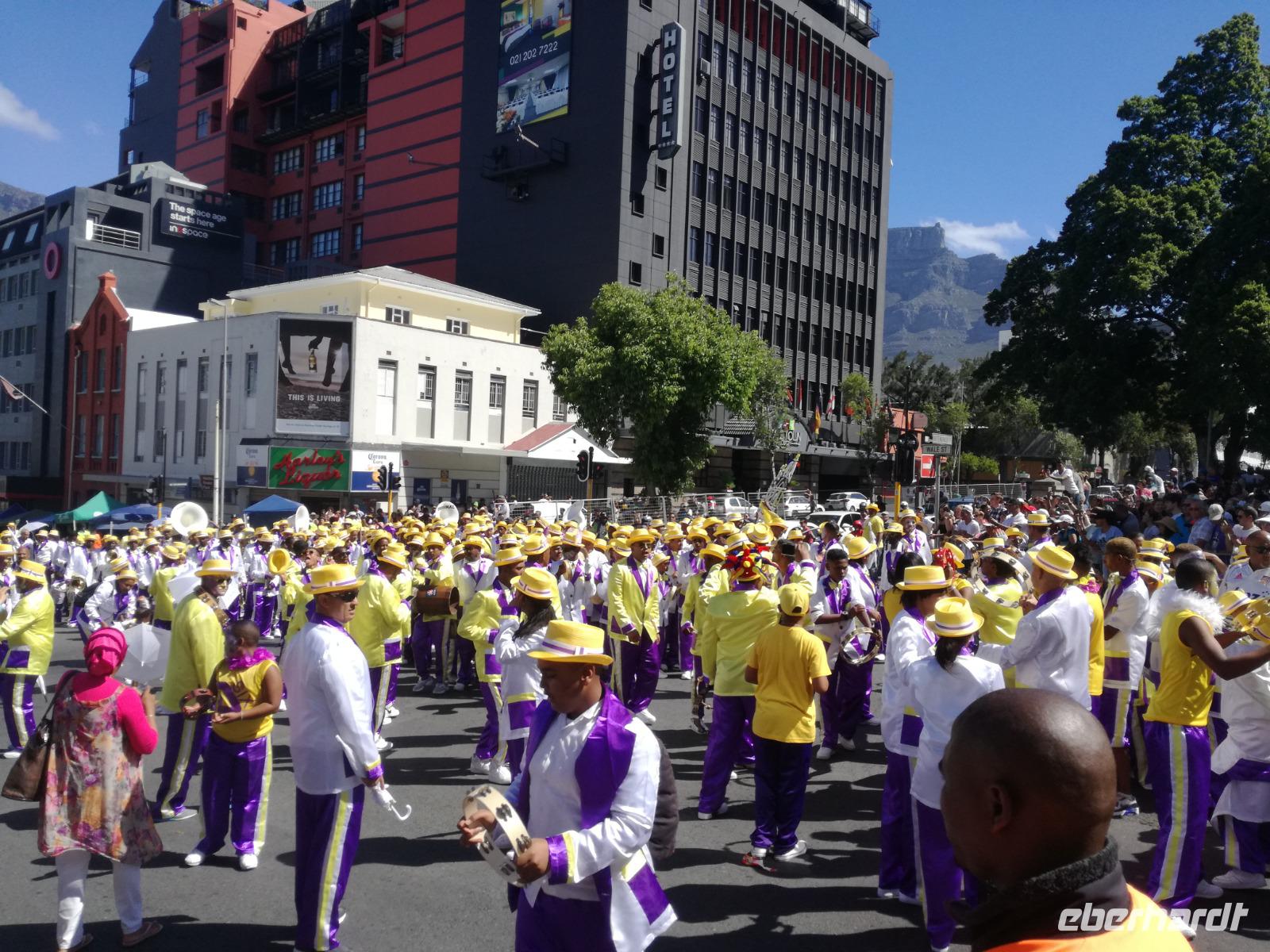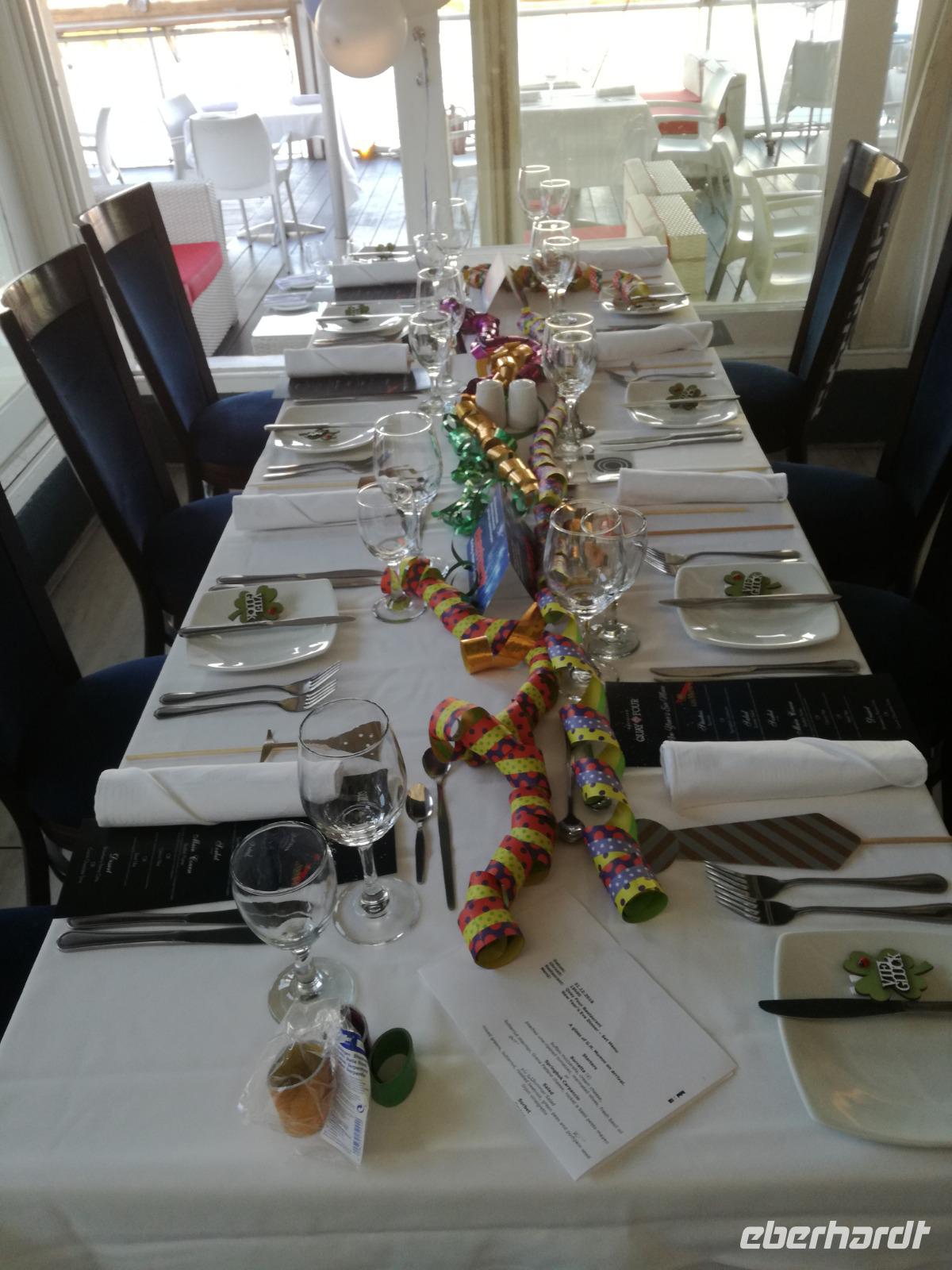 Der letzte Tag des Jahres wurde wieder mit einem ausgiebigen Frühstück gestartet. Zügig machten wir uns auf dem Weg in Richtung Kapstadt. Heute hatten wir uns fest vorgenommen, den Tafelberg zu erklimmen. Unterhalb des Berges erwartete uns wieder eine größere Schlange. Aber wir waren ja vorbereitet. Während ich mich in der Schlange anstellte, besuchte die restliche Gruppe mitsamt unserem örtlichen Guide Herbie den Signal Hill. Nach dem Tafelberg ist der Signal Hill der bekannteste Aussichtspunkt der Stadt. Von hier aus hatten wir einen tollen 360 Grad Rundblick über die Stadt, Camps Bay und auf dem Tafelberg. Hier gab es genügend Zeit für unzählige Bilder und wir genossen das Wetter und den Blick. Zurück am Tafelberg angekommen, hatte ich mich in der Zeit bis fast nach vorne gearbeitet. Inzwischen war hier ein Radiosender stationiert und sorgte für gute Musik und eine feierliche Stimmung. Das erleichterte uns die letzten Meter bis zur Seilbahn. In der sich drehenden Seilbahn konnte jeder die Aussicht auf den Berg und auf die Stadt genießen. Die Fahrt mit der Seilbahn dauerte ca. 15 Minuten und wir erreichten die Station des Tafelberges auf 1.087 Meter Höhe. Neben dem guten Wetter empfang uns der Tafelberg auch mit einem fantastischen Blick auf Kapstadt, dem neuen Stadion das zur WM errichtet wurde, den Nachbarberg Lions Head, Robben Island (die Insel vor der Stadt, wo Nelson Mandela inhaftiert wurde), die Waterfront und Camps Bay, der Umgebung der Südafrikanischen Hauptstadt. Nach unserem ausführlichen und heißen Aufenthalt auf den Tafelberg, stellten wir uns wieder in der Schlange an und fuhren wir wieder mit der Seilbahn hinunter. Da es nun Nachmittag war fuhren wir in unser Hotel, direkt an der Waterfront von Kapstadt. Nach dem Check-In verabredeten wir uns für einen Spaziergang zur Waterfront. Hier angekommen aßen wir zunächst in einer ausgebauten Lagerhalle im Foodcorner heimische Snacks und stimmten uns auf die Neujahrsfeier ein. Im Anschluss gab es genügend Zeit, um sich für den Abend zu schonen, recht zu machen oder die Waterfront zu genießen. Am Abend machten wir uns auf zu unserem Hotel Four Quay an der Waterfront. Das Restaurant hatte sich heraus geputzt und auch unsere Tische waren für die Feier geschmückt. Wir genossen den Abend in einer herrlichen Atmosphäre. Bei ausreichend Wein, Bier und Amarula ließen wir den letzten Abend des Jahres ausklingen. Um Mittagnacht zog es uns auf den Balkon des Hotels und stießen mit Sekt auf das neue Jahr an. Das Feuerwerk an der Waterfront war sehr spektakulär und die Stimmung hervorragend. Auch das Personal feierte mit uns und freute sich auf neue Jahr. Dann wurden die beiden Tische zusammen geschoben und wir feierten noch ein wenig ins Jahr 2019. Auf dem Weg zum Hotel spazierten wir nochmal durch das Viertel und bestaunten die Einheimischen Südafrikaner, wie sie locker leicht singend und tanzend ins neue Jahr feierten. Ein schöner Tag mit einem super Jahresausklang ging nun zu Ende.