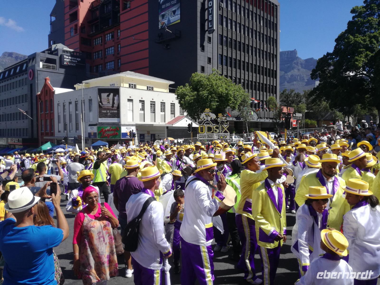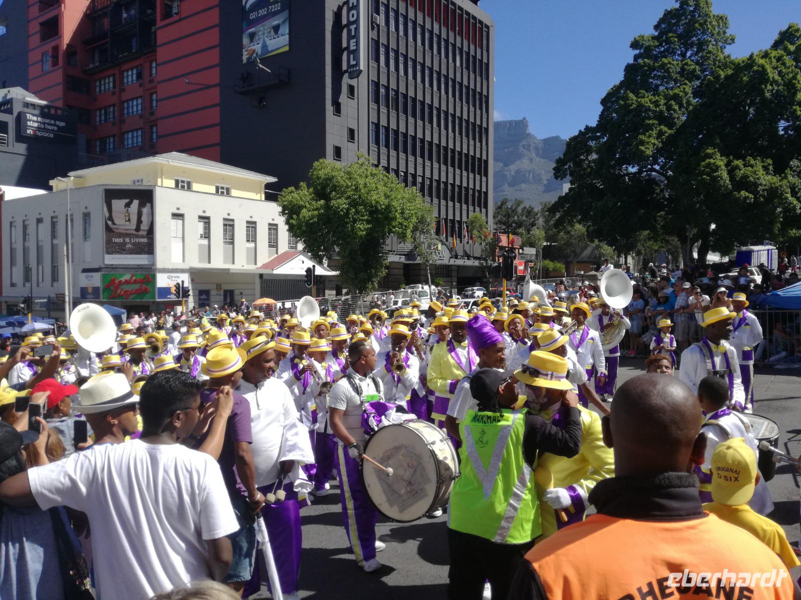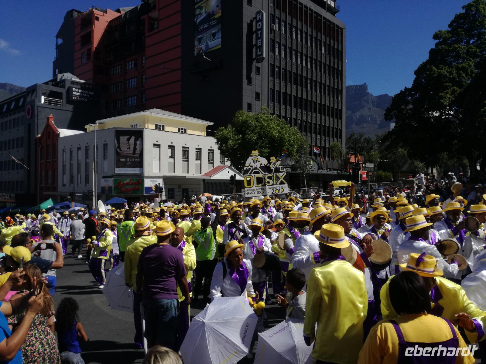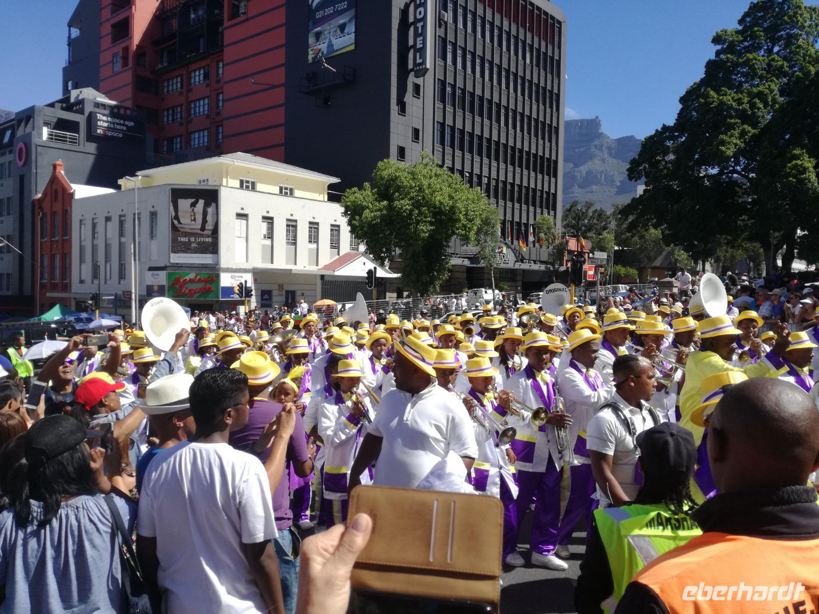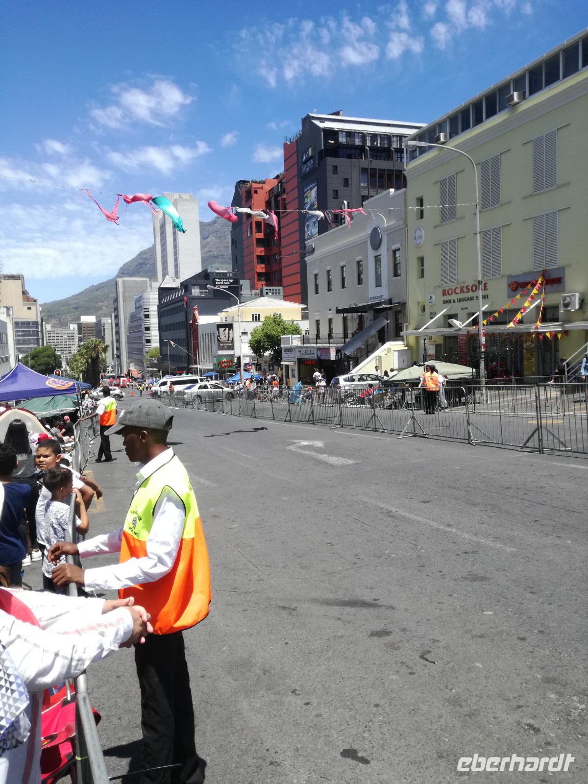 Der letzte Tag des Jahres wurde wieder mit einem ausgiebigen Frühstück gestartet. Zügig machten wir uns auf dem Weg in Richtung Kapstadt. Heute hatten wir uns fest vorgenommen, den Tafelberg zu erklimmen. Unterhalb des Berges erwartete uns wieder eine größere Schlange. Aber wir waren ja vorbereitet. Während ich mich in der Schlange anstellte, besuchte die restliche Gruppe mitsamt unserem örtlichen Guide Herbie den Signal Hill. Nach dem Tafelberg ist der Signal Hill der bekannteste Aussichtspunkt der Stadt. Von hier aus hatten wir einen tollen 360 Grad Rundblick über die Stadt, Camps Bay und auf dem Tafelberg. Hier gab es genügend Zeit für unzählige Bilder und wir genossen das Wetter und den Blick. Zurück am Tafelberg angekommen, hatte ich mich in der Zeit bis fast nach vorne gearbeitet. Inzwischen war hier ein Radiosender stationiert und sorgte für gute Musik und eine feierliche Stimmung. Das erleichterte uns die letzten Meter bis zur Seilbahn. In der sich drehenden Seilbahn konnte jeder die Aussicht auf den Berg und auf die Stadt genießen. Die Fahrt mit der Seilbahn dauerte ca. 15 Minuten und wir erreichten die Station des Tafelberges auf 1.087 Meter Höhe. Neben dem guten Wetter empfang uns der Tafelberg auch mit einem fantastischen Blick auf Kapstadt, dem neuen Stadion das zur WM errichtet wurde, den Nachbarberg Lions Head, Robben Island (die Insel vor der Stadt, wo Nelson Mandela inhaftiert wurde), die Waterfront und Camps Bay, der Umgebung der Südafrikanischen Hauptstadt. Nach unserem ausführlichen und heißen Aufenthalt auf den Tafelberg, stellten wir uns wieder in der Schlange an und fuhren wir wieder mit der Seilbahn hinunter. Da es nun Nachmittag war fuhren wir in unser Hotel, direkt an der Waterfront von Kapstadt. Nach dem Check-In verabredeten wir uns für einen Spaziergang zur Waterfront. Hier angekommen aßen wir zunächst in einer ausgebauten Lagerhalle im Foodcorner heimische Snacks und stimmten uns auf die Neujahrsfeier ein. Im Anschluss gab es genügend Zeit, um sich für den Abend zu schonen, recht zu machen oder die Waterfront zu genießen. Am Abend machten wir uns auf zu unserem Hotel Four Quay an der Waterfront. Das Restaurant hatte sich heraus geputzt und auch unsere Tische waren für die Feier geschmückt. Wir genossen den Abend in einer herrlichen Atmosphäre. Bei ausreichend Wein, Bier und Amarula ließen wir den letzten Abend des Jahres ausklingen. Um Mittagnacht zog es uns auf den Balkon des Hotels und stießen mit Sekt auf das neue Jahr an. Das Feuerwerk an der Waterfront war sehr spektakulär und die Stimmung hervorragend. Auch das Personal feierte mit uns und freute sich auf neue Jahr. Dann wurden die beiden Tische zusammen geschoben und wir feierten noch ein wenig ins Jahr 2019. Auf dem Weg zum Hotel spazierten wir nochmal durch das Viertel und bestaunten die Einheimischen Südafrikaner, wie sie locker leicht singend und tanzend ins neue Jahr feierten. Ein schöner Tag mit einem super Jahresausklang ging nun zu Ende.