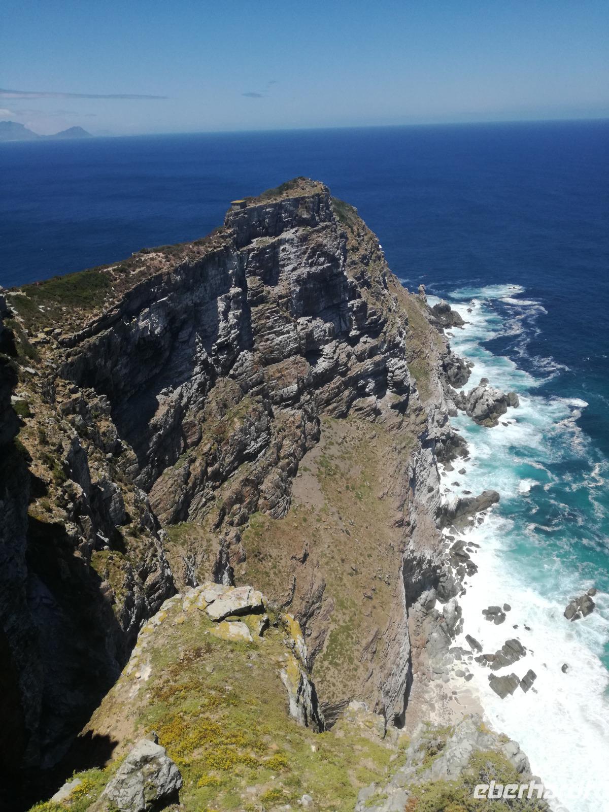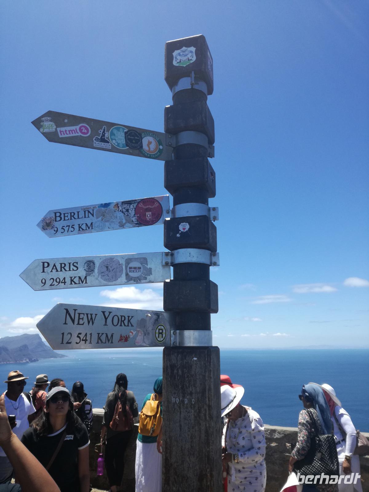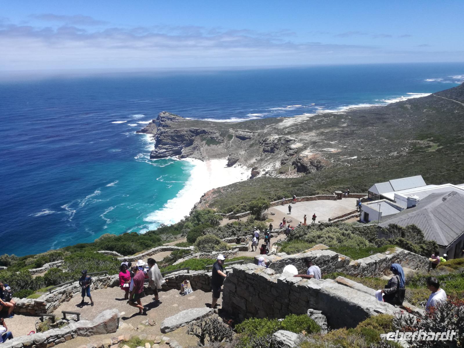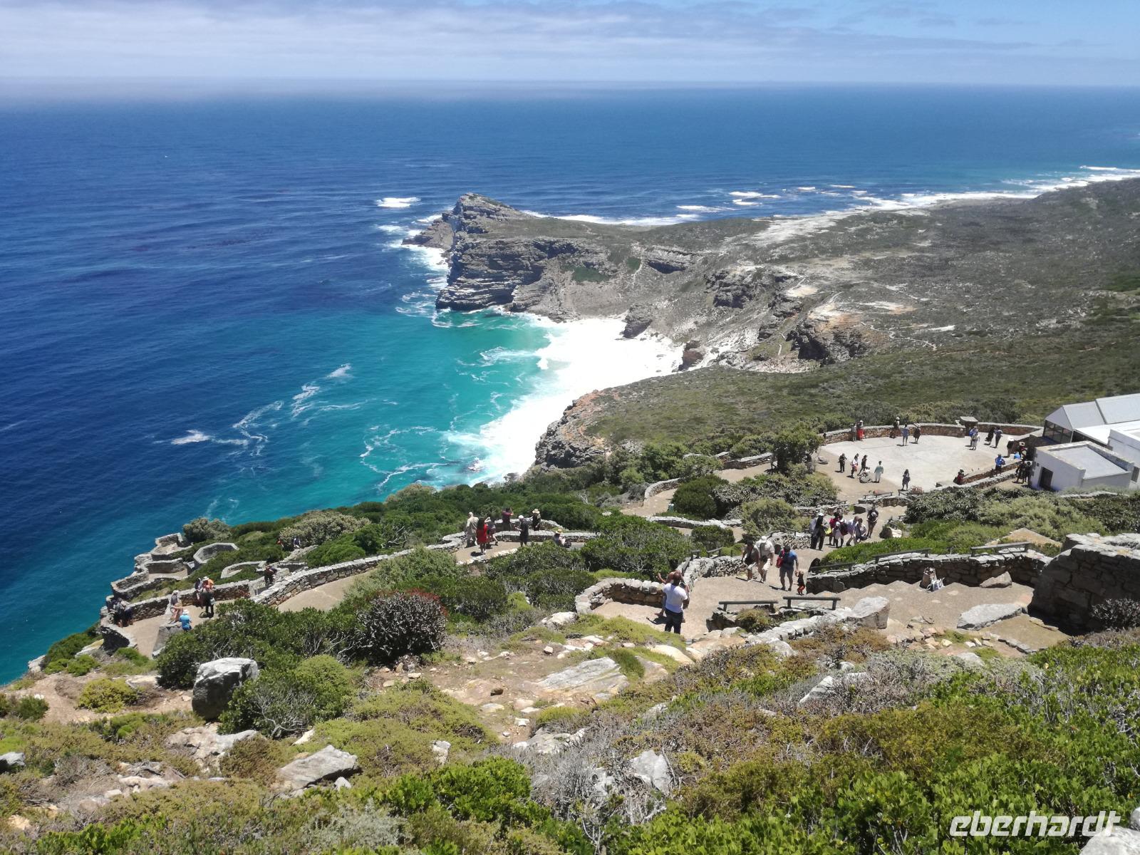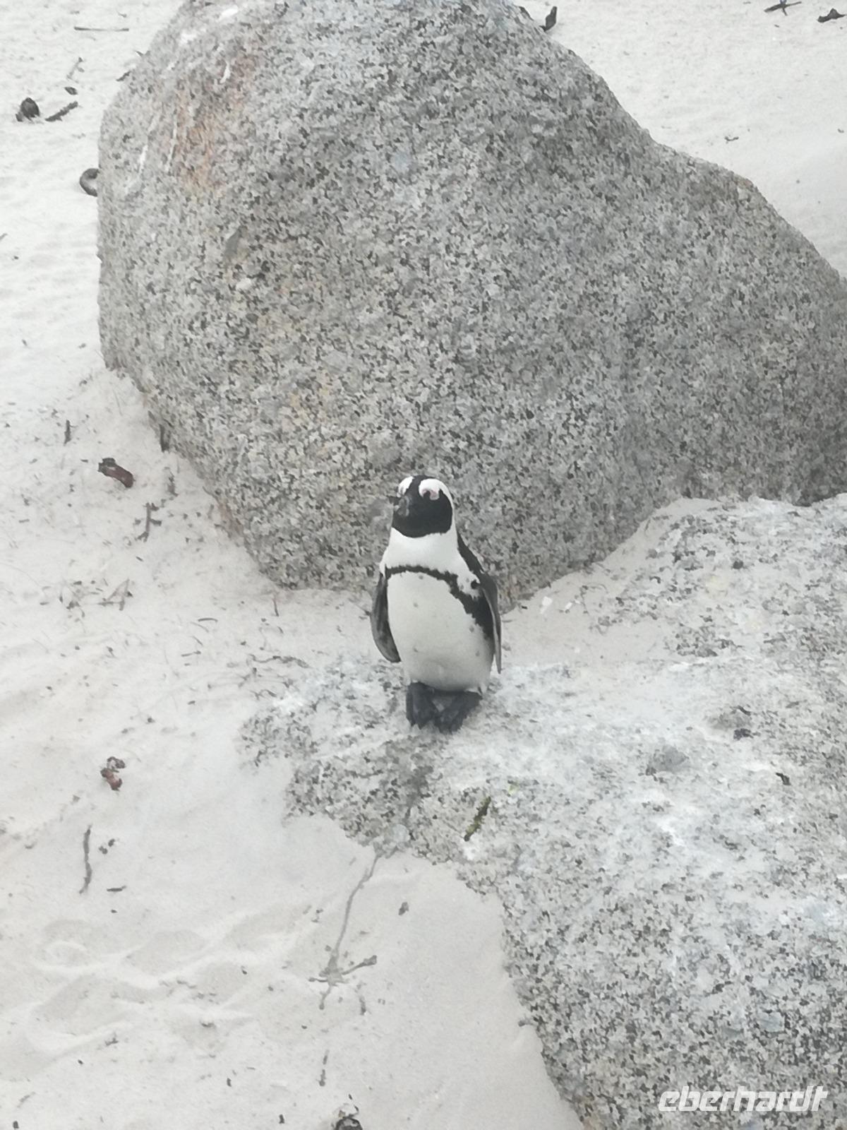 Nach der schönen Feier starteten wir um 9 Uhr in den ersten Tag des Jahres. Wieder gab es ein ausgezeichnetes Frühstück. Herbie und unser Fahrer Clieve holten uns im Hotel ab. Zunächst fuhren wir an Camps Bay. Hier gab es einen schnellen Stopp beim hiesigen Hard Rock Café Kapstadt. Weiter sollte es in Richtung Kap der Guten Hoffnung gehen. Ein weiterer Stopp folgte in Clifden. Hier gibt es einen wunderschönen Aussichtspunkt auf das Meer und die Bucht. Weiter führte uns der Weg über die atemberaubende Panoramastraße Chapman Peak Drive. Auf der Küstenstraße mit wunderbaren Ausblicken, wurden unter anderem Werbespots für Mercedes und BMW gedreht, bei dem leider auch Menschen aufgrund der scharfen Kurven verletzt wurden. Unser nächster Halt erfolgte am Cap der guten Hoffnung. Im jeweiligen Table Mountain Nationalpark leben bis zu 250 Vogel und über 1.000 Pflanzenarten. Der eigentliche Höhepunkt ist der Cape Point, der 200m oberhalb des Kaps der guten Hoffnung liegt. Neben einem Restaurant und Souvenirläden gibt es hier auch eine Seilbahn, die uns bis zum alten Leuchtturm des Kaps brachte. Von hier aus hatten wir eine wundervolle Aussicht und genossen das gute Wetter in vollen Zügen. Manche nahmen die Seilbahn zurück und manche spazierten über Treppen zurück zum Ausgangspunkt. Weiter ging es zum südlichen Zipfel der Halbinsel. Hier liegt das sagenumworbenes Kap der Guten Hoffnung. Das berühmte Kap der guten Hoffnung erhielt Ihren Namen vom portugiesischen König Johann II, da der Seeweg ihm den Weg nach Indien ebnete. Hier legten wir einen Fotostopp ein und schossen unendliche Bilder. Natürliche durfte hier eine Kaptaufe nicht fehlen. Gemeinsam stießen wir auf das neue Jahr und auf das Kap an. Nachdem wir das Kap ausführlich erkundet hatten, wollten wir auch noch die hiesige Tierwelt kennen lernen. Doch zunächst einmal gab es Mittagessen. Im bekannten Fischrestaurant Black Merlin gab es unser Neujahrsessen mit Fisch, Garnelen und Hummer. Ein leckeres Mittagessen direkt am Meer. In der Nähe von Simonstown stoppten wir am Boulders Beach und gingen auf Tuchfühlung mit den einheimischen Pinguinen, die sich in der Sonne räkelten. Plötzlich drehte das Wetter und wir mussten uns beeilen, damit wir trocken im Bus ankamen. Das Wetter vermieste unsere Stimmung nicht und wir fuhren zum Hotel zurück, wo wir müde ins Bett fielen. Langsam ging ein aufregender Tag zu Ende.