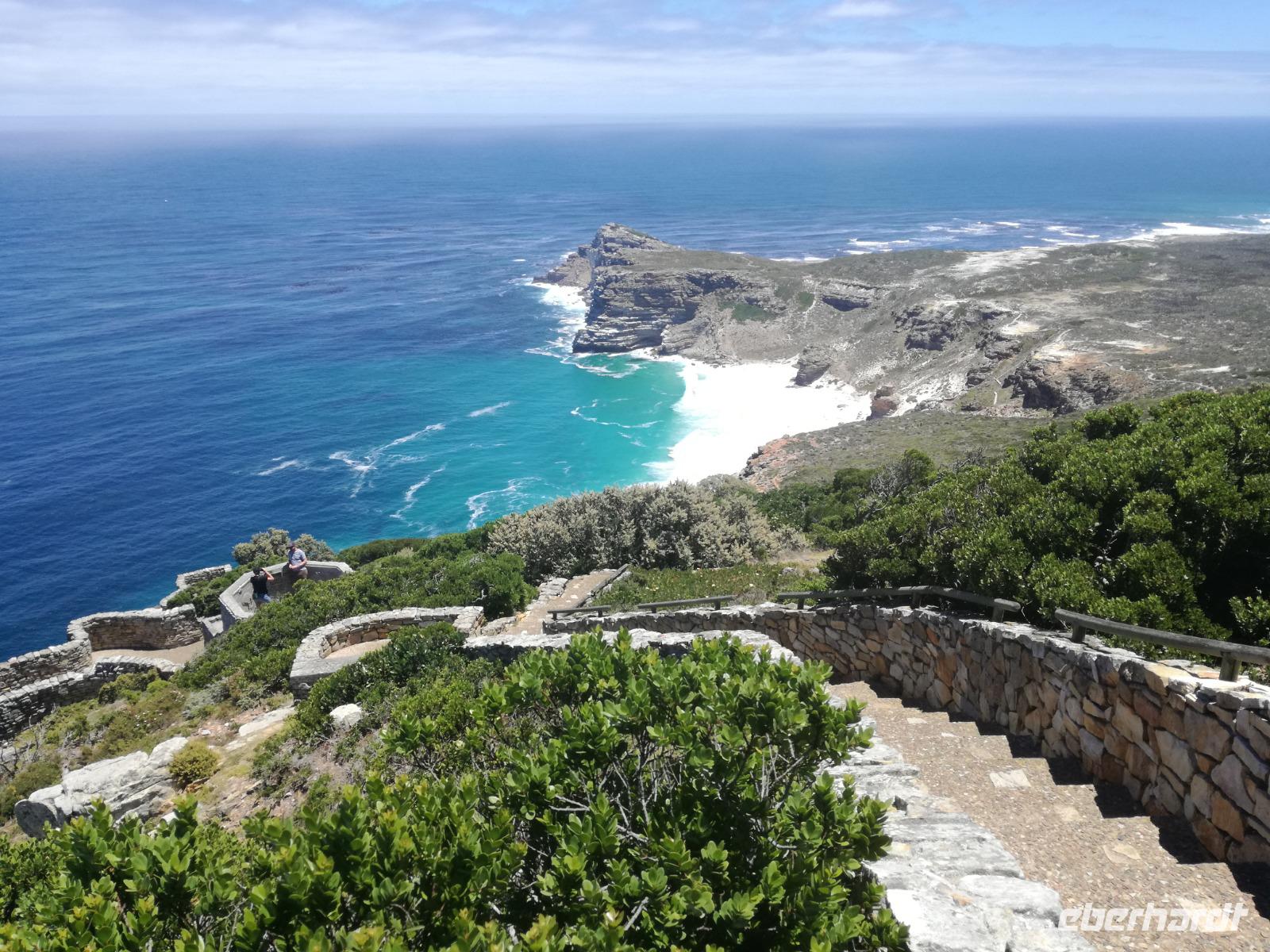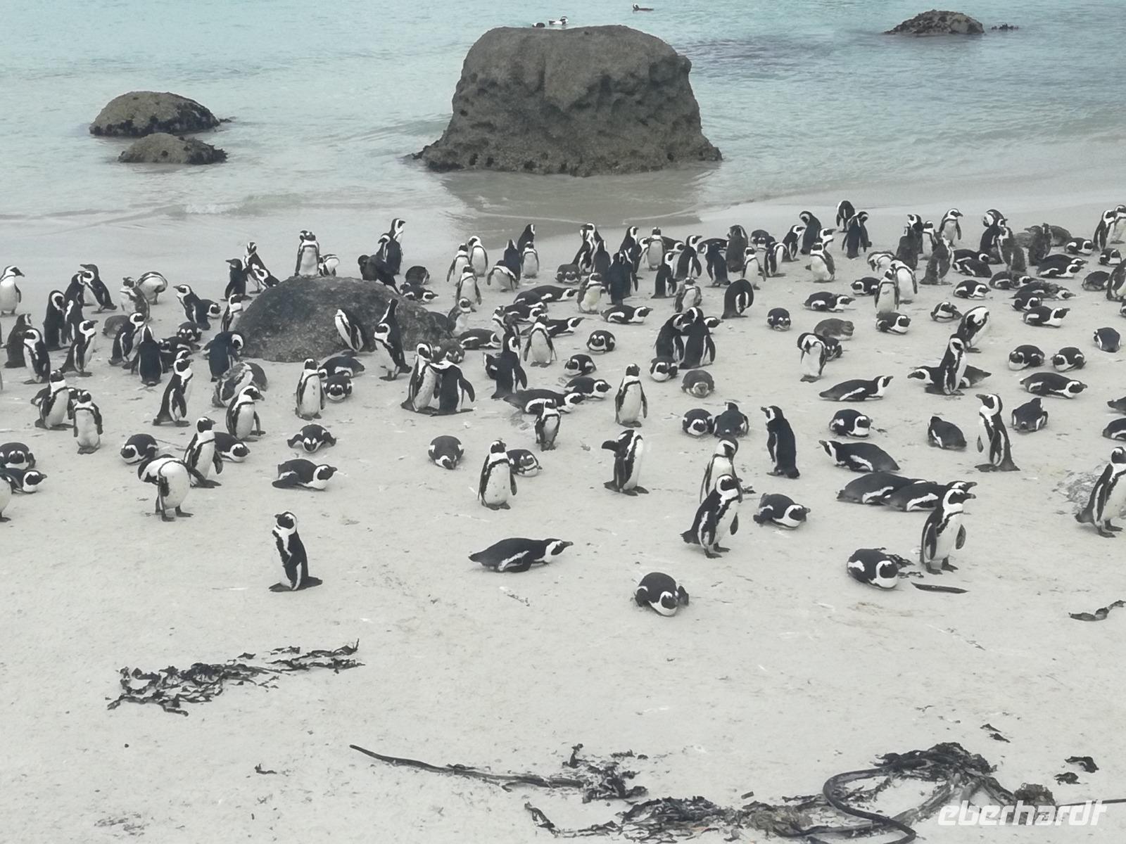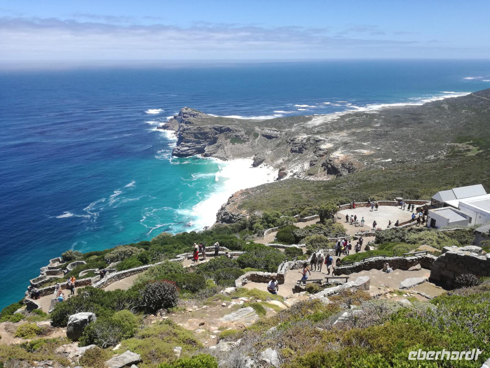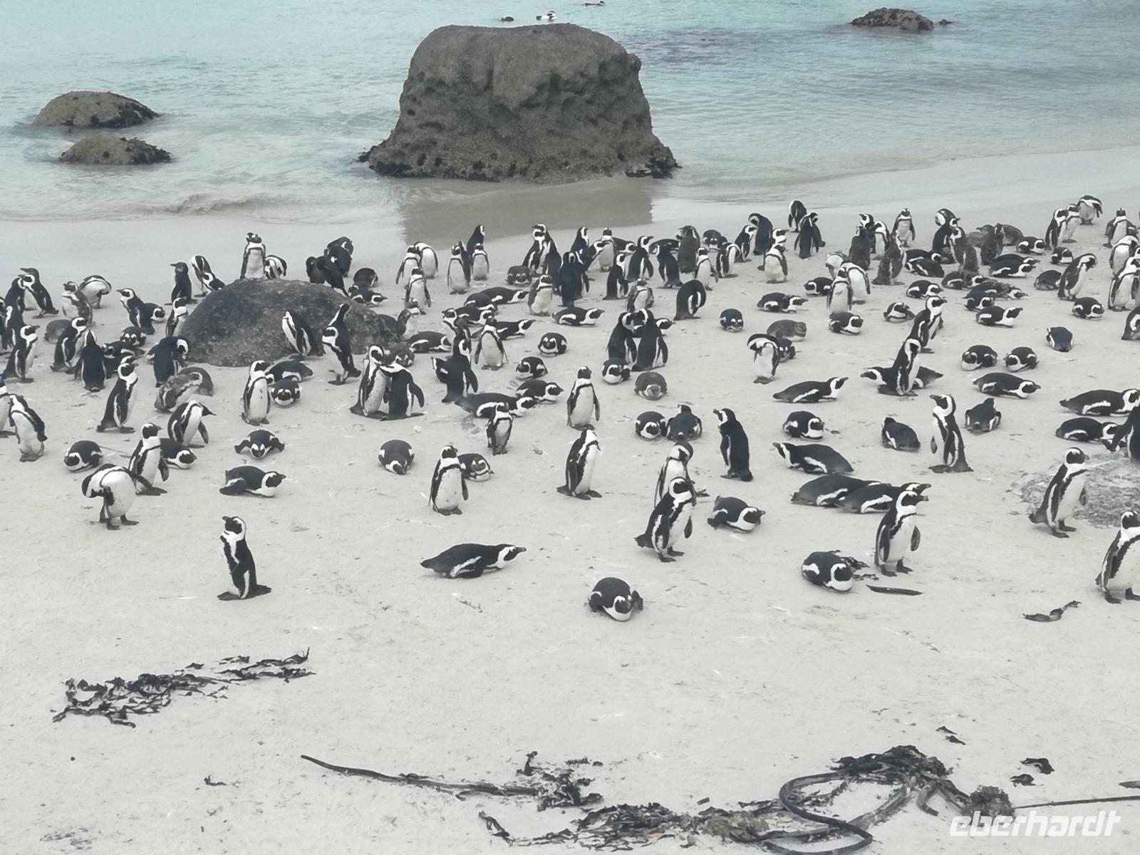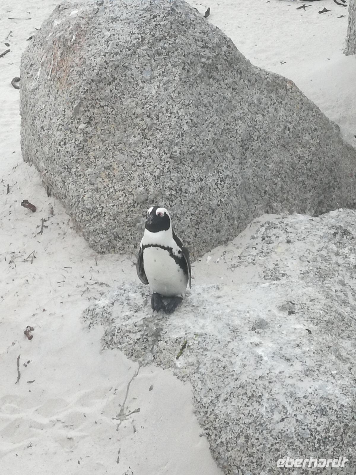 Nach der schönen Feier starteten wir um 9 Uhr in den ersten Tag des Jahres. Wieder gab es ein ausgezeichnetes Frühstück. Herbie und unser Fahrer Clieve holten uns im Hotel ab. Zunächst fuhren wir an Camps Bay. Hier gab es einen schnellen Stopp beim hiesigen Hard Rock Café Kapstadt. Weiter sollte es in Richtung Kap der Guten Hoffnung gehen. Ein weiterer Stopp folgte in Clifden. Hier gibt es einen wunderschönen Aussichtspunkt auf das Meer und die Bucht. Weiter führte uns der Weg über die atemberaubende Panoramastraße Chapman Peak Drive. Auf der Küstenstraße mit wunderbaren Ausblicken, wurden unter anderem Werbespots für Mercedes und BMW gedreht, bei dem leider auch Menschen aufgrund der scharfen Kurven verletzt wurden. Unser nächster Halt erfolgte am Cap der guten Hoffnung. Im jeweiligen Table Mountain Nationalpark leben bis zu 250 Vogel und über 1.000 Pflanzenarten. Der eigentliche Höhepunkt ist der Cape Point, der 200m oberhalb des Kaps der guten Hoffnung liegt. Neben einem Restaurant und Souvenirläden gibt es hier auch eine Seilbahn, die uns bis zum alten Leuchtturm des Kaps brachte. Von hier aus hatten wir eine wundervolle Aussicht und genossen das gute Wetter in vollen Zügen. Manche nahmen die Seilbahn zurück und manche spazierten über Treppen zurück zum Ausgangspunkt. Weiter ging es zum südlichen Zipfel der Halbinsel. Hier liegt das sagenumworbenes Kap der Guten Hoffnung. Das berühmte Kap der guten Hoffnung erhielt Ihren Namen vom portugiesischen König Johann II, da der Seeweg ihm den Weg nach Indien ebnete. Hier legten wir einen Fotostopp ein und schossen unendliche Bilder. Natürliche durfte hier eine Kaptaufe nicht fehlen. Gemeinsam stießen wir auf das neue Jahr und auf das Kap an. Nachdem wir das Kap ausführlich erkundet hatten, wollten wir auch noch die hiesige Tierwelt kennen lernen. Doch zunächst einmal gab es Mittagessen. Im bekannten Fischrestaurant Black Merlin gab es unser Neujahrsessen mit Fisch, Garnelen und Hummer. Ein leckeres Mittagessen direkt am Meer. In der Nähe von Simonstown stoppten wir am Boulders Beach und gingen auf Tuchfühlung mit den einheimischen Pinguinen, die sich in der Sonne räkelten. Plötzlich drehte das Wetter und wir mussten uns beeilen, damit wir trocken im Bus ankamen. Das Wetter vermieste unsere Stimmung nicht und wir fuhren zum Hotel zurück, wo wir müde ins Bett fielen. Langsam ging ein aufregender Tag zu Ende.