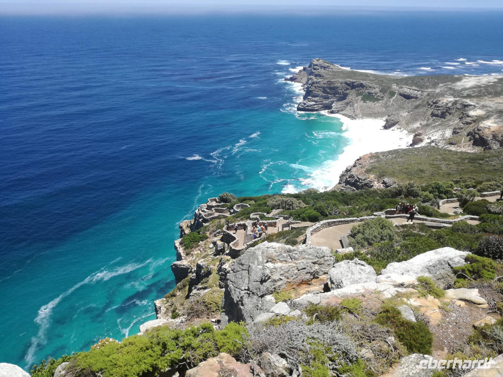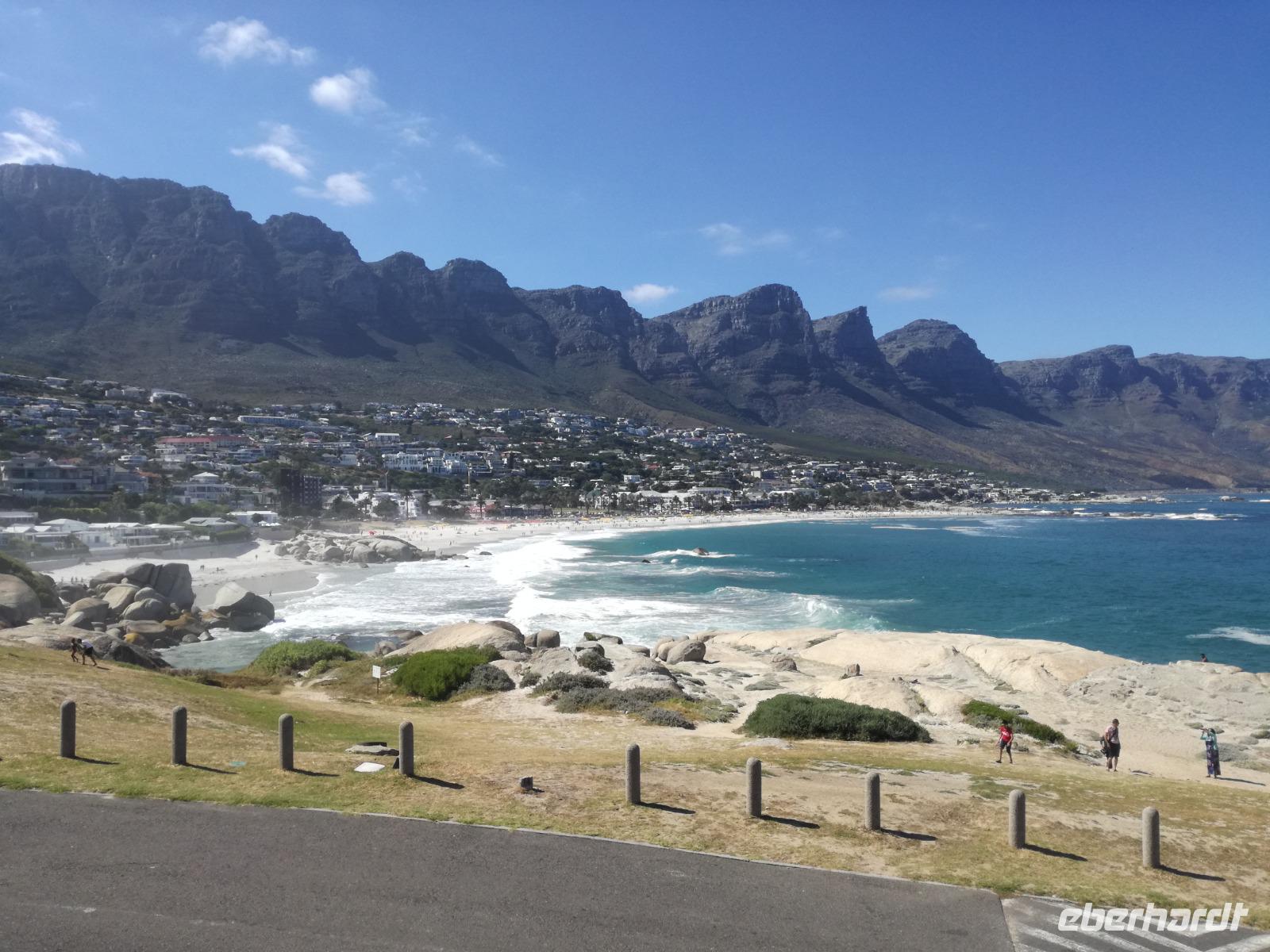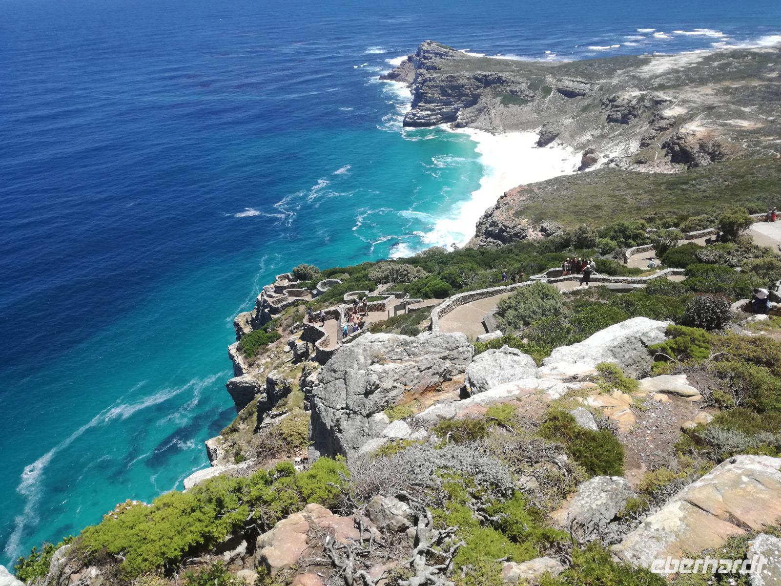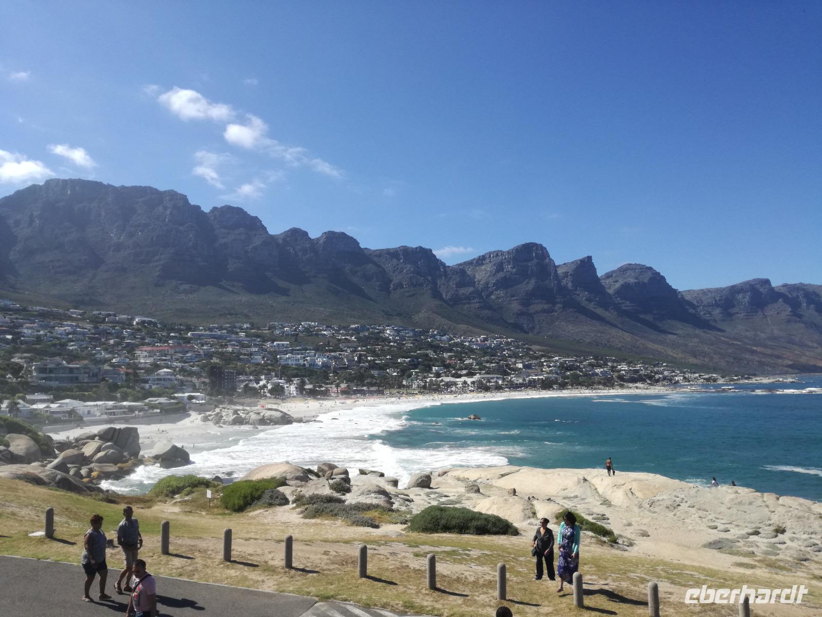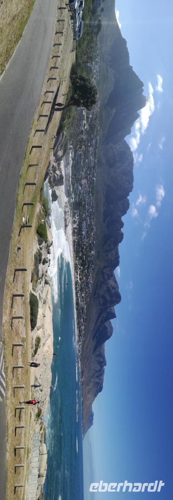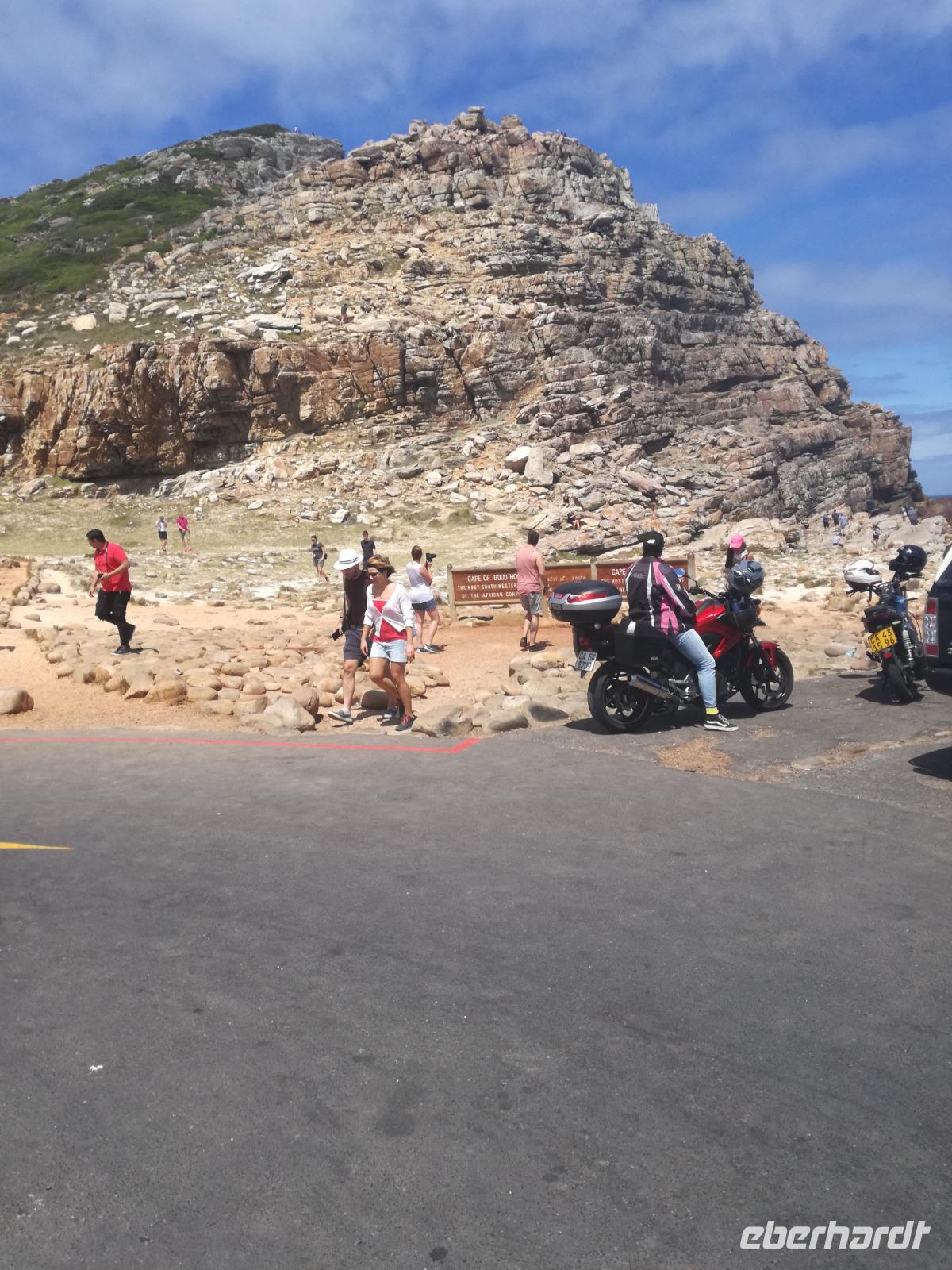 Nach der schönen Feier starteten wir um 9 Uhr in den ersten Tag des Jahres. Wieder gab es ein ausgezeichnetes Frühstück. Herbie und unser Fahrer Clieve holten uns im Hotel ab. Zunächst fuhren wir an Camps Bay. Hier gab es einen schnellen Stopp beim hiesigen Hard Rock Café Kapstadt. Weiter sollte es in Richtung Kap der Guten Hoffnung gehen. Ein weiterer Stopp folgte in Clifden. Hier gibt es einen wunderschönen Aussichtspunkt auf das Meer und die Bucht. Weiter führte uns der Weg über die atemberaubende Panoramastraße Chapman Peak Drive. Auf der Küstenstraße mit wunderbaren Ausblicken, wurden unter anderem Werbespots für Mercedes und BMW gedreht, bei dem leider auch Menschen aufgrund der scharfen Kurven verletzt wurden. Unser nächster Halt erfolgte am Cap der guten Hoffnung. Im jeweiligen Table Mountain Nationalpark leben bis zu 250 Vogel und über 1.000 Pflanzenarten. Der eigentliche Höhepunkt ist der Cape Point, der 200m oberhalb des Kaps der guten Hoffnung liegt. Neben einem Restaurant und Souvenirläden gibt es hier auch eine Seilbahn, die uns bis zum alten Leuchtturm des Kaps brachte. Von hier aus hatten wir eine wundervolle Aussicht und genossen das gute Wetter in vollen Zügen. Manche nahmen die Seilbahn zurück und manche spazierten über Treppen zurück zum Ausgangspunkt. Weiter ging es zum südlichen Zipfel der Halbinsel. Hier liegt das sagenumworbenes Kap der Guten Hoffnung. Das berühmte Kap der guten Hoffnung erhielt Ihren Namen vom portugiesischen König Johann II, da der Seeweg ihm den Weg nach Indien ebnete. Hier legten wir einen Fotostopp ein und schossen unendliche Bilder. Natürliche durfte hier eine Kaptaufe nicht fehlen. Gemeinsam stießen wir auf das neue Jahr und auf das Kap an. Nachdem wir das Kap ausführlich erkundet hatten, wollten wir auch noch die hiesige Tierwelt kennen lernen. Doch zunächst einmal gab es Mittagessen. Im bekannten Fischrestaurant Black Merlin gab es unser Neujahrsessen mit Fisch, Garnelen und Hummer. Ein leckeres Mittagessen direkt am Meer. In der Nähe von Simonstown stoppten wir am Boulders Beach und gingen auf Tuchfühlung mit den einheimischen Pinguinen, die sich in der Sonne räkelten. Plötzlich drehte das Wetter und wir mussten uns beeilen, damit wir trocken im Bus ankamen. Das Wetter vermieste unsere Stimmung nicht und wir fuhren zum Hotel zurück, wo wir müde ins Bett fielen. Langsam ging ein aufregender Tag zu Ende.