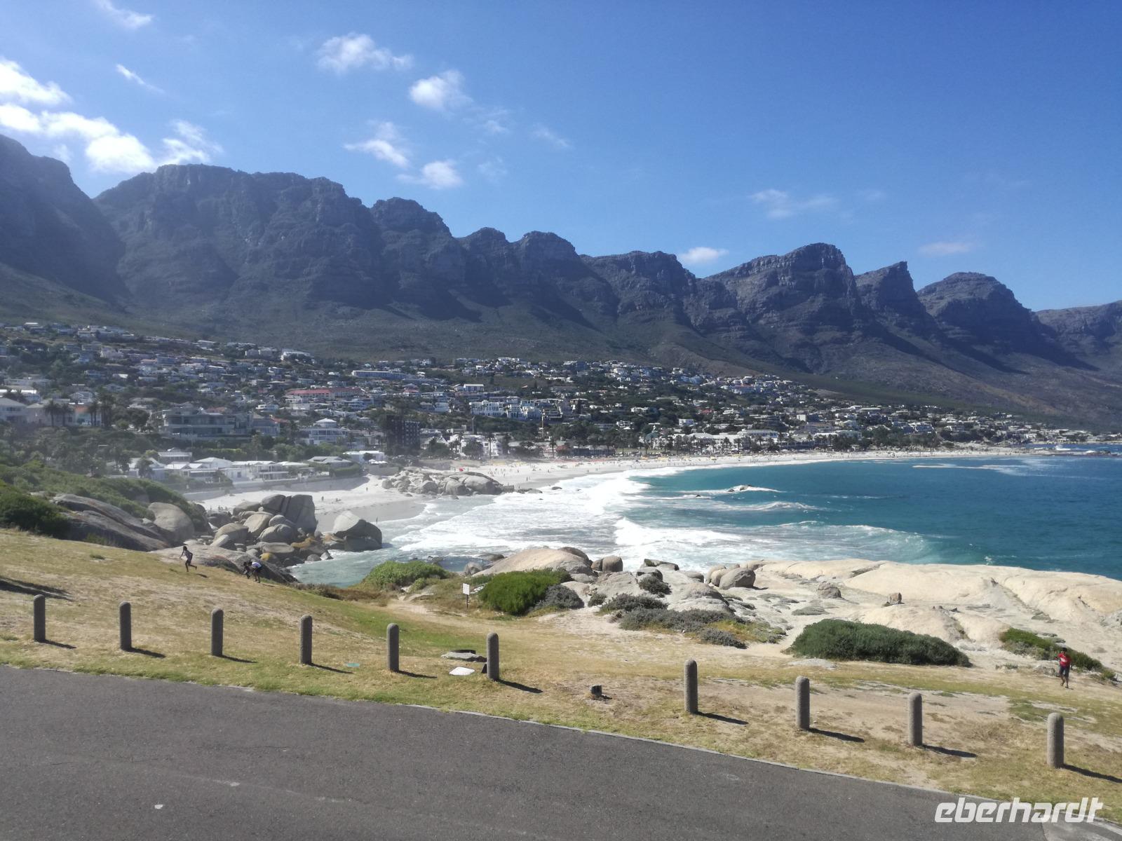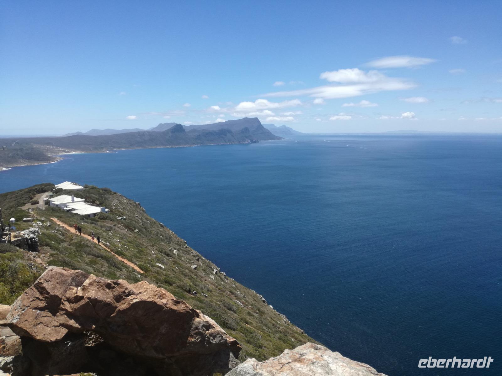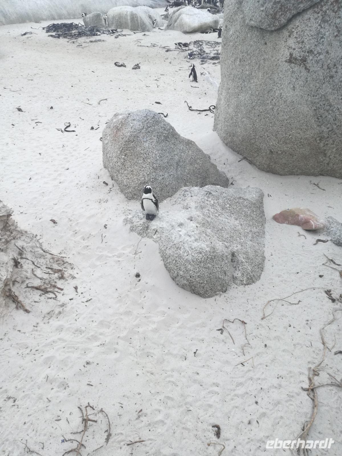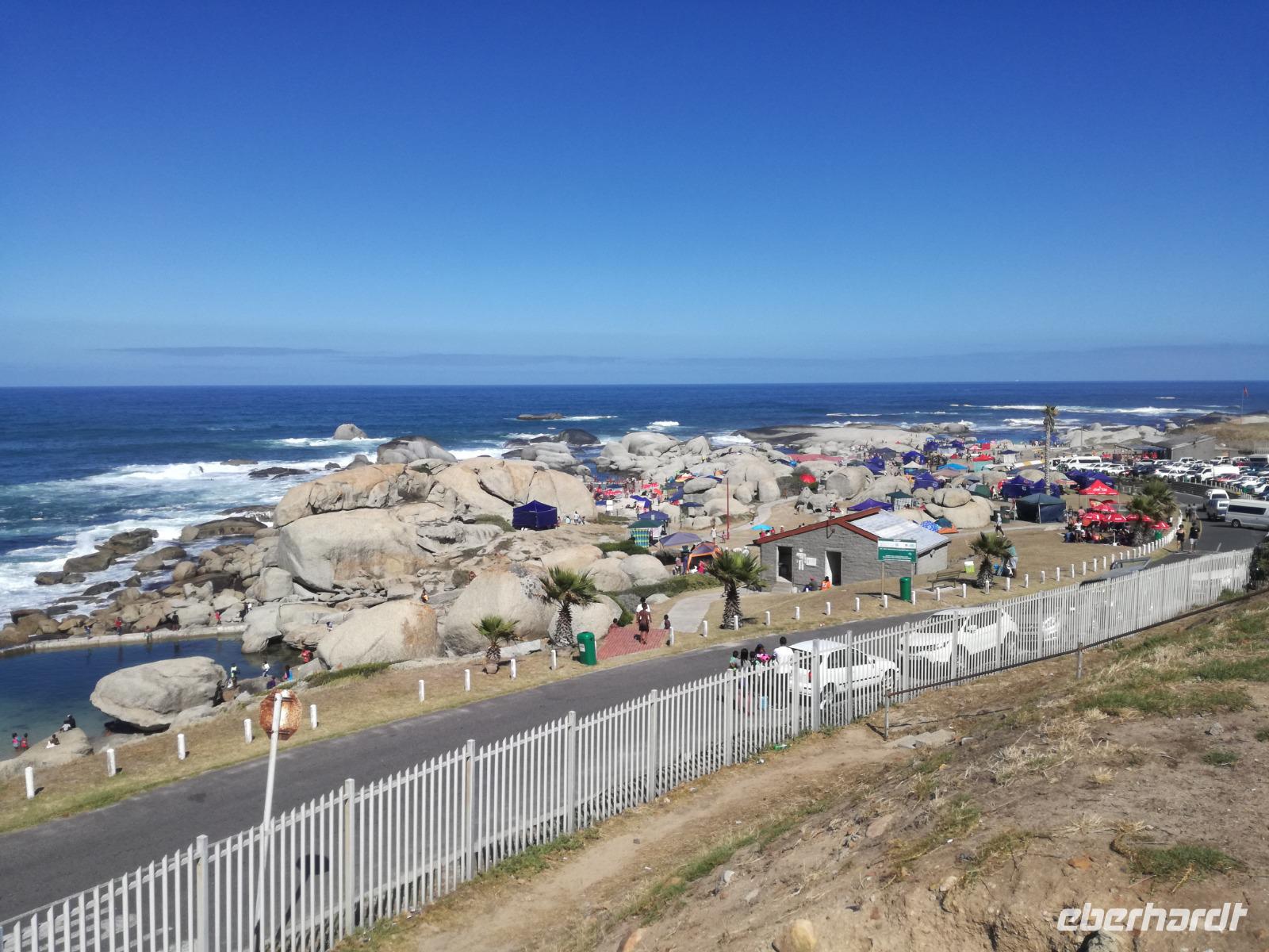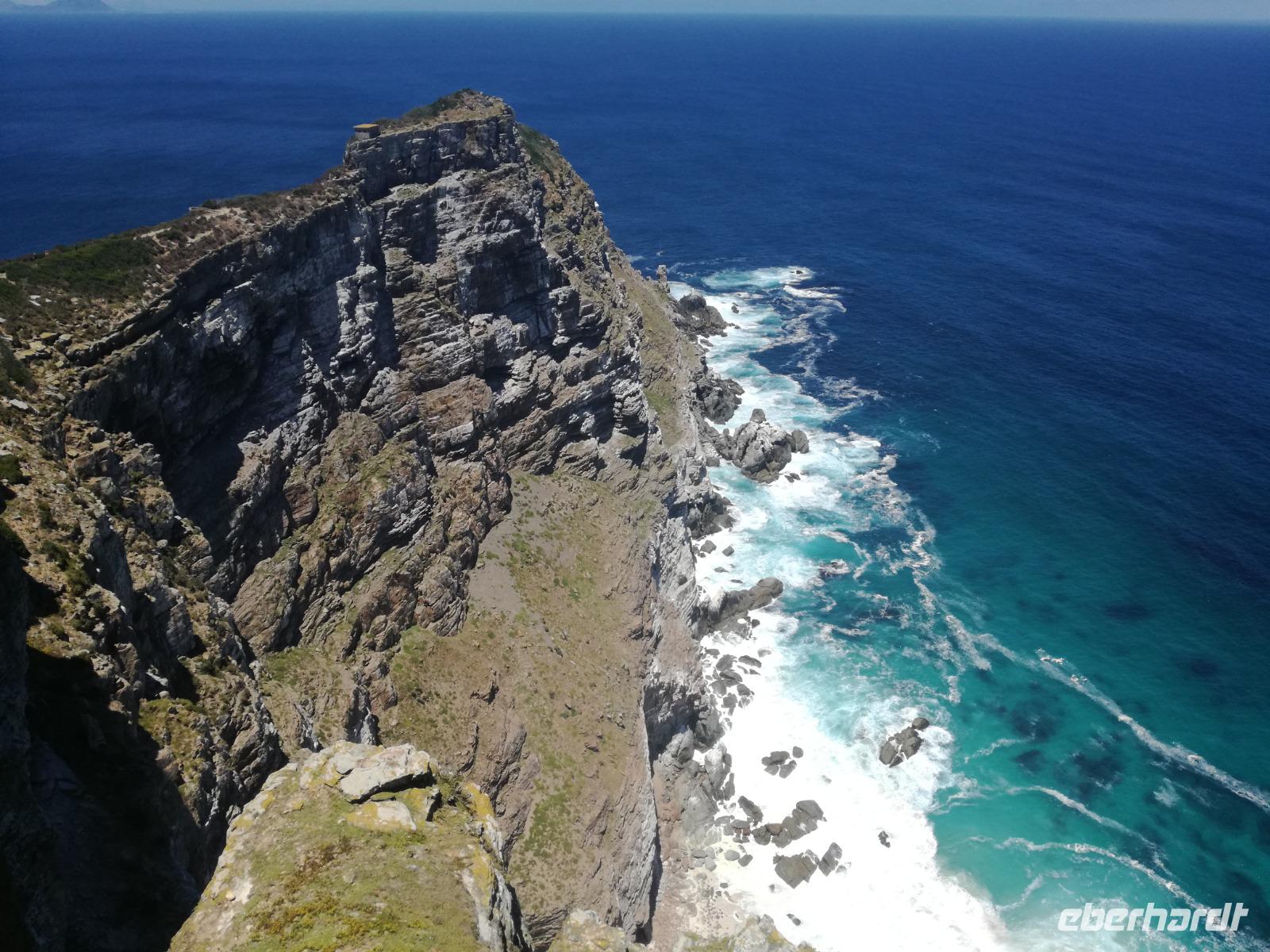 Nach der schönen Feier starteten wir um 9 Uhr in den ersten Tag des Jahres. Wieder gab es ein ausgezeichnetes Frühstück. Herbie und unser Fahrer Clieve holten uns im Hotel ab. Zunächst fuhren wir an Camps Bay. Hier gab es einen schnellen Stopp beim hiesigen Hard Rock Café Kapstadt. Weiter sollte es in Richtung Kap der Guten Hoffnung gehen. Ein weiterer Stopp folgte in Clifden. Hier gibt es einen wunderschönen Aussichtspunkt auf das Meer und die Bucht. Weiter führte uns der Weg über die atemberaubende Panoramastraße Chapman Peak Drive. Auf der Küstenstraße mit wunderbaren Ausblicken, wurden unter anderem Werbespots für Mercedes und BMW gedreht, bei dem leider auch Menschen aufgrund der scharfen Kurven verletzt wurden. Unser nächster Halt erfolgte am Cap der guten Hoffnung. Im jeweiligen Table Mountain Nationalpark leben bis zu 250 Vogel und über 1.000 Pflanzenarten. Der eigentliche Höhepunkt ist der Cape Point, der 200m oberhalb des Kaps der guten Hoffnung liegt. Neben einem Restaurant und Souvenirläden gibt es hier auch eine Seilbahn, die uns bis zum alten Leuchtturm des Kaps brachte. Von hier aus hatten wir eine wundervolle Aussicht und genossen das gute Wetter in vollen Zügen. Manche nahmen die Seilbahn zurück und manche spazierten über Treppen zurück zum Ausgangspunkt. Weiter ging es zum südlichen Zipfel der Halbinsel. Hier liegt das sagenumworbenes Kap der Guten Hoffnung. Das berühmte Kap der guten Hoffnung erhielt Ihren Namen vom portugiesischen König Johann II, da der Seeweg ihm den Weg nach Indien ebnete. Hier legten wir einen Fotostopp ein und schossen unendliche Bilder. Natürliche durfte hier eine Kaptaufe nicht fehlen. Gemeinsam stießen wir auf das neue Jahr und auf das Kap an. Nachdem wir das Kap ausführlich erkundet hatten, wollten wir auch noch die hiesige Tierwelt kennen lernen. Doch zunächst einmal gab es Mittagessen. Im bekannten Fischrestaurant Black Merlin gab es unser Neujahrsessen mit Fisch, Garnelen und Hummer. Ein leckeres Mittagessen direkt am Meer. In der Nähe von Simonstown stoppten wir am Boulders Beach und gingen auf Tuchfühlung mit den einheimischen Pinguinen, die sich in der Sonne räkelten. Plötzlich drehte das Wetter und wir mussten uns beeilen, damit wir trocken im Bus ankamen. Das Wetter vermieste unsere Stimmung nicht und wir fuhren zum Hotel zurück, wo wir müde ins Bett fielen. Langsam ging ein aufregender Tag zu Ende.