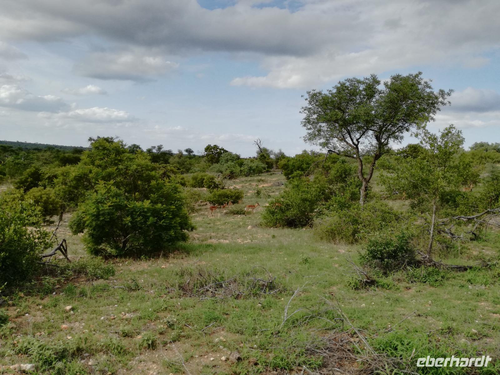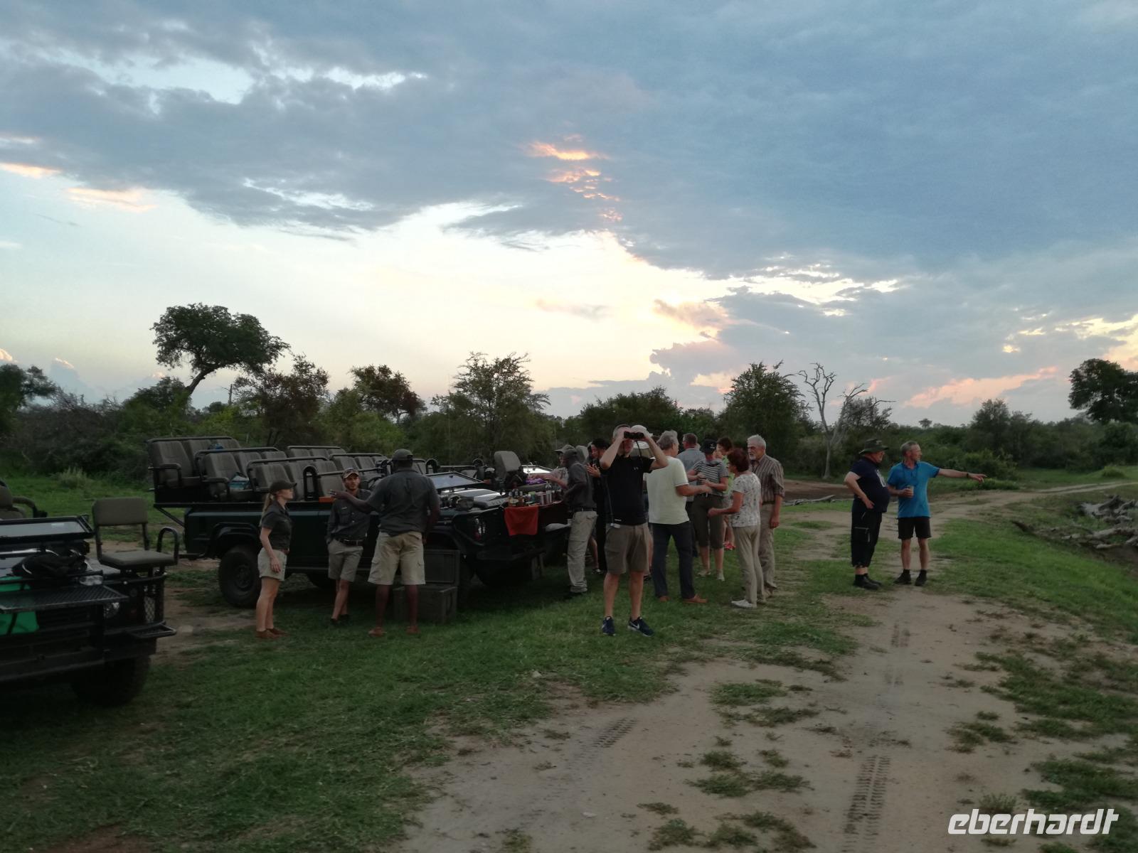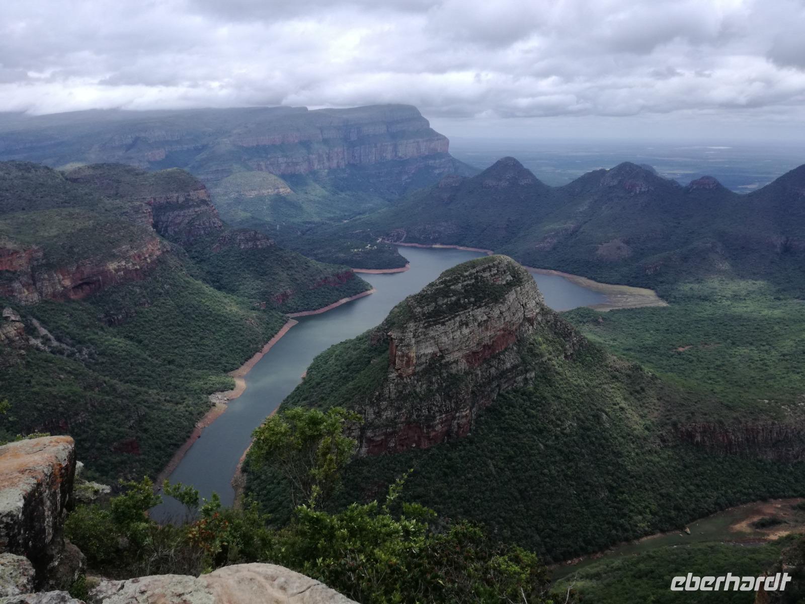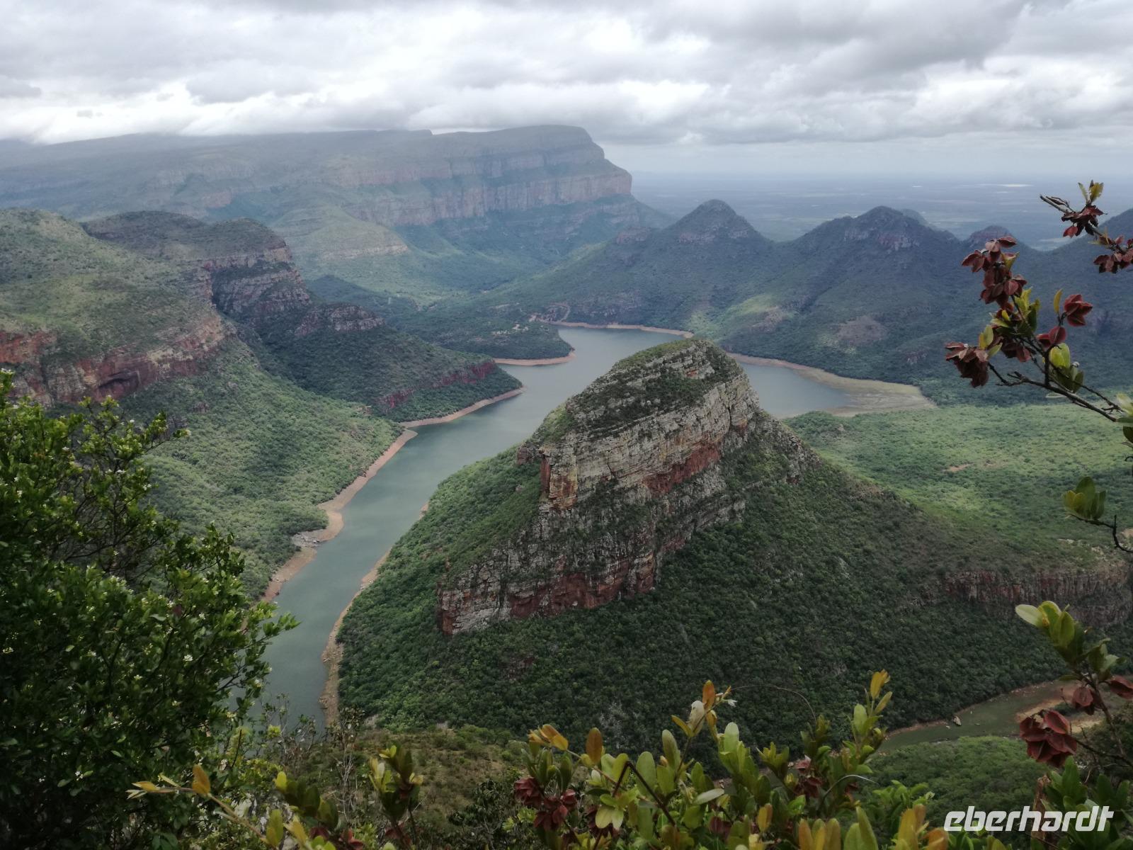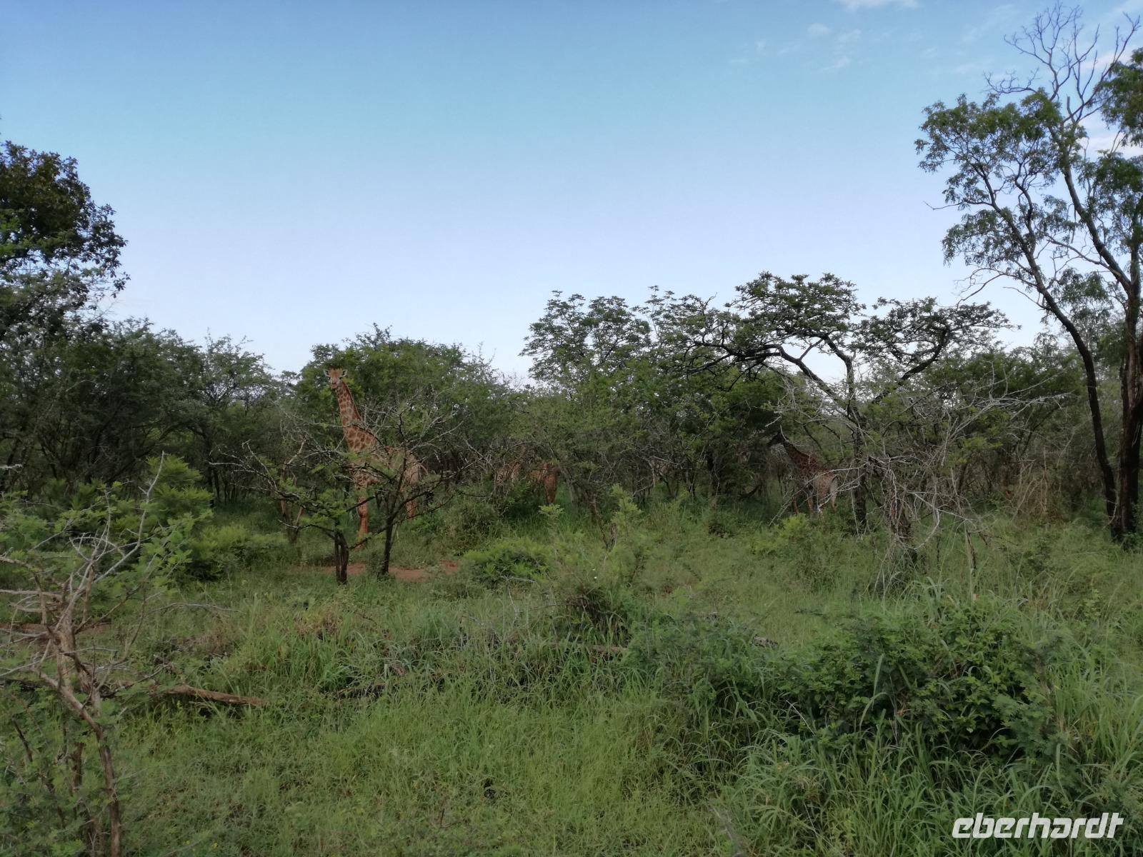 Leider hatte sich heute der Nebel noch nicht verzogen und die Lodge lag immer noch im Nebel. Naja wir wollten ja eh heute abreisen. Nach dem Frühstück ging es also auf die Panorama Route und wir hofften, dass der Nebel sich verzog. Uns führte die enge Passstraße durch die Bergkette der Drachenberge. Kurzer vor unserem ersten Stopp am God´s Window aber verdichtete sich der Nebel wieder. Unser erster Stopp fiel deshalb ins Wasser, denn God´s Window (Gottes Fenster) war leider geschlossen oder besser gesagt, ein Blick aus dem Fenster lohnte sich nicht. Als Ersatz stoppen wir am Berliner Falls. Am Wasserfall kam auch wieder die Sonne raus und wir bestaunten den tollen Wasserfall. Weiter ging es zum Blyde River Canyon. Der Blyde River Canyon, wegen seiner Schönheit auch "Frauencanyon" genannt, beginnt bei Bourke's Luck Potholes, einer eindrucksvollen Gesteinsformation, wo Tom Bourke sein "Glück" fand und später wieder verlor. Auch hier stand die Sonne hoch oben am Himmel und wir konnten einen Spaziergang durch die bizarren Felsen und Schluchten, über die Brücken des Trauer- und Freudenflusses unternehmen. Auch den Blyde River Canyon, den spektakulärsten Abschnitt des Canyon konnten wir bei relativ guter Sicht bewundern. Der atemberaubende Blick auf die Three Rondalves, die imposant aus dem Canyon emporragen, entschädigte für den neblig-nassen Beginn des Tages. Die Schlucht ist über 800 m tief und der Canyon selbst über 25 km lang. Der Blyde River (Freudenfluss) durchfließt ihn. Danach fing es wieder an mit regnen. Über enge Passstraßen und den Abel Erasmus Pass fuhren wieder vom Hochplateau hinunter nach Hoedspruit am Olifants Fluss. Unser Ziel war das private Timbavati Wildreservat am Krüger-Nationalpark. Am Flugplatz stiegen wir in kleinere Fahrzeuge um, die uns zur Lodge brachten. Die Fahrt dahin war bereits eine Safari. Wir sahen Kudus, Elefanten und Giraffen. Herzlich wurden wir in der privat geführten Simbavati River Lodge empfangen und stärkten uns beim einem leichten Mittagssnack. Unsere Luxus-Zelte und Chalets, die erst vor kurzem komplett renoviert wurden, ließen keine Wünsche offen. Simbavati, ein perfekter Ort, um dem "Ruf der Wildnis" zu folgen und dezenten Luxus zu geniessen. Der Name der Lodge stammt aus der Sprache der Shangaan und bedeutet so viel wie: "Der Ort, an dem die Löwen von den Sternen herabsteigen". Wir waren alle sehr gespannt. Nach dem Mittagssnack bezogen wir unsere Luxus-Hütten, vor denen Buschböcke grasten und sich Meerkatzen tummelten. Am späten Nachmittag bestiegen wir unsere 3 Jeeps: 6 Gäste pro Jeep, das ist Luxus. Mit den Ranger Frank, Robin und Kruger und deren Trackern (Spurenleser) ging's ab in den Busch, zur ersten Pirschfahrt. Und was uns da erwartete, abseits von den Massenandrang im Krüger NP, war einfach tierisch lecker. In der afrikanischen Sommerzeit im Norden des Landes ist der Busch üppig grün, da es in dieser Zeit regnet, aber auch sehr schwülwarm sein kann. Die Augen müssen sich schon konzentrieren, um im dichten Dickicht die Tiere zu spähen. In der trockenen Winterzeit ist es da wesentlich einfacher. Auf unserer spannenden Pirschfahrt entdeckten wir so Allerlei: Kudus, unzählige Impalas mit vielen Jungtieren, Wasserböcke, Zebras und bunte Vögel wie eine Blauracke. Der Höhepunkt hingegen war die Sichtung von 3 Löwen, die vor uns im Gras schliefen. Von unseren Rangern erfuhren wir eine Menge über die Tiere. Beim anschließenden Sundowner in einem ausgetrockneten Flußbett (das schien ein sicherer Platz für einen Ausstieg zu sein) wurde traditionell die Busch-Bar geöffnet. Mit Gin & Tonic, Savanna Dry oder einem Weinchen stießen wir auf die erfolgreiche Pirsch an. Wir waren noch so voller Adrenalin, dass wir die Zeit vergaßen. Zurück in der Lodge war es schon dunkel. Unser persönlicher Lodge-Adjutant begleitete uns zu unseren Zelten und Chalets. Eine wichtige Regel im Lodgegelände, welches nicht eingezäunt ist: Im Dunkeln immer in Begleitung der Lodge-Mitarbeiter! So wurden wir auch kurze Zeit später zum Abendessen abgeholt. Bei einem Drink an der Bar schwelgten wir noch in den Erlebnissen der Pirschfahrt. In der offenen Boma war für uns eingedeckt. Bei einem Drink auf der Terrasse schwelgten wir noch in den Erlebnissen der Pirschfahrt. In der offenen Boma brannte das Lagerfeuer und alles war für uns romantisch eingedeckt. Wir labten uns am großen Grillbufett und wurden fürstlich an diesem lauen Abend verwöhnt.
