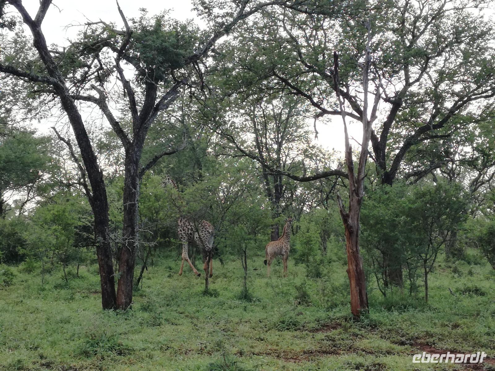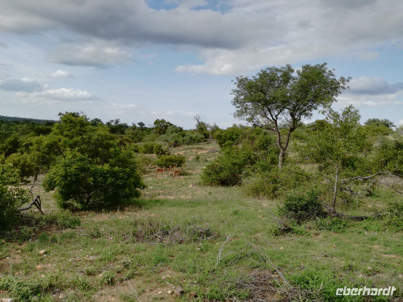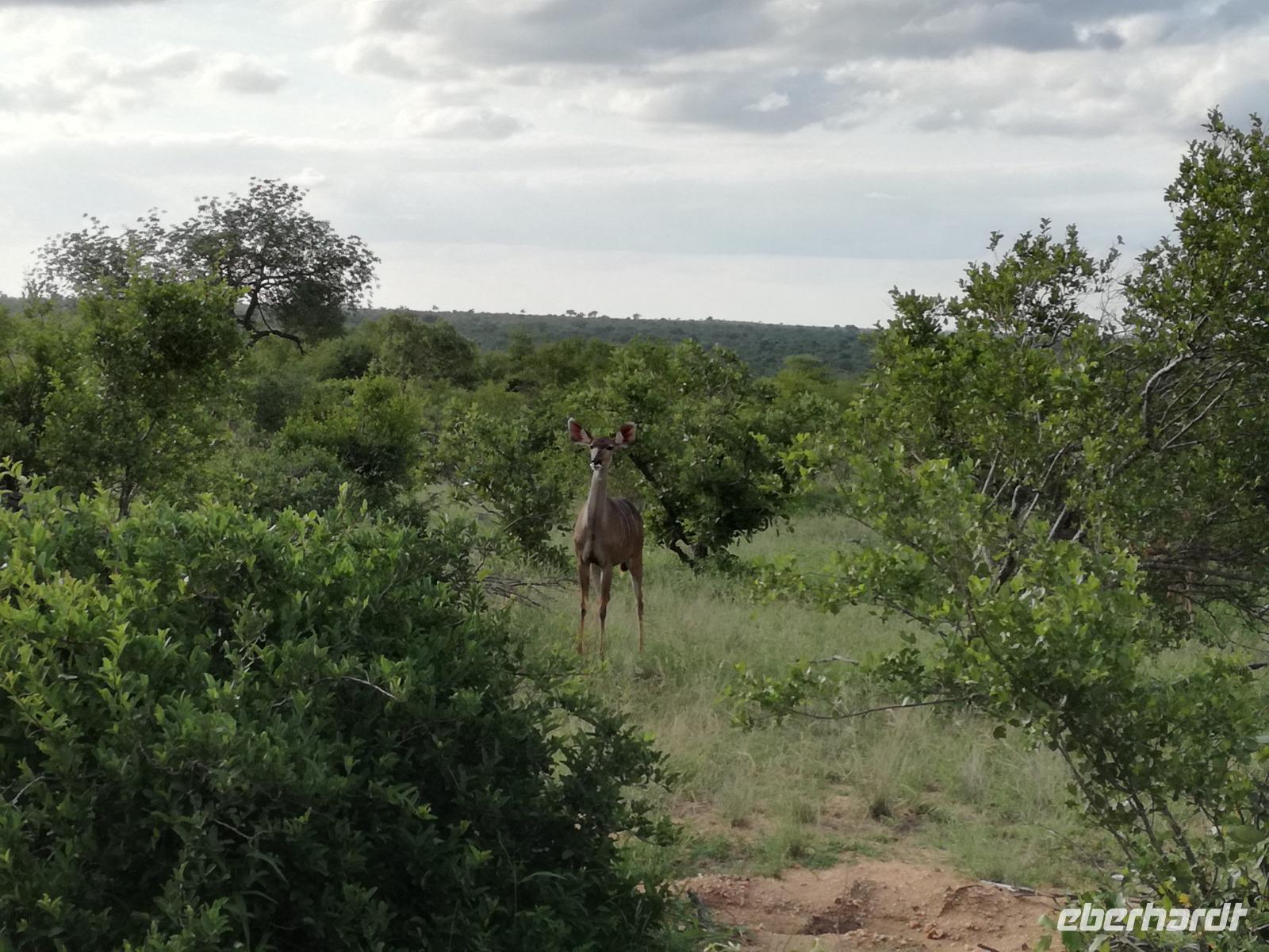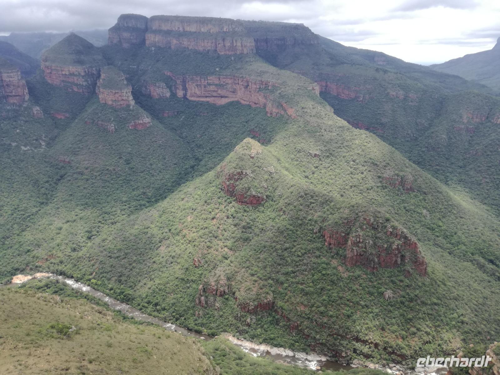 Leider hatte sich heute der Nebel noch nicht verzogen und die Lodge lag immer noch im Nebel. Naja wir wollten ja eh heute abreisen. Nach dem Frühstück ging es also auf die Panorama Route und wir hofften, dass der Nebel sich verzog. Uns führte die enge Passstraße durch die Bergkette der Drachenberge. Kurzer vor unserem ersten Stopp am God´s Window aber verdichtete sich der Nebel wieder. Unser erster Stopp fiel deshalb ins Wasser, denn God´s Window (Gottes Fenster) war leider geschlossen oder besser gesagt, ein Blick aus dem Fenster lohnte sich nicht. Als Ersatz stoppen wir am Berliner Falls. Am Wasserfall kam auch wieder die Sonne raus und wir bestaunten den tollen Wasserfall. Weiter ging es zum Blyde River Canyon. Der Blyde River Canyon, wegen seiner Schönheit auch "Frauencanyon" genannt, beginnt bei Bourke's Luck Potholes, einer eindrucksvollen Gesteinsformation, wo Tom Bourke sein "Glück" fand und später wieder verlor. Auch hier stand die Sonne hoch oben am Himmel und wir konnten einen Spaziergang durch die bizarren Felsen und Schluchten, über die Brücken des Trauer- und Freudenflusses unternehmen. Auch den Blyde River Canyon, den spektakulärsten Abschnitt des Canyon konnten wir bei relativ guter Sicht bewundern. Der atemberaubende Blick auf die Three Rondalves, die imposant aus dem Canyon emporragen, entschädigte für den neblig-nassen Beginn des Tages. Die Schlucht ist über 800 m tief und der Canyon selbst über 25 km lang. Der Blyde River (Freudenfluss) durchfließt ihn. Danach fing es wieder an mit regnen. Über enge Passstraßen und den Abel Erasmus Pass fuhren wieder vom Hochplateau hinunter nach Hoedspruit am Olifants Fluss. Unser Ziel war das private Timbavati Wildreservat am Krüger-Nationalpark. Am Flugplatz stiegen wir in kleinere Fahrzeuge um, die uns zur Lodge brachten. Die Fahrt dahin war bereits eine Safari. Wir sahen Kudus, Elefanten und Giraffen. Herzlich wurden wir in der privat geführten Simbavati River Lodge empfangen und stärkten uns beim einem leichten Mittagssnack. Unsere Luxus-Zelte und Chalets, die erst vor kurzem komplett renoviert wurden, ließen keine Wünsche offen. Simbavati, ein perfekter Ort, um dem "Ruf der Wildnis" zu folgen und dezenten Luxus zu geniessen. Der Name der Lodge stammt aus der Sprache der Shangaan und bedeutet so viel wie: "Der Ort, an dem die Löwen von den Sternen herabsteigen". Wir waren alle sehr gespannt. Nach dem Mittagssnack bezogen wir unsere Luxus-Hütten, vor denen Buschböcke grasten und sich Meerkatzen tummelten. Am späten Nachmittag bestiegen wir unsere 3 Jeeps: 6 Gäste pro Jeep, das ist Luxus. Mit den Ranger Frank, Robin und Kruger und deren Trackern (Spurenleser) ging's ab in den Busch, zur ersten Pirschfahrt. Und was uns da erwartete, abseits von den Massenandrang im Krüger NP, war einfach tierisch lecker. In der afrikanischen Sommerzeit im Norden des Landes ist der Busch üppig grün, da es in dieser Zeit regnet, aber auch sehr schwülwarm sein kann. Die Augen müssen sich schon konzentrieren, um im dichten Dickicht die Tiere zu spähen. In der trockenen Winterzeit ist es da wesentlich einfacher. Auf unserer spannenden Pirschfahrt entdeckten wir so Allerlei: Kudus, unzählige Impalas mit vielen Jungtieren, Wasserböcke, Zebras und bunte Vögel wie eine Blauracke. Der Höhepunkt hingegen war die Sichtung von 3 Löwen, die vor uns im Gras schliefen. Von unseren Rangern erfuhren wir eine Menge über die Tiere. Beim anschließenden Sundowner in einem ausgetrockneten Flußbett (das schien ein sicherer Platz für einen Ausstieg zu sein) wurde traditionell die Busch-Bar geöffnet. Mit Gin & Tonic, Savanna Dry oder einem Weinchen stießen wir auf die erfolgreiche Pirsch an. Wir waren noch so voller Adrenalin, dass wir die Zeit vergaßen. Zurück in der Lodge war es schon dunkel. Unser persönlicher Lodge-Adjutant begleitete uns zu unseren Zelten und Chalets. Eine wichtige Regel im Lodgegelände, welches nicht eingezäunt ist: Im Dunkeln immer in Begleitung der Lodge-Mitarbeiter! So wurden wir auch kurze Zeit später zum Abendessen abgeholt. Bei einem Drink an der Bar schwelgten wir noch in den Erlebnissen der Pirschfahrt. In der offenen Boma war für uns eingedeckt. Bei einem Drink auf der Terrasse schwelgten wir noch in den Erlebnissen der Pirschfahrt. In der offenen Boma brannte das Lagerfeuer und alles war für uns romantisch eingedeckt. Wir labten uns am großen Grillbufett und wurden fürstlich an diesem lauen Abend verwöhnt.