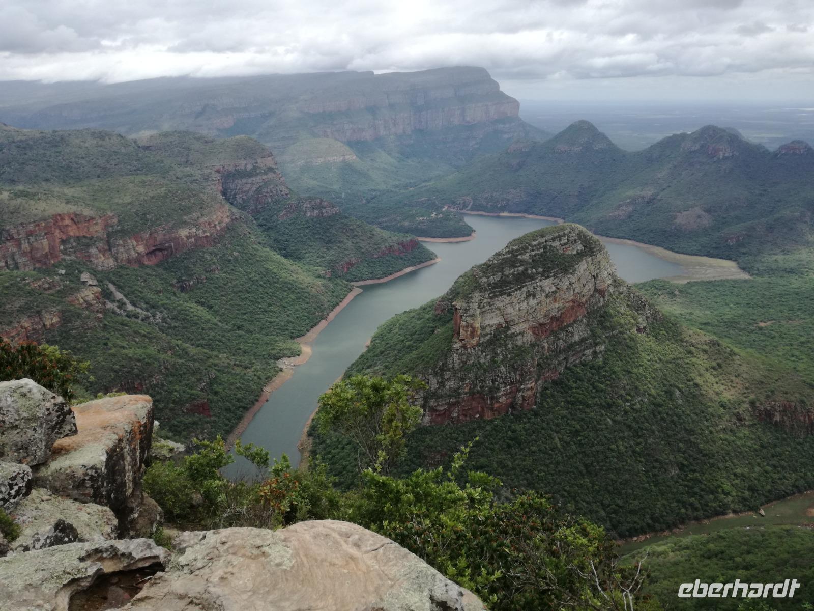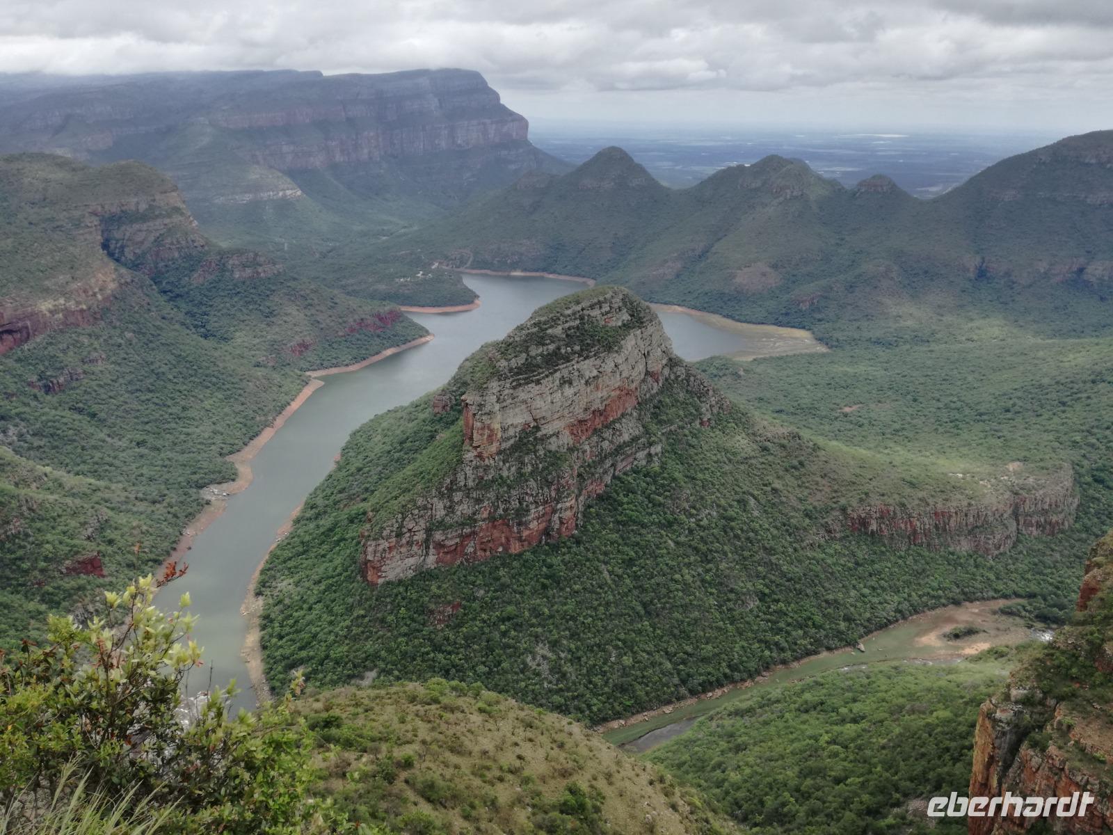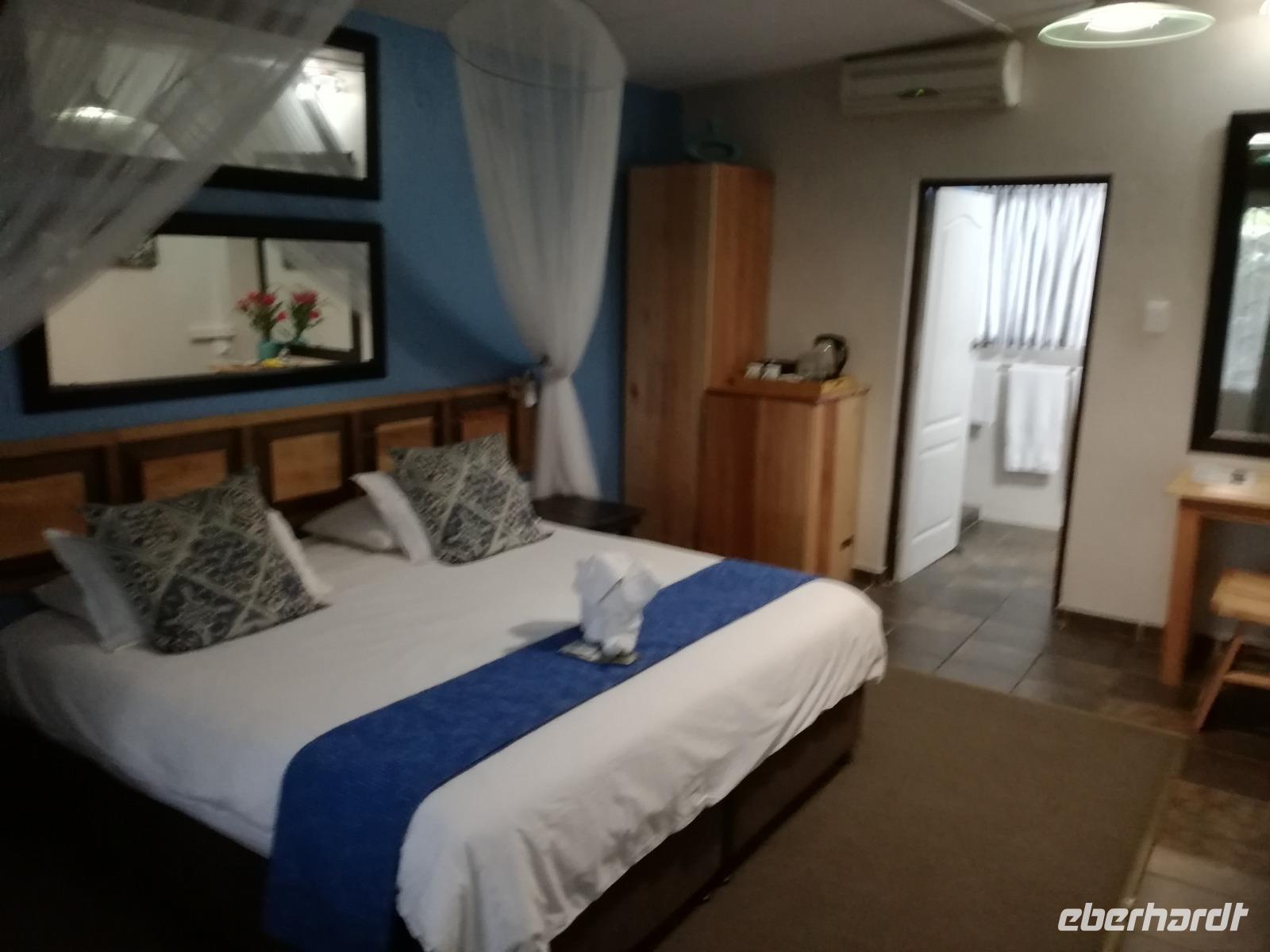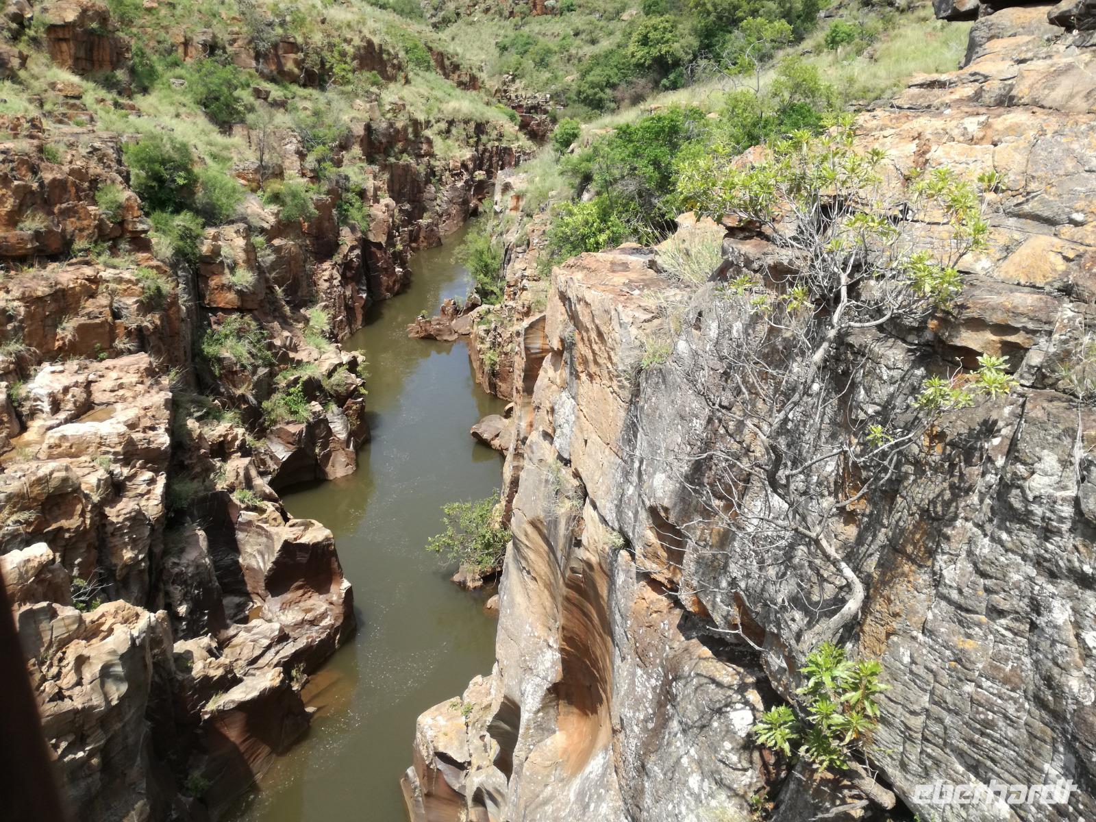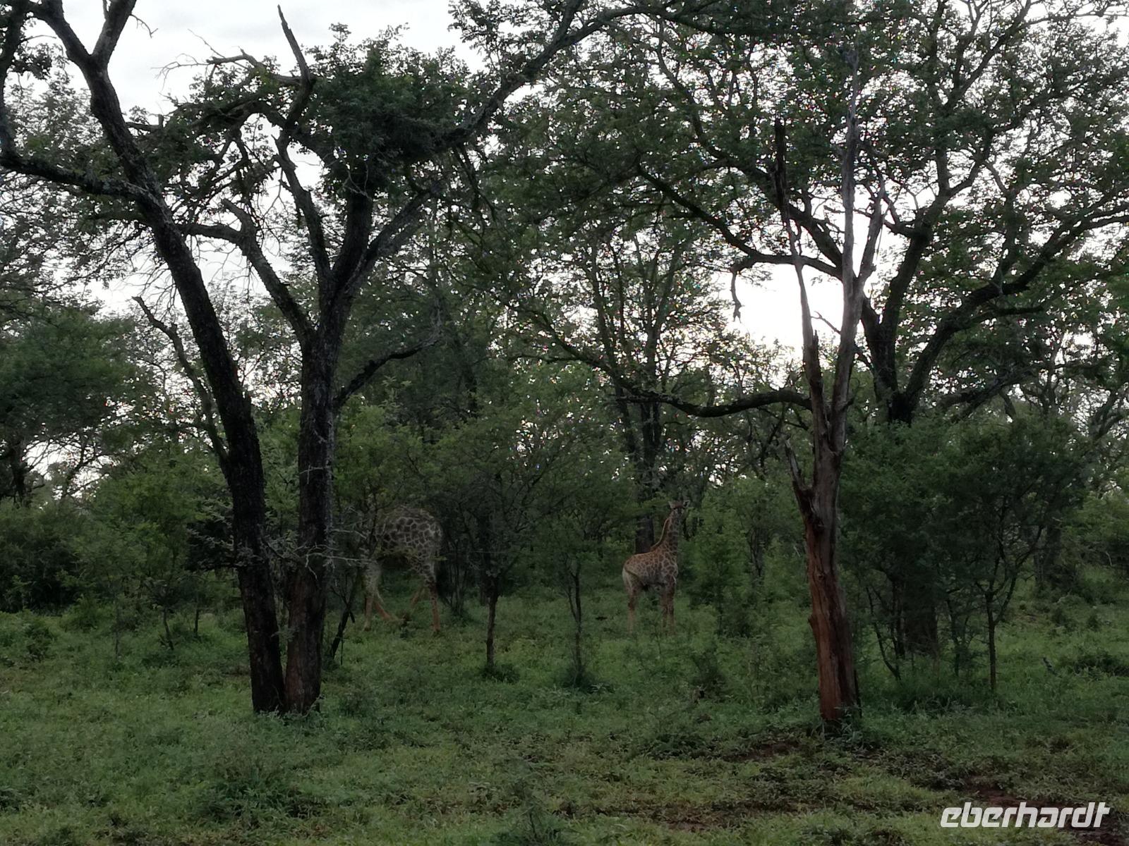 Leider hatte sich heute der Nebel noch nicht verzogen und die Lodge lag immer noch im Nebel. Naja wir wollten ja eh heute abreisen. Nach dem Frühstück ging es also auf die Panorama Route und wir hofften, dass der Nebel sich verzog. Uns führte die enge Passstraße durch die Bergkette der Drachenberge. Kurzer vor unserem ersten Stopp am God´s Window aber verdichtete sich der Nebel wieder. Unser erster Stopp fiel deshalb ins Wasser, denn God´s Window (Gottes Fenster) war leider geschlossen oder besser gesagt, ein Blick aus dem Fenster lohnte sich nicht. Als Ersatz stoppen wir am Berliner Falls. Am Wasserfall kam auch wieder die Sonne raus und wir bestaunten den tollen Wasserfall. Weiter ging es zum Blyde River Canyon. Der Blyde River Canyon, wegen seiner Schönheit auch "Frauencanyon" genannt, beginnt bei Bourke's Luck Potholes, einer eindrucksvollen Gesteinsformation, wo Tom Bourke sein "Glück" fand und später wieder verlor. Auch hier stand die Sonne hoch oben am Himmel und wir konnten einen Spaziergang durch die bizarren Felsen und Schluchten, über die Brücken des Trauer- und Freudenflusses unternehmen. Auch den Blyde River Canyon, den spektakulärsten Abschnitt des Canyon konnten wir bei relativ guter Sicht bewundern. Der atemberaubende Blick auf die Three Rondalves, die imposant aus dem Canyon emporragen, entschädigte für den neblig-nassen Beginn des Tages. Die Schlucht ist über 800 m tief und der Canyon selbst über 25 km lang. Der Blyde River (Freudenfluss) durchfließt ihn. Danach fing es wieder an mit regnen. Über enge Passstraßen und den Abel Erasmus Pass fuhren wieder vom Hochplateau hinunter nach Hoedspruit am Olifants Fluss. Unser Ziel war das private Timbavati Wildreservat am Krüger-Nationalpark. Am Flugplatz stiegen wir in kleinere Fahrzeuge um, die uns zur Lodge brachten. Die Fahrt dahin war bereits eine Safari. Wir sahen Kudus, Elefanten und Giraffen. Herzlich wurden wir in der privat geführten Simbavati River Lodge empfangen und stärkten uns beim einem leichten Mittagssnack. Unsere Luxus-Zelte und Chalets, die erst vor kurzem komplett renoviert wurden, ließen keine Wünsche offen. Simbavati, ein perfekter Ort, um dem "Ruf der Wildnis" zu folgen und dezenten Luxus zu geniessen. Der Name der Lodge stammt aus der Sprache der Shangaan und bedeutet so viel wie: "Der Ort, an dem die Löwen von den Sternen herabsteigen". Wir waren alle sehr gespannt. Nach dem Mittagssnack bezogen wir unsere Luxus-Hütten, vor denen Buschböcke grasten und sich Meerkatzen tummelten. Am späten Nachmittag bestiegen wir unsere 3 Jeeps: 6 Gäste pro Jeep, das ist Luxus. Mit den Ranger Frank, Robin und Kruger und deren Trackern (Spurenleser) ging's ab in den Busch, zur ersten Pirschfahrt. Und was uns da erwartete, abseits von den Massenandrang im Krüger NP, war einfach tierisch lecker. In der afrikanischen Sommerzeit im Norden des Landes ist der Busch üppig grün, da es in dieser Zeit regnet, aber auch sehr schwülwarm sein kann. Die Augen müssen sich schon konzentrieren, um im dichten Dickicht die Tiere zu spähen. In der trockenen Winterzeit ist es da wesentlich einfacher. Auf unserer spannenden Pirschfahrt entdeckten wir so Allerlei: Kudus, unzählige Impalas mit vielen Jungtieren, Wasserböcke, Zebras und bunte Vögel wie eine Blauracke. Der Höhepunkt hingegen war die Sichtung von 3 Löwen, die vor uns im Gras schliefen. Von unseren Rangern erfuhren wir eine Menge über die Tiere. Beim anschließenden Sundowner in einem ausgetrockneten Flußbett (das schien ein sicherer Platz für einen Ausstieg zu sein) wurde traditionell die Busch-Bar geöffnet. Mit Gin & Tonic, Savanna Dry oder einem Weinchen stießen wir auf die erfolgreiche Pirsch an. Wir waren noch so voller Adrenalin, dass wir die Zeit vergaßen. Zurück in der Lodge war es schon dunkel. Unser persönlicher Lodge-Adjutant begleitete uns zu unseren Zelten und Chalets. Eine wichtige Regel im Lodgegelände, welches nicht eingezäunt ist: Im Dunkeln immer in Begleitung der Lodge-Mitarbeiter! So wurden wir auch kurze Zeit später zum Abendessen abgeholt. Bei einem Drink an der Bar schwelgten wir noch in den Erlebnissen der Pirschfahrt. In der offenen Boma war für uns eingedeckt. Bei einem Drink auf der Terrasse schwelgten wir noch in den Erlebnissen der Pirschfahrt. In der offenen Boma brannte das Lagerfeuer und alles war für uns romantisch eingedeckt. Wir labten uns am großen Grillbufett und wurden fürstlich an diesem lauen Abend verwöhnt.
