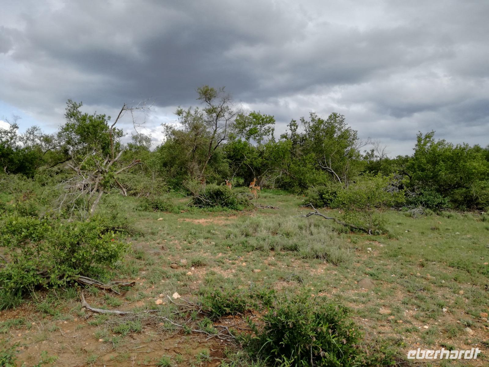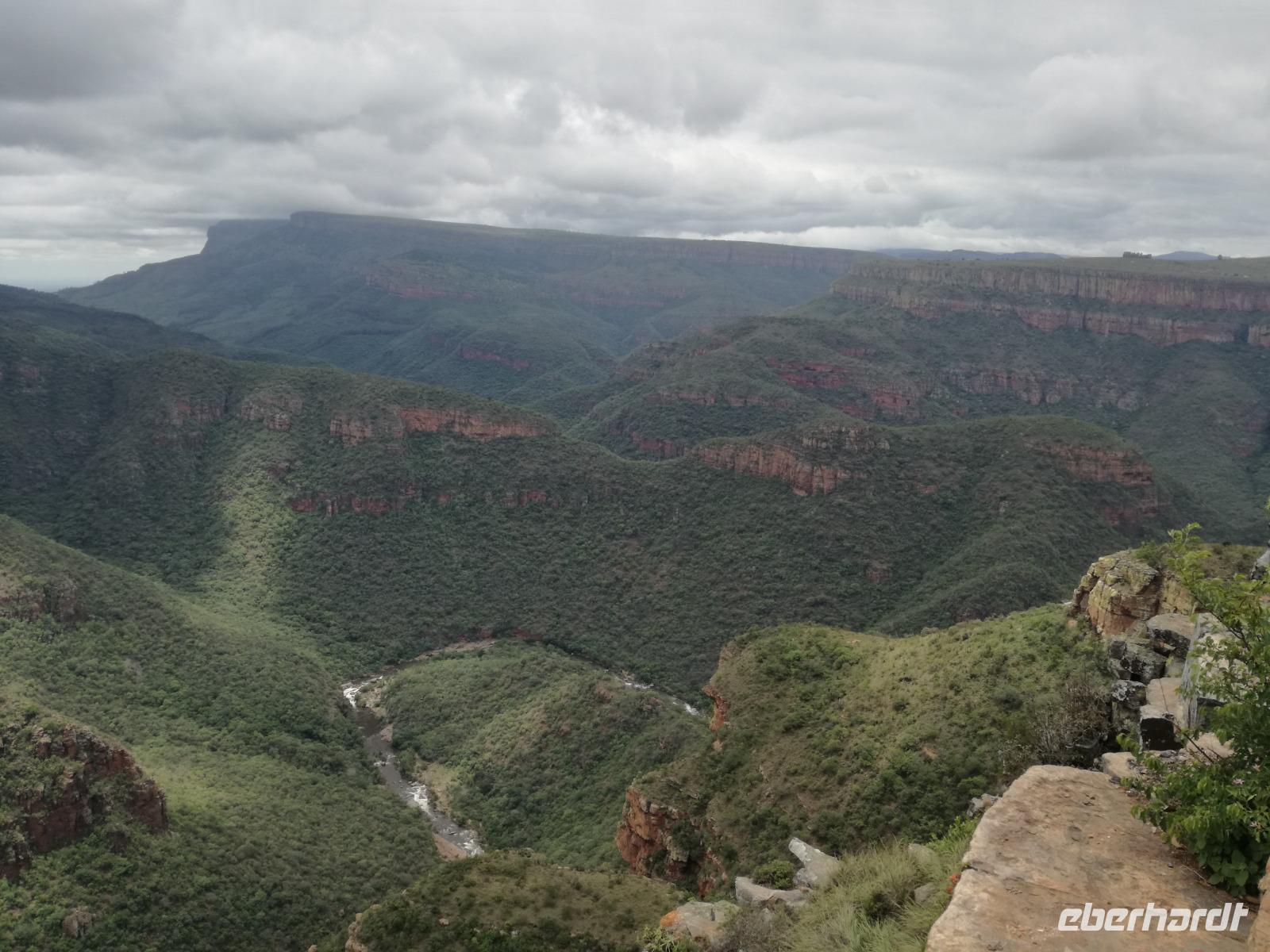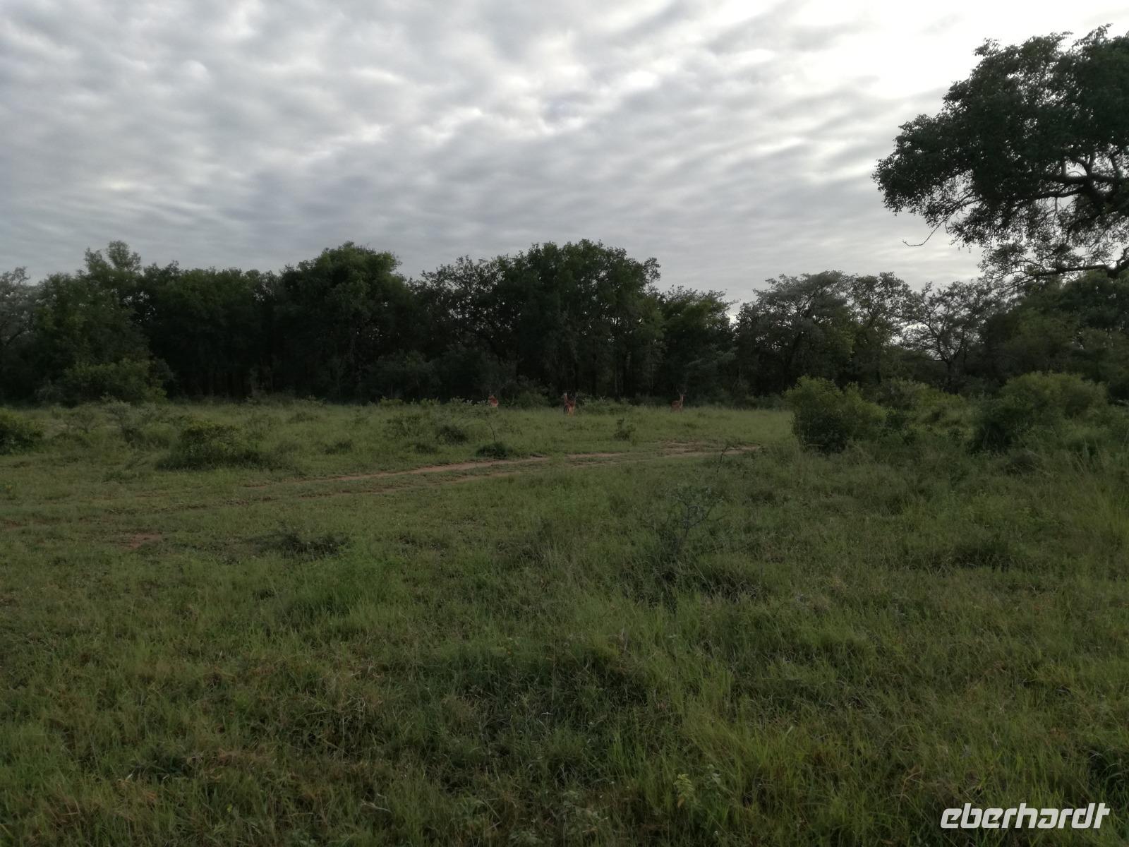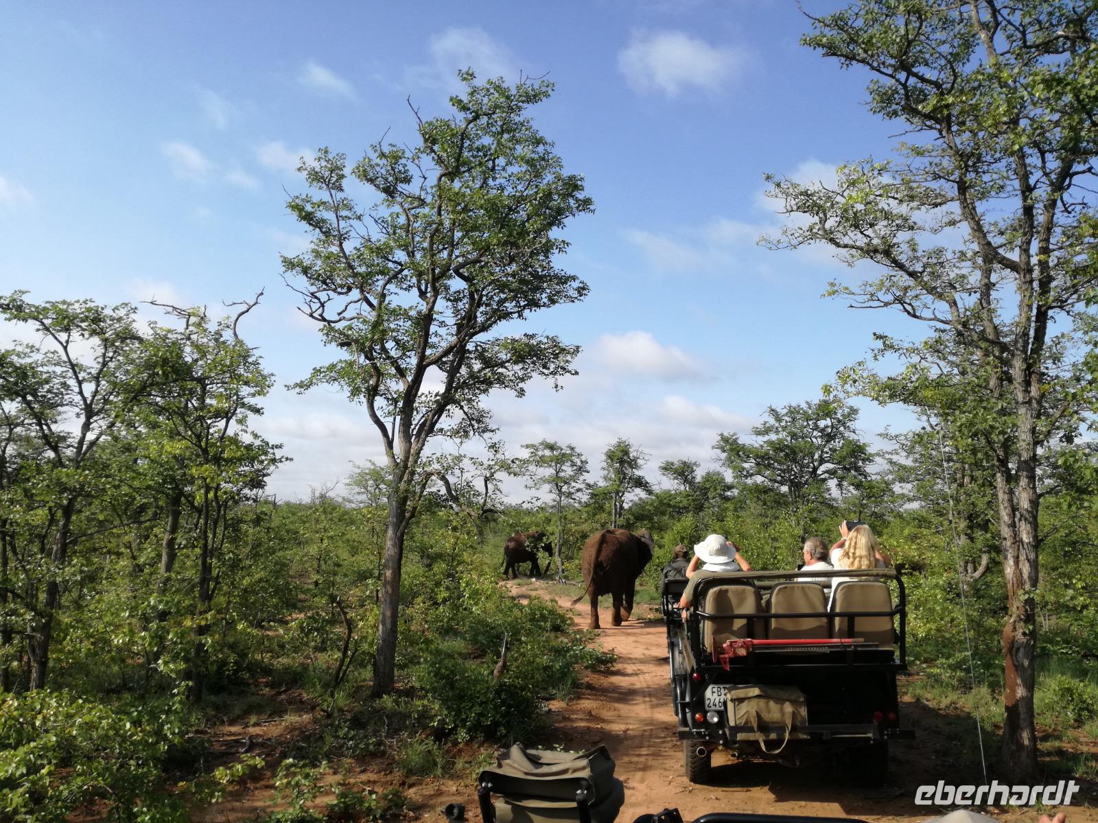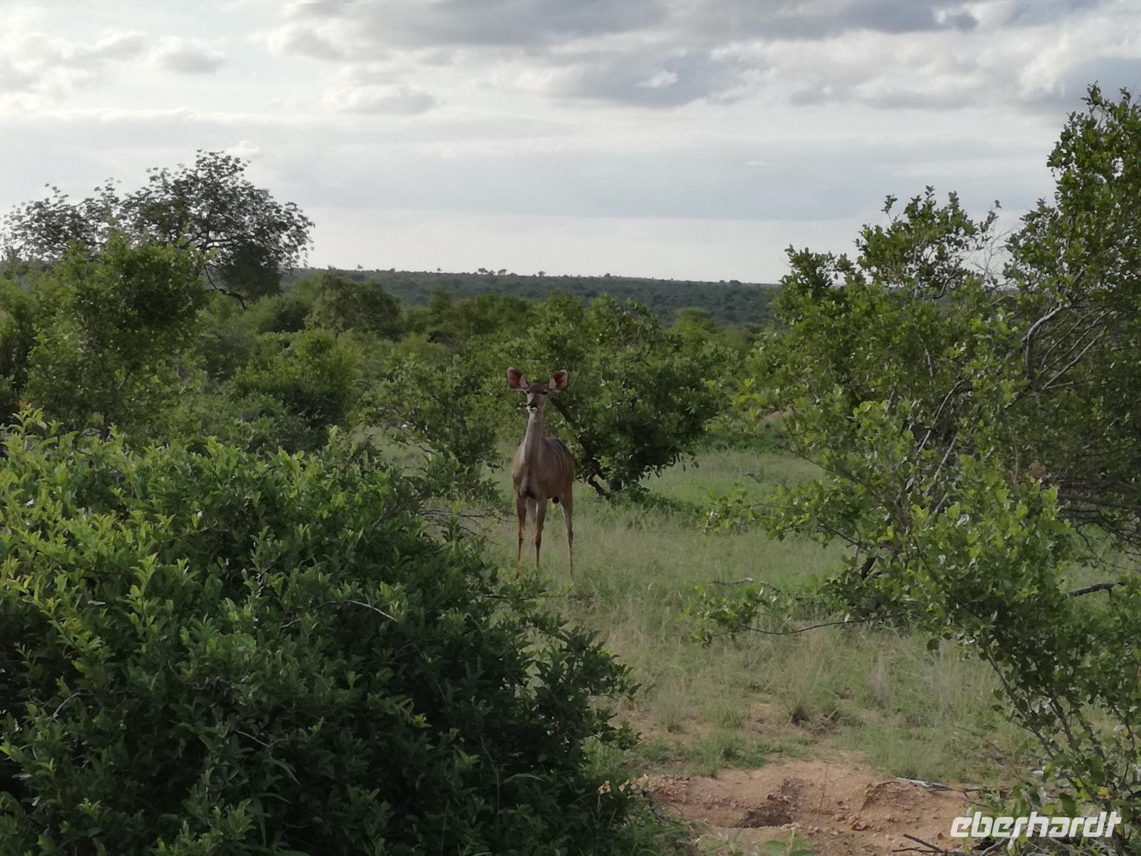 Leider hatte sich heute der Nebel noch nicht verzogen und die Lodge lag immer noch im Nebel. Naja wir wollten ja eh heute abreisen. Nach dem Frühstück ging es also auf die Panorama Route und wir hofften, dass der Nebel sich verzog. Uns führte die enge Passstraße durch die Bergkette der Drachenberge. Kurzer vor unserem ersten Stopp am God´s Window aber verdichtete sich der Nebel wieder. Unser erster Stopp fiel deshalb ins Wasser, denn God´s Window (Gottes Fenster) war leider geschlossen oder besser gesagt, ein Blick aus dem Fenster lohnte sich nicht. Als Ersatz stoppen wir am Berliner Falls. Am Wasserfall kam auch wieder die Sonne raus und wir bestaunten den tollen Wasserfall. Weiter ging es zum Blyde River Canyon. Der Blyde River Canyon, wegen seiner Schönheit auch "Frauencanyon" genannt, beginnt bei Bourke's Luck Potholes, einer eindrucksvollen Gesteinsformation, wo Tom Bourke sein "Glück" fand und später wieder verlor. Auch hier stand die Sonne hoch oben am Himmel und wir konnten einen Spaziergang durch die bizarren Felsen und Schluchten, über die Brücken des Trauer- und Freudenflusses unternehmen. Auch den Blyde River Canyon, den spektakulärsten Abschnitt des Canyon konnten wir bei relativ guter Sicht bewundern. Der atemberaubende Blick auf die Three Rondalves, die imposant aus dem Canyon emporragen, entschädigte für den neblig-nassen Beginn des Tages. Die Schlucht ist über 800 m tief und der Canyon selbst über 25 km lang. Der Blyde River (Freudenfluss) durchfließt ihn. Danach fing es wieder an mit regnen. Über enge Passstraßen und den Abel Erasmus Pass fuhren wieder vom Hochplateau hinunter nach Hoedspruit am Olifants Fluss. Unser Ziel war das private Timbavati Wildreservat am Krüger-Nationalpark. Am Flugplatz stiegen wir in kleinere Fahrzeuge um, die uns zur Lodge brachten. Die Fahrt dahin war bereits eine Safari. Wir sahen Kudus, Elefanten und Giraffen. Herzlich wurden wir in der privat geführten Simbavati River Lodge empfangen und stärkten uns beim einem leichten Mittagssnack. Unsere Luxus-Zelte und Chalets, die erst vor kurzem komplett renoviert wurden, ließen keine Wünsche offen. Simbavati, ein perfekter Ort, um dem "Ruf der Wildnis" zu folgen und dezenten Luxus zu geniessen. Der Name der Lodge stammt aus der Sprache der Shangaan und bedeutet so viel wie: "Der Ort, an dem die Löwen von den Sternen herabsteigen". Wir waren alle sehr gespannt. Nach dem Mittagssnack bezogen wir unsere Luxus-Hütten, vor denen Buschböcke grasten und sich Meerkatzen tummelten. Am späten Nachmittag bestiegen wir unsere 3 Jeeps: 6 Gäste pro Jeep, das ist Luxus. Mit den Ranger Frank, Robin und Kruger und deren Trackern (Spurenleser) ging's ab in den Busch, zur ersten Pirschfahrt. Und was uns da erwartete, abseits von den Massenandrang im Krüger NP, war einfach tierisch lecker. In der afrikanischen Sommerzeit im Norden des Landes ist der Busch üppig grün, da es in dieser Zeit regnet, aber auch sehr schwülwarm sein kann. Die Augen müssen sich schon konzentrieren, um im dichten Dickicht die Tiere zu spähen. In der trockenen Winterzeit ist es da wesentlich einfacher. Auf unserer spannenden Pirschfahrt entdeckten wir so Allerlei: Kudus, unzählige Impalas mit vielen Jungtieren, Wasserböcke, Zebras und bunte Vögel wie eine Blauracke. Der Höhepunkt hingegen war die Sichtung von 3 Löwen, die vor uns im Gras schliefen. Von unseren Rangern erfuhren wir eine Menge über die Tiere. Beim anschließenden Sundowner in einem ausgetrockneten Flußbett (das schien ein sicherer Platz für einen Ausstieg zu sein) wurde traditionell die Busch-Bar geöffnet. Mit Gin & Tonic, Savanna Dry oder einem Weinchen stießen wir auf die erfolgreiche Pirsch an. Wir waren noch so voller Adrenalin, dass wir die Zeit vergaßen. Zurück in der Lodge war es schon dunkel. Unser persönlicher Lodge-Adjutant begleitete uns zu unseren Zelten und Chalets. Eine wichtige Regel im Lodgegelände, welches nicht eingezäunt ist: Im Dunkeln immer in Begleitung der Lodge-Mitarbeiter! So wurden wir auch kurze Zeit später zum Abendessen abgeholt. Bei einem Drink an der Bar schwelgten wir noch in den Erlebnissen der Pirschfahrt. In der offenen Boma war für uns eingedeckt. Bei einem Drink auf der Terrasse schwelgten wir noch in den Erlebnissen der Pirschfahrt. In der offenen Boma brannte das Lagerfeuer und alles war für uns romantisch eingedeckt. Wir labten uns am großen Grillbufett und wurden fürstlich an diesem lauen Abend verwöhnt.