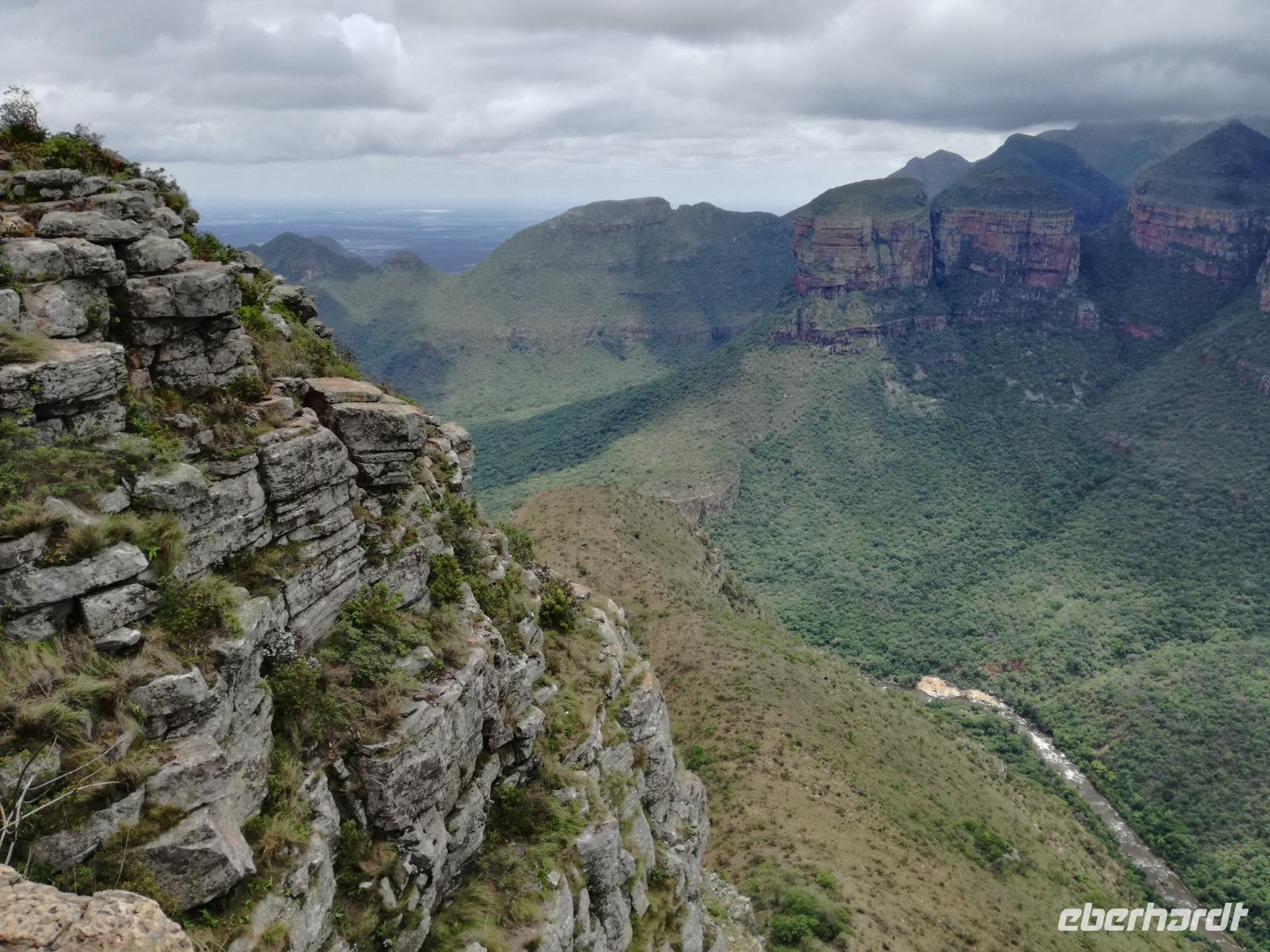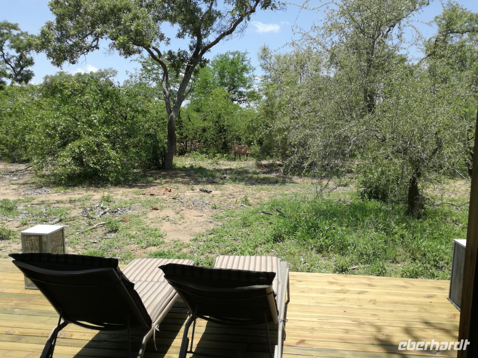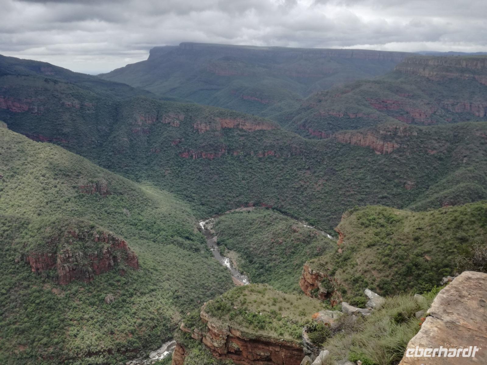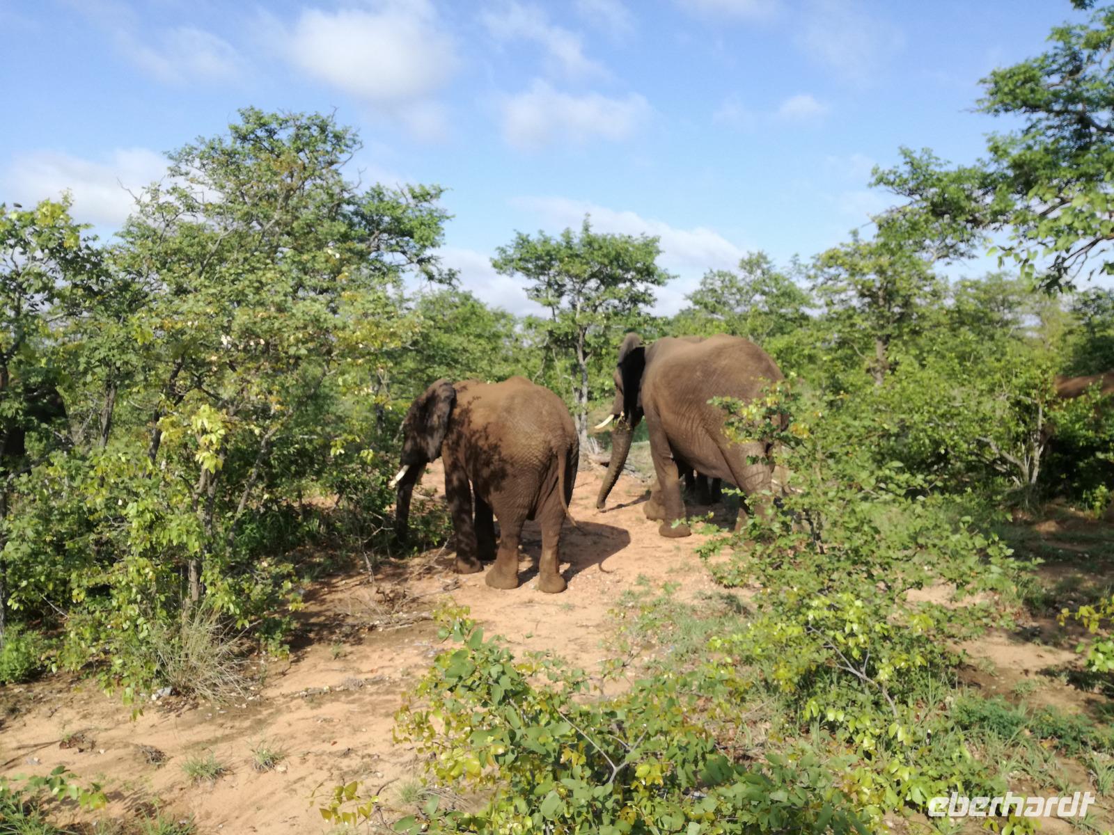 Leider hatte sich heute der Nebel noch nicht verzogen und die Lodge lag immer noch im Nebel. Naja wir wollten ja eh heute abreisen. Nach dem Frühstück ging es also auf die Panorama Route und wir hofften, dass der Nebel sich verzog. Uns führte die enge Passstraße durch die Bergkette der Drachenberge. Kurzer vor unserem ersten Stopp am God´s Window aber verdichtete sich der Nebel wieder. Unser erster Stopp fiel deshalb ins Wasser, denn God´s Window (Gottes Fenster) war leider geschlossen oder besser gesagt, ein Blick aus dem Fenster lohnte sich nicht. Als Ersatz stoppen wir am Berliner Falls. Am Wasserfall kam auch wieder die Sonne raus und wir bestaunten den tollen Wasserfall. Weiter ging es zum Blyde River Canyon. Der Blyde River Canyon, wegen seiner Schönheit auch "Frauencanyon" genannt, beginnt bei Bourke's Luck Potholes, einer eindrucksvollen Gesteinsformation, wo Tom Bourke sein "Glück" fand und später wieder verlor. Auch hier stand die Sonne hoch oben am Himmel und wir konnten einen Spaziergang durch die bizarren Felsen und Schluchten, über die Brücken des Trauer- und Freudenflusses unternehmen. Auch den Blyde River Canyon, den spektakulärsten Abschnitt des Canyon konnten wir bei relativ guter Sicht bewundern. Der atemberaubende Blick auf die Three Rondalves, die imposant aus dem Canyon emporragen, entschädigte für den neblig-nassen Beginn des Tages. Die Schlucht ist über 800 m tief und der Canyon selbst über 25 km lang. Der Blyde River (Freudenfluss) durchfließt ihn. Danach fing es wieder an mit regnen. Über enge Passstraßen und den Abel Erasmus Pass fuhren wieder vom Hochplateau hinunter nach Hoedspruit am Olifants Fluss. Unser Ziel war das private Timbavati Wildreservat am Krüger-Nationalpark. Am Flugplatz stiegen wir in kleinere Fahrzeuge um, die uns zur Lodge brachten. Die Fahrt dahin war bereits eine Safari. Wir sahen Kudus, Elefanten und Giraffen. Herzlich wurden wir in der privat geführten Simbavati River Lodge empfangen und stärkten uns beim einem leichten Mittagssnack. Unsere Luxus-Zelte und Chalets, die erst vor kurzem komplett renoviert wurden, ließen keine Wünsche offen. Simbavati, ein perfekter Ort, um dem "Ruf der Wildnis" zu folgen und dezenten Luxus zu geniessen. Der Name der Lodge stammt aus der Sprache der Shangaan und bedeutet so viel wie: "Der Ort, an dem die Löwen von den Sternen herabsteigen". Wir waren alle sehr gespannt. Nach dem Mittagssnack bezogen wir unsere Luxus-Hütten, vor denen Buschböcke grasten und sich Meerkatzen tummelten. Am späten Nachmittag bestiegen wir unsere 3 Jeeps: 6 Gäste pro Jeep, das ist Luxus. Mit den Ranger Frank, Robin und Kruger und deren Trackern (Spurenleser) ging's ab in den Busch, zur ersten Pirschfahrt. Und was uns da erwartete, abseits von den Massenandrang im Krüger NP, war einfach tierisch lecker. In der afrikanischen Sommerzeit im Norden des Landes ist der Busch üppig grün, da es in dieser Zeit regnet, aber auch sehr schwülwarm sein kann. Die Augen müssen sich schon konzentrieren, um im dichten Dickicht die Tiere zu spähen. In der trockenen Winterzeit ist es da wesentlich einfacher. Auf unserer spannenden Pirschfahrt entdeckten wir so Allerlei: Kudus, unzählige Impalas mit vielen Jungtieren, Wasserböcke, Zebras und bunte Vögel wie eine Blauracke. Der Höhepunkt hingegen war die Sichtung von 3 Löwen, die vor uns im Gras schliefen. Von unseren Rangern erfuhren wir eine Menge über die Tiere. Beim anschließenden Sundowner in einem ausgetrockneten Flußbett (das schien ein sicherer Platz für einen Ausstieg zu sein) wurde traditionell die Busch-Bar geöffnet. Mit Gin & Tonic, Savanna Dry oder einem Weinchen stießen wir auf die erfolgreiche Pirsch an. Wir waren noch so voller Adrenalin, dass wir die Zeit vergaßen. Zurück in der Lodge war es schon dunkel. Unser persönlicher Lodge-Adjutant begleitete uns zu unseren Zelten und Chalets. Eine wichtige Regel im Lodgegelände, welches nicht eingezäunt ist: Im Dunkeln immer in Begleitung der Lodge-Mitarbeiter! So wurden wir auch kurze Zeit später zum Abendessen abgeholt. Bei einem Drink an der Bar schwelgten wir noch in den Erlebnissen der Pirschfahrt. In der offenen Boma war für uns eingedeckt. Bei einem Drink auf der Terrasse schwelgten wir noch in den Erlebnissen der Pirschfahrt. In der offenen Boma brannte das Lagerfeuer und alles war für uns romantisch eingedeckt. Wir labten uns am großen Grillbufett und wurden fürstlich an diesem lauen Abend verwöhnt.