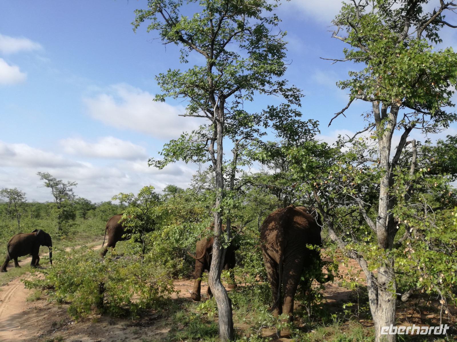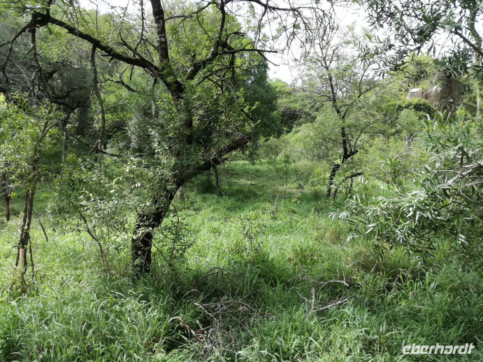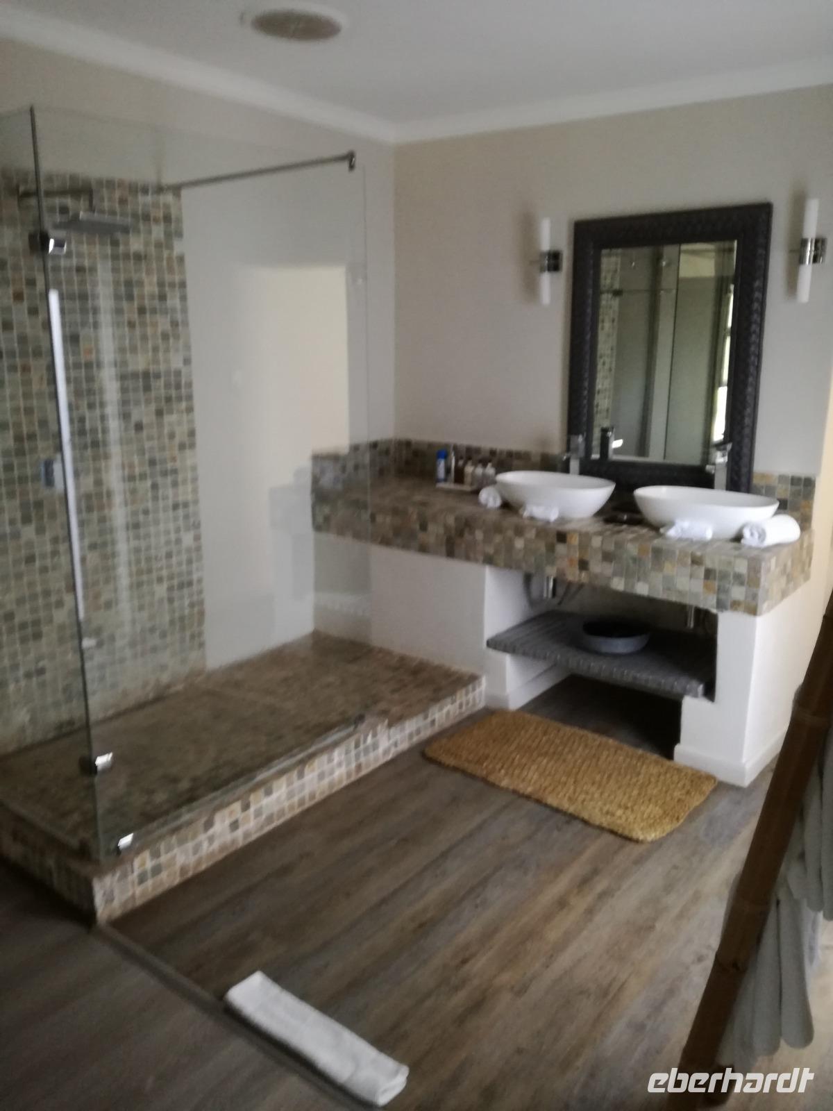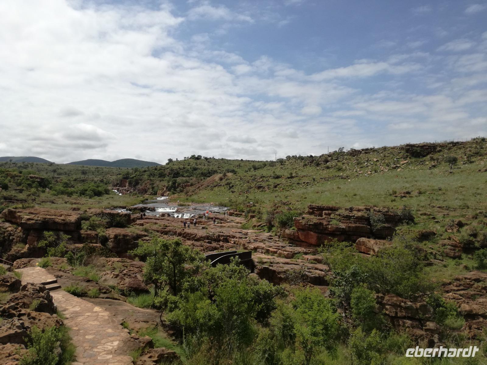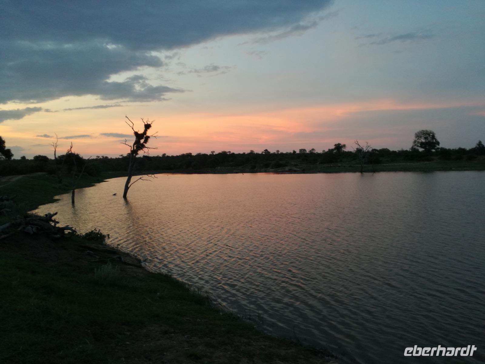 Leider hatte sich heute der Nebel noch nicht verzogen und die Lodge lag immer noch im Nebel. Naja wir wollten ja eh heute abreisen. Nach dem Frühstück ging es also auf die Panorama Route und wir hofften, dass der Nebel sich verzog. Uns führte die enge Passstraße durch die Bergkette der Drachenberge. Kurzer vor unserem ersten Stopp am God´s Window aber verdichtete sich der Nebel wieder. Unser erster Stopp fiel deshalb ins Wasser, denn God´s Window (Gottes Fenster) war leider geschlossen oder besser gesagt, ein Blick aus dem Fenster lohnte sich nicht. Als Ersatz stoppen wir am Berliner Falls. Am Wasserfall kam auch wieder die Sonne raus und wir bestaunten den tollen Wasserfall. Weiter ging es zum Blyde River Canyon. Der Blyde River Canyon, wegen seiner Schönheit auch "Frauencanyon" genannt, beginnt bei Bourke's Luck Potholes, einer eindrucksvollen Gesteinsformation, wo Tom Bourke sein "Glück" fand und später wieder verlor. Auch hier stand die Sonne hoch oben am Himmel und wir konnten einen Spaziergang durch die bizarren Felsen und Schluchten, über die Brücken des Trauer- und Freudenflusses unternehmen. Auch den Blyde River Canyon, den spektakulärsten Abschnitt des Canyon konnten wir bei relativ guter Sicht bewundern. Der atemberaubende Blick auf die Three Rondalves, die imposant aus dem Canyon emporragen, entschädigte für den neblig-nassen Beginn des Tages. Die Schlucht ist über 800 m tief und der Canyon selbst über 25 km lang. Der Blyde River (Freudenfluss) durchfließt ihn. Danach fing es wieder an mit regnen. Über enge Passstraßen und den Abel Erasmus Pass fuhren wieder vom Hochplateau hinunter nach Hoedspruit am Olifants Fluss. Unser Ziel war das private Timbavati Wildreservat am Krüger-Nationalpark. Am Flugplatz stiegen wir in kleinere Fahrzeuge um, die uns zur Lodge brachten. Die Fahrt dahin war bereits eine Safari. Wir sahen Kudus, Elefanten und Giraffen. Herzlich wurden wir in der privat geführten Simbavati River Lodge empfangen und stärkten uns beim einem leichten Mittagssnack. Unsere Luxus-Zelte und Chalets, die erst vor kurzem komplett renoviert wurden, ließen keine Wünsche offen. Simbavati, ein perfekter Ort, um dem "Ruf der Wildnis" zu folgen und dezenten Luxus zu geniessen. Der Name der Lodge stammt aus der Sprache der Shangaan und bedeutet so viel wie: "Der Ort, an dem die Löwen von den Sternen herabsteigen". Wir waren alle sehr gespannt. Nach dem Mittagssnack bezogen wir unsere Luxus-Hütten, vor denen Buschböcke grasten und sich Meerkatzen tummelten. Am späten Nachmittag bestiegen wir unsere 3 Jeeps: 6 Gäste pro Jeep, das ist Luxus. Mit den Ranger Frank, Robin und Kruger und deren Trackern (Spurenleser) ging's ab in den Busch, zur ersten Pirschfahrt. Und was uns da erwartete, abseits von den Massenandrang im Krüger NP, war einfach tierisch lecker. In der afrikanischen Sommerzeit im Norden des Landes ist der Busch üppig grün, da es in dieser Zeit regnet, aber auch sehr schwülwarm sein kann. Die Augen müssen sich schon konzentrieren, um im dichten Dickicht die Tiere zu spähen. In der trockenen Winterzeit ist es da wesentlich einfacher. Auf unserer spannenden Pirschfahrt entdeckten wir so Allerlei: Kudus, unzählige Impalas mit vielen Jungtieren, Wasserböcke, Zebras und bunte Vögel wie eine Blauracke. Der Höhepunkt hingegen war die Sichtung von 3 Löwen, die vor uns im Gras schliefen. Von unseren Rangern erfuhren wir eine Menge über die Tiere. Beim anschließenden Sundowner in einem ausgetrockneten Flußbett (das schien ein sicherer Platz für einen Ausstieg zu sein) wurde traditionell die Busch-Bar geöffnet. Mit Gin & Tonic, Savanna Dry oder einem Weinchen stießen wir auf die erfolgreiche Pirsch an. Wir waren noch so voller Adrenalin, dass wir die Zeit vergaßen. Zurück in der Lodge war es schon dunkel. Unser persönlicher Lodge-Adjutant begleitete uns zu unseren Zelten und Chalets. Eine wichtige Regel im Lodgegelände, welches nicht eingezäunt ist: Im Dunkeln immer in Begleitung der Lodge-Mitarbeiter! So wurden wir auch kurze Zeit später zum Abendessen abgeholt. Bei einem Drink an der Bar schwelgten wir noch in den Erlebnissen der Pirschfahrt. In der offenen Boma war für uns eingedeckt. Bei einem Drink auf der Terrasse schwelgten wir noch in den Erlebnissen der Pirschfahrt. In der offenen Boma brannte das Lagerfeuer und alles war für uns romantisch eingedeckt. Wir labten uns am großen Grillbufett und wurden fürstlich an diesem lauen Abend verwöhnt.