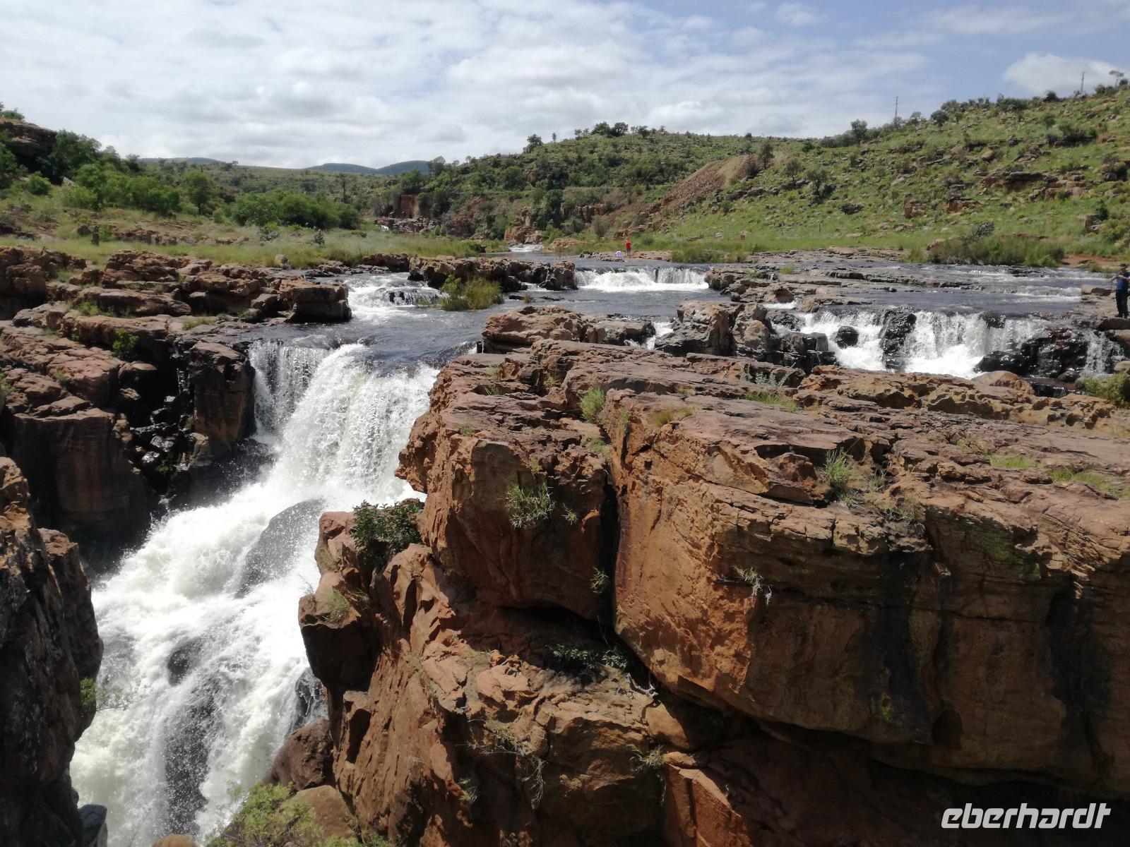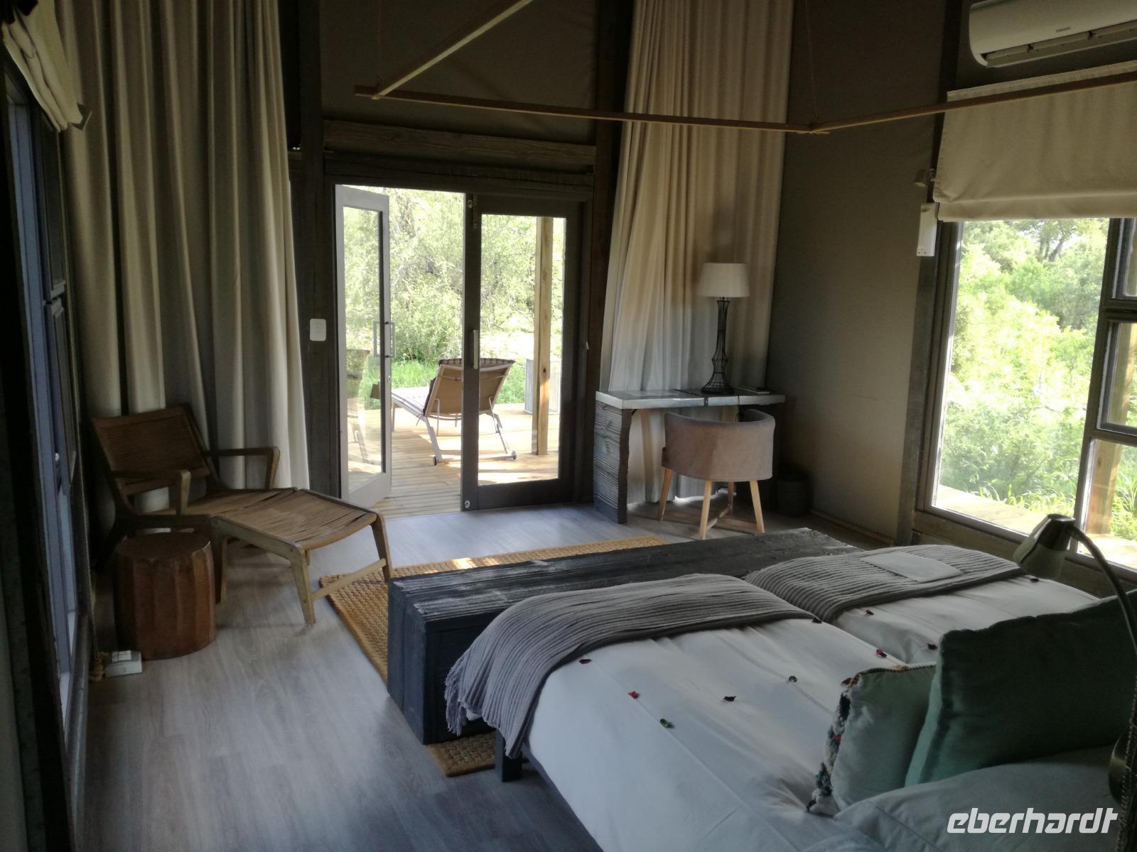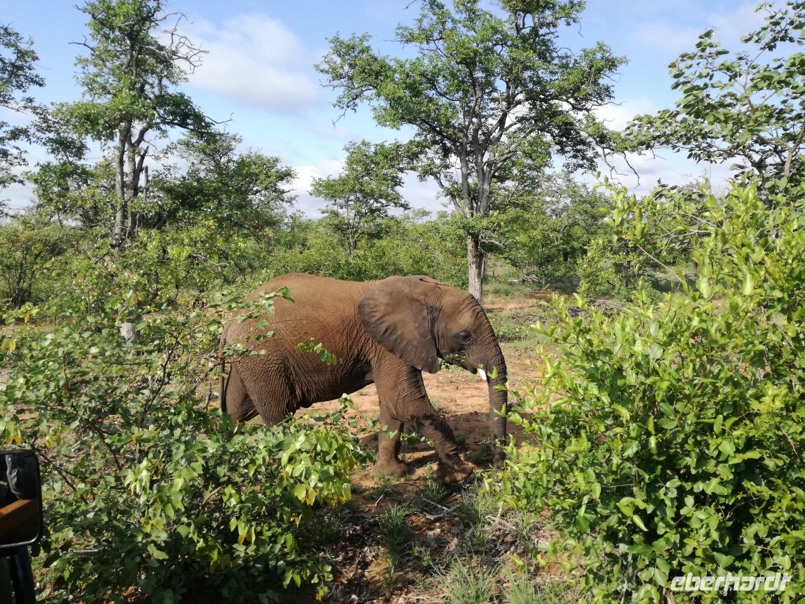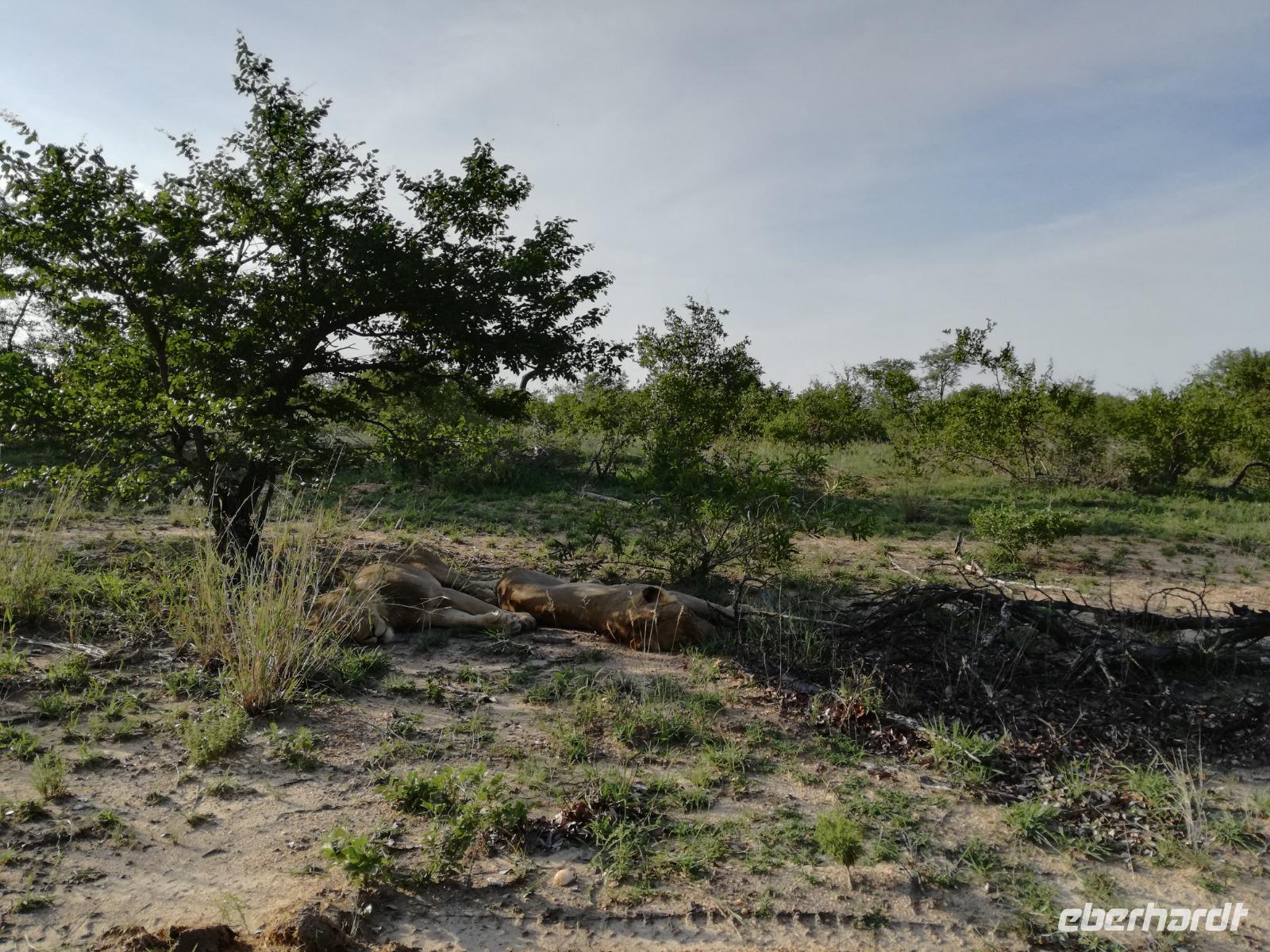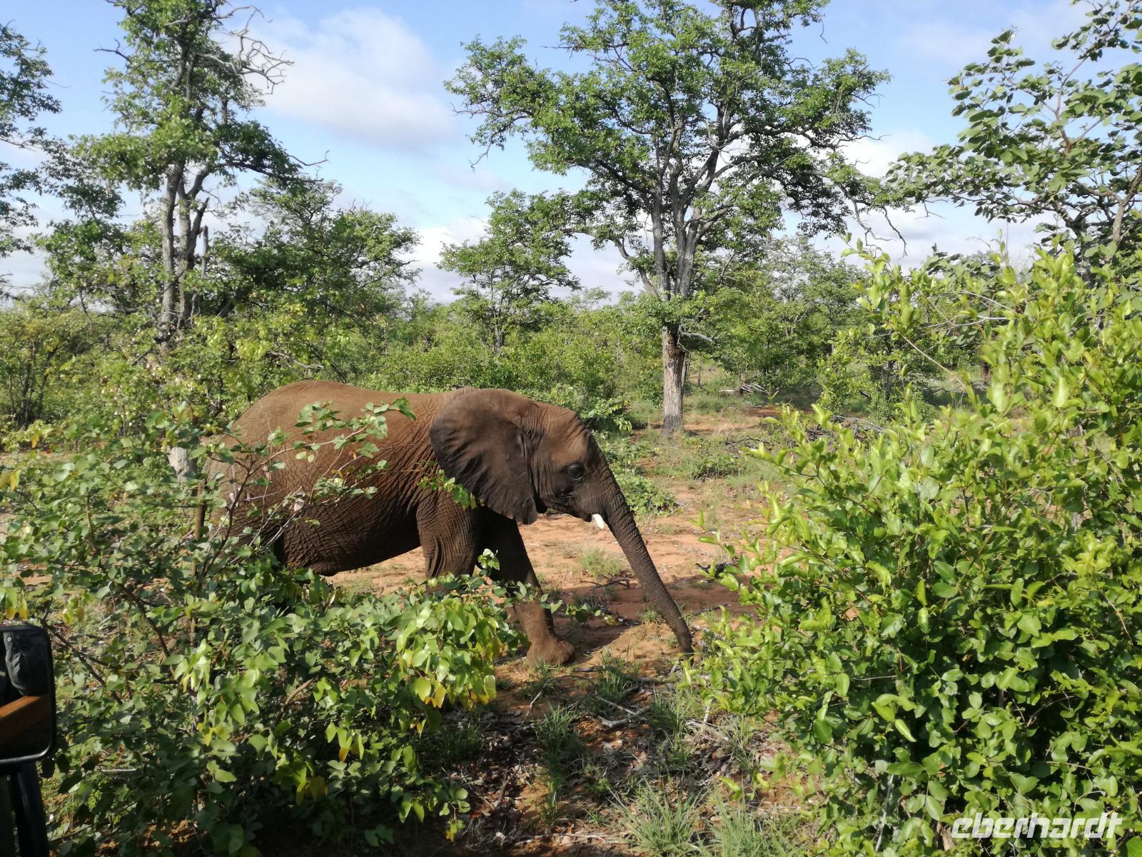 Leider hatte sich heute der Nebel noch nicht verzogen und die Lodge lag immer noch im Nebel. Naja wir wollten ja eh heute abreisen. Nach dem Frühstück ging es also auf die Panorama Route und wir hofften, dass der Nebel sich verzog. Uns führte die enge Passstraße durch die Bergkette der Drachenberge. Kurzer vor unserem ersten Stopp am God´s Window aber verdichtete sich der Nebel wieder. Unser erster Stopp fiel deshalb ins Wasser, denn God´s Window (Gottes Fenster) war leider geschlossen oder besser gesagt, ein Blick aus dem Fenster lohnte sich nicht. Als Ersatz stoppen wir am Berliner Falls. Am Wasserfall kam auch wieder die Sonne raus und wir bestaunten den tollen Wasserfall. Weiter ging es zum Blyde River Canyon. Der Blyde River Canyon, wegen seiner Schönheit auch "Frauencanyon" genannt, beginnt bei Bourke's Luck Potholes, einer eindrucksvollen Gesteinsformation, wo Tom Bourke sein "Glück" fand und später wieder verlor. Auch hier stand die Sonne hoch oben am Himmel und wir konnten einen Spaziergang durch die bizarren Felsen und Schluchten, über die Brücken des Trauer- und Freudenflusses unternehmen. Auch den Blyde River Canyon, den spektakulärsten Abschnitt des Canyon konnten wir bei relativ guter Sicht bewundern. Der atemberaubende Blick auf die Three Rondalves, die imposant aus dem Canyon emporragen, entschädigte für den neblig-nassen Beginn des Tages. Die Schlucht ist über 800 m tief und der Canyon selbst über 25 km lang. Der Blyde River (Freudenfluss) durchfließt ihn. Danach fing es wieder an mit regnen. Über enge Passstraßen und den Abel Erasmus Pass fuhren wieder vom Hochplateau hinunter nach Hoedspruit am Olifants Fluss. Unser Ziel war das private Timbavati Wildreservat am Krüger-Nationalpark. Am Flugplatz stiegen wir in kleinere Fahrzeuge um, die uns zur Lodge brachten. Die Fahrt dahin war bereits eine Safari. Wir sahen Kudus, Elefanten und Giraffen. Herzlich wurden wir in der privat geführten Simbavati River Lodge empfangen und stärkten uns beim einem leichten Mittagssnack. Unsere Luxus-Zelte und Chalets, die erst vor kurzem komplett renoviert wurden, ließen keine Wünsche offen. Simbavati, ein perfekter Ort, um dem "Ruf der Wildnis" zu folgen und dezenten Luxus zu geniessen. Der Name der Lodge stammt aus der Sprache der Shangaan und bedeutet so viel wie: "Der Ort, an dem die Löwen von den Sternen herabsteigen". Wir waren alle sehr gespannt. Nach dem Mittagssnack bezogen wir unsere Luxus-Hütten, vor denen Buschböcke grasten und sich Meerkatzen tummelten. Am späten Nachmittag bestiegen wir unsere 3 Jeeps: 6 Gäste pro Jeep, das ist Luxus. Mit den Ranger Frank, Robin und Kruger und deren Trackern (Spurenleser) ging's ab in den Busch, zur ersten Pirschfahrt. Und was uns da erwartete, abseits von den Massenandrang im Krüger NP, war einfach tierisch lecker. In der afrikanischen Sommerzeit im Norden des Landes ist der Busch üppig grün, da es in dieser Zeit regnet, aber auch sehr schwülwarm sein kann. Die Augen müssen sich schon konzentrieren, um im dichten Dickicht die Tiere zu spähen. In der trockenen Winterzeit ist es da wesentlich einfacher. Auf unserer spannenden Pirschfahrt entdeckten wir so Allerlei: Kudus, unzählige Impalas mit vielen Jungtieren, Wasserböcke, Zebras und bunte Vögel wie eine Blauracke. Der Höhepunkt hingegen war die Sichtung von 3 Löwen, die vor uns im Gras schliefen. Von unseren Rangern erfuhren wir eine Menge über die Tiere. Beim anschließenden Sundowner in einem ausgetrockneten Flußbett (das schien ein sicherer Platz für einen Ausstieg zu sein) wurde traditionell die Busch-Bar geöffnet. Mit Gin & Tonic, Savanna Dry oder einem Weinchen stießen wir auf die erfolgreiche Pirsch an. Wir waren noch so voller Adrenalin, dass wir die Zeit vergaßen. Zurück in der Lodge war es schon dunkel. Unser persönlicher Lodge-Adjutant begleitete uns zu unseren Zelten und Chalets. Eine wichtige Regel im Lodgegelände, welches nicht eingezäunt ist: Im Dunkeln immer in Begleitung der Lodge-Mitarbeiter! So wurden wir auch kurze Zeit später zum Abendessen abgeholt. Bei einem Drink an der Bar schwelgten wir noch in den Erlebnissen der Pirschfahrt. In der offenen Boma war für uns eingedeckt. Bei einem Drink auf der Terrasse schwelgten wir noch in den Erlebnissen der Pirschfahrt. In der offenen Boma brannte das Lagerfeuer und alles war für uns romantisch eingedeckt. Wir labten uns am großen Grillbufett und wurden fürstlich an diesem lauen Abend verwöhnt.