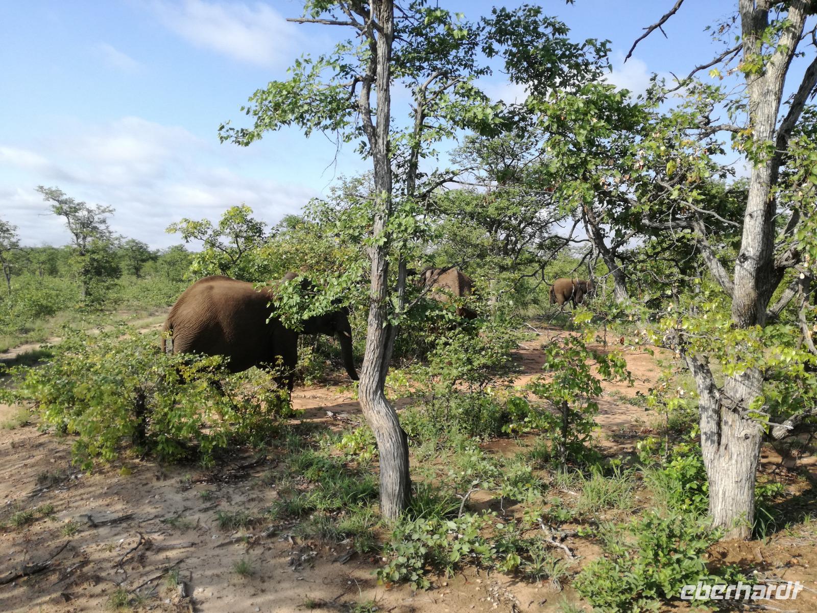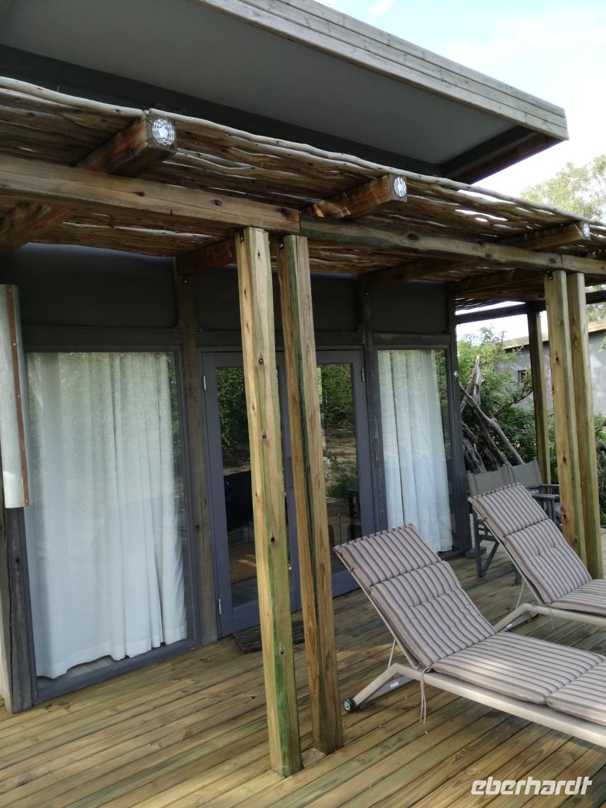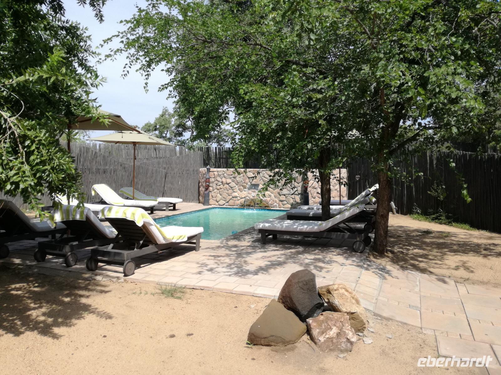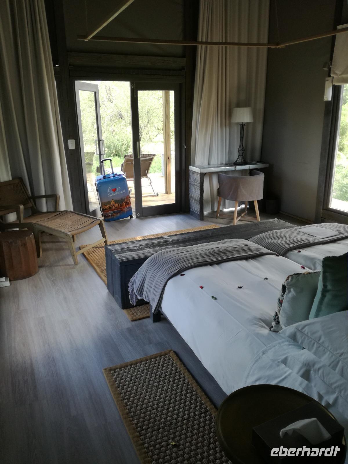 Leider hatte sich heute der Nebel noch nicht verzogen und die Lodge lag immer noch im Nebel. Naja wir wollten ja eh heute abreisen. Nach dem Frühstück ging es also auf die Panorama Route und wir hofften, dass der Nebel sich verzog. Uns führte die enge Passstraße durch die Bergkette der Drachenberge. Kurzer vor unserem ersten Stopp am God´s Window aber verdichtete sich der Nebel wieder. Unser erster Stopp fiel deshalb ins Wasser, denn God´s Window (Gottes Fenster) war leider geschlossen oder besser gesagt, ein Blick aus dem Fenster lohnte sich nicht. Als Ersatz stoppen wir am Berliner Falls. Am Wasserfall kam auch wieder die Sonne raus und wir bestaunten den tollen Wasserfall. Weiter ging es zum Blyde River Canyon. Der Blyde River Canyon, wegen seiner Schönheit auch "Frauencanyon" genannt, beginnt bei Bourke's Luck Potholes, einer eindrucksvollen Gesteinsformation, wo Tom Bourke sein "Glück" fand und später wieder verlor. Auch hier stand die Sonne hoch oben am Himmel und wir konnten einen Spaziergang durch die bizarren Felsen und Schluchten, über die Brücken des Trauer- und Freudenflusses unternehmen. Auch den Blyde River Canyon, den spektakulärsten Abschnitt des Canyon konnten wir bei relativ guter Sicht bewundern. Der atemberaubende Blick auf die Three Rondalves, die imposant aus dem Canyon emporragen, entschädigte für den neblig-nassen Beginn des Tages. Die Schlucht ist über 800 m tief und der Canyon selbst über 25 km lang. Der Blyde River (Freudenfluss) durchfließt ihn. Danach fing es wieder an mit regnen. Über enge Passstraßen und den Abel Erasmus Pass fuhren wieder vom Hochplateau hinunter nach Hoedspruit am Olifants Fluss. Unser Ziel war das private Timbavati Wildreservat am Krüger-Nationalpark. Am Flugplatz stiegen wir in kleinere Fahrzeuge um, die uns zur Lodge brachten. Die Fahrt dahin war bereits eine Safari. Wir sahen Kudus, Elefanten und Giraffen. Herzlich wurden wir in der privat geführten Simbavati River Lodge empfangen und stärkten uns beim einem leichten Mittagssnack. Unsere Luxus-Zelte und Chalets, die erst vor kurzem komplett renoviert wurden, ließen keine Wünsche offen. Simbavati, ein perfekter Ort, um dem "Ruf der Wildnis" zu folgen und dezenten Luxus zu geniessen. Der Name der Lodge stammt aus der Sprache der Shangaan und bedeutet so viel wie: "Der Ort, an dem die Löwen von den Sternen herabsteigen". Wir waren alle sehr gespannt. Nach dem Mittagssnack bezogen wir unsere Luxus-Hütten, vor denen Buschböcke grasten und sich Meerkatzen tummelten. Am späten Nachmittag bestiegen wir unsere 3 Jeeps: 6 Gäste pro Jeep, das ist Luxus. Mit den Ranger Frank, Robin und Kruger und deren Trackern (Spurenleser) ging's ab in den Busch, zur ersten Pirschfahrt. Und was uns da erwartete, abseits von den Massenandrang im Krüger NP, war einfach tierisch lecker. In der afrikanischen Sommerzeit im Norden des Landes ist der Busch üppig grün, da es in dieser Zeit regnet, aber auch sehr schwülwarm sein kann. Die Augen müssen sich schon konzentrieren, um im dichten Dickicht die Tiere zu spähen. In der trockenen Winterzeit ist es da wesentlich einfacher. Auf unserer spannenden Pirschfahrt entdeckten wir so Allerlei: Kudus, unzählige Impalas mit vielen Jungtieren, Wasserböcke, Zebras und bunte Vögel wie eine Blauracke. Der Höhepunkt hingegen war die Sichtung von 3 Löwen, die vor uns im Gras schliefen. Von unseren Rangern erfuhren wir eine Menge über die Tiere. Beim anschließenden Sundowner in einem ausgetrockneten Flußbett (das schien ein sicherer Platz für einen Ausstieg zu sein) wurde traditionell die Busch-Bar geöffnet. Mit Gin & Tonic, Savanna Dry oder einem Weinchen stießen wir auf die erfolgreiche Pirsch an. Wir waren noch so voller Adrenalin, dass wir die Zeit vergaßen. Zurück in der Lodge war es schon dunkel. Unser persönlicher Lodge-Adjutant begleitete uns zu unseren Zelten und Chalets. Eine wichtige Regel im Lodgegelände, welches nicht eingezäunt ist: Im Dunkeln immer in Begleitung der Lodge-Mitarbeiter! So wurden wir auch kurze Zeit später zum Abendessen abgeholt. Bei einem Drink an der Bar schwelgten wir noch in den Erlebnissen der Pirschfahrt. In der offenen Boma war für uns eingedeckt. Bei einem Drink auf der Terrasse schwelgten wir noch in den Erlebnissen der Pirschfahrt. In der offenen Boma brannte das Lagerfeuer und alles war für uns romantisch eingedeckt. Wir labten uns am großen Grillbufett und wurden fürstlich an diesem lauen Abend verwöhnt.