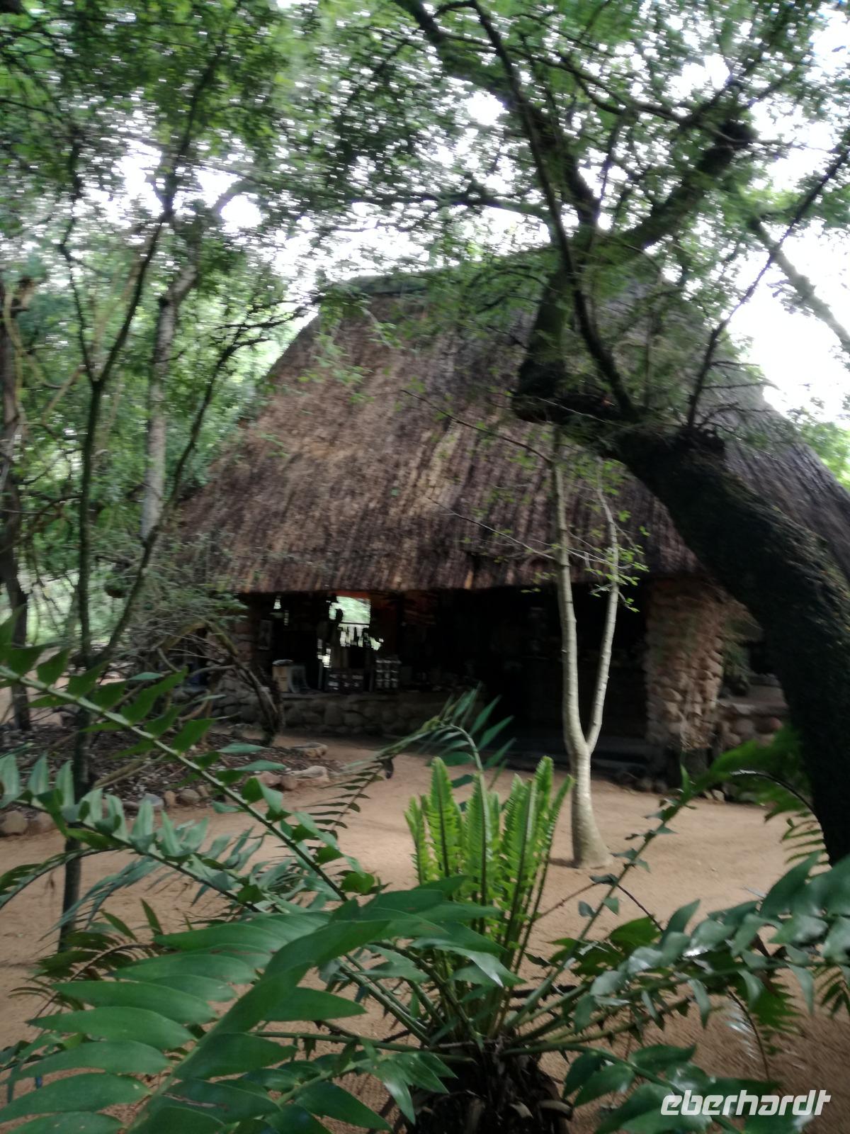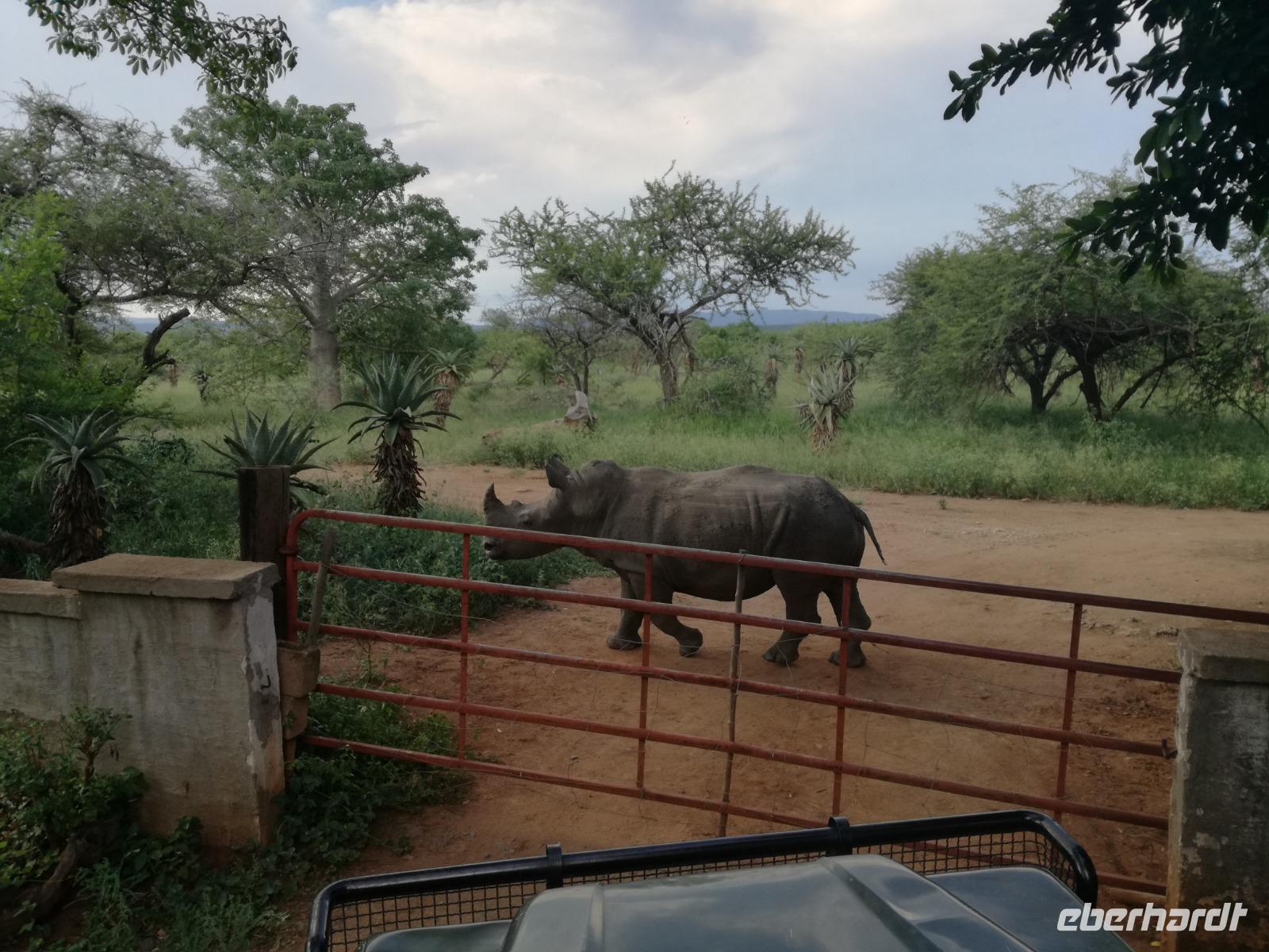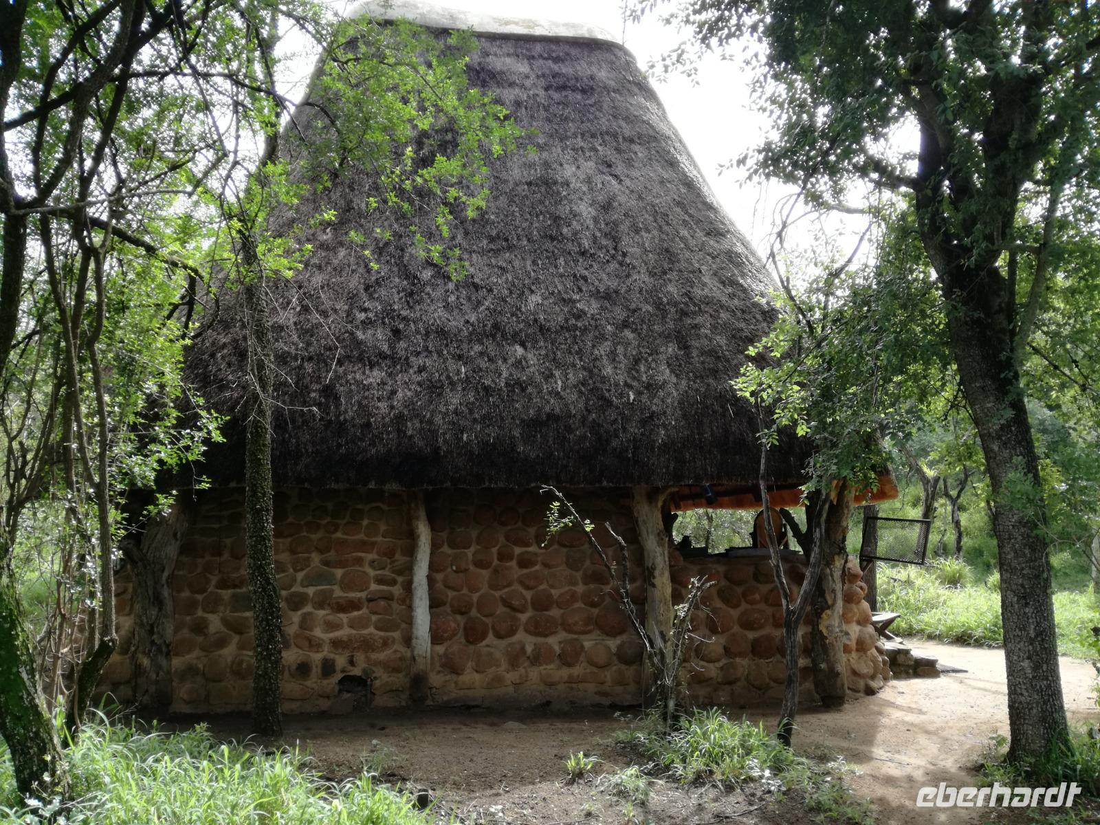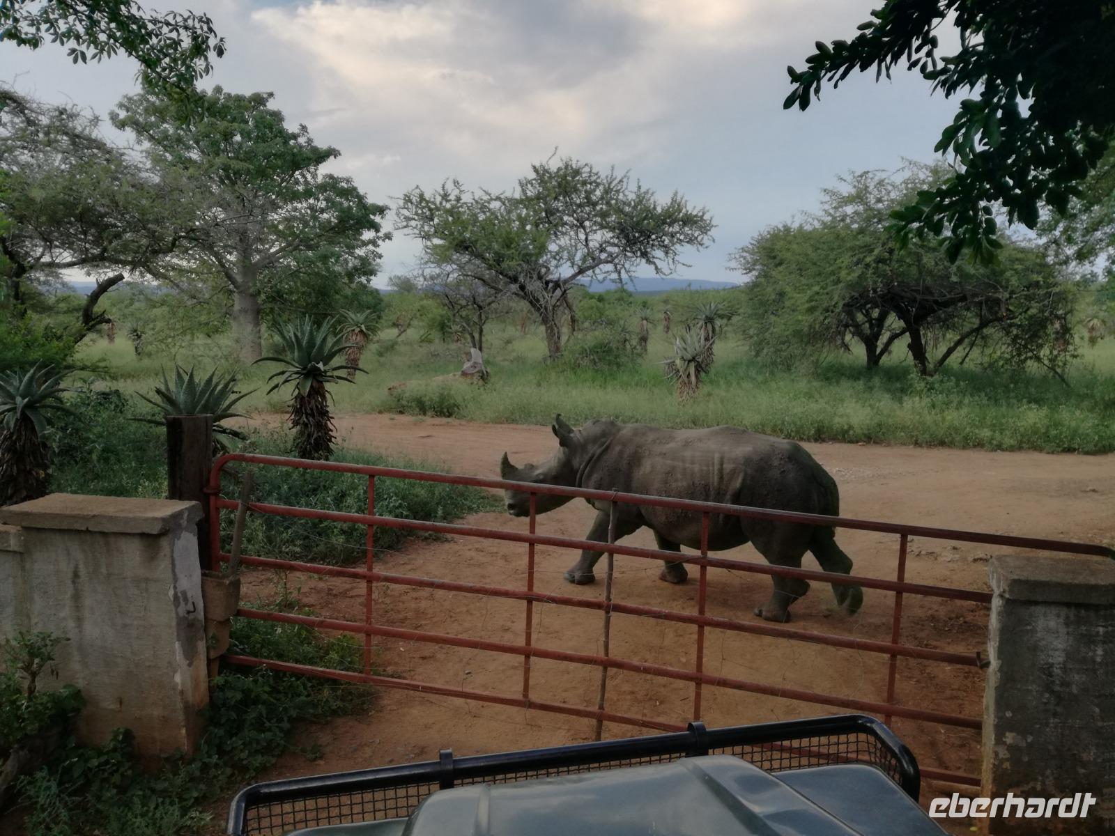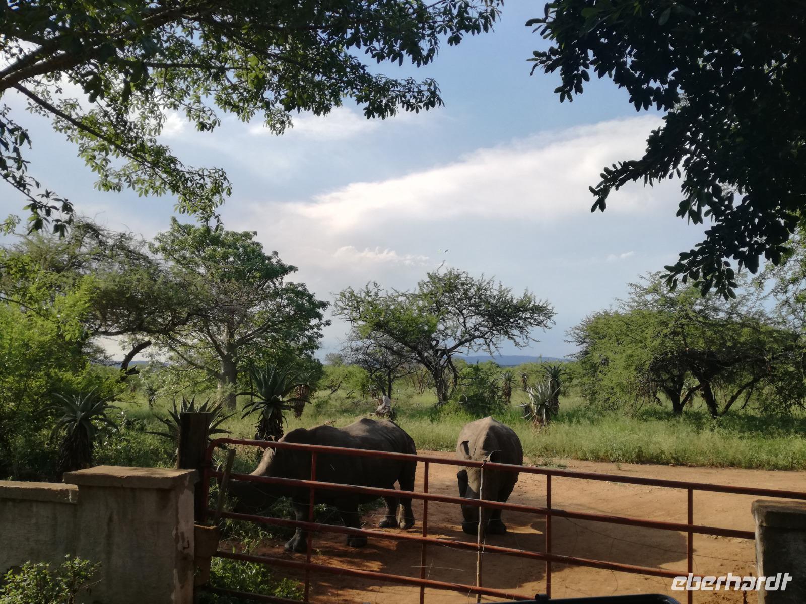 Heute Morgen starteten wir etwas früher in den Tag. Nach dem Frühstück brachen wir auf in Richtung Swaziland. Auf dem Weg erklärt uns Sonet einiges über Land und Leute und über das unabhängige Königreich Swaziland. Um die Mittagszeit überquerten wir die Grenzen von Südafrika nach Swaziland bzw. Königreich Eswatini wie es seit 2018 offiziell heißt. Das Königreich wird seit 1986 vom König MSwti III und er gilt als der letzte absolutitischer Monarch Afrikas. Insgesamt hat der 50 Jährige 19 Ehefrauen und ca. 30 Kindern. Aber wir waren ja nicht wegen dem König gekommen, sondern wir wollten den Mkhaya Game Reserve besuchen. Nach einer kleinen Wartezeit erreichten uns endlich die zwei Jeeps. Das Gepäck blieb beim Bus und wir reisten nur mit Handgepäck ins Stone Camp. Nach einem kurzen Einschreiben wollten wir unsere Pirschfahrt beginnen. Allerdings standen plötzlich zwei Breitmaulnashörner vor uns. Schnell zuckten wir unsere Kameras und hatten somit nach dem Büffel das zweite Mitglied der Big 5 gesehen. Während diese Nashornart im Nationalpark weit verbreitet ist, werden Spitzmaulnashörner eher selten gesehen, da sie sich hauptsächlich im Gebüsch verstecken. Wie der Name bereits verrät, unterscheiden sich die Arten hinsichtlich der Form ihres Mauls. Während das Breitmaulnashorn mit seinem breiten Maul das Gras am Boden frisst, rupft das Spitzmaulnashorn mit der Oberlippe die Blätter von den Ästen. Mit einer Vielzahl an Nashornfotos geht unsere Safari auch schon weiter. Die Gruppen fahren auf unterschiedlichen Routen durch das Reservat. Wir sehen Giraffen, Zebras, Nyalas, "Hippos" und verschiedene Vogelarten. Allerdings spielte uns plötzlich das Wetter einen Strich durch die Rechnung. Plötzlich begann es zu regnen und Gewittern. Schnell bekamen wir Ponchos und fuhren in Richtung Camp. Gegen 18.00 Uhr passieren wir die Einfahrt zum 2,5-Sterne-Stone Camp im Mkhaya Game Reserve. Zuerst werden uns die Unterkünfte gezeigt. Wir werden die Nacht im halboffenem Steinhäuschen mit halbhohen Steinmauern verbringen. Es gibt keinen Strom und das Handgepäck ist am besten in der Truhe zu verstauen, bevor neugierige Affen kommen und einzelne Dinge stibitzen. Das Bett ist von einem Mosquitonetz umgeben. Das Camp ist komplett mit Lichtern und Kerzen beleuchtet. Mit Schirmen gingen wir zunächst in unsere Steinhütten. Zum Abendessen wurde der Regen etwas weniger und wir wurden mit einem tollen Abendessen verwöhnt. Dazu gab es leckeren Wein, Bier und natürlich unser Lieblingsgetränk der Reise - Amarula Wodka. Nach dem Essen ging es in die Hütten und wir verbrachten eine aufregende Nacht in den offenen Steinhäusern.