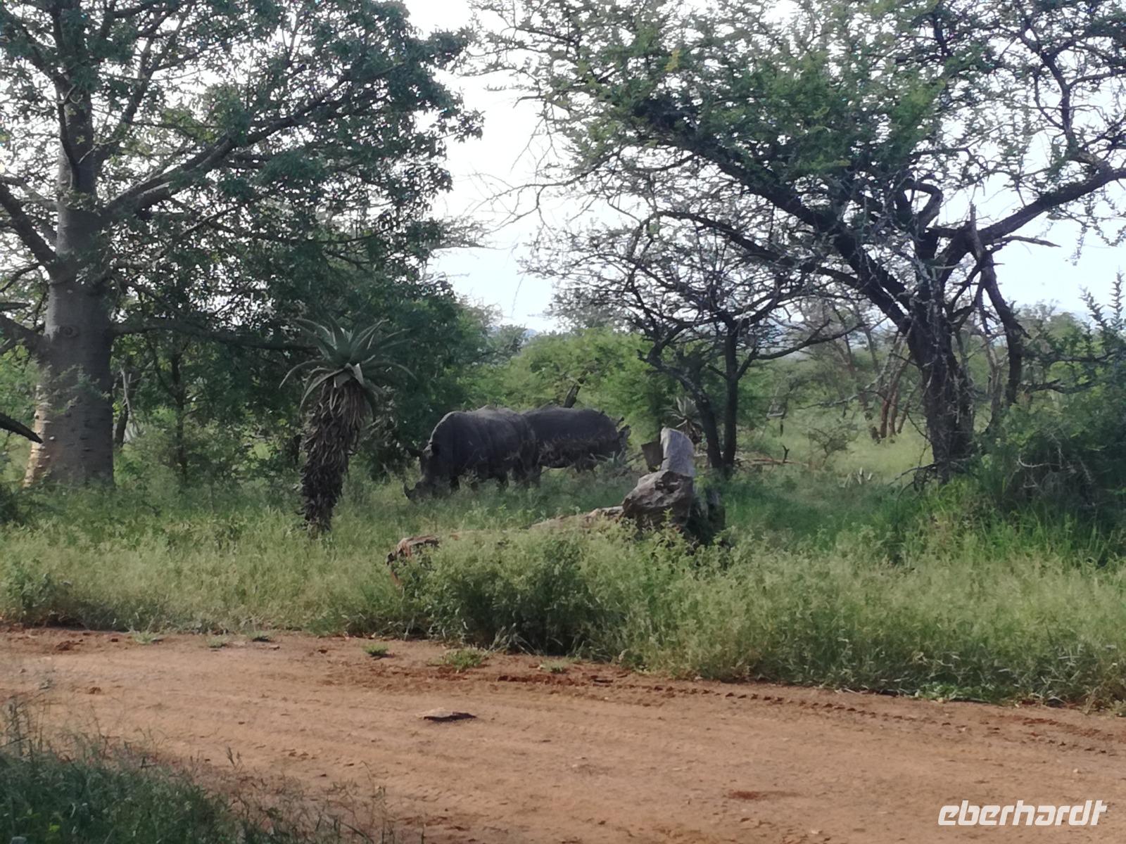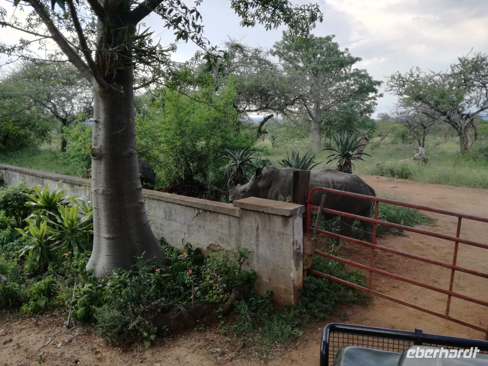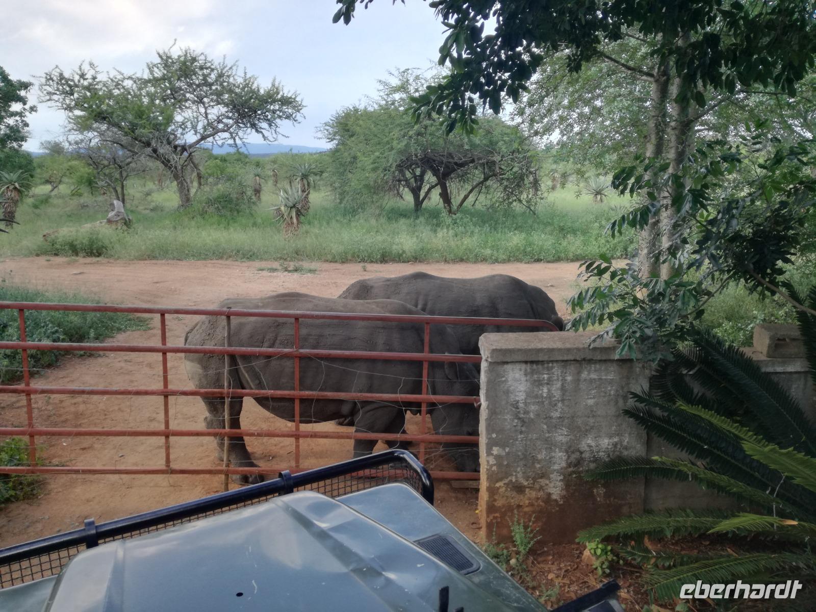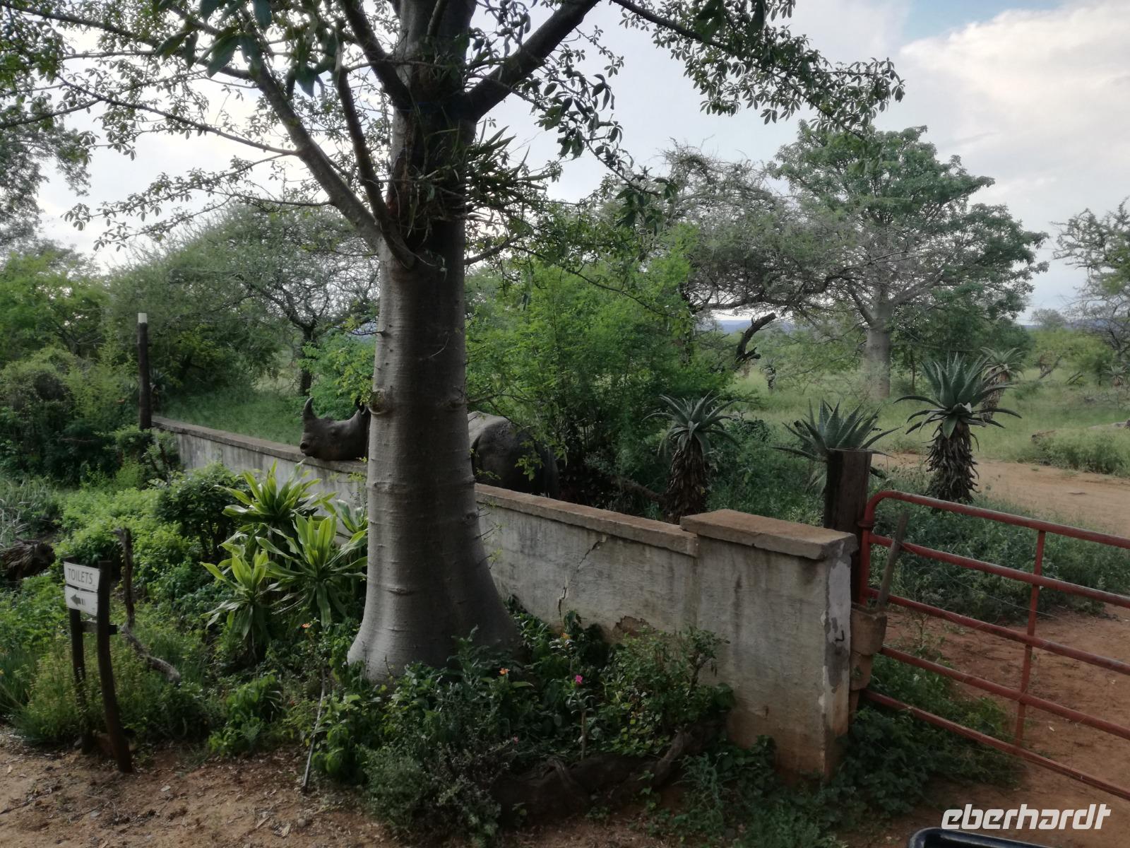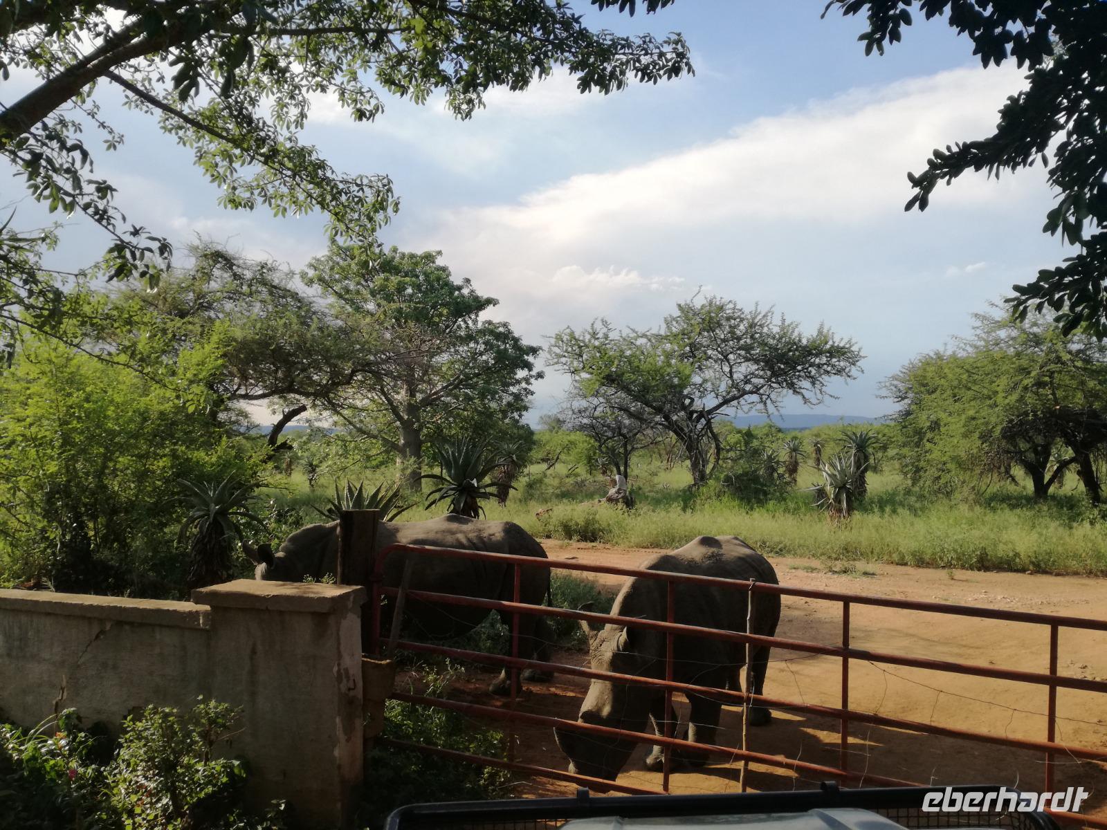 Heute Morgen starteten wir etwas früher in den Tag. Nach dem Frühstück brachen wir auf in Richtung Swaziland. Auf dem Weg erklärt uns Sonet einiges über Land und Leute und über das unabhängige Königreich Swaziland. Um die Mittagszeit überquerten wir die Grenzen von Südafrika nach Swaziland bzw. Königreich Eswatini wie es seit 2018 offiziell heißt. Das Königreich wird seit 1986 vom König MSwti III und er gilt als der letzte absolutitischer Monarch Afrikas. Insgesamt hat der 50 Jährige 19 Ehefrauen und ca. 30 Kindern. Aber wir waren ja nicht wegen dem König gekommen, sondern wir wollten den Mkhaya Game Reserve besuchen. Nach einer kleinen Wartezeit erreichten uns endlich die zwei Jeeps. Das Gepäck blieb beim Bus und wir reisten nur mit Handgepäck ins Stone Camp. Nach einem kurzen Einschreiben wollten wir unsere Pirschfahrt beginnen. Allerdings standen plötzlich zwei Breitmaulnashörner vor uns. Schnell zuckten wir unsere Kameras und hatten somit nach dem Büffel das zweite Mitglied der Big 5 gesehen. Während diese Nashornart im Nationalpark weit verbreitet ist, werden Spitzmaulnashörner eher selten gesehen, da sie sich hauptsächlich im Gebüsch verstecken. Wie der Name bereits verrät, unterscheiden sich die Arten hinsichtlich der Form ihres Mauls. Während das Breitmaulnashorn mit seinem breiten Maul das Gras am Boden frisst, rupft das Spitzmaulnashorn mit der Oberlippe die Blätter von den Ästen. Mit einer Vielzahl an Nashornfotos geht unsere Safari auch schon weiter. Die Gruppen fahren auf unterschiedlichen Routen durch das Reservat. Wir sehen Giraffen, Zebras, Nyalas, "Hippos" und verschiedene Vogelarten. Allerdings spielte uns plötzlich das Wetter einen Strich durch die Rechnung. Plötzlich begann es zu regnen und Gewittern. Schnell bekamen wir Ponchos und fuhren in Richtung Camp. Gegen 18.00 Uhr passieren wir die Einfahrt zum 2,5-Sterne-Stone Camp im Mkhaya Game Reserve. Zuerst werden uns die Unterkünfte gezeigt. Wir werden die Nacht im halboffenem Steinhäuschen mit halbhohen Steinmauern verbringen. Es gibt keinen Strom und das Handgepäck ist am besten in der Truhe zu verstauen, bevor neugierige Affen kommen und einzelne Dinge stibitzen. Das Bett ist von einem Mosquitonetz umgeben. Das Camp ist komplett mit Lichtern und Kerzen beleuchtet. Mit Schirmen gingen wir zunächst in unsere Steinhütten. Zum Abendessen wurde der Regen etwas weniger und wir wurden mit einem tollen Abendessen verwöhnt. Dazu gab es leckeren Wein, Bier und natürlich unser Lieblingsgetränk der Reise - Amarula Wodka. Nach dem Essen ging es in die Hütten und wir verbrachten eine aufregende Nacht in den offenen Steinhäusern.