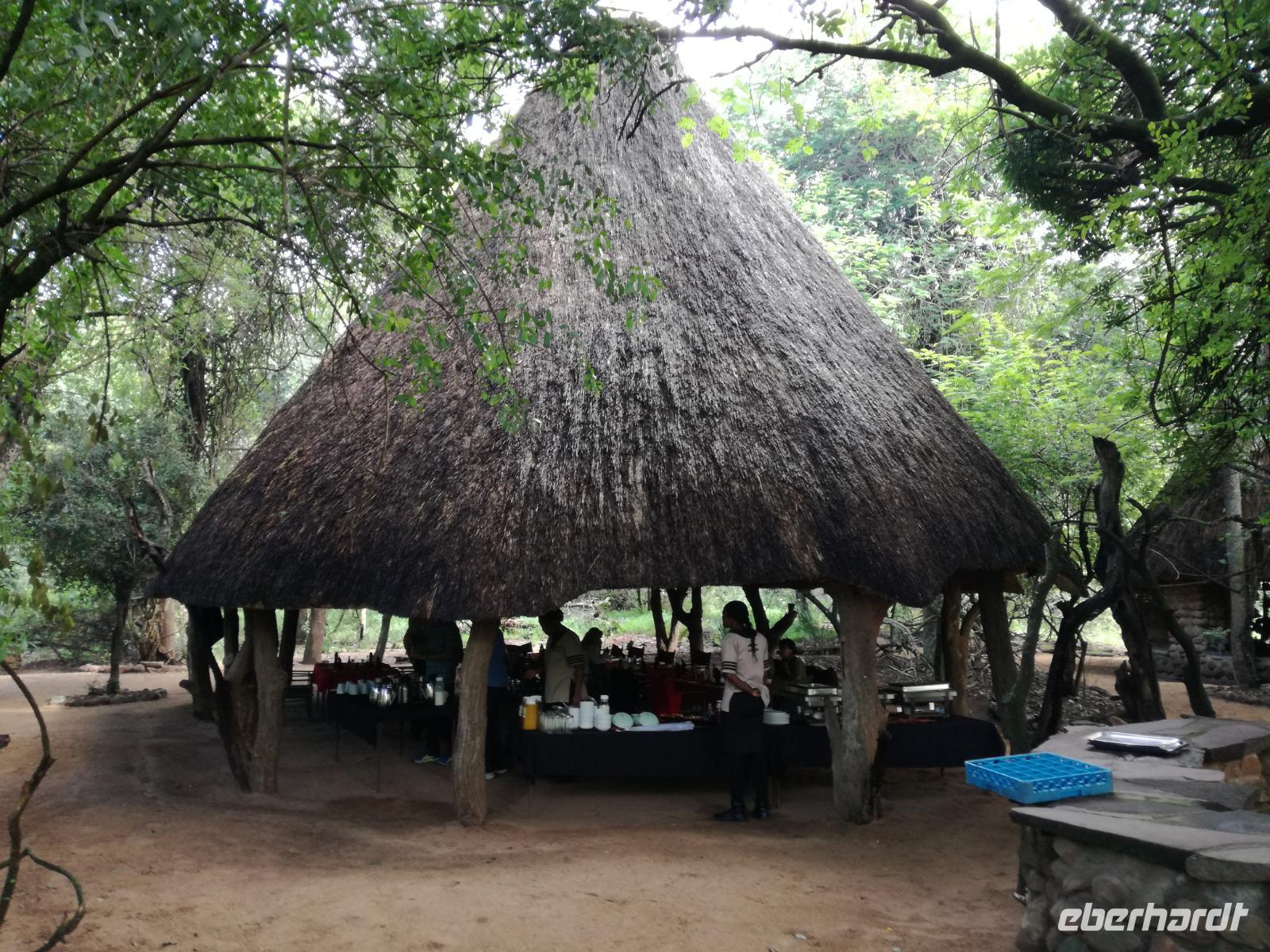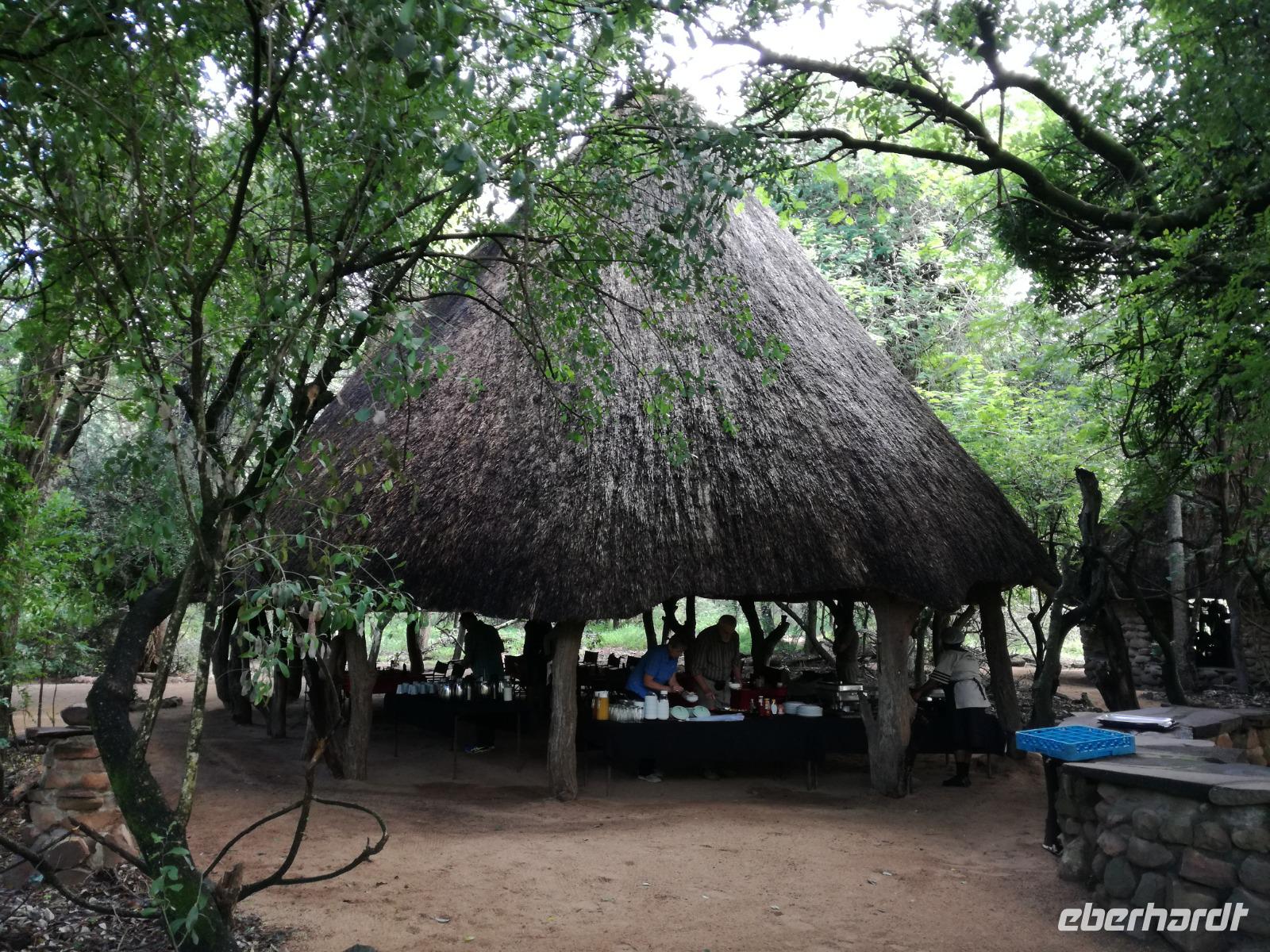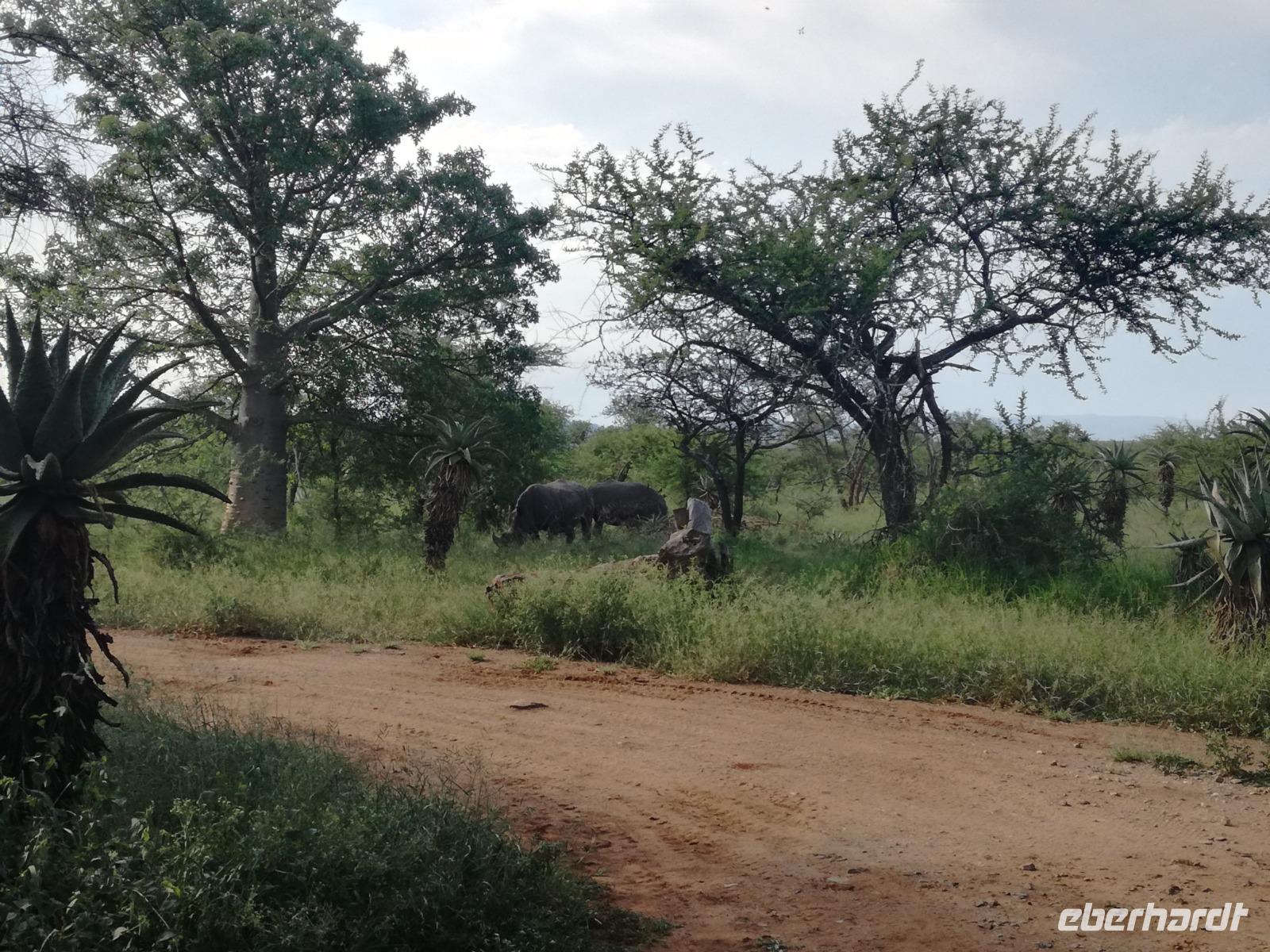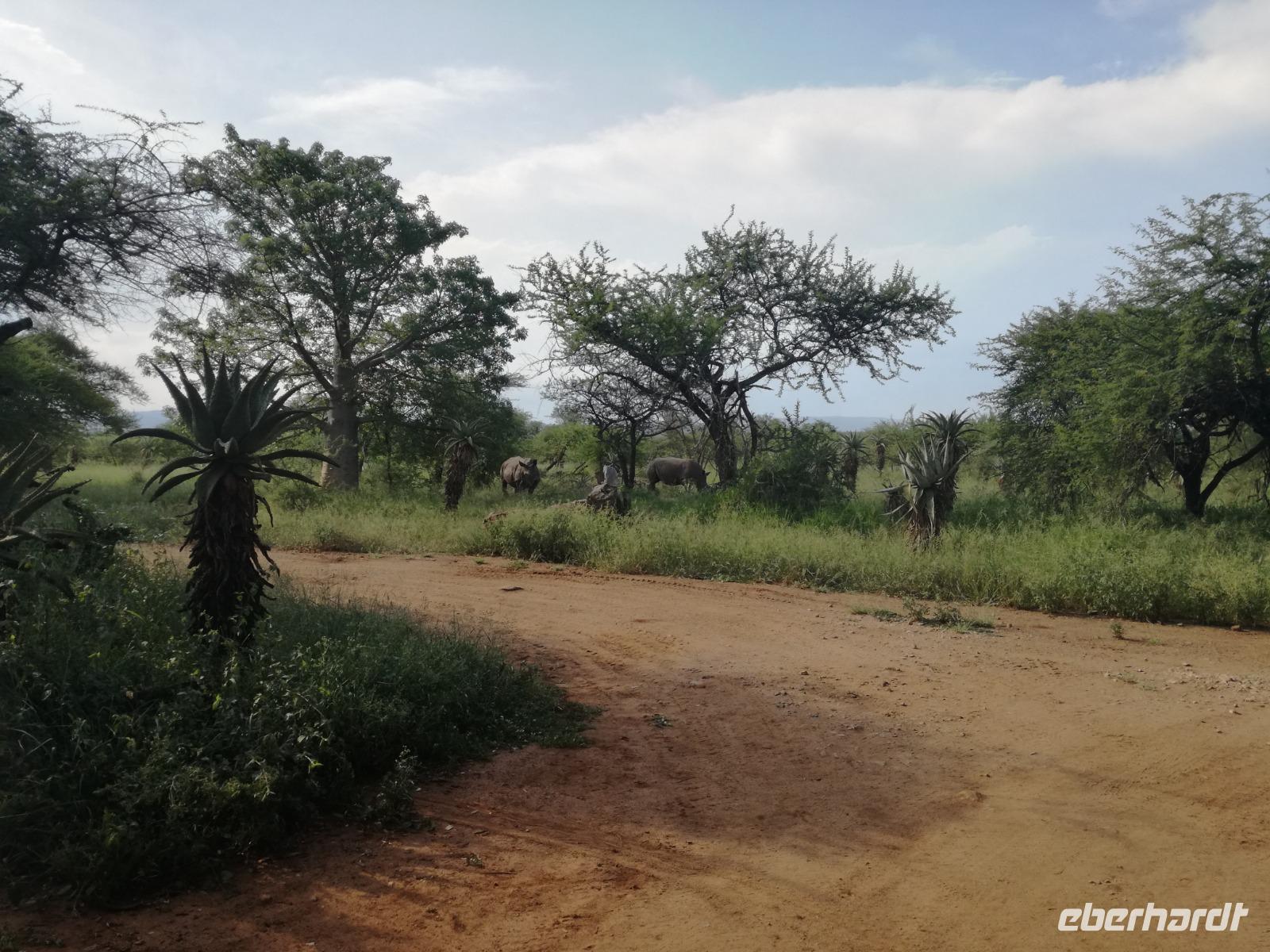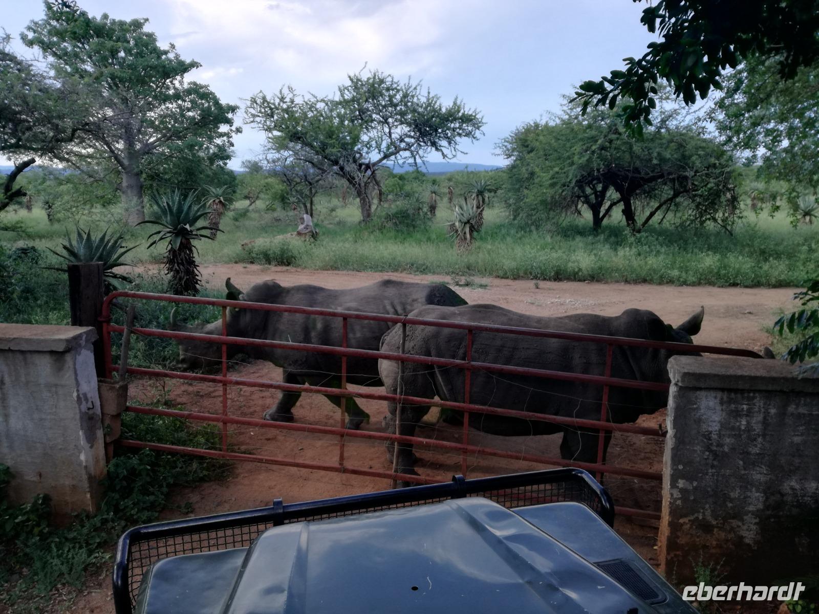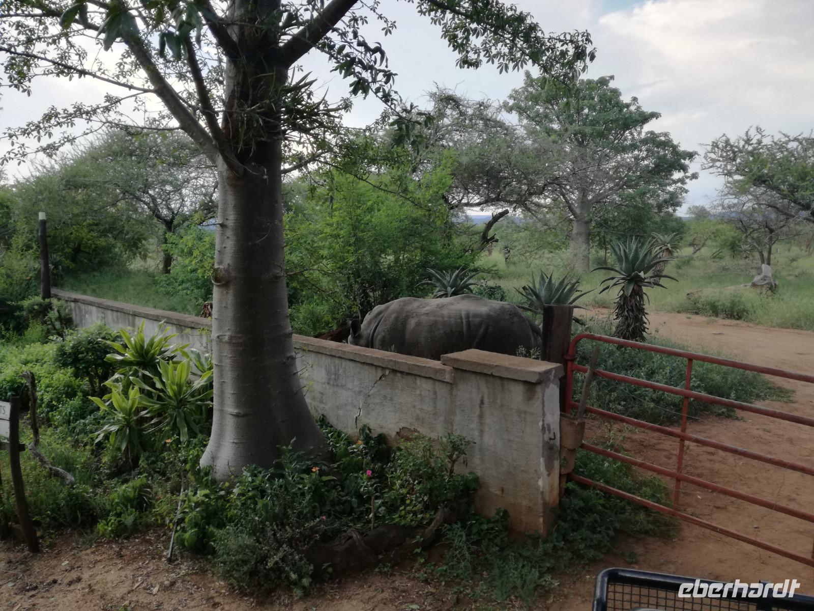 Heute Morgen starteten wir etwas früher in den Tag. Nach dem Frühstück brachen wir auf in Richtung Swaziland. Auf dem Weg erklärt uns Sonet einiges über Land und Leute und über das unabhängige Königreich Swaziland. Um die Mittagszeit überquerten wir die Grenzen von Südafrika nach Swaziland bzw. Königreich Eswatini wie es seit 2018 offiziell heißt. Das Königreich wird seit 1986 vom König MSwti III und er gilt als der letzte absolutitischer Monarch Afrikas. Insgesamt hat der 50 Jährige 19 Ehefrauen und ca. 30 Kindern. Aber wir waren ja nicht wegen dem König gekommen, sondern wir wollten den Mkhaya Game Reserve besuchen. Nach einer kleinen Wartezeit erreichten uns endlich die zwei Jeeps. Das Gepäck blieb beim Bus und wir reisten nur mit Handgepäck ins Stone Camp. Nach einem kurzen Einschreiben wollten wir unsere Pirschfahrt beginnen. Allerdings standen plötzlich zwei Breitmaulnashörner vor uns. Schnell zuckten wir unsere Kameras und hatten somit nach dem Büffel das zweite Mitglied der Big 5 gesehen. Während diese Nashornart im Nationalpark weit verbreitet ist, werden Spitzmaulnashörner eher selten gesehen, da sie sich hauptsächlich im Gebüsch verstecken. Wie der Name bereits verrät, unterscheiden sich die Arten hinsichtlich der Form ihres Mauls. Während das Breitmaulnashorn mit seinem breiten Maul das Gras am Boden frisst, rupft das Spitzmaulnashorn mit der Oberlippe die Blätter von den Ästen. Mit einer Vielzahl an Nashornfotos geht unsere Safari auch schon weiter. Die Gruppen fahren auf unterschiedlichen Routen durch das Reservat. Wir sehen Giraffen, Zebras, Nyalas, "Hippos" und verschiedene Vogelarten. Allerdings spielte uns plötzlich das Wetter einen Strich durch die Rechnung. Plötzlich begann es zu regnen und Gewittern. Schnell bekamen wir Ponchos und fuhren in Richtung Camp. Gegen 18.00 Uhr passieren wir die Einfahrt zum 2,5-Sterne-Stone Camp im Mkhaya Game Reserve. Zuerst werden uns die Unterkünfte gezeigt. Wir werden die Nacht im halboffenem Steinhäuschen mit halbhohen Steinmauern verbringen. Es gibt keinen Strom und das Handgepäck ist am besten in der Truhe zu verstauen, bevor neugierige Affen kommen und einzelne Dinge stibitzen. Das Bett ist von einem Mosquitonetz umgeben. Das Camp ist komplett mit Lichtern und Kerzen beleuchtet. Mit Schirmen gingen wir zunächst in unsere Steinhütten. Zum Abendessen wurde der Regen etwas weniger und wir wurden mit einem tollen Abendessen verwöhnt. Dazu gab es leckeren Wein, Bier und natürlich unser Lieblingsgetränk der Reise - Amarula Wodka. Nach dem Essen ging es in die Hütten und wir verbrachten eine aufregende Nacht in den offenen Steinhäusern.