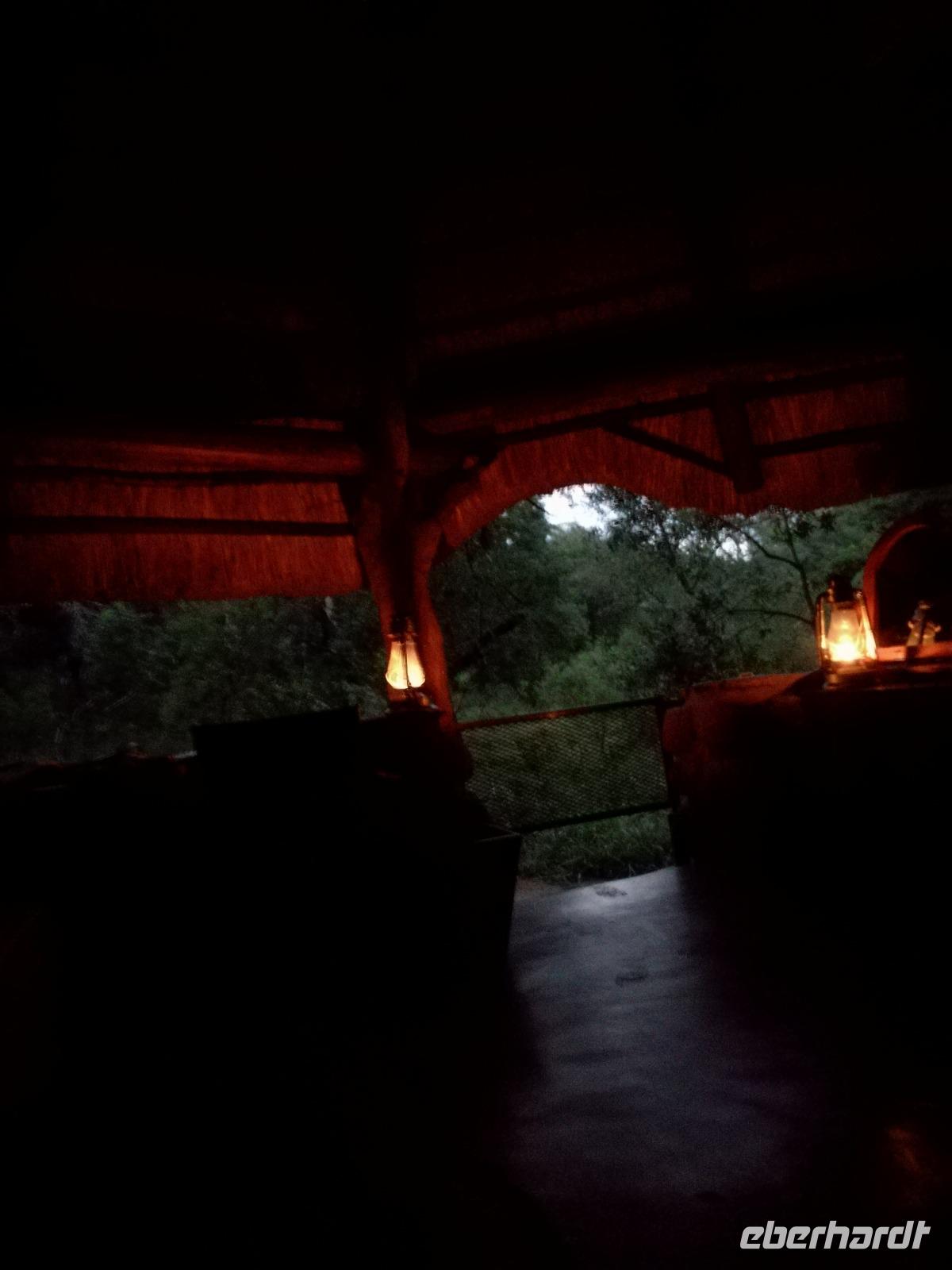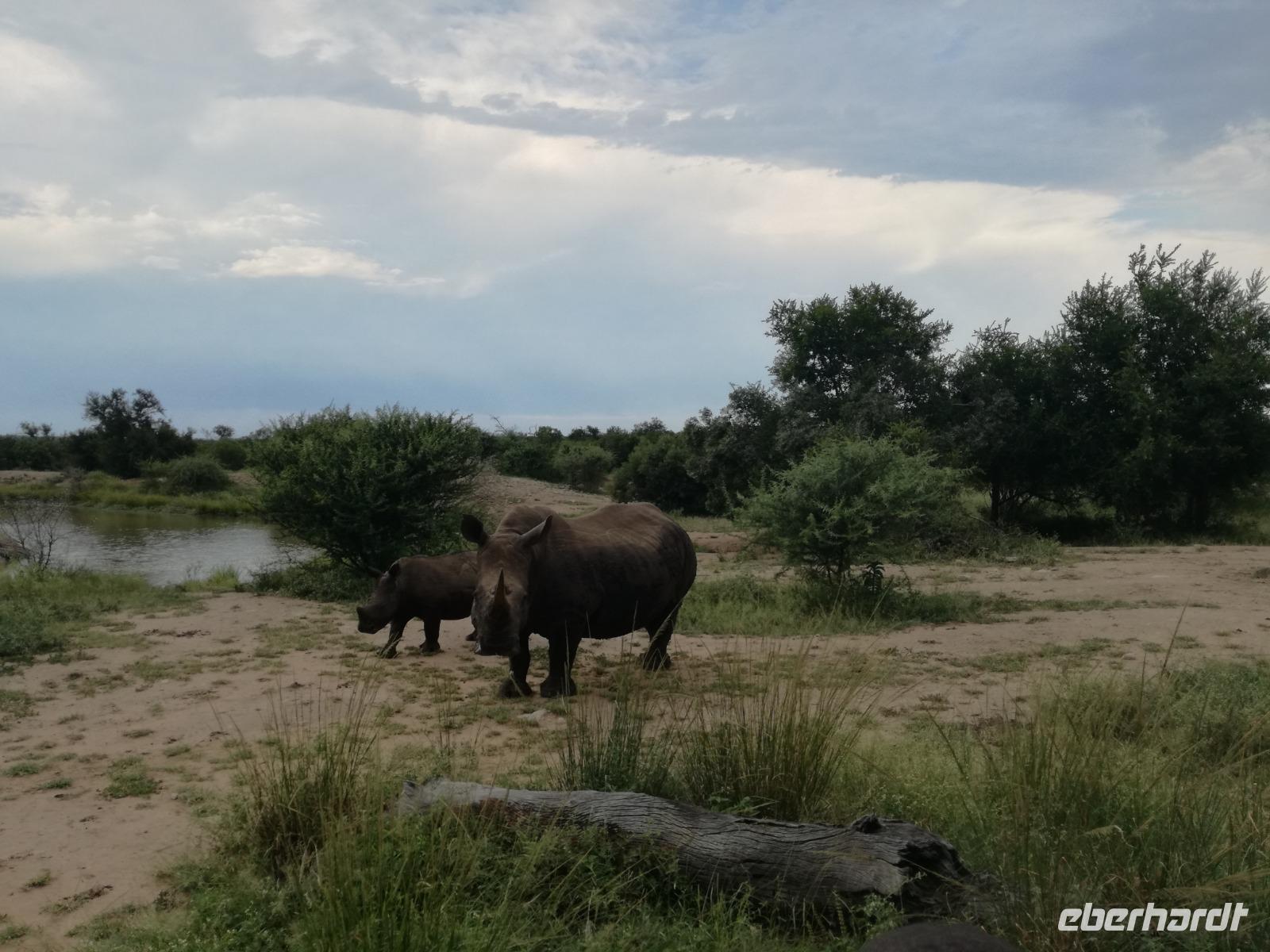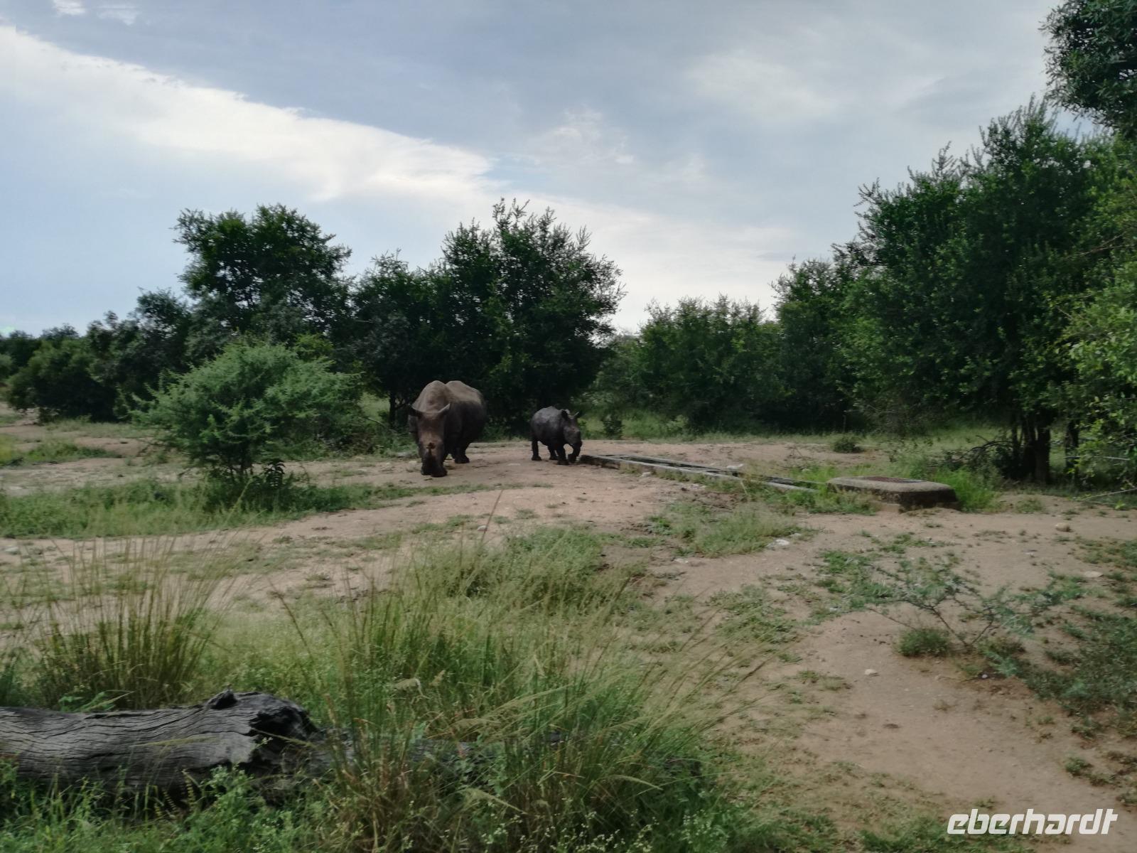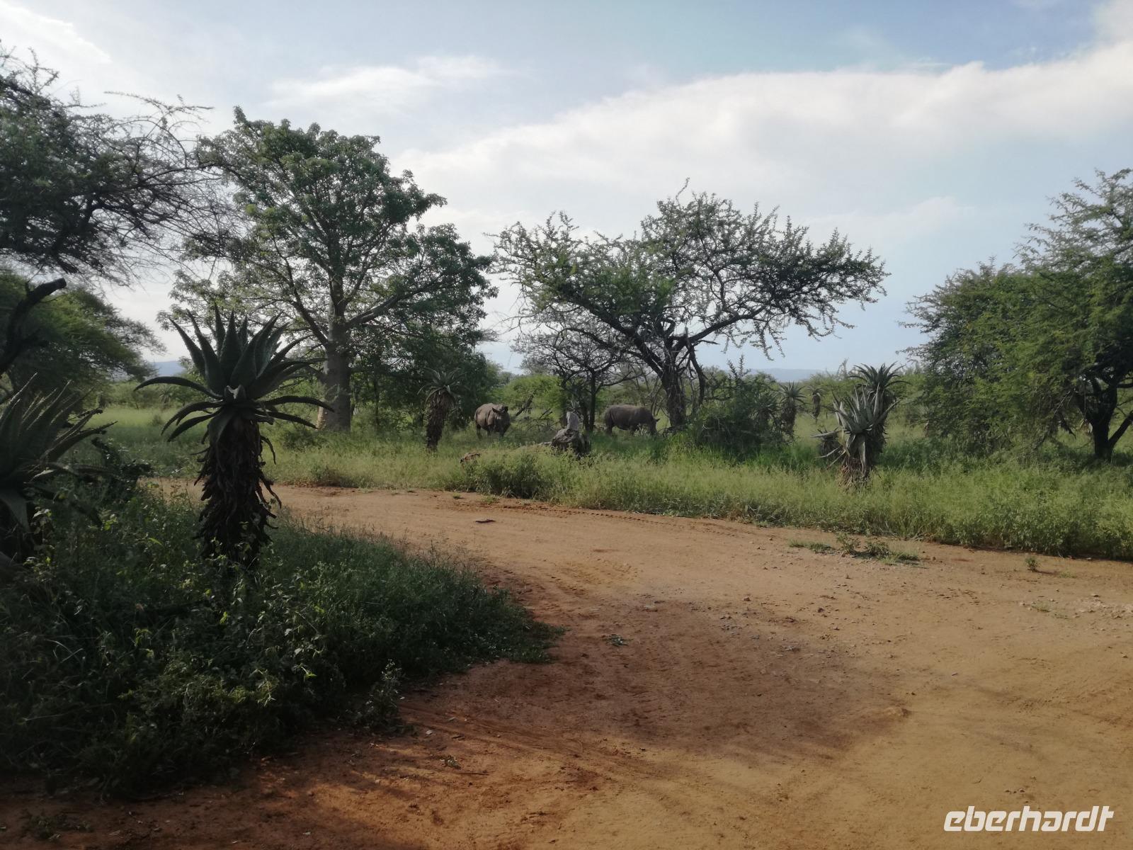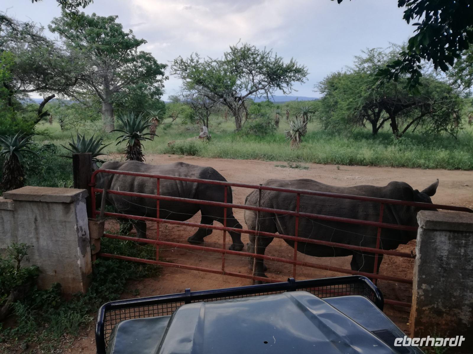 Heute Morgen starteten wir etwas früher in den Tag. Nach dem Frühstück brachen wir auf in Richtung Swaziland. Auf dem Weg erklärt uns Sonet einiges über Land und Leute und über das unabhängige Königreich Swaziland. Um die Mittagszeit überquerten wir die Grenzen von Südafrika nach Swaziland bzw. Königreich Eswatini wie es seit 2018 offiziell heißt. Das Königreich wird seit 1986 vom König MSwti III und er gilt als der letzte absolutitischer Monarch Afrikas. Insgesamt hat der 50 Jährige 19 Ehefrauen und ca. 30 Kindern. Aber wir waren ja nicht wegen dem König gekommen, sondern wir wollten den Mkhaya Game Reserve besuchen. Nach einer kleinen Wartezeit erreichten uns endlich die zwei Jeeps. Das Gepäck blieb beim Bus und wir reisten nur mit Handgepäck ins Stone Camp. Nach einem kurzen Einschreiben wollten wir unsere Pirschfahrt beginnen. Allerdings standen plötzlich zwei Breitmaulnashörner vor uns. Schnell zuckten wir unsere Kameras und hatten somit nach dem Büffel das zweite Mitglied der Big 5 gesehen. Während diese Nashornart im Nationalpark weit verbreitet ist, werden Spitzmaulnashörner eher selten gesehen, da sie sich hauptsächlich im Gebüsch verstecken. Wie der Name bereits verrät, unterscheiden sich die Arten hinsichtlich der Form ihres Mauls. Während das Breitmaulnashorn mit seinem breiten Maul das Gras am Boden frisst, rupft das Spitzmaulnashorn mit der Oberlippe die Blätter von den Ästen. Mit einer Vielzahl an Nashornfotos geht unsere Safari auch schon weiter. Die Gruppen fahren auf unterschiedlichen Routen durch das Reservat. Wir sehen Giraffen, Zebras, Nyalas, "Hippos" und verschiedene Vogelarten. Allerdings spielte uns plötzlich das Wetter einen Strich durch die Rechnung. Plötzlich begann es zu regnen und Gewittern. Schnell bekamen wir Ponchos und fuhren in Richtung Camp. Gegen 18.00 Uhr passieren wir die Einfahrt zum 2,5-Sterne-Stone Camp im Mkhaya Game Reserve. Zuerst werden uns die Unterkünfte gezeigt. Wir werden die Nacht im halboffenem Steinhäuschen mit halbhohen Steinmauern verbringen. Es gibt keinen Strom und das Handgepäck ist am besten in der Truhe zu verstauen, bevor neugierige Affen kommen und einzelne Dinge stibitzen. Das Bett ist von einem Mosquitonetz umgeben. Das Camp ist komplett mit Lichtern und Kerzen beleuchtet. Mit Schirmen gingen wir zunächst in unsere Steinhütten. Zum Abendessen wurde der Regen etwas weniger und wir wurden mit einem tollen Abendessen verwöhnt. Dazu gab es leckeren Wein, Bier und natürlich unser Lieblingsgetränk der Reise - Amarula Wodka. Nach dem Essen ging es in die Hütten und wir verbrachten eine aufregende Nacht in den offenen Steinhäusern.