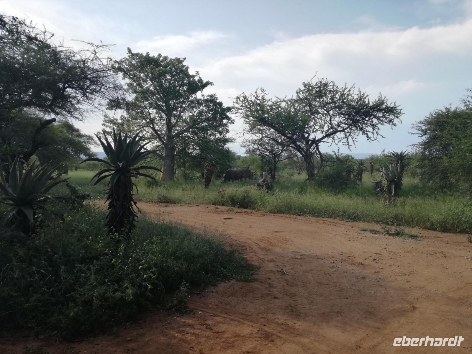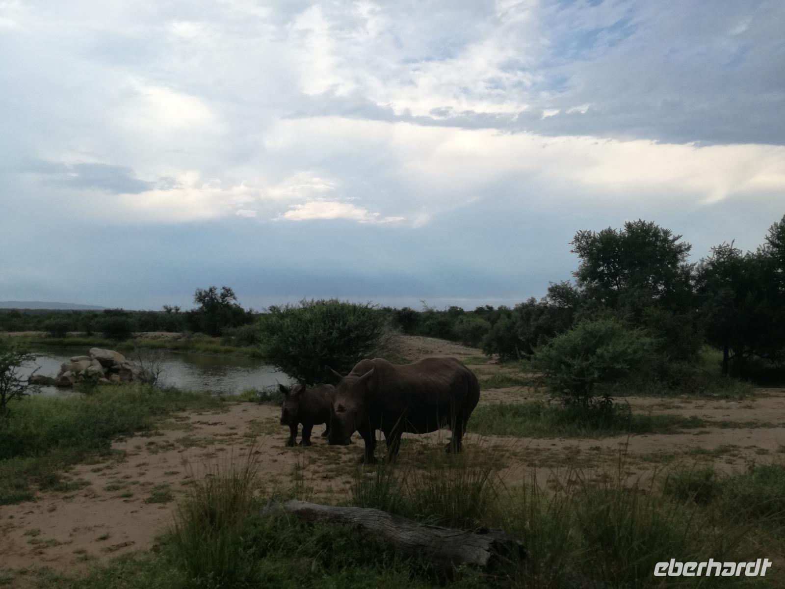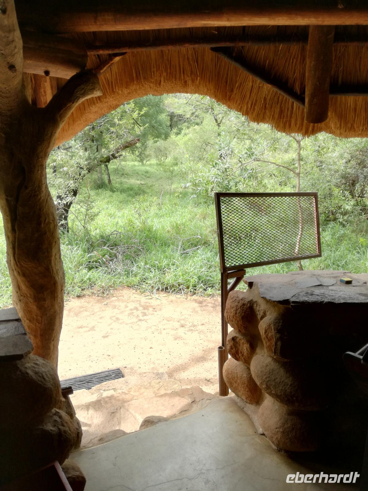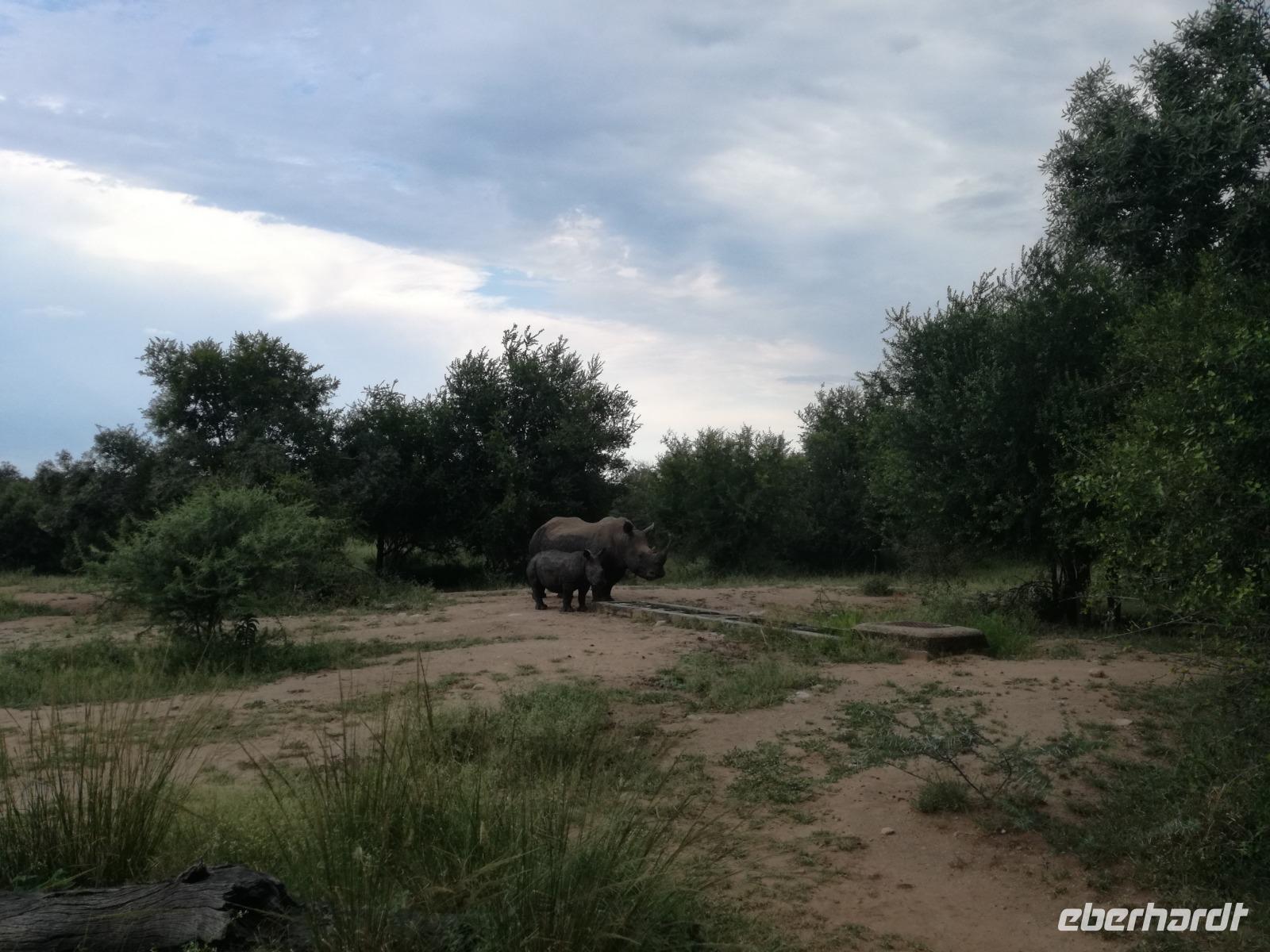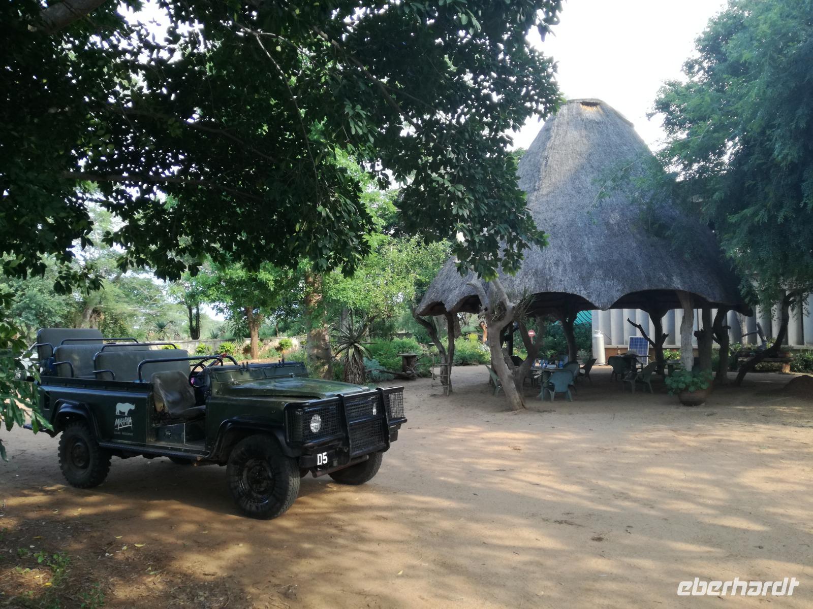 Heute Morgen starteten wir etwas früher in den Tag. Nach dem Frühstück brachen wir auf in Richtung Swaziland. Auf dem Weg erklärt uns Sonet einiges über Land und Leute und über das unabhängige Königreich Swaziland. Um die Mittagszeit überquerten wir die Grenzen von Südafrika nach Swaziland bzw. Königreich Eswatini wie es seit 2018 offiziell heißt. Das Königreich wird seit 1986 vom König MSwti III und er gilt als der letzte absolutitischer Monarch Afrikas. Insgesamt hat der 50 Jährige 19 Ehefrauen und ca. 30 Kindern. Aber wir waren ja nicht wegen dem König gekommen, sondern wir wollten den Mkhaya Game Reserve besuchen. Nach einer kleinen Wartezeit erreichten uns endlich die zwei Jeeps. Das Gepäck blieb beim Bus und wir reisten nur mit Handgepäck ins Stone Camp. Nach einem kurzen Einschreiben wollten wir unsere Pirschfahrt beginnen. Allerdings standen plötzlich zwei Breitmaulnashörner vor uns. Schnell zuckten wir unsere Kameras und hatten somit nach dem Büffel das zweite Mitglied der Big 5 gesehen. Während diese Nashornart im Nationalpark weit verbreitet ist, werden Spitzmaulnashörner eher selten gesehen, da sie sich hauptsächlich im Gebüsch verstecken. Wie der Name bereits verrät, unterscheiden sich die Arten hinsichtlich der Form ihres Mauls. Während das Breitmaulnashorn mit seinem breiten Maul das Gras am Boden frisst, rupft das Spitzmaulnashorn mit der Oberlippe die Blätter von den Ästen. Mit einer Vielzahl an Nashornfotos geht unsere Safari auch schon weiter. Die Gruppen fahren auf unterschiedlichen Routen durch das Reservat. Wir sehen Giraffen, Zebras, Nyalas, "Hippos" und verschiedene Vogelarten. Allerdings spielte uns plötzlich das Wetter einen Strich durch die Rechnung. Plötzlich begann es zu regnen und Gewittern. Schnell bekamen wir Ponchos und fuhren in Richtung Camp. Gegen 18.00 Uhr passieren wir die Einfahrt zum 2,5-Sterne-Stone Camp im Mkhaya Game Reserve. Zuerst werden uns die Unterkünfte gezeigt. Wir werden die Nacht im halboffenem Steinhäuschen mit halbhohen Steinmauern verbringen. Es gibt keinen Strom und das Handgepäck ist am besten in der Truhe zu verstauen, bevor neugierige Affen kommen und einzelne Dinge stibitzen. Das Bett ist von einem Mosquitonetz umgeben. Das Camp ist komplett mit Lichtern und Kerzen beleuchtet. Mit Schirmen gingen wir zunächst in unsere Steinhütten. Zum Abendessen wurde der Regen etwas weniger und wir wurden mit einem tollen Abendessen verwöhnt. Dazu gab es leckeren Wein, Bier und natürlich unser Lieblingsgetränk der Reise - Amarula Wodka. Nach dem Essen ging es in die Hütten und wir verbrachten eine aufregende Nacht in den offenen Steinhäusern.
