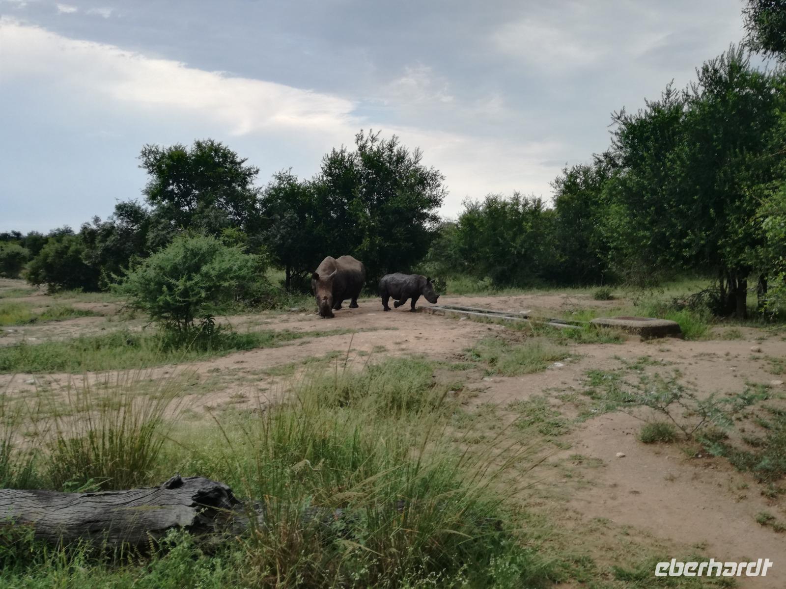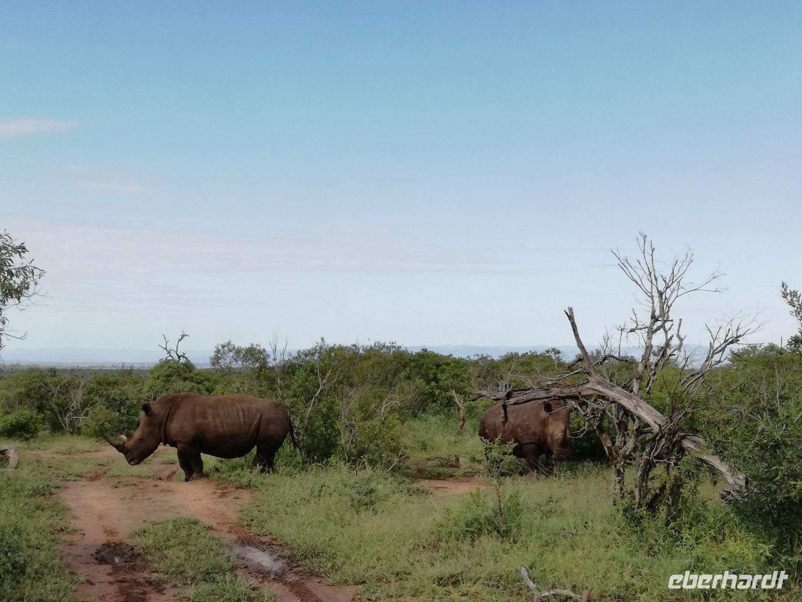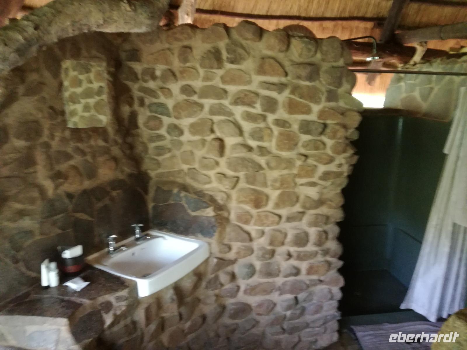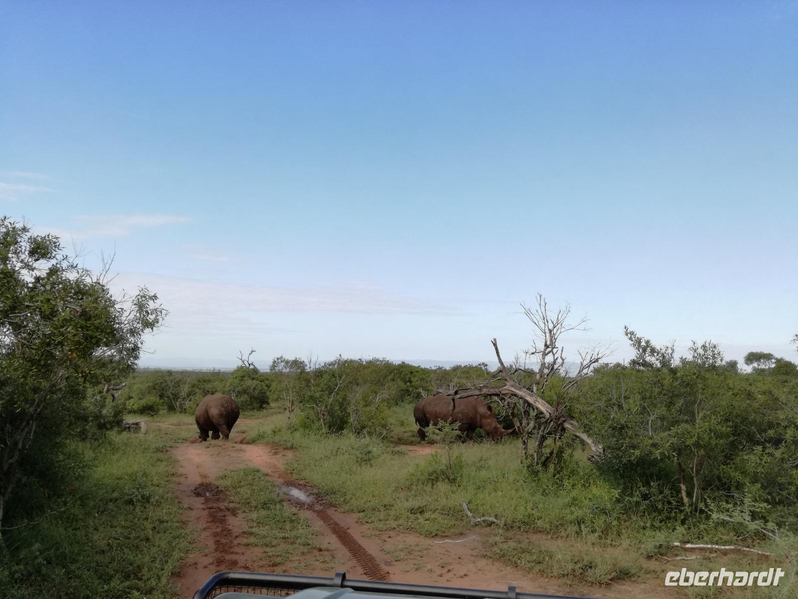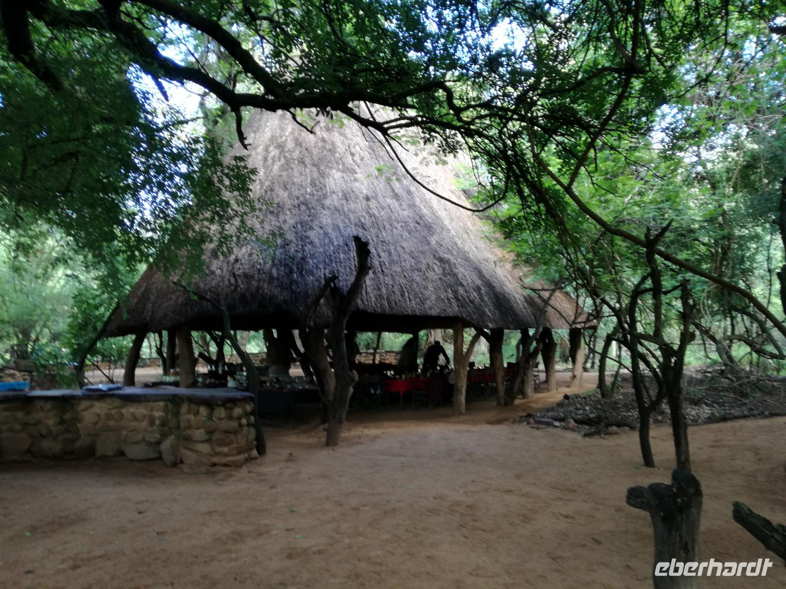 Heute Morgen starteten wir etwas früher in den Tag. Nach dem Frühstück brachen wir auf in Richtung Swaziland. Auf dem Weg erklärt uns Sonet einiges über Land und Leute und über das unabhängige Königreich Swaziland. Um die Mittagszeit überquerten wir die Grenzen von Südafrika nach Swaziland bzw. Königreich Eswatini wie es seit 2018 offiziell heißt. Das Königreich wird seit 1986 vom König MSwti III und er gilt als der letzte absolutitischer Monarch Afrikas. Insgesamt hat der 50 Jährige 19 Ehefrauen und ca. 30 Kindern. Aber wir waren ja nicht wegen dem König gekommen, sondern wir wollten den Mkhaya Game Reserve besuchen. Nach einer kleinen Wartezeit erreichten uns endlich die zwei Jeeps. Das Gepäck blieb beim Bus und wir reisten nur mit Handgepäck ins Stone Camp. Nach einem kurzen Einschreiben wollten wir unsere Pirschfahrt beginnen. Allerdings standen plötzlich zwei Breitmaulnashörner vor uns. Schnell zuckten wir unsere Kameras und hatten somit nach dem Büffel das zweite Mitglied der Big 5 gesehen. Während diese Nashornart im Nationalpark weit verbreitet ist, werden Spitzmaulnashörner eher selten gesehen, da sie sich hauptsächlich im Gebüsch verstecken. Wie der Name bereits verrät, unterscheiden sich die Arten hinsichtlich der Form ihres Mauls. Während das Breitmaulnashorn mit seinem breiten Maul das Gras am Boden frisst, rupft das Spitzmaulnashorn mit der Oberlippe die Blätter von den Ästen. Mit einer Vielzahl an Nashornfotos geht unsere Safari auch schon weiter. Die Gruppen fahren auf unterschiedlichen Routen durch das Reservat. Wir sehen Giraffen, Zebras, Nyalas, "Hippos" und verschiedene Vogelarten. Allerdings spielte uns plötzlich das Wetter einen Strich durch die Rechnung. Plötzlich begann es zu regnen und Gewittern. Schnell bekamen wir Ponchos und fuhren in Richtung Camp. Gegen 18.00 Uhr passieren wir die Einfahrt zum 2,5-Sterne-Stone Camp im Mkhaya Game Reserve. Zuerst werden uns die Unterkünfte gezeigt. Wir werden die Nacht im halboffenem Steinhäuschen mit halbhohen Steinmauern verbringen. Es gibt keinen Strom und das Handgepäck ist am besten in der Truhe zu verstauen, bevor neugierige Affen kommen und einzelne Dinge stibitzen. Das Bett ist von einem Mosquitonetz umgeben. Das Camp ist komplett mit Lichtern und Kerzen beleuchtet. Mit Schirmen gingen wir zunächst in unsere Steinhütten. Zum Abendessen wurde der Regen etwas weniger und wir wurden mit einem tollen Abendessen verwöhnt. Dazu gab es leckeren Wein, Bier und natürlich unser Lieblingsgetränk der Reise - Amarula Wodka. Nach dem Essen ging es in die Hütten und wir verbrachten eine aufregende Nacht in den offenen Steinhäusern.