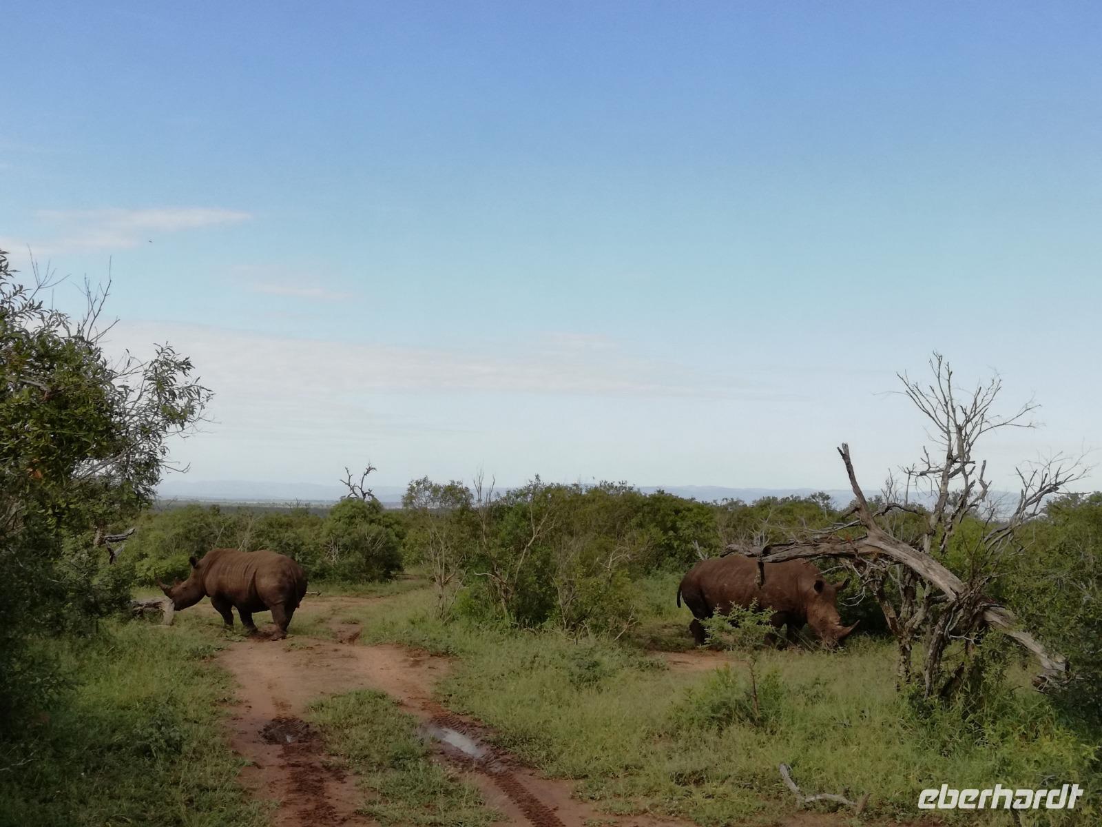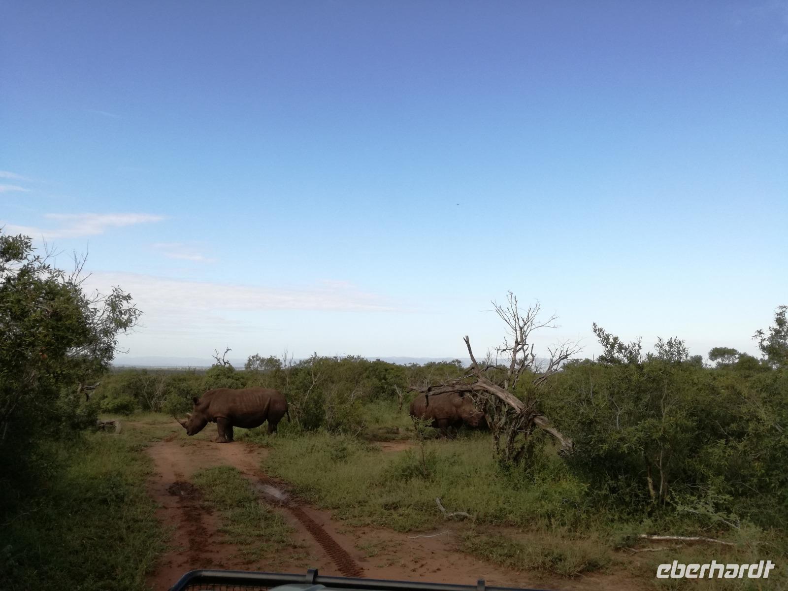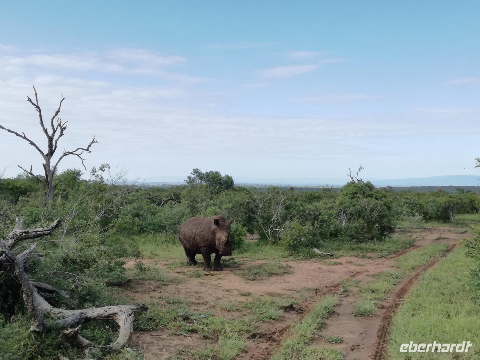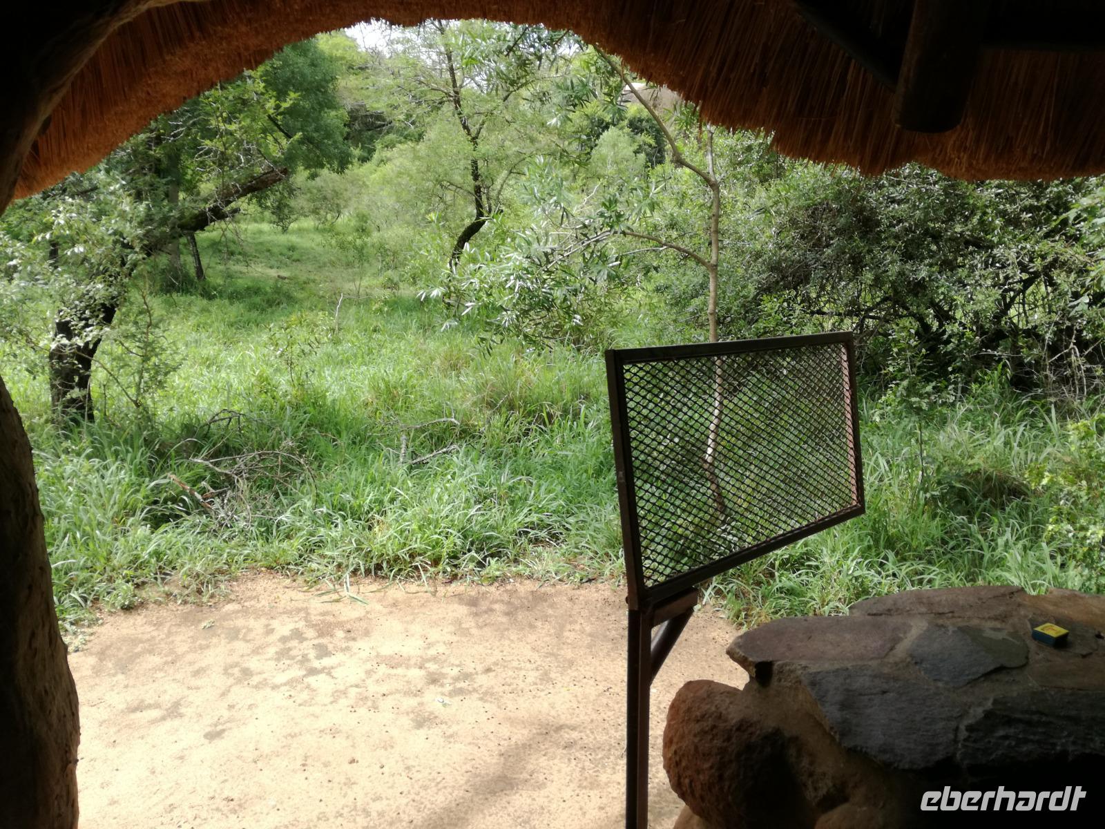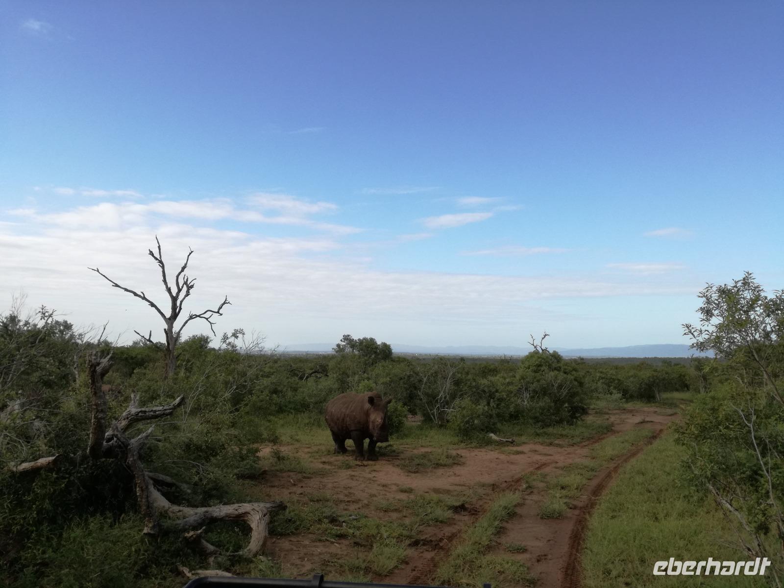 Heute Morgen starteten wir etwas früher in den Tag. Nach dem Frühstück brachen wir auf in Richtung Swaziland. Auf dem Weg erklärt uns Sonet einiges über Land und Leute und über das unabhängige Königreich Swaziland. Um die Mittagszeit überquerten wir die Grenzen von Südafrika nach Swaziland bzw. Königreich Eswatini wie es seit 2018 offiziell heißt. Das Königreich wird seit 1986 vom König MSwti III und er gilt als der letzte absolutitischer Monarch Afrikas. Insgesamt hat der 50 Jährige 19 Ehefrauen und ca. 30 Kindern. Aber wir waren ja nicht wegen dem König gekommen, sondern wir wollten den Mkhaya Game Reserve besuchen. Nach einer kleinen Wartezeit erreichten uns endlich die zwei Jeeps. Das Gepäck blieb beim Bus und wir reisten nur mit Handgepäck ins Stone Camp. Nach einem kurzen Einschreiben wollten wir unsere Pirschfahrt beginnen. Allerdings standen plötzlich zwei Breitmaulnashörner vor uns. Schnell zuckten wir unsere Kameras und hatten somit nach dem Büffel das zweite Mitglied der Big 5 gesehen. Während diese Nashornart im Nationalpark weit verbreitet ist, werden Spitzmaulnashörner eher selten gesehen, da sie sich hauptsächlich im Gebüsch verstecken. Wie der Name bereits verrät, unterscheiden sich die Arten hinsichtlich der Form ihres Mauls. Während das Breitmaulnashorn mit seinem breiten Maul das Gras am Boden frisst, rupft das Spitzmaulnashorn mit der Oberlippe die Blätter von den Ästen. Mit einer Vielzahl an Nashornfotos geht unsere Safari auch schon weiter. Die Gruppen fahren auf unterschiedlichen Routen durch das Reservat. Wir sehen Giraffen, Zebras, Nyalas, "Hippos" und verschiedene Vogelarten. Allerdings spielte uns plötzlich das Wetter einen Strich durch die Rechnung. Plötzlich begann es zu regnen und Gewittern. Schnell bekamen wir Ponchos und fuhren in Richtung Camp. Gegen 18.00 Uhr passieren wir die Einfahrt zum 2,5-Sterne-Stone Camp im Mkhaya Game Reserve. Zuerst werden uns die Unterkünfte gezeigt. Wir werden die Nacht im halboffenem Steinhäuschen mit halbhohen Steinmauern verbringen. Es gibt keinen Strom und das Handgepäck ist am besten in der Truhe zu verstauen, bevor neugierige Affen kommen und einzelne Dinge stibitzen. Das Bett ist von einem Mosquitonetz umgeben. Das Camp ist komplett mit Lichtern und Kerzen beleuchtet. Mit Schirmen gingen wir zunächst in unsere Steinhütten. Zum Abendessen wurde der Regen etwas weniger und wir wurden mit einem tollen Abendessen verwöhnt. Dazu gab es leckeren Wein, Bier und natürlich unser Lieblingsgetränk der Reise - Amarula Wodka. Nach dem Essen ging es in die Hütten und wir verbrachten eine aufregende Nacht in den offenen Steinhäusern.