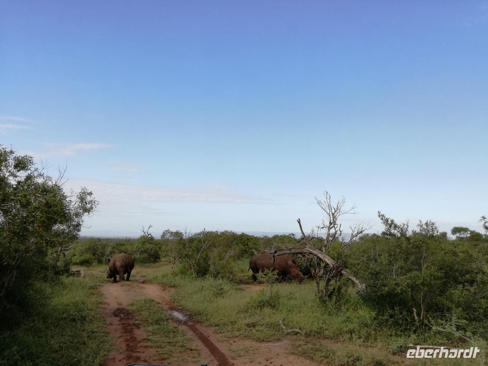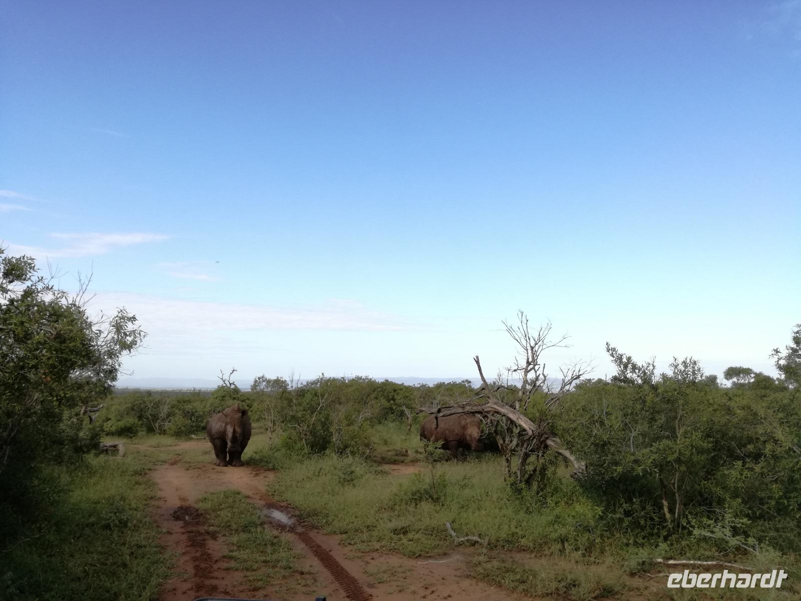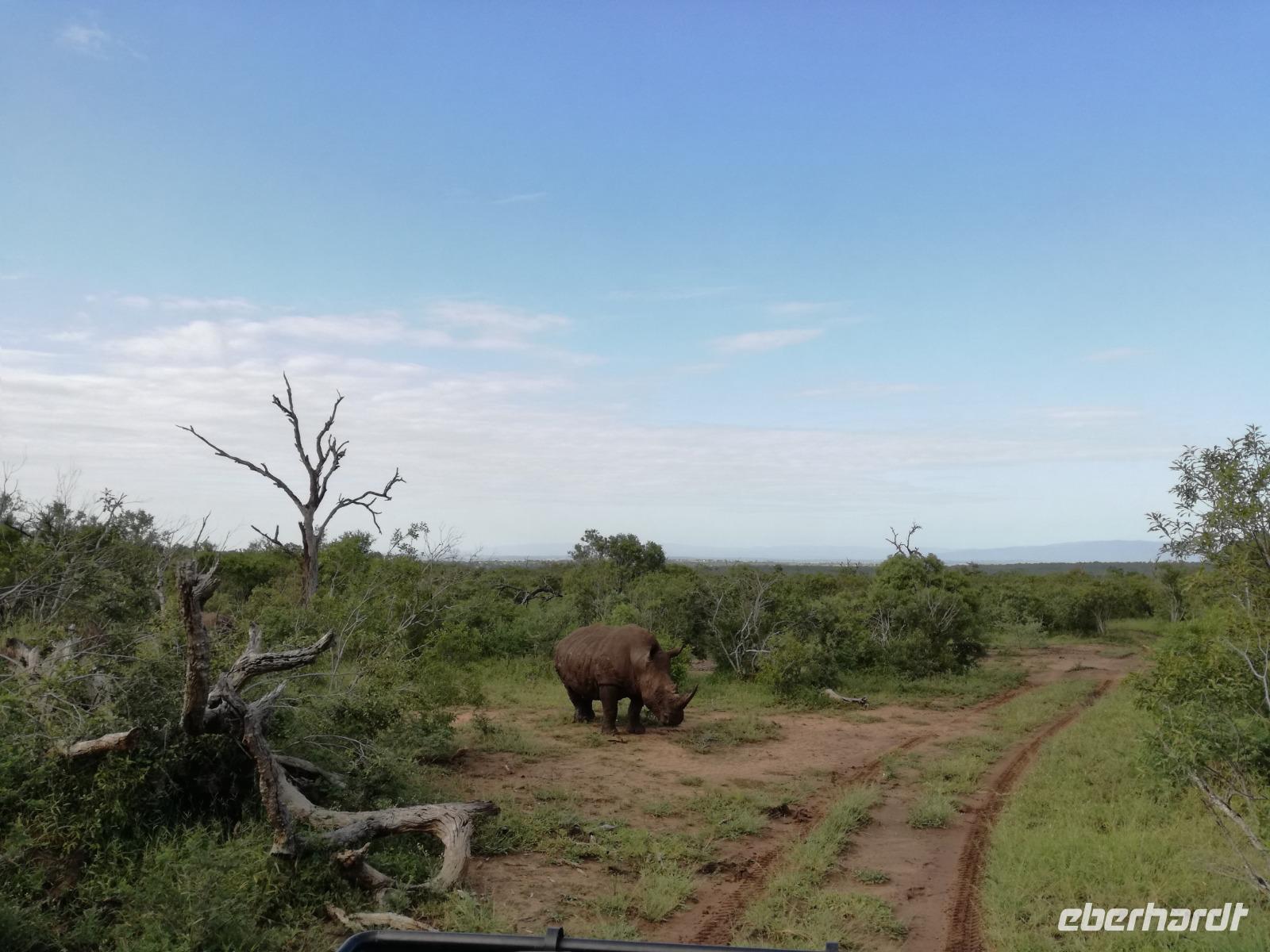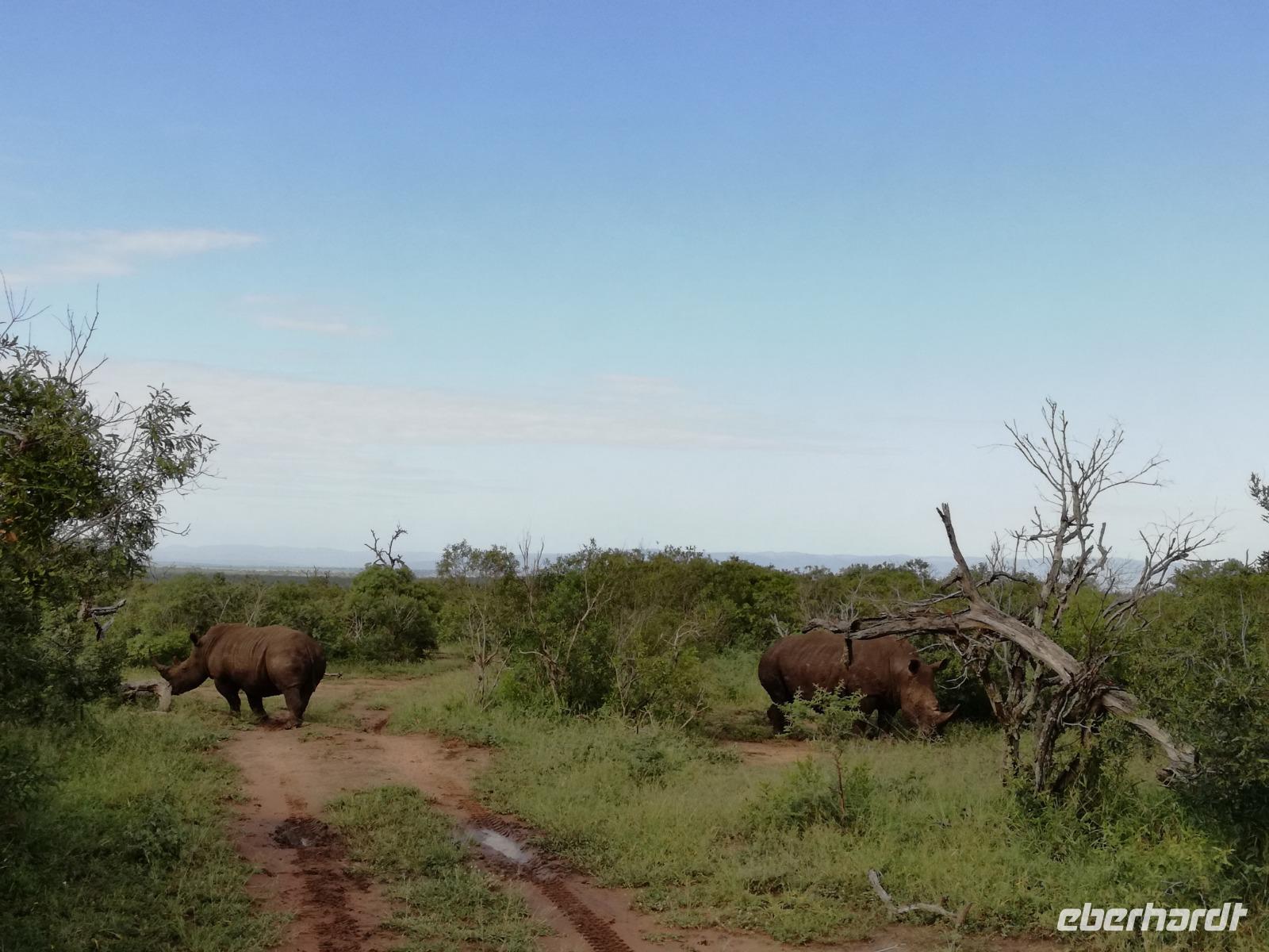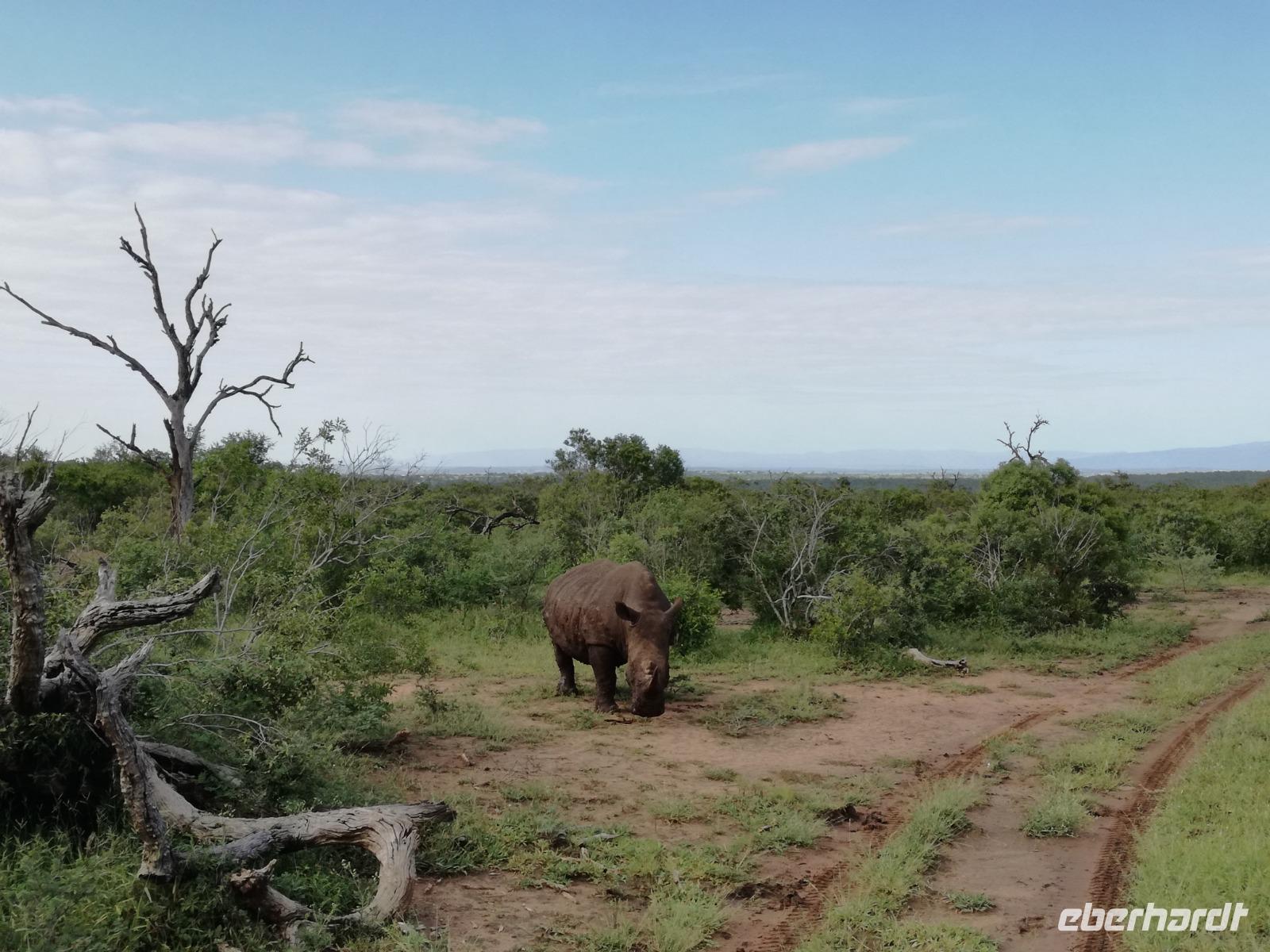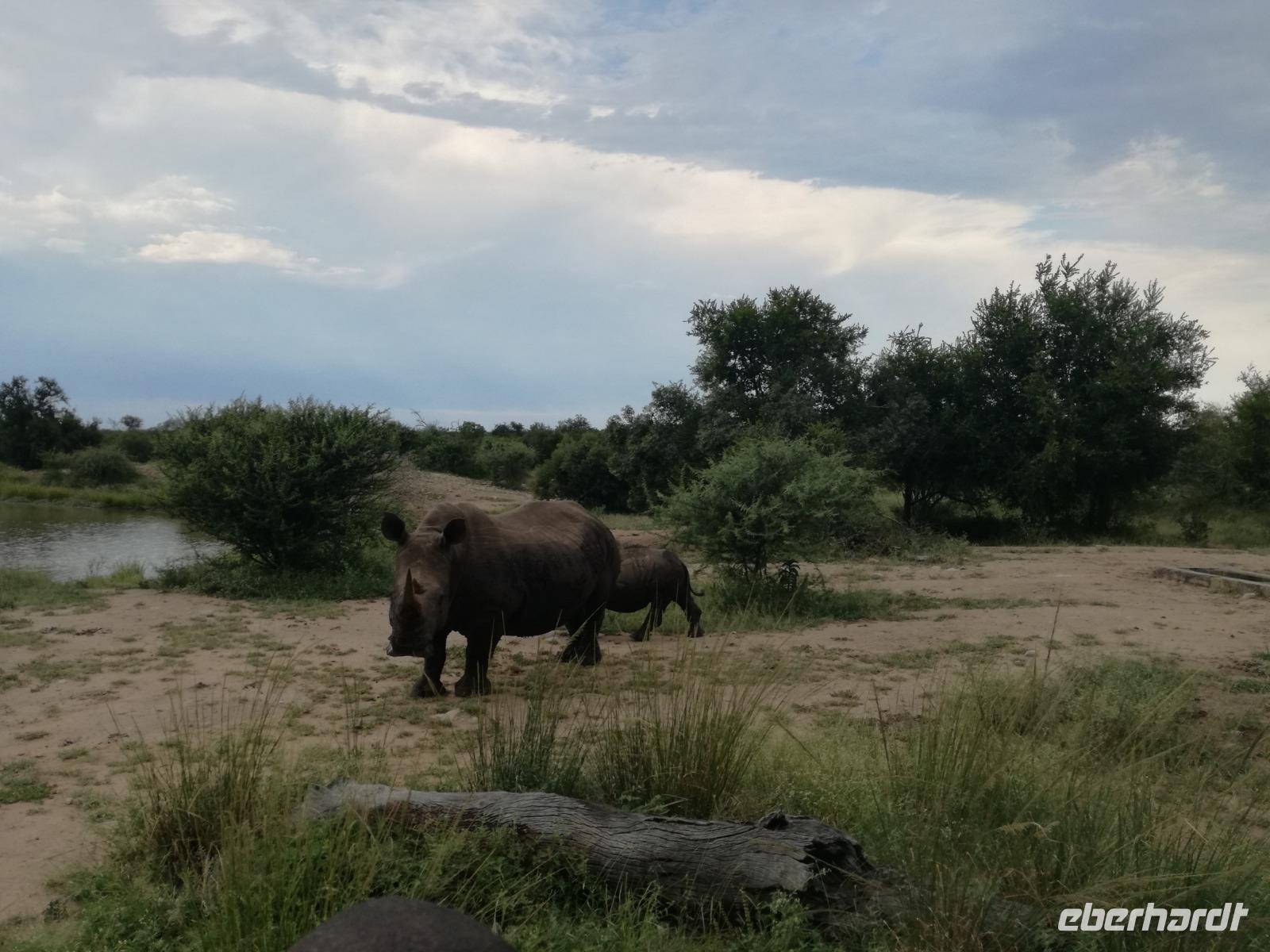 Heute Morgen starteten wir etwas früher in den Tag. Nach dem Frühstück brachen wir auf in Richtung Swaziland. Auf dem Weg erklärt uns Sonet einiges über Land und Leute und über das unabhängige Königreich Swaziland. Um die Mittagszeit überquerten wir die Grenzen von Südafrika nach Swaziland bzw. Königreich Eswatini wie es seit 2018 offiziell heißt. Das Königreich wird seit 1986 vom König MSwti III und er gilt als der letzte absolutitischer Monarch Afrikas. Insgesamt hat der 50 Jährige 19 Ehefrauen und ca. 30 Kindern. Aber wir waren ja nicht wegen dem König gekommen, sondern wir wollten den Mkhaya Game Reserve besuchen. Nach einer kleinen Wartezeit erreichten uns endlich die zwei Jeeps. Das Gepäck blieb beim Bus und wir reisten nur mit Handgepäck ins Stone Camp. Nach einem kurzen Einschreiben wollten wir unsere Pirschfahrt beginnen. Allerdings standen plötzlich zwei Breitmaulnashörner vor uns. Schnell zuckten wir unsere Kameras und hatten somit nach dem Büffel das zweite Mitglied der Big 5 gesehen. Während diese Nashornart im Nationalpark weit verbreitet ist, werden Spitzmaulnashörner eher selten gesehen, da sie sich hauptsächlich im Gebüsch verstecken. Wie der Name bereits verrät, unterscheiden sich die Arten hinsichtlich der Form ihres Mauls. Während das Breitmaulnashorn mit seinem breiten Maul das Gras am Boden frisst, rupft das Spitzmaulnashorn mit der Oberlippe die Blätter von den Ästen. Mit einer Vielzahl an Nashornfotos geht unsere Safari auch schon weiter. Die Gruppen fahren auf unterschiedlichen Routen durch das Reservat. Wir sehen Giraffen, Zebras, Nyalas, "Hippos" und verschiedene Vogelarten. Allerdings spielte uns plötzlich das Wetter einen Strich durch die Rechnung. Plötzlich begann es zu regnen und Gewittern. Schnell bekamen wir Ponchos und fuhren in Richtung Camp. Gegen 18.00 Uhr passieren wir die Einfahrt zum 2,5-Sterne-Stone Camp im Mkhaya Game Reserve. Zuerst werden uns die Unterkünfte gezeigt. Wir werden die Nacht im halboffenem Steinhäuschen mit halbhohen Steinmauern verbringen. Es gibt keinen Strom und das Handgepäck ist am besten in der Truhe zu verstauen, bevor neugierige Affen kommen und einzelne Dinge stibitzen. Das Bett ist von einem Mosquitonetz umgeben. Das Camp ist komplett mit Lichtern und Kerzen beleuchtet. Mit Schirmen gingen wir zunächst in unsere Steinhütten. Zum Abendessen wurde der Regen etwas weniger und wir wurden mit einem tollen Abendessen verwöhnt. Dazu gab es leckeren Wein, Bier und natürlich unser Lieblingsgetränk der Reise - Amarula Wodka. Nach dem Essen ging es in die Hütten und wir verbrachten eine aufregende Nacht in den offenen Steinhäusern.