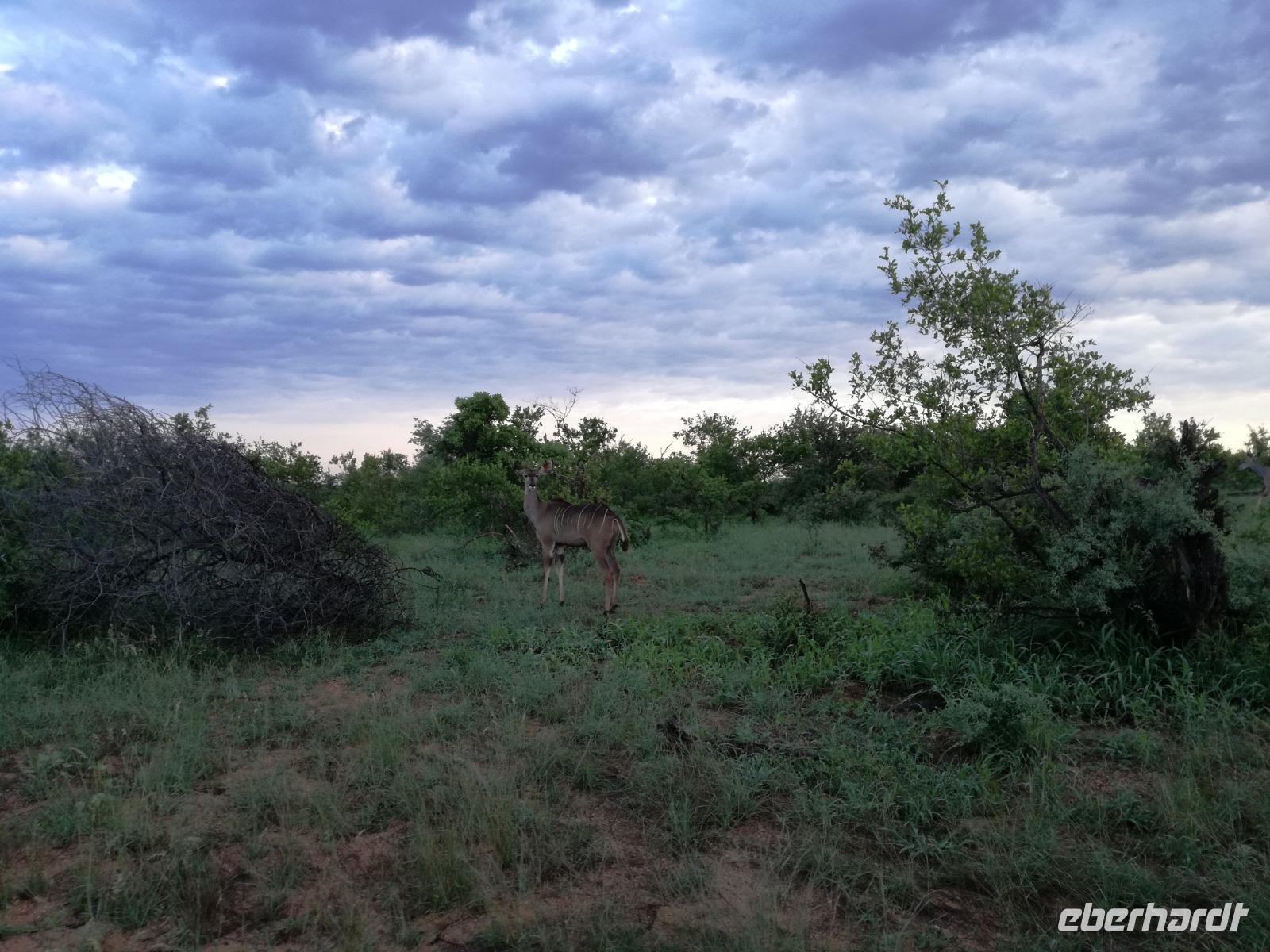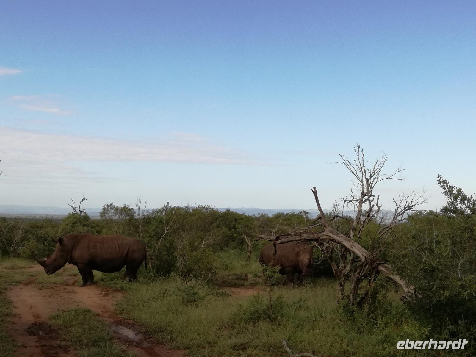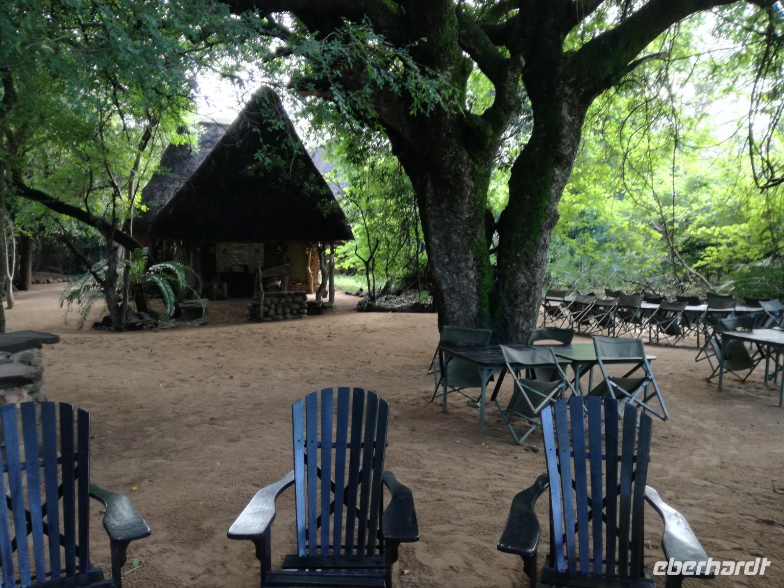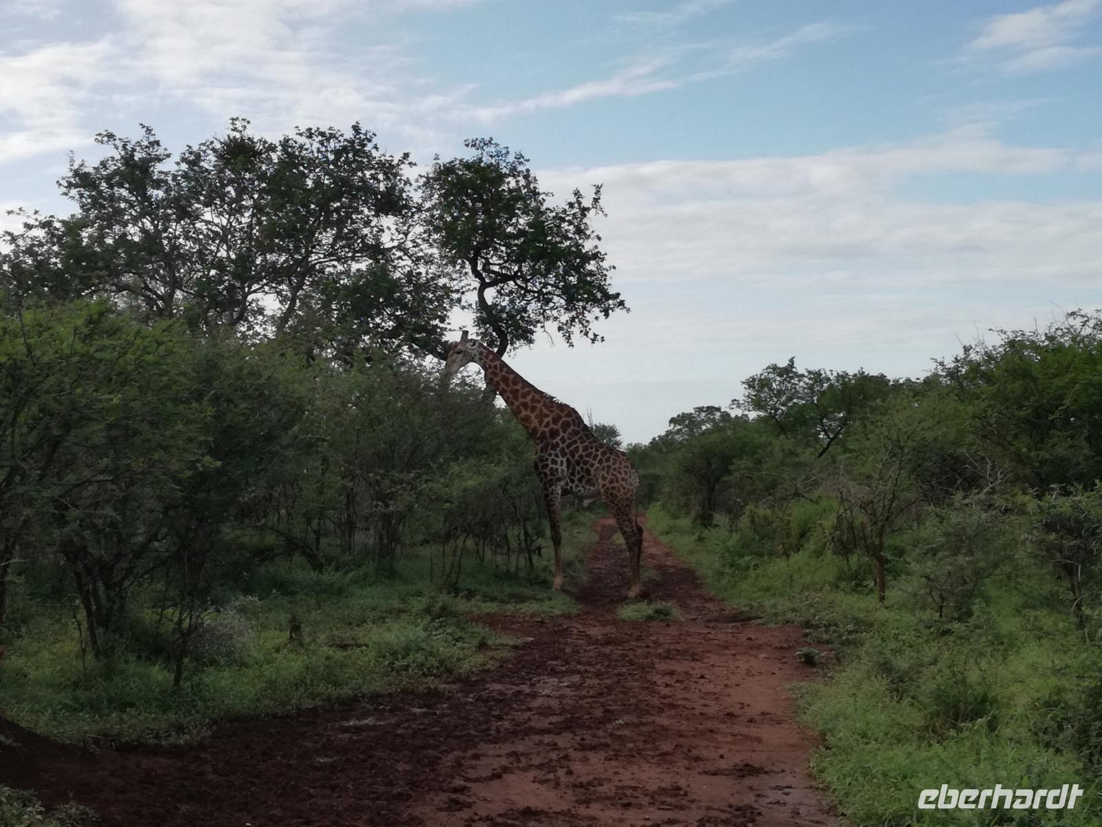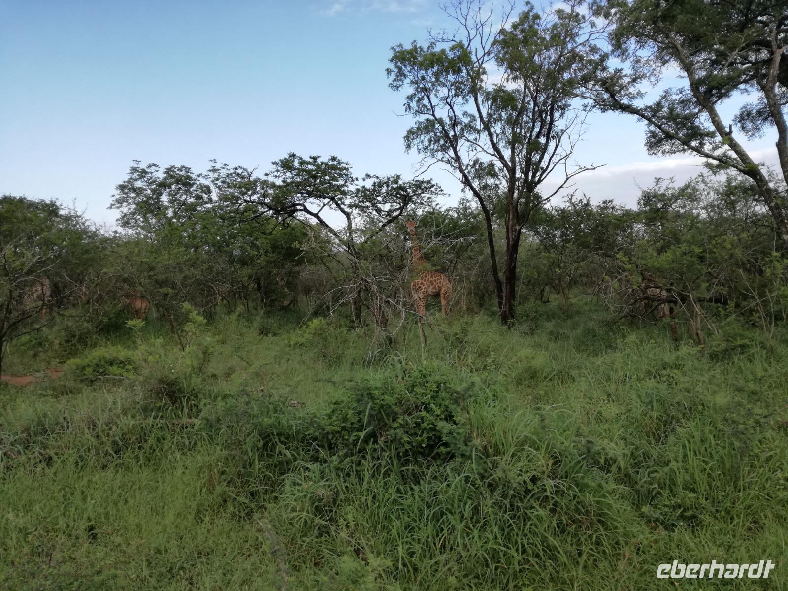 Heute Morgen starteten wir etwas früher in den Tag. Nach dem Frühstück brachen wir auf in Richtung Swaziland. Auf dem Weg erklärt uns Sonet einiges über Land und Leute und über das unabhängige Königreich Swaziland. Um die Mittagszeit überquerten wir die Grenzen von Südafrika nach Swaziland bzw. Königreich Eswatini wie es seit 2018 offiziell heißt. Das Königreich wird seit 1986 vom König MSwti III und er gilt als der letzte absolutitischer Monarch Afrikas. Insgesamt hat der 50 Jährige 19 Ehefrauen und ca. 30 Kindern. Aber wir waren ja nicht wegen dem König gekommen, sondern wir wollten den Mkhaya Game Reserve besuchen. Nach einer kleinen Wartezeit erreichten uns endlich die zwei Jeeps. Das Gepäck blieb beim Bus und wir reisten nur mit Handgepäck ins Stone Camp. Nach einem kurzen Einschreiben wollten wir unsere Pirschfahrt beginnen. Allerdings standen plötzlich zwei Breitmaulnashörner vor uns. Schnell zuckten wir unsere Kameras und hatten somit nach dem Büffel das zweite Mitglied der Big 5 gesehen. Während diese Nashornart im Nationalpark weit verbreitet ist, werden Spitzmaulnashörner eher selten gesehen, da sie sich hauptsächlich im Gebüsch verstecken. Wie der Name bereits verrät, unterscheiden sich die Arten hinsichtlich der Form ihres Mauls. Während das Breitmaulnashorn mit seinem breiten Maul das Gras am Boden frisst, rupft das Spitzmaulnashorn mit der Oberlippe die Blätter von den Ästen. Mit einer Vielzahl an Nashornfotos geht unsere Safari auch schon weiter. Die Gruppen fahren auf unterschiedlichen Routen durch das Reservat. Wir sehen Giraffen, Zebras, Nyalas, "Hippos" und verschiedene Vogelarten. Allerdings spielte uns plötzlich das Wetter einen Strich durch die Rechnung. Plötzlich begann es zu regnen und Gewittern. Schnell bekamen wir Ponchos und fuhren in Richtung Camp. Gegen 18.00 Uhr passieren wir die Einfahrt zum 2,5-Sterne-Stone Camp im Mkhaya Game Reserve. Zuerst werden uns die Unterkünfte gezeigt. Wir werden die Nacht im halboffenem Steinhäuschen mit halbhohen Steinmauern verbringen. Es gibt keinen Strom und das Handgepäck ist am besten in der Truhe zu verstauen, bevor neugierige Affen kommen und einzelne Dinge stibitzen. Das Bett ist von einem Mosquitonetz umgeben. Das Camp ist komplett mit Lichtern und Kerzen beleuchtet. Mit Schirmen gingen wir zunächst in unsere Steinhütten. Zum Abendessen wurde der Regen etwas weniger und wir wurden mit einem tollen Abendessen verwöhnt. Dazu gab es leckeren Wein, Bier und natürlich unser Lieblingsgetränk der Reise - Amarula Wodka. Nach dem Essen ging es in die Hütten und wir verbrachten eine aufregende Nacht in den offenen Steinhäusern.