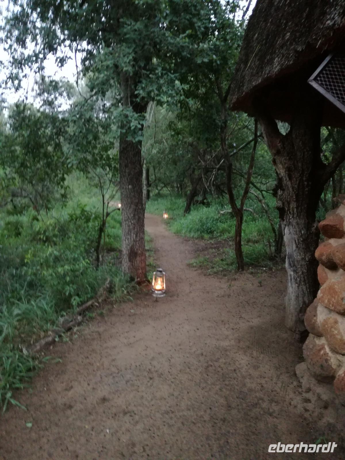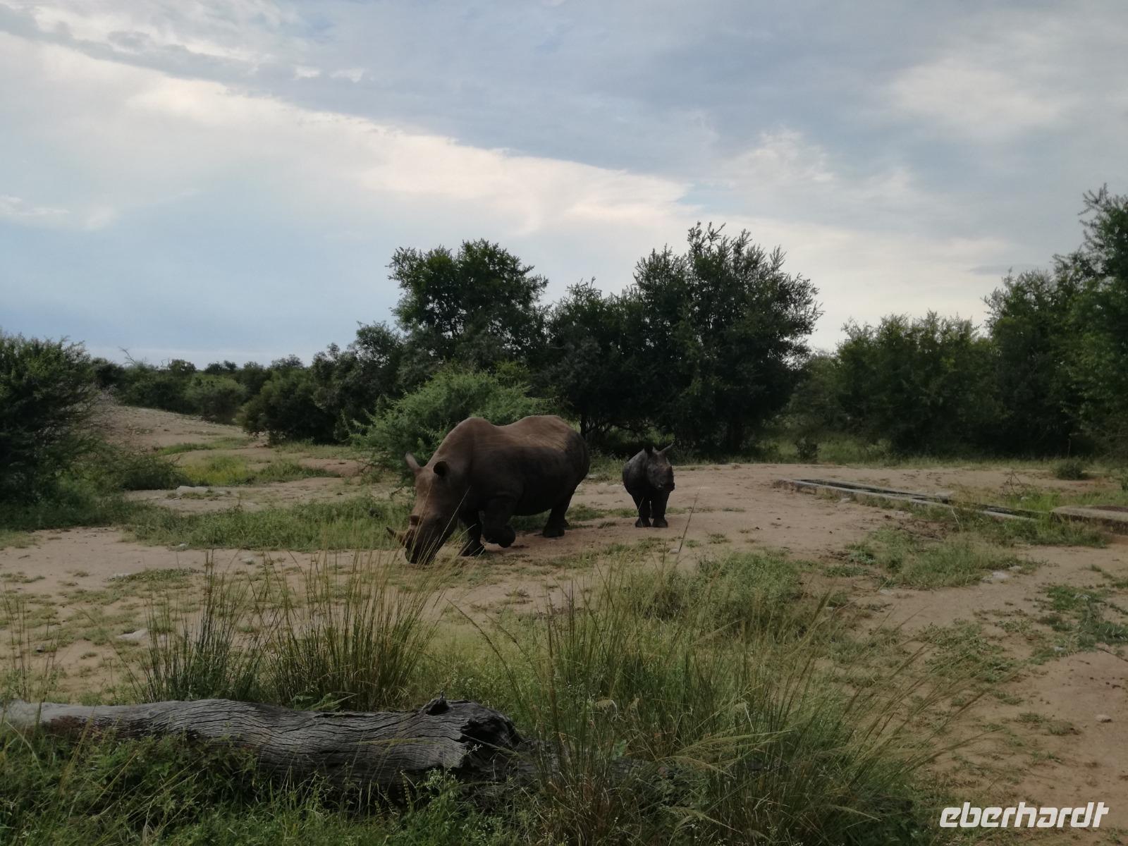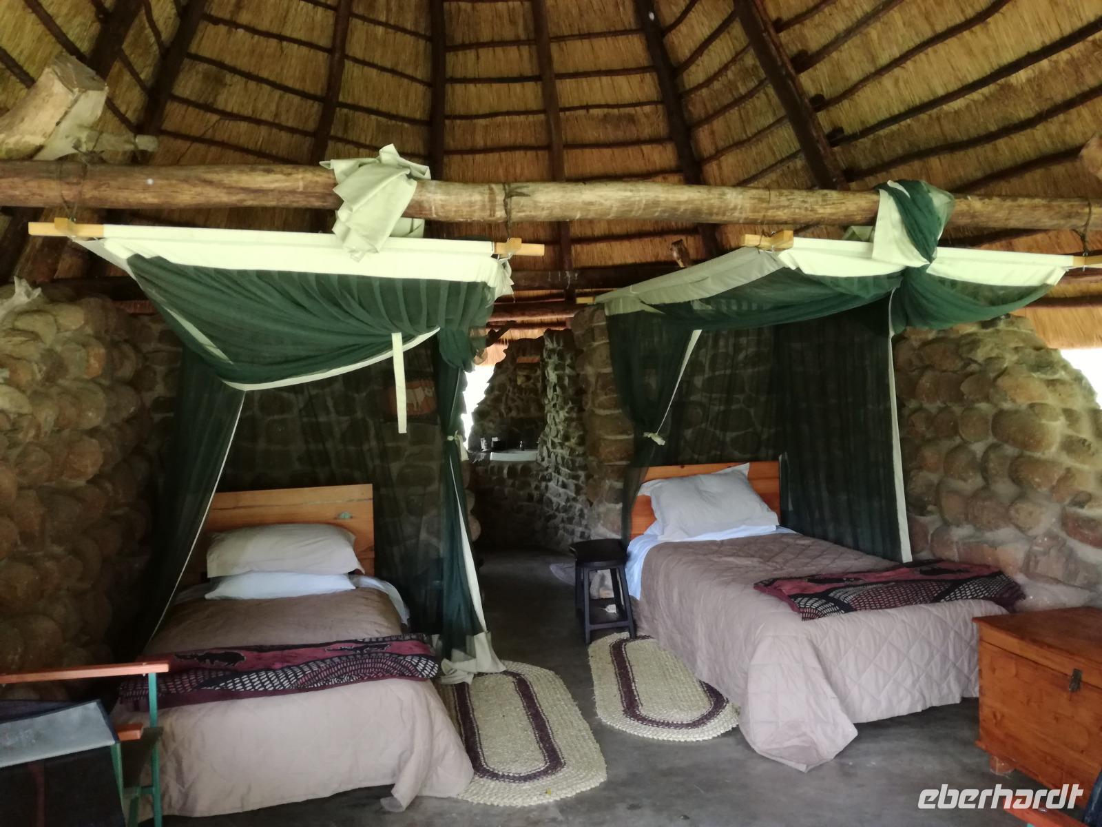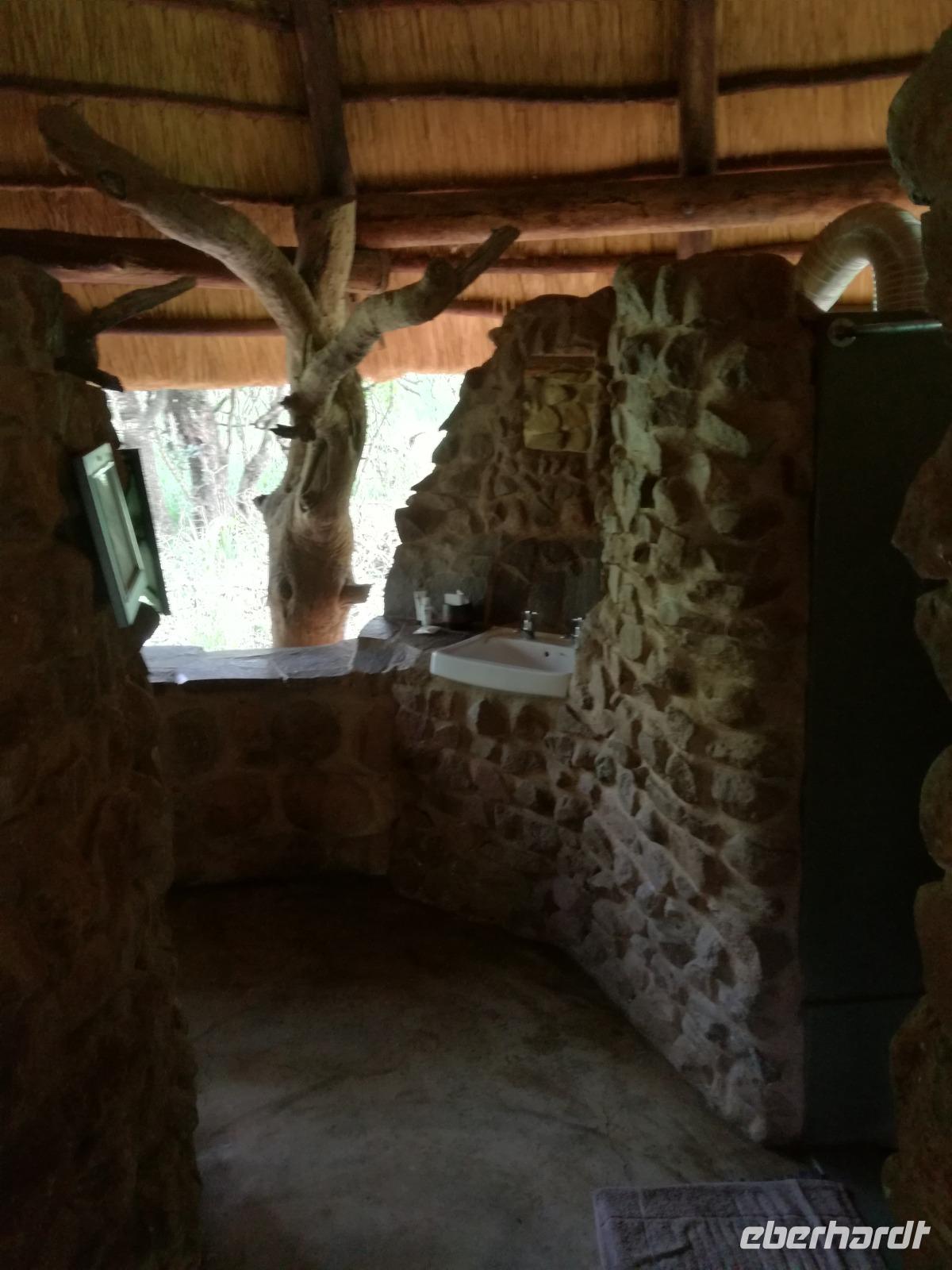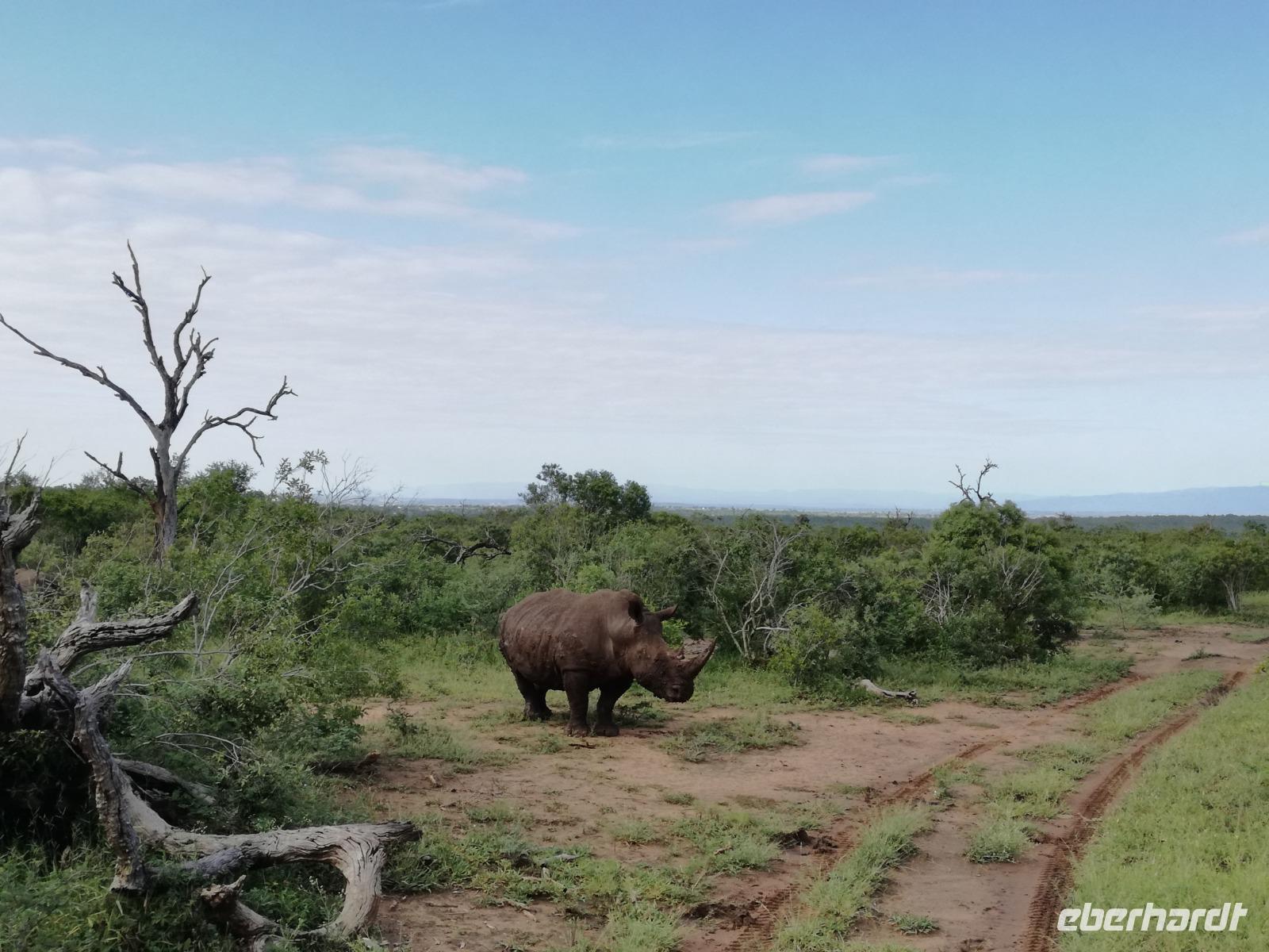 Heute Morgen starteten wir etwas früher in den Tag. Nach dem Frühstück brachen wir auf in Richtung Swaziland. Auf dem Weg erklärt uns Sonet einiges über Land und Leute und über das unabhängige Königreich Swaziland. Um die Mittagszeit überquerten wir die Grenzen von Südafrika nach Swaziland bzw. Königreich Eswatini wie es seit 2018 offiziell heißt. Das Königreich wird seit 1986 vom König MSwti III und er gilt als der letzte absolutitischer Monarch Afrikas. Insgesamt hat der 50 Jährige 19 Ehefrauen und ca. 30 Kindern. Aber wir waren ja nicht wegen dem König gekommen, sondern wir wollten den Mkhaya Game Reserve besuchen. Nach einer kleinen Wartezeit erreichten uns endlich die zwei Jeeps. Das Gepäck blieb beim Bus und wir reisten nur mit Handgepäck ins Stone Camp. Nach einem kurzen Einschreiben wollten wir unsere Pirschfahrt beginnen. Allerdings standen plötzlich zwei Breitmaulnashörner vor uns. Schnell zuckten wir unsere Kameras und hatten somit nach dem Büffel das zweite Mitglied der Big 5 gesehen. Während diese Nashornart im Nationalpark weit verbreitet ist, werden Spitzmaulnashörner eher selten gesehen, da sie sich hauptsächlich im Gebüsch verstecken. Wie der Name bereits verrät, unterscheiden sich die Arten hinsichtlich der Form ihres Mauls. Während das Breitmaulnashorn mit seinem breiten Maul das Gras am Boden frisst, rupft das Spitzmaulnashorn mit der Oberlippe die Blätter von den Ästen. Mit einer Vielzahl an Nashornfotos geht unsere Safari auch schon weiter. Die Gruppen fahren auf unterschiedlichen Routen durch das Reservat. Wir sehen Giraffen, Zebras, Nyalas, "Hippos" und verschiedene Vogelarten. Allerdings spielte uns plötzlich das Wetter einen Strich durch die Rechnung. Plötzlich begann es zu regnen und Gewittern. Schnell bekamen wir Ponchos und fuhren in Richtung Camp. Gegen 18.00 Uhr passieren wir die Einfahrt zum 2,5-Sterne-Stone Camp im Mkhaya Game Reserve. Zuerst werden uns die Unterkünfte gezeigt. Wir werden die Nacht im halboffenem Steinhäuschen mit halbhohen Steinmauern verbringen. Es gibt keinen Strom und das Handgepäck ist am besten in der Truhe zu verstauen, bevor neugierige Affen kommen und einzelne Dinge stibitzen. Das Bett ist von einem Mosquitonetz umgeben. Das Camp ist komplett mit Lichtern und Kerzen beleuchtet. Mit Schirmen gingen wir zunächst in unsere Steinhütten. Zum Abendessen wurde der Regen etwas weniger und wir wurden mit einem tollen Abendessen verwöhnt. Dazu gab es leckeren Wein, Bier und natürlich unser Lieblingsgetränk der Reise - Amarula Wodka. Nach dem Essen ging es in die Hütten und wir verbrachten eine aufregende Nacht in den offenen Steinhäusern.