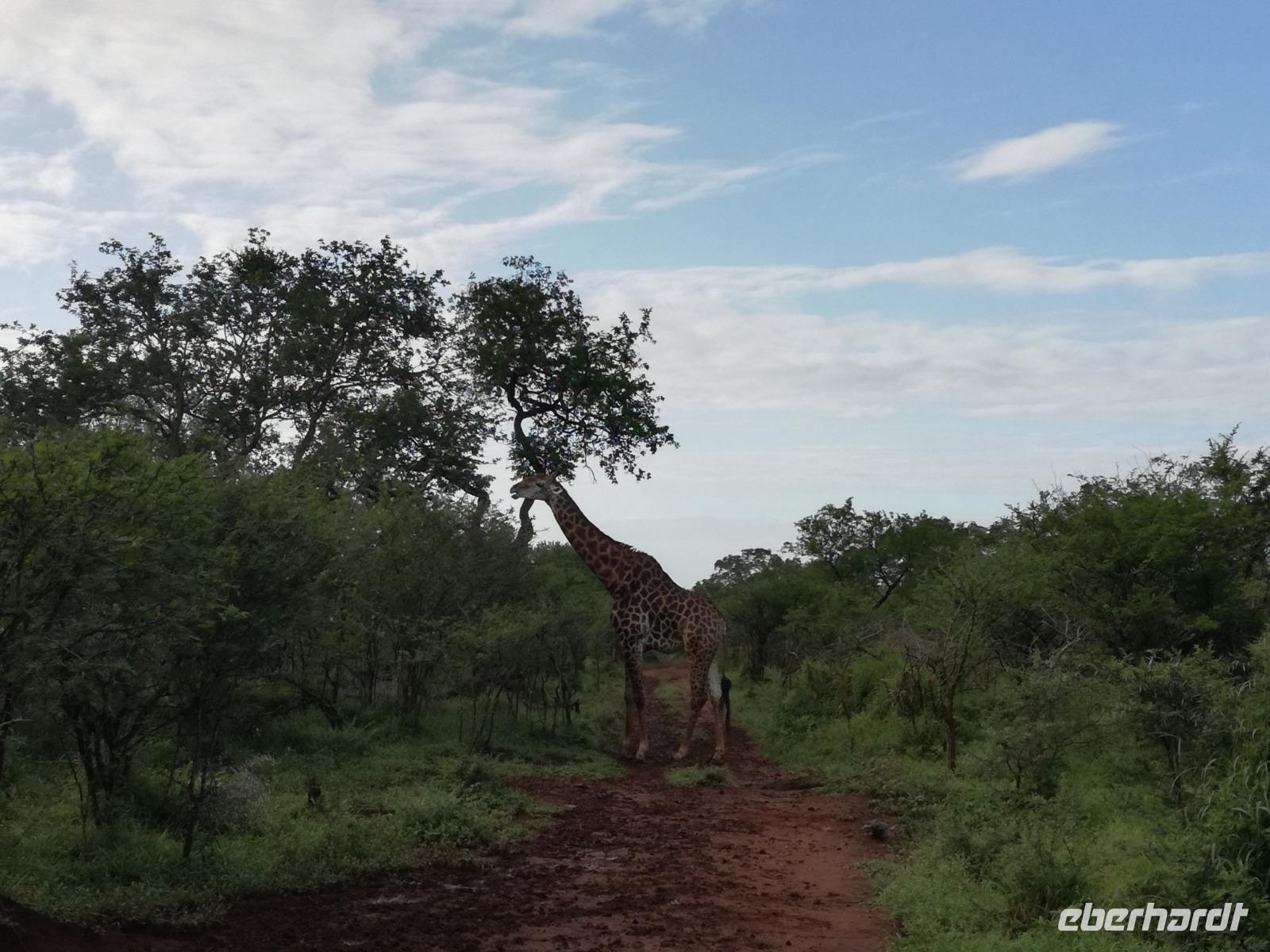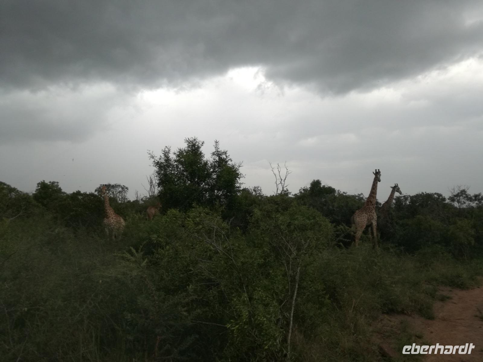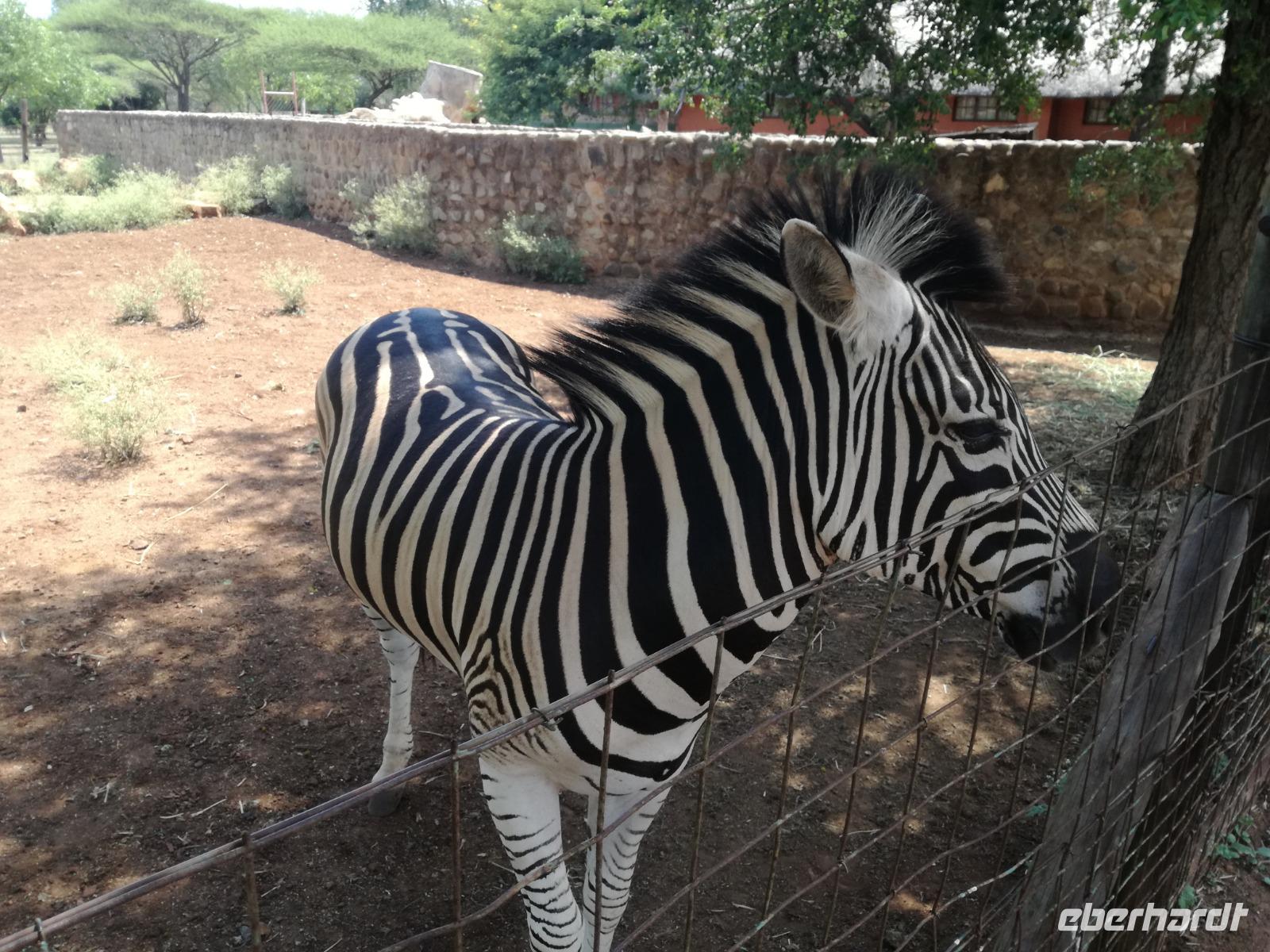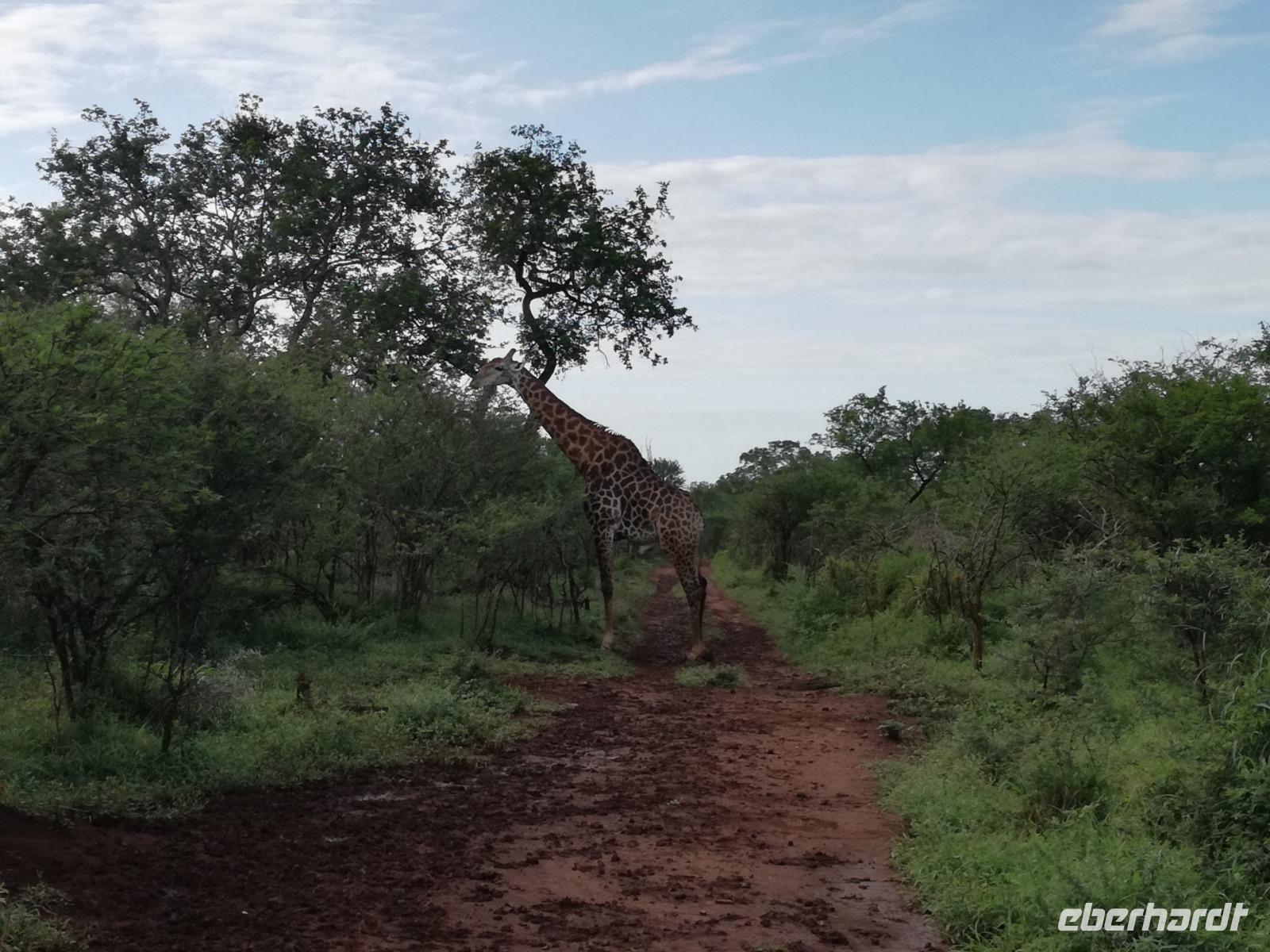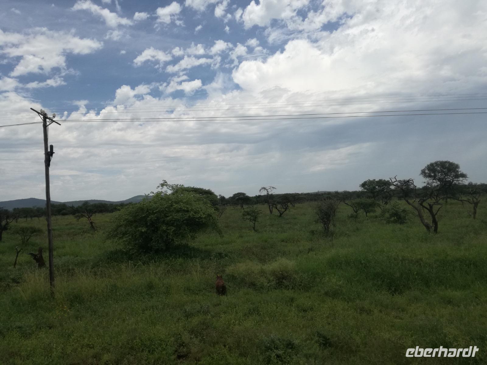 Heute Morgen starteten wir etwas früher in den Tag. Nach dem Frühstück brachen wir auf in Richtung Swaziland. Auf dem Weg erklärt uns Sonet einiges über Land und Leute und über das unabhängige Königreich Swaziland. Um die Mittagszeit überquerten wir die Grenzen von Südafrika nach Swaziland bzw. Königreich Eswatini wie es seit 2018 offiziell heißt. Das Königreich wird seit 1986 vom König MSwti III und er gilt als der letzte absolutitischer Monarch Afrikas. Insgesamt hat der 50 Jährige 19 Ehefrauen und ca. 30 Kindern. Aber wir waren ja nicht wegen dem König gekommen, sondern wir wollten den Mkhaya Game Reserve besuchen. Nach einer kleinen Wartezeit erreichten uns endlich die zwei Jeeps. Das Gepäck blieb beim Bus und wir reisten nur mit Handgepäck ins Stone Camp. Nach einem kurzen Einschreiben wollten wir unsere Pirschfahrt beginnen. Allerdings standen plötzlich zwei Breitmaulnashörner vor uns. Schnell zuckten wir unsere Kameras und hatten somit nach dem Büffel das zweite Mitglied der Big 5 gesehen. Während diese Nashornart im Nationalpark weit verbreitet ist, werden Spitzmaulnashörner eher selten gesehen, da sie sich hauptsächlich im Gebüsch verstecken. Wie der Name bereits verrät, unterscheiden sich die Arten hinsichtlich der Form ihres Mauls. Während das Breitmaulnashorn mit seinem breiten Maul das Gras am Boden frisst, rupft das Spitzmaulnashorn mit der Oberlippe die Blätter von den Ästen. Mit einer Vielzahl an Nashornfotos geht unsere Safari auch schon weiter. Die Gruppen fahren auf unterschiedlichen Routen durch das Reservat. Wir sehen Giraffen, Zebras, Nyalas, "Hippos" und verschiedene Vogelarten. Allerdings spielte uns plötzlich das Wetter einen Strich durch die Rechnung. Plötzlich begann es zu regnen und Gewittern. Schnell bekamen wir Ponchos und fuhren in Richtung Camp. Gegen 18.00 Uhr passieren wir die Einfahrt zum 2,5-Sterne-Stone Camp im Mkhaya Game Reserve. Zuerst werden uns die Unterkünfte gezeigt. Wir werden die Nacht im halboffenem Steinhäuschen mit halbhohen Steinmauern verbringen. Es gibt keinen Strom und das Handgepäck ist am besten in der Truhe zu verstauen, bevor neugierige Affen kommen und einzelne Dinge stibitzen. Das Bett ist von einem Mosquitonetz umgeben. Das Camp ist komplett mit Lichtern und Kerzen beleuchtet. Mit Schirmen gingen wir zunächst in unsere Steinhütten. Zum Abendessen wurde der Regen etwas weniger und wir wurden mit einem tollen Abendessen verwöhnt. Dazu gab es leckeren Wein, Bier und natürlich unser Lieblingsgetränk der Reise - Amarula Wodka. Nach dem Essen ging es in die Hütten und wir verbrachten eine aufregende Nacht in den offenen Steinhäusern.