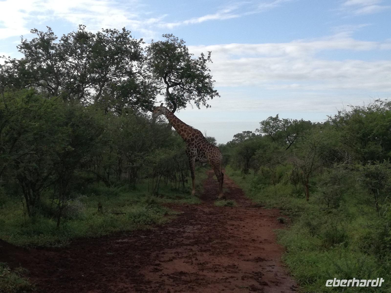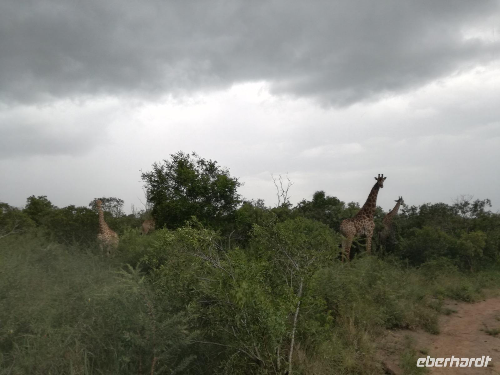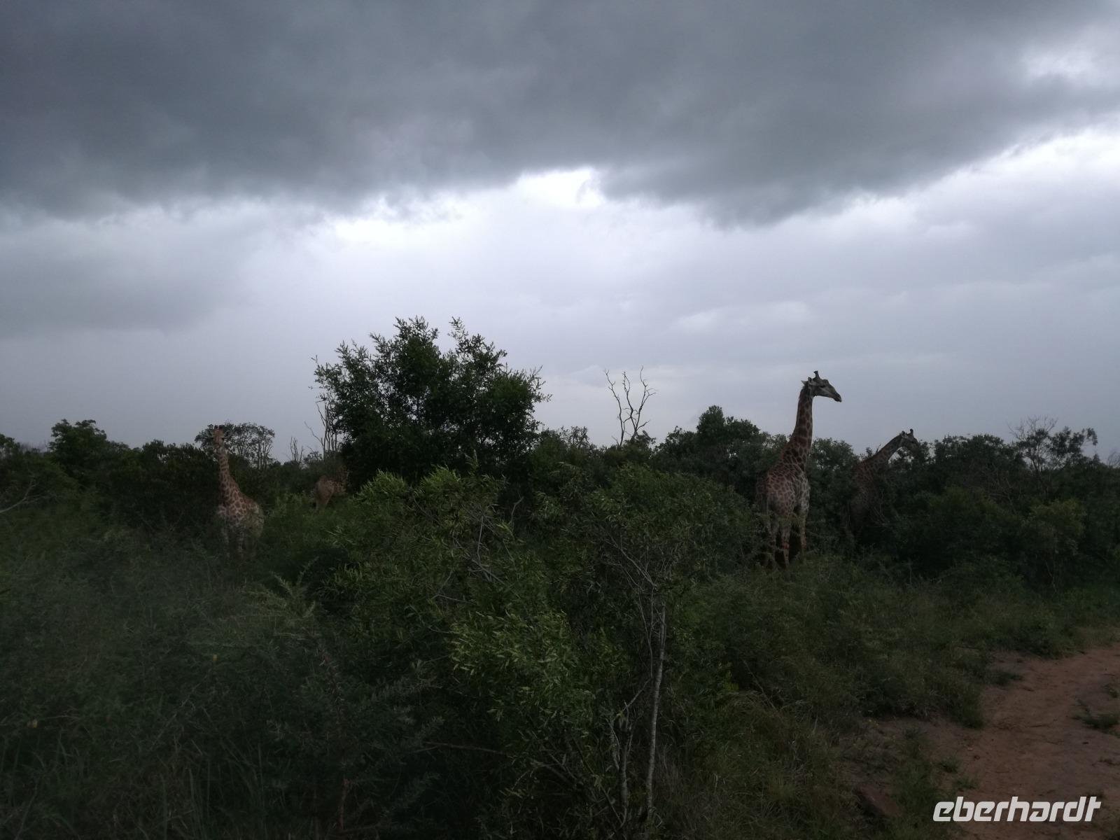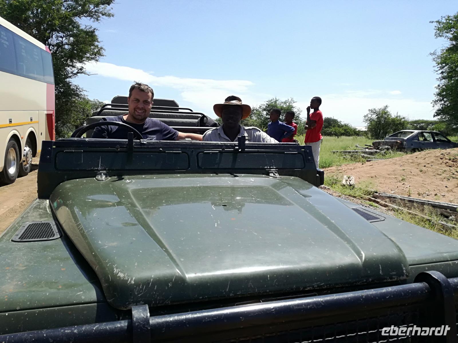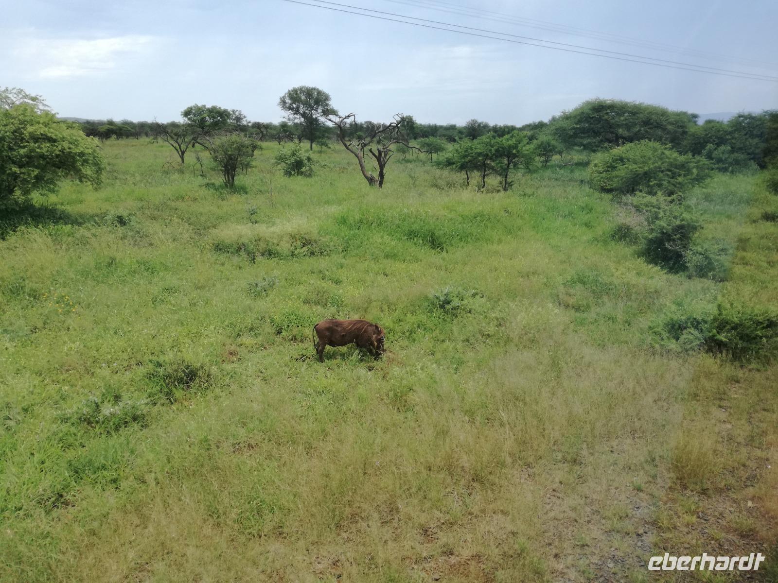 Heute Morgen starteten wir etwas früher in den Tag. Nach dem Frühstück brachen wir auf in Richtung Swaziland. Auf dem Weg erklärt uns Sonet einiges über Land und Leute und über das unabhängige Königreich Swaziland. Um die Mittagszeit überquerten wir die Grenzen von Südafrika nach Swaziland bzw. Königreich Eswatini wie es seit 2018 offiziell heißt. Das Königreich wird seit 1986 vom König MSwti III und er gilt als der letzte absolutitischer Monarch Afrikas. Insgesamt hat der 50 Jährige 19 Ehefrauen und ca. 30 Kindern. Aber wir waren ja nicht wegen dem König gekommen, sondern wir wollten den Mkhaya Game Reserve besuchen. Nach einer kleinen Wartezeit erreichten uns endlich die zwei Jeeps. Das Gepäck blieb beim Bus und wir reisten nur mit Handgepäck ins Stone Camp. Nach einem kurzen Einschreiben wollten wir unsere Pirschfahrt beginnen. Allerdings standen plötzlich zwei Breitmaulnashörner vor uns. Schnell zuckten wir unsere Kameras und hatten somit nach dem Büffel das zweite Mitglied der Big 5 gesehen. Während diese Nashornart im Nationalpark weit verbreitet ist, werden Spitzmaulnashörner eher selten gesehen, da sie sich hauptsächlich im Gebüsch verstecken. Wie der Name bereits verrät, unterscheiden sich die Arten hinsichtlich der Form ihres Mauls. Während das Breitmaulnashorn mit seinem breiten Maul das Gras am Boden frisst, rupft das Spitzmaulnashorn mit der Oberlippe die Blätter von den Ästen. Mit einer Vielzahl an Nashornfotos geht unsere Safari auch schon weiter. Die Gruppen fahren auf unterschiedlichen Routen durch das Reservat. Wir sehen Giraffen, Zebras, Nyalas, "Hippos" und verschiedene Vogelarten. Allerdings spielte uns plötzlich das Wetter einen Strich durch die Rechnung. Plötzlich begann es zu regnen und Gewittern. Schnell bekamen wir Ponchos und fuhren in Richtung Camp. Gegen 18.00 Uhr passieren wir die Einfahrt zum 2,5-Sterne-Stone Camp im Mkhaya Game Reserve. Zuerst werden uns die Unterkünfte gezeigt. Wir werden die Nacht im halboffenem Steinhäuschen mit halbhohen Steinmauern verbringen. Es gibt keinen Strom und das Handgepäck ist am besten in der Truhe zu verstauen, bevor neugierige Affen kommen und einzelne Dinge stibitzen. Das Bett ist von einem Mosquitonetz umgeben. Das Camp ist komplett mit Lichtern und Kerzen beleuchtet. Mit Schirmen gingen wir zunächst in unsere Steinhütten. Zum Abendessen wurde der Regen etwas weniger und wir wurden mit einem tollen Abendessen verwöhnt. Dazu gab es leckeren Wein, Bier und natürlich unser Lieblingsgetränk der Reise - Amarula Wodka. Nach dem Essen ging es in die Hütten und wir verbrachten eine aufregende Nacht in den offenen Steinhäusern.