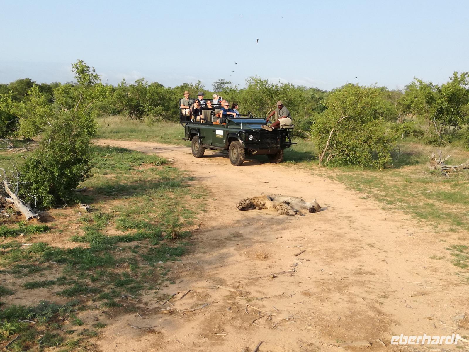 Die befürchtete schlaflose Nacht in dem halboffenen Steinhaus blieb aus und war mit absoluter Sicherheit für viele der Reisegäste ein einmaliges besonderes Erlebnis! Am frühen Morgen werden wir persönlich von einer Mitarbeiterin des Stone Camps um 05.30 Uhr geweckt. Zum Wachwerde erhalten wir ein kleines Frühstück mit einem Kaffee und leckere Kekse. Pünktlich um 06.00 Uhr startet unsere morgendliche rund zweistündige Pirschfahrt im Mkhaya Game Reserve. Wir sehen unter anderem Gnus, Giraffen, Nashörner und weitere verschiedene Vogelarten. Gegen 08.00 Uhr genießen wir ein leckeres Frühstück im Stone Camp. Beim Kaffee berichten wir von unserer nächtlichen Erfahrungen im Stone Camp und welche Tiere wir während der Safari gesehen haben. Rund eine Stunde später verstauen wir unsere Sachen und fahren zum gestrigen Treffpunkt, wo wir in unseren Bus umsteigen. Auf dem Weg zur Grenzstation im Swaziland und in Südafrika fahren wir durch Manzini und an der legislativen Hauptstadt Lohamba vorbei. Wir besuchen auch einen kleinen Markt für Kunsthandwerk und Souvenirs in Ezulwine. Unsere Fahrt führt uns weiter an der Hauptstadt Mbabane vom Swaziland vorbei durch Pigg's Peak. Um die Mittagszeit machten wir unsere Mittagspause in einem Restaurant bei einer Glasfabrik. Neben dem Essen wurden wir auch in den Geschäften fündig und bestaunten die tollen Glasprodukte. Nach dem Essen ging es weiter in Richtung Grenze, wo wir in Matsomo aus Swaziland ausreisten und in Jeppe's Reef in Südafrika wieder einreisten. Die Fahrt geht weiter zum 3-Sterne-Hotel "Misty Mountain Lodge" am Long Tom Pass zwischen Sabie und Lydenburg in Südafrika, wo wir gegen 17.30 Uhr einchecken. Wir befinden uns in der Provinz Mpumalanga, welche als "Ort der aufgehenden Sonne" bekannt und vom Lowveld-Busch und den großartigen Landschaftsformen der Hochebene geprägt ist. Leider macht der Name der Lodge alle Ehre, da wir leider mitten im Nebel ankamen. Das Abendessen hingegen war sehr lecker und wir gingen zeitig müde ins Bett.