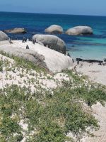 Weiter geht es mit dem Bus nach Simon's Town. Auf dem Weg treffen wir auf eine Gruppe Paviane am Straßenrand. In Simon's Town soll es Pinguine geben! Am Boulders Beach sehen wir sie tatsächlich. Die lustigen Brillenpinguine haben sich an einem Strandabschnitt des Nationalparks angesiedelt, der auf Stegen zu erreichen ist. Da auch ihnen sehr warm ist, recken sie am Strand die Hälse in den Himmel, um nach Luft zu schnappen. Nach diesem Erlebnis fahren wir zum Mittagessen im Hafen von Simon's Town.