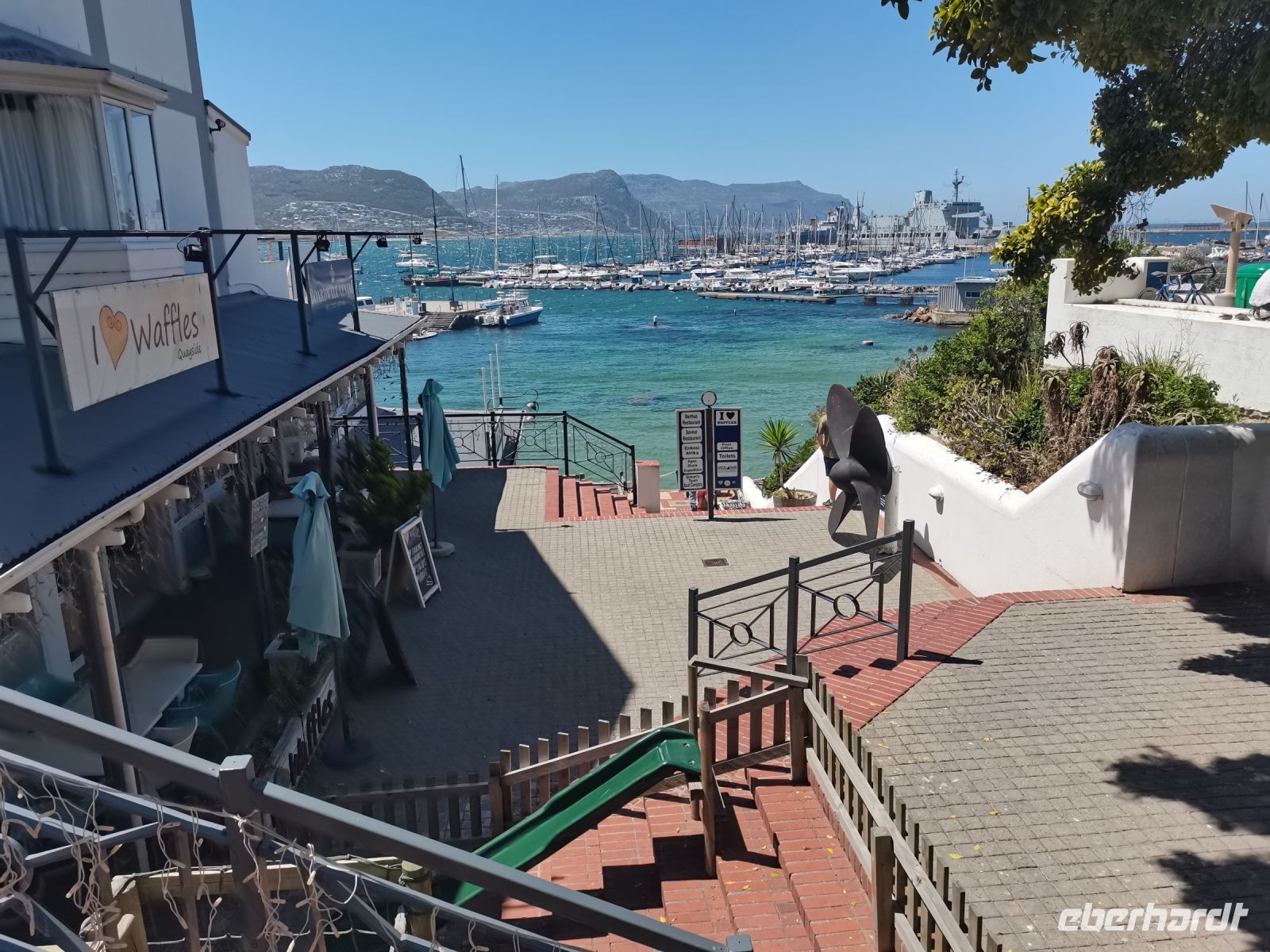 Nach rund 120 Kilometern Fahrt erreichen wir den Küstenort Hermanus, Südafrikas Wal-Hauptstadt. Wir kriegen die Wale nicht zu Gesicht, da die Saison im November vorbei ist. Im Hotel werden wir mit Sekt und Cup-Cakes empfangen. Wir checken ein und beziehen die Zimmer. Wer möchte, kann noch am Strand spazieren gehen oder den Pool genießen. Am frühen Abend spazieren wir zum Neuen Hafen, wo ein Willkommens-Dinner mit Meerblick auf uns wartet. Schon jetzt haben wir den deutschen Winter fast vergessen und freuen uns über den lauen Sommerabend am Atlantik. Endlich ist es abends wieder länger hell!