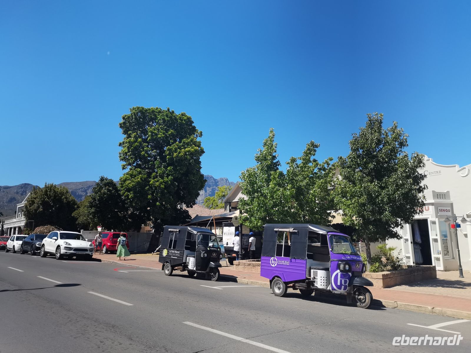 Nach einem guten Frühstück auf der Terrasse begeben wir uns am Neujahrstag auf unseren Tagesausflug nach Franschhoek. Die Sonne lacht, und der Himmel ist wieder strahlend blau. In Franschhoek wurden die Hugenotten von der Holländischen Ostindischen Handelsgesellschaft angesiedelt, erfahren wir von unserem Reiseleiter Thomas. Sie mussten Frankreich wegen ihres Glaubens verlassen. Franschhoek ist heute bekannt als DIE Gourmet-Metropole am Westkap. Kurz vor den Franzosen hatte der Niederländer Simon van der Stel eine Farm aufgebaut. Die Franzosen passten sich an die Niederländer an und schnell wurde die Hauptsprache Afrikaans, auch wenn der französische Einfluss noch zu spüren ist. In Franschhoek angekommen haben wir Zeit, den Kunsthandwerkermarkt zu besuchen. Wir machen einen kleinen Spaziergang durch den Ort. Die Tuk-Tuks stehen mit ihren Fahrern schon bereit, um uns zu den umliegenden Weingütern zu bringen. Mit drei bunten Fahrzeugen machen wir uns auf den Weg. Zunächst fahren wir zur Verkostung in das Weingut Mont Rochelle. Anschließend besuchen wir Grande Provence, ein herrliches Anwesen, das Kunst und Wein verbindet. Im Garten bewundern wir beeindruckende Skulpturen, bevor wir uns zur Verkostung niederlassen. Das Mittagessen wird in einem Picknick-Korb serviert. Wir genießen die Zeit im herrlichen Garten und schauen uns noch kurz die Ausstellung an, bevor wir weiterfahren zu Leopard's Leap. Wir lernen die Family Collection des Hauses kennen und erhalten einen guten Überblick über die Qualität der südafrikanischen Weine.