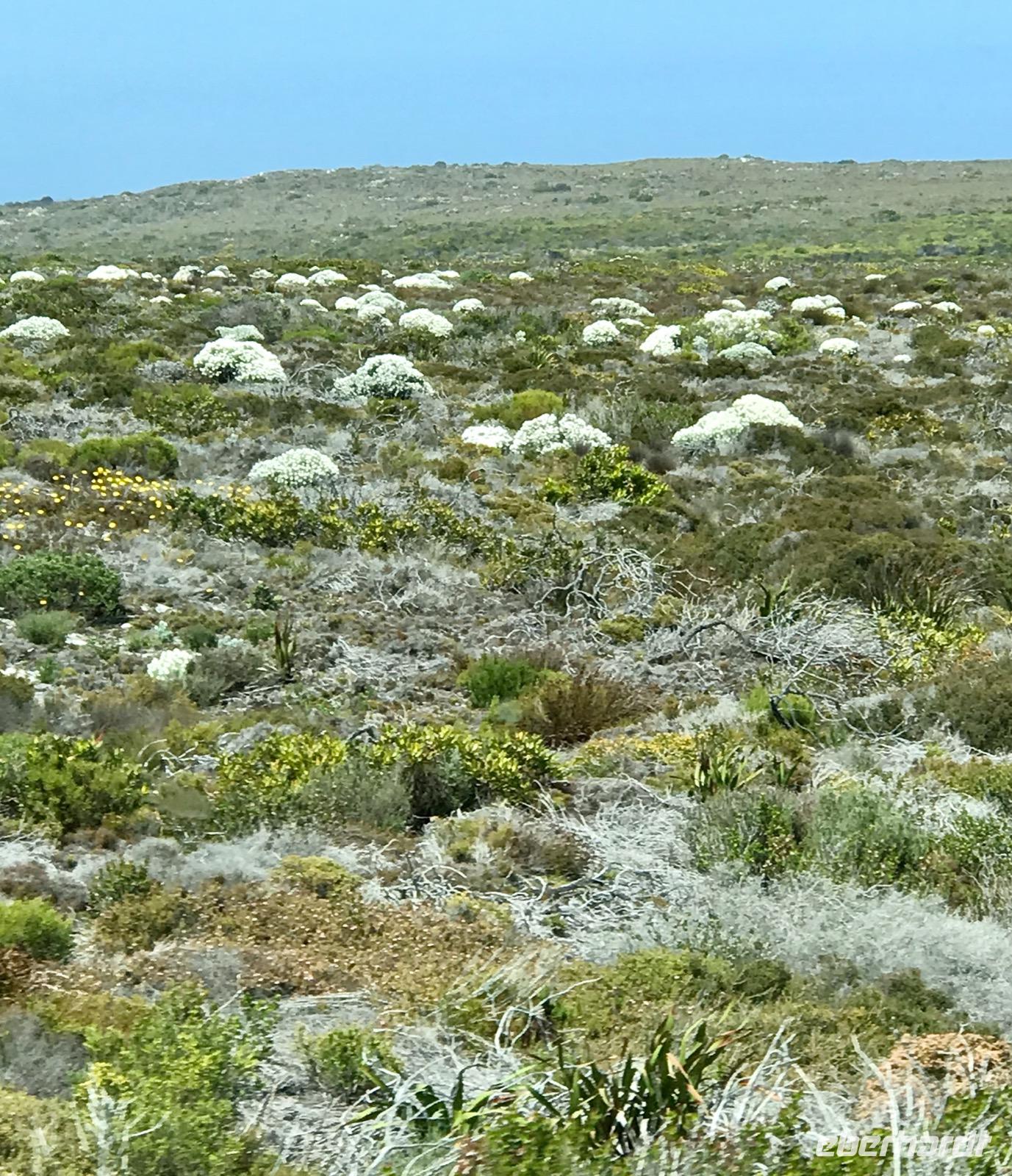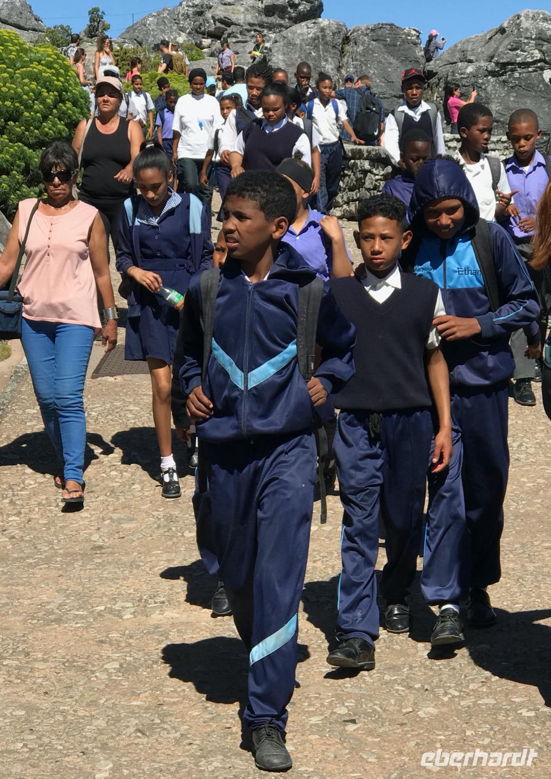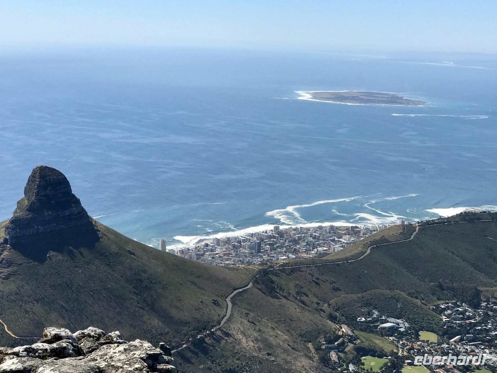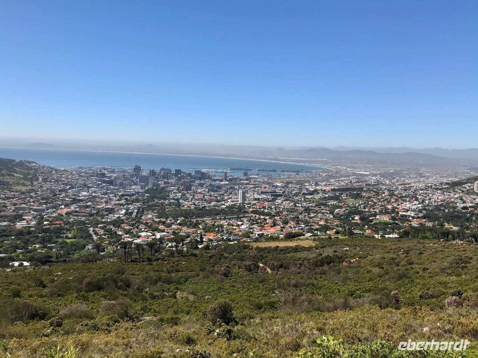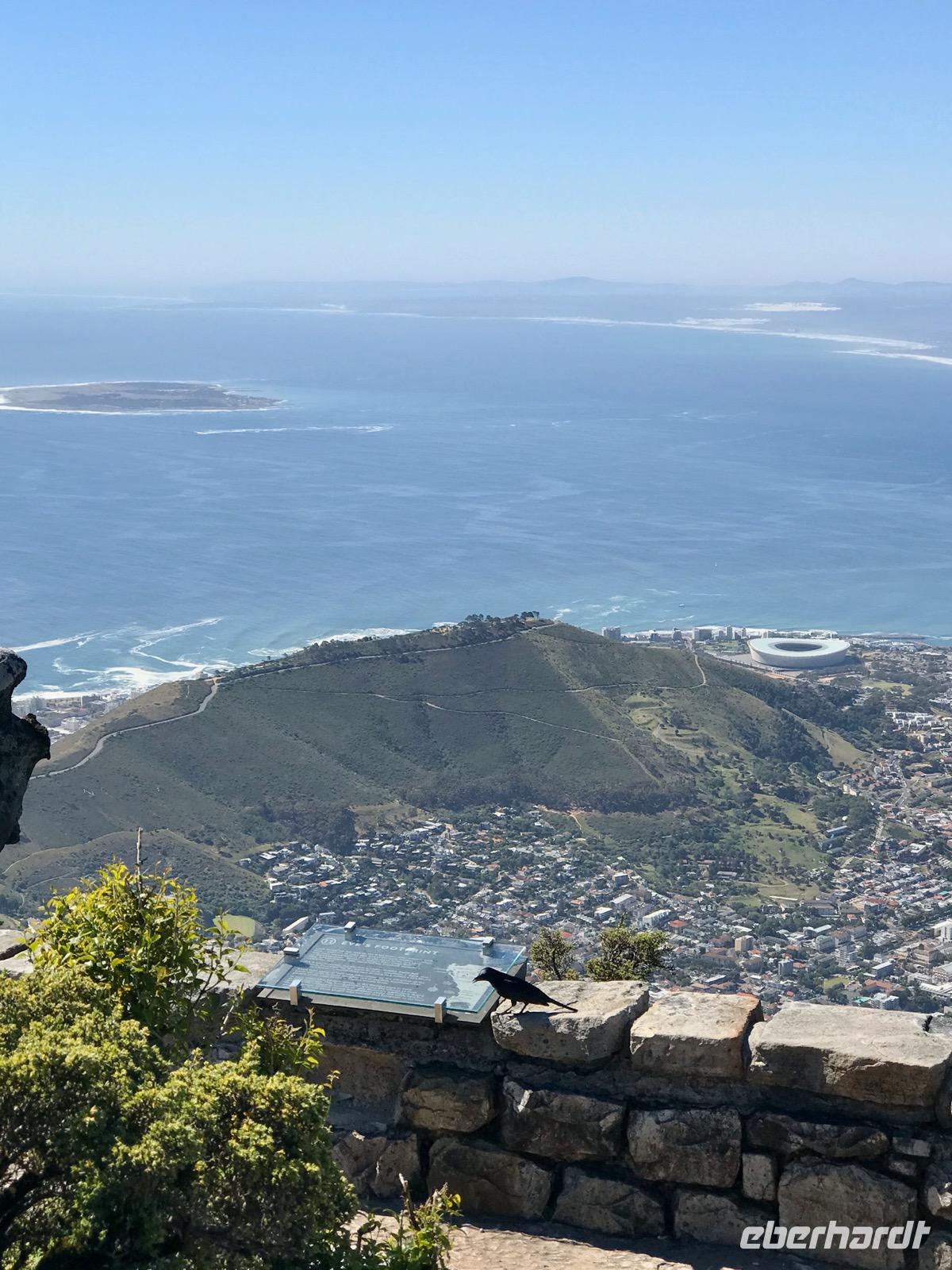 Gerade um die Mittagszeit sind wir an unserem Ziel angekommen, wo uns die örtliche, deutschsprechende Reiseleiterin Marion herzlichst begrüßt. Unser Busfahrer für die nächsten Tage ist Keath, er hilft uns, wo er kann. Wir haben keine Pause, wollen wir doch den fremden Kontinent erkunden. Nach einer kleinen überblicksmäßigen Stadtrundfahrt, vorbei am Castle of Hope, geht es hinauf auf den Tafelberg, der über dem Stadtzentrum von Kapstadt thront. Wir nehmen die Seilbahn. Es ist sehr heiß und wir müssen uns erst an den Sommer gewöhnen, kommen wir doch aus dem Herbst. Es ist ein wunderschöner sonniger und wolkenloser Tag und auf dem Gipfel des Berges hat man nach allen Seiten eine grandiose Sicht auf die Stadt, den Ozean und die Buchten. Das Tischtuch des Tafelberges ist nicht aufgezogen. Wir erfreuen uns auf den ausgeschilderten Wegen an der einzigartigen Flora im Naturschutzgebiet Tafelberg. Dann geht es wieder hinab. Allerdings stehen wir ohne Schatten gefühlte 30 Minuten an, um die Seilbahn nehmen zu können.