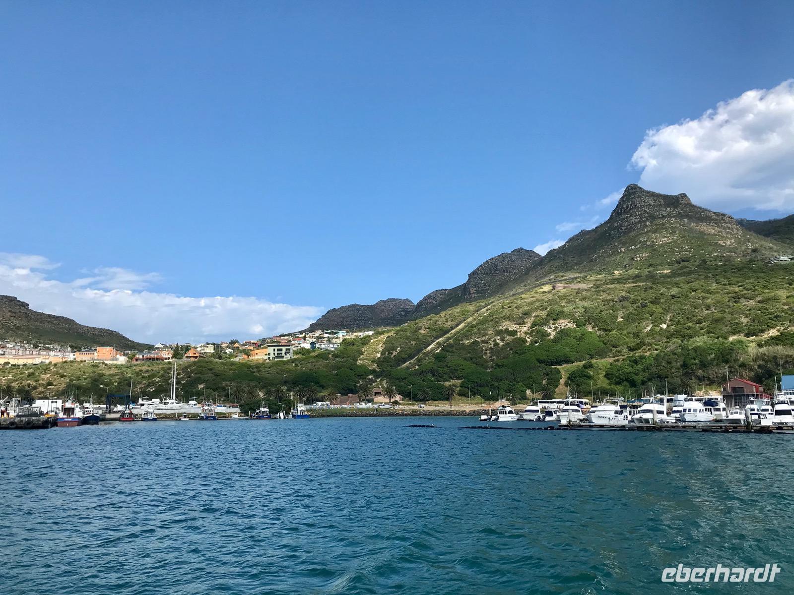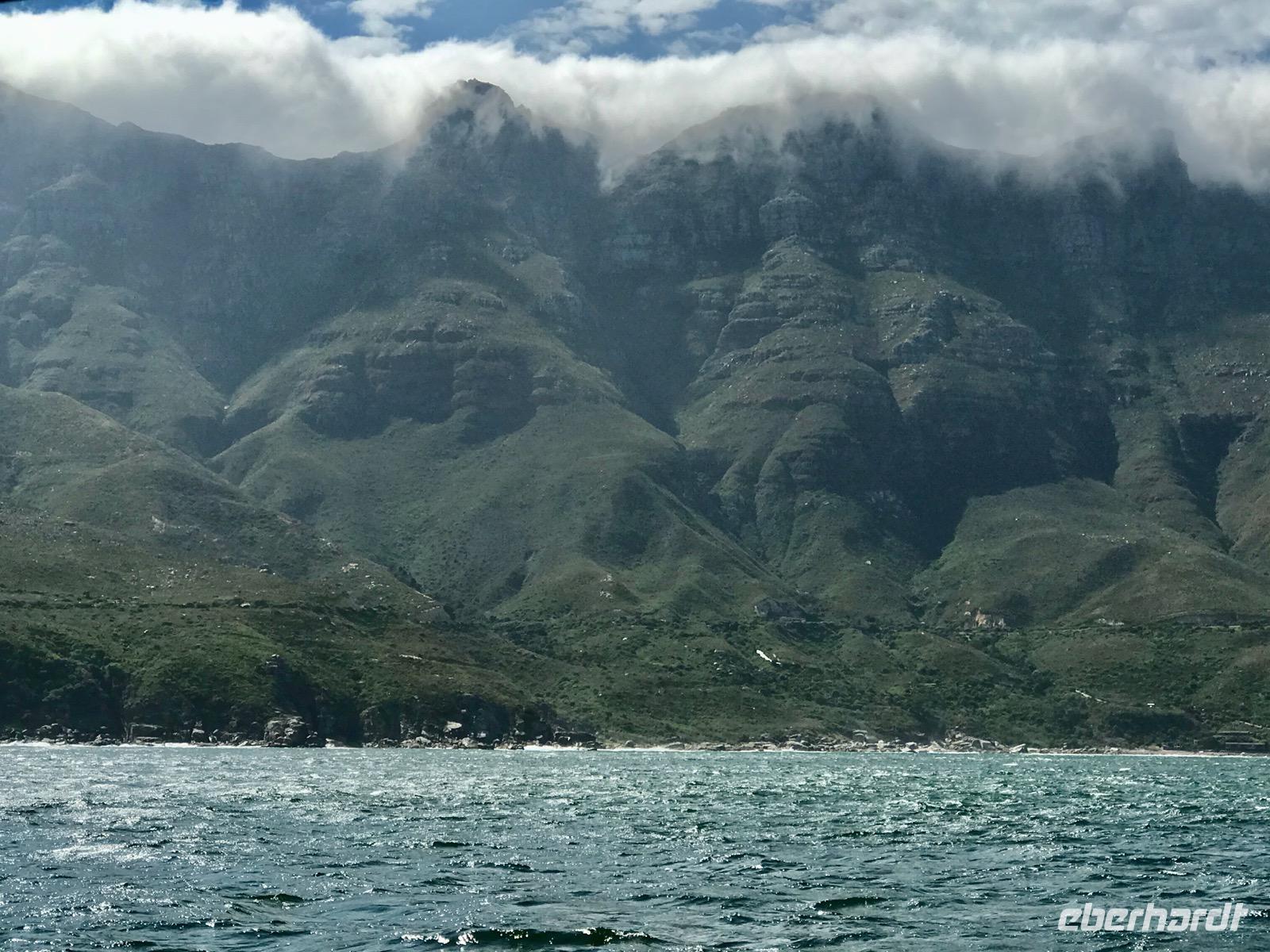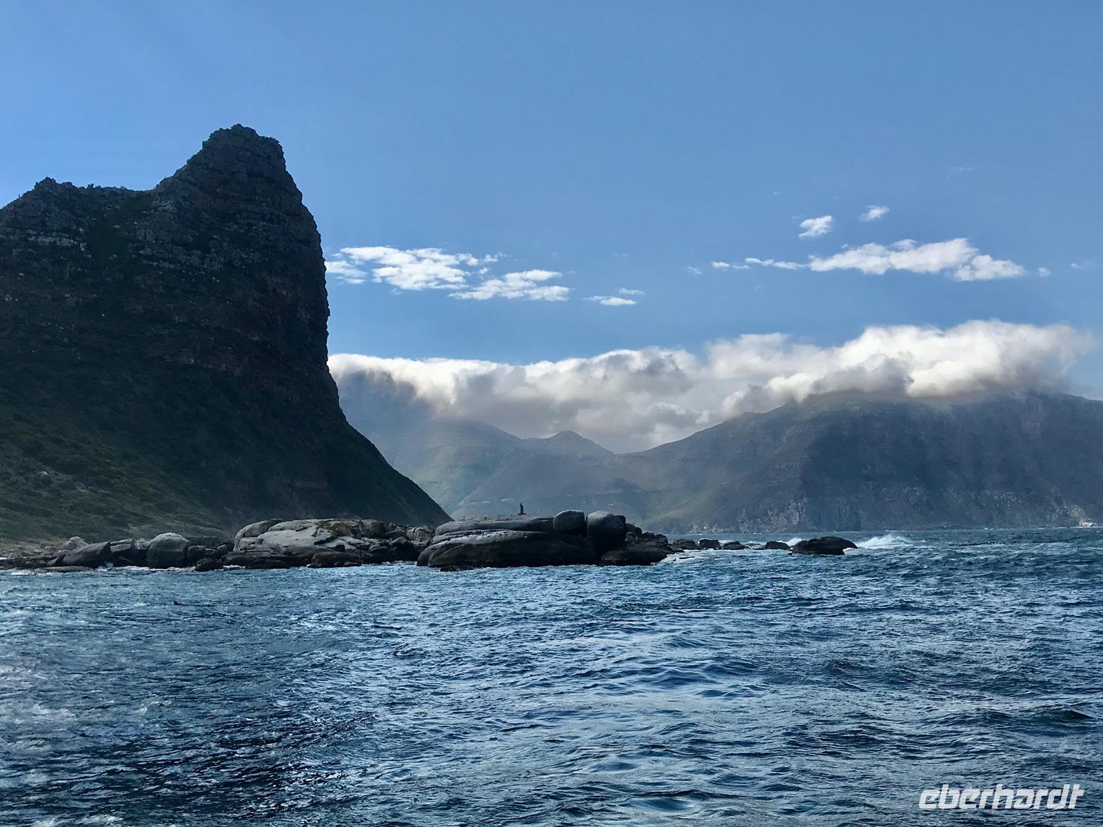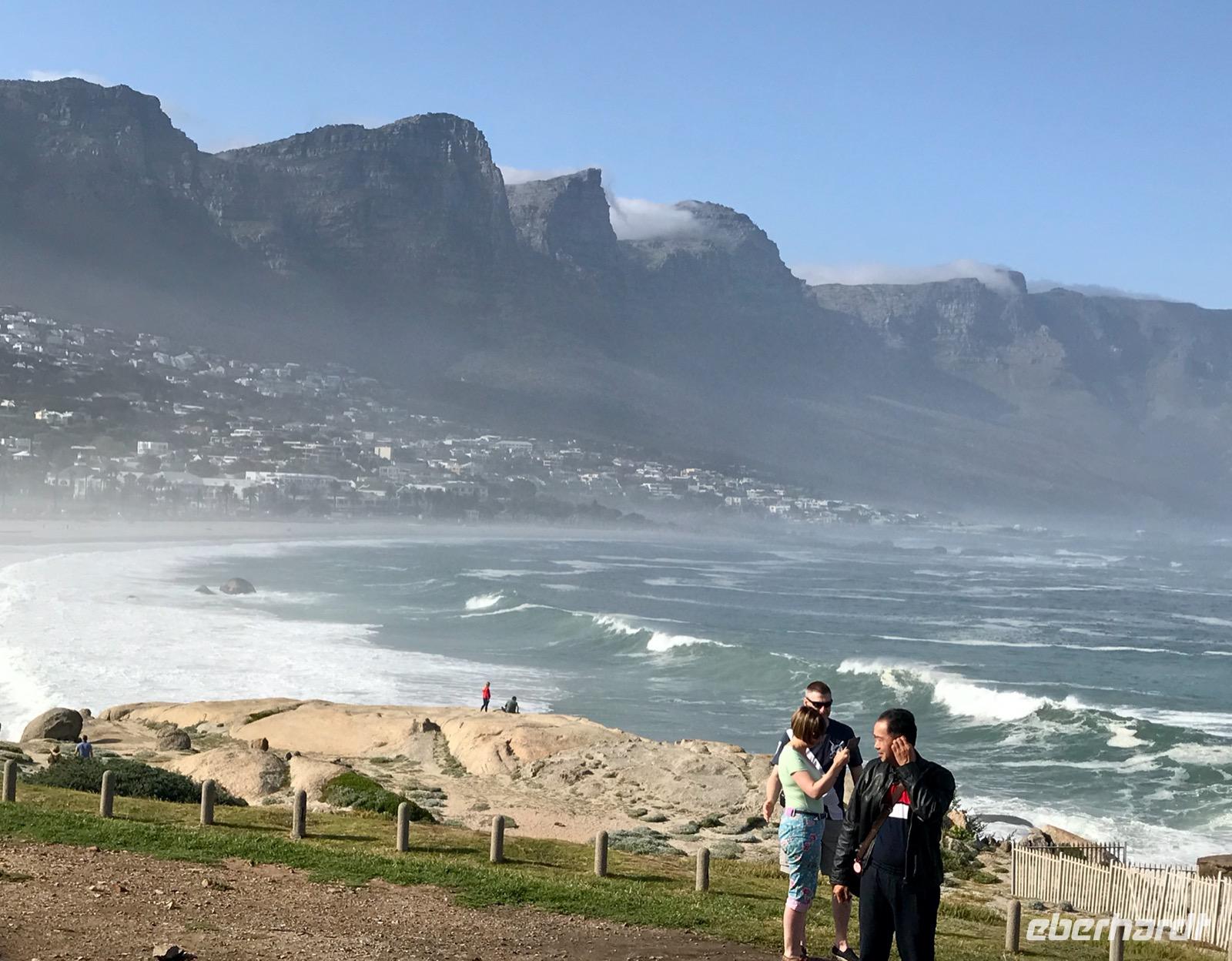 Heute liegt ein Tagesausflug zum Kap der Guten Hoffnung vor uns. Wir fahren entlang der Atlantikküste über Clifton, vorbei an den Villen und Apartment-Hochhäusern der Schönen und Reichen, Camps Bay und Llandudno bis nach Hout Bay, dem Zentrum der Fischindustrie in Kapstadt. Von hier aus nehmen wir an einem Bootsausflug nach Duiker-Island teil, um die Kolonie der Fellrobben zu besuchen. Es ist eine recht stürmische Fahrt über das Wasser. Der Blick zurück auf die von Bergen eingerahmte Bucht ist ergreifend. Im Osten liegt das Chapman's-Peak-Massiv, an dessen Hängen sich eine malerische Straße hinaufschlängelt, der Chapman's Peak-Drive, auf dem wir unseren Weg fortsetzen. Diese Panoramastraße gehört zu den Traumstraßen der Welt, gehauen in Klippen, mit Rastplätzen und prächtiger Aussicht.