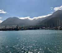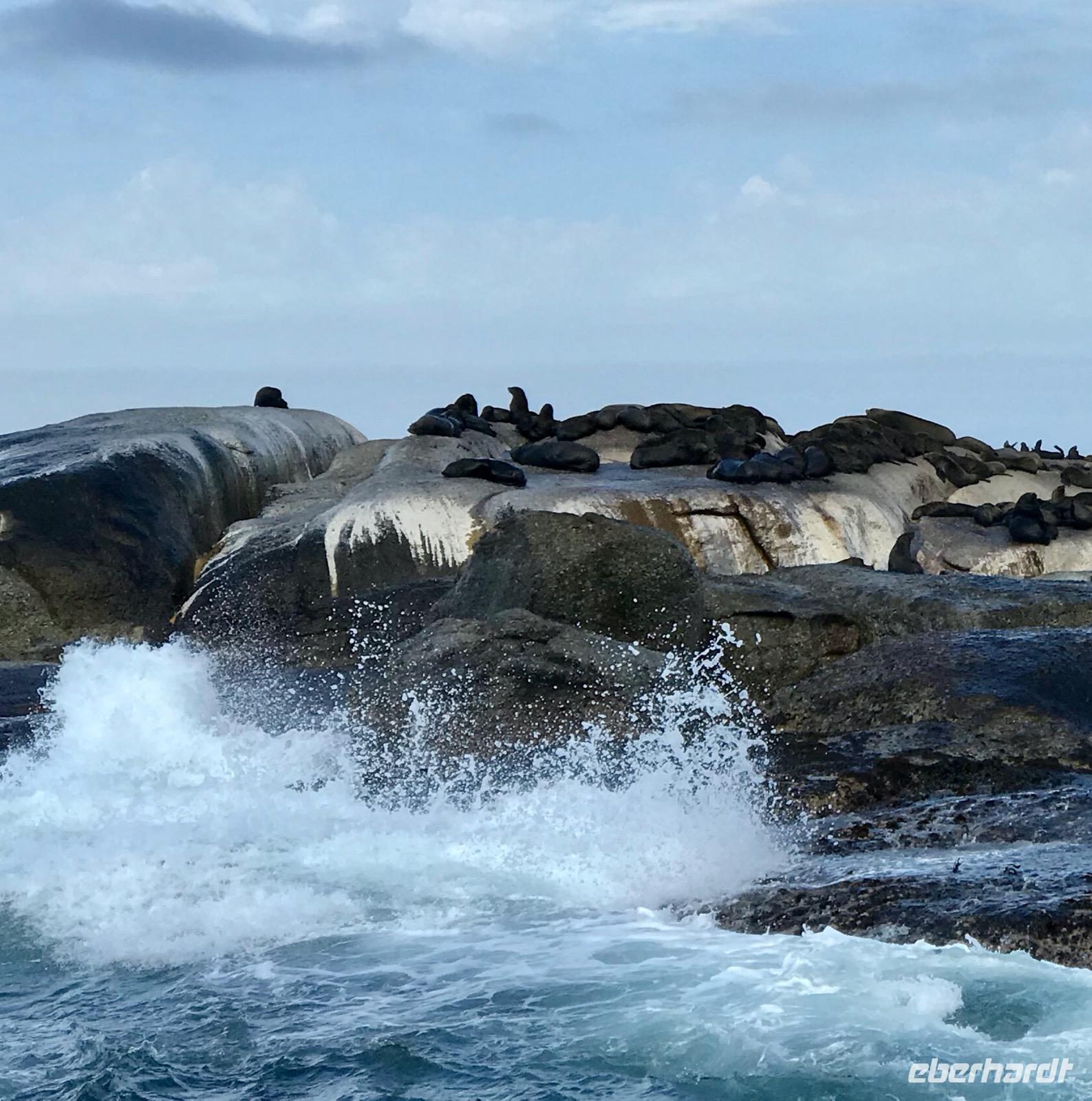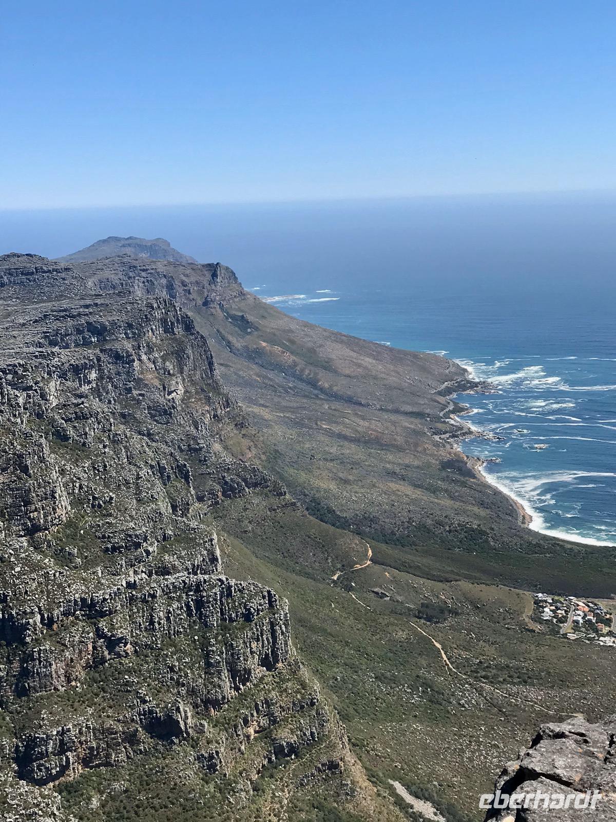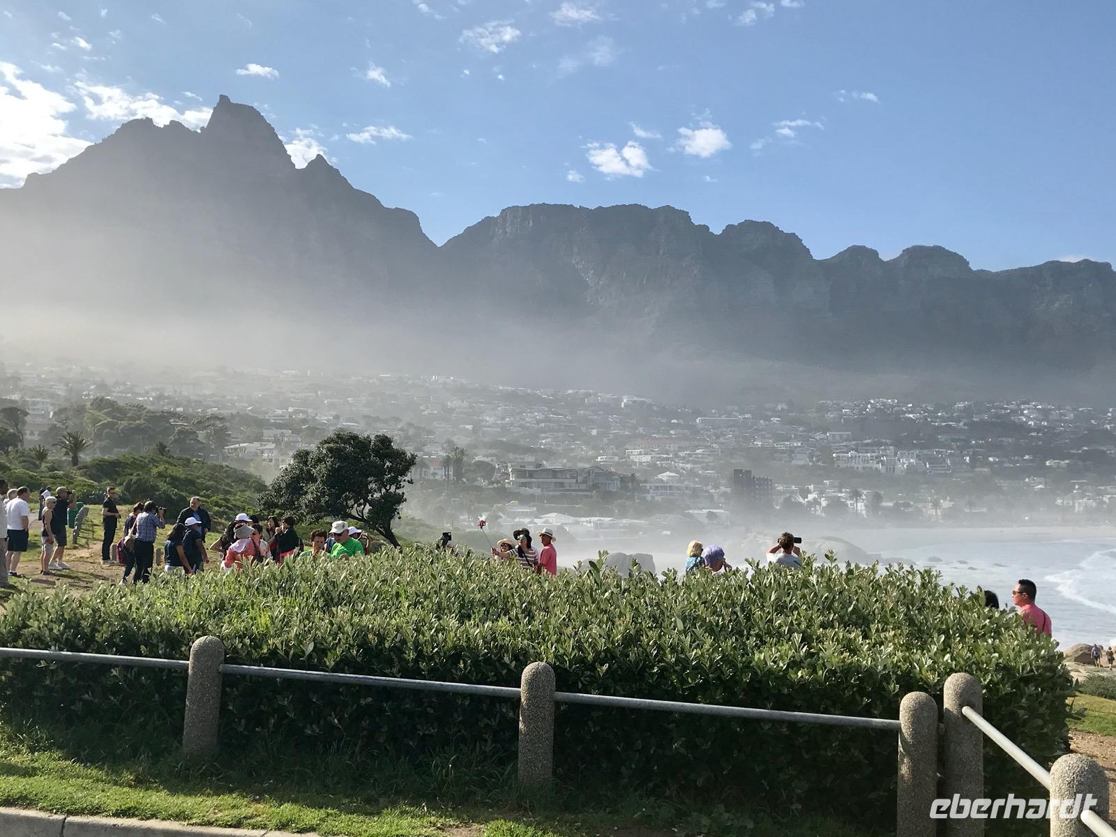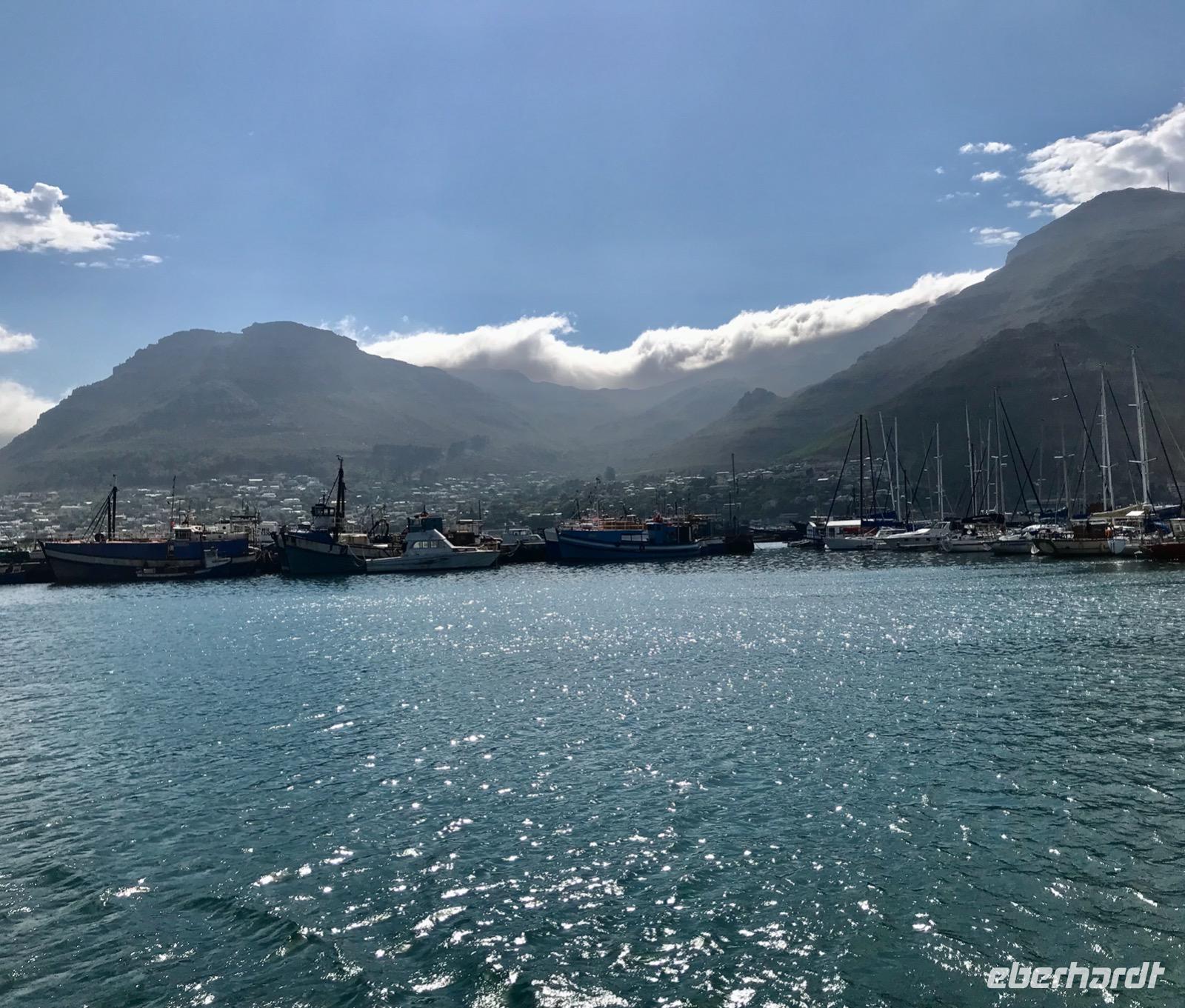Heute liegt ein Tagesausflug zum Kap der Guten Hoffnung vor uns. Wir fahren entlang der Atlantikküste über Clifton, vorbei an den Villen und Apartment-Hochhäusern der Schönen und Reichen, Camps Bay und Llandudno bis nach Hout Bay, dem Zentrum der Fischindustrie in Kapstadt. Von hier aus nehmen wir an einem Bootsausflug nach Duiker-Island teil, um die Kolonie der Fellrobben zu besuchen. Es ist eine recht stürmische Fahrt über das Wasser. Der Blick zurück auf die von Bergen eingerahmte Bucht ist ergreifend. Im Osten liegt das Chapman's-Peak-Massiv, an dessen Hängen sich eine malerische Straße hinaufschlängelt, der Chapman's Peak-Drive, auf dem wir unseren Weg fortsetzen. Diese Panoramastraße gehört zu den Traumstraßen der Welt, gehauen in Klippen, mit Rastplätzen und prächtiger Aussicht.
