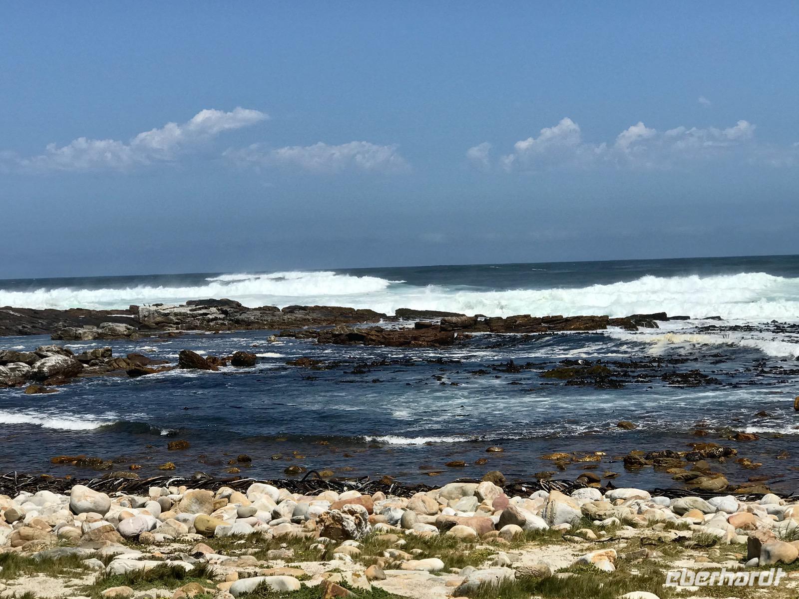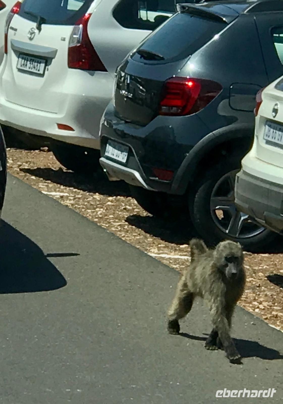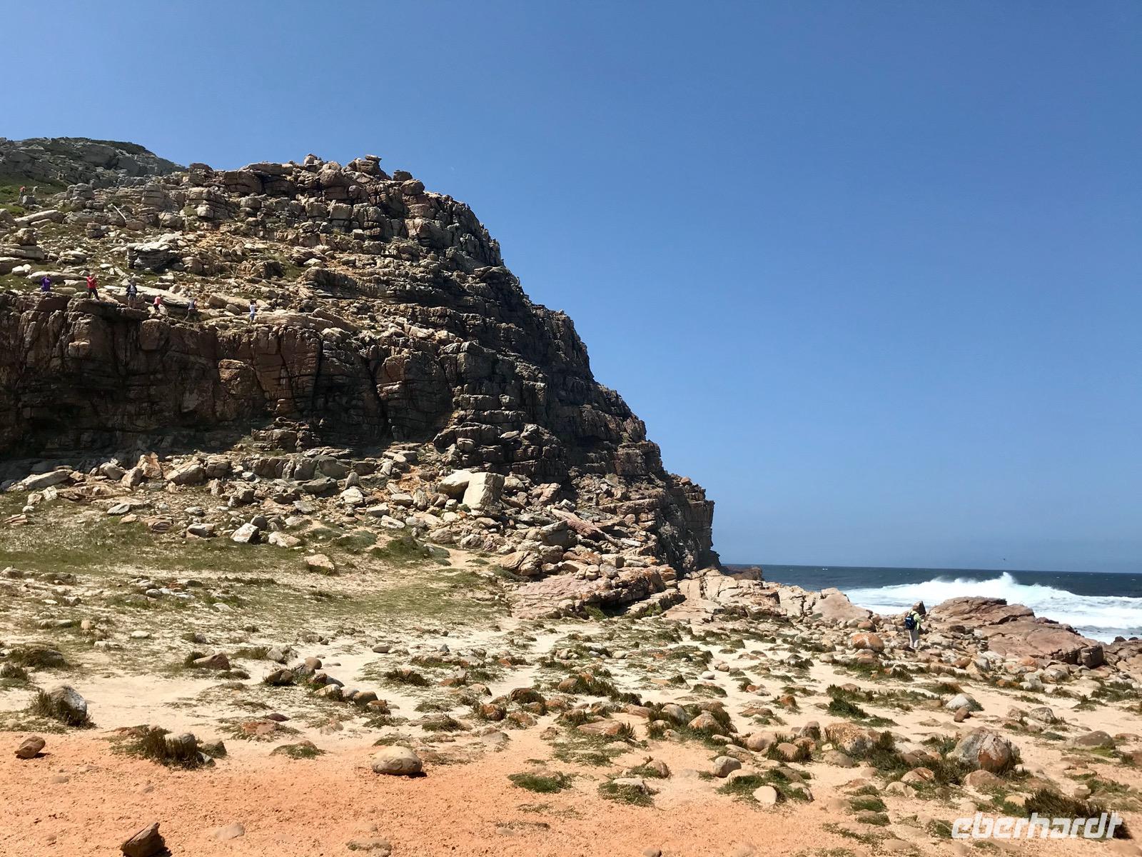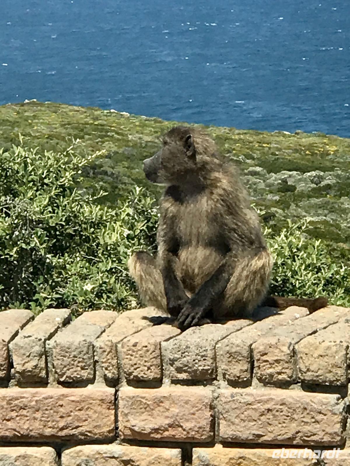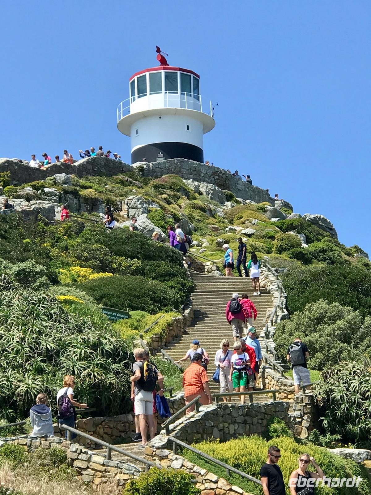 Höhepunkt der Fahrt ist das Panorama am Cape Point, dem Kap der Guten Hoffnung, wo die Kap-Halbinsel in das Meer ragt. Wir erreichen das Naturreservat am Kap der Guten Hoffnung, durch das sich ein Netz von Straßen zieht. Die Vegetation besteht aus den verschiedensten Fynbos-Pflanzen. Zunächst nehmen wir die Zahnradbahn, den Flying Dutchman, zum alten Leuchtturm. An der Talstation werden wir von den Bärenpavianen begrüßt, die stets auf der Suche nach belegten Baguettes sind und diese den Gästen auch direkt aus der Hand reißen. Auf dem Gipfel angekommen, können wir auf das 300 Meter tiefer liegende Meer sehen. Dann geht es nochmals ca. 70 Stufen hinauf zum Leuchtturm Cape Point Lighthouse, der häufig in Nebelschwaden gehüllt und somit nicht zu sehen ist, weshalb 1911 auch der portugiesische Dampfer Lusitania direkt unter dem Leuchtturm Schiffbruch erlitt. Heute gibt es einen neuen Leuchtturm am Cape Point. Dann fahren wir hinüber zur Spitze der Halbinsel, wo es sehr stürmisch ist. Alle Gäste wollen ein Erinnerungsfoto an der Schautafel des Kaps der Guten Hoffnung, dem südwestlichsten Punktes Afrikas, mit nach Hause nehmen und so muss man sich dann auch anstellen, um einen guten Schnappschuss zu landen. Dabei erfahren wir, dass hier gar nicht der südlichste Punkt Afrikas liegt, sondern 300 km südlicher am Cape Agulhas. Da sieht man wieder einmal die Kraft der Mythen.