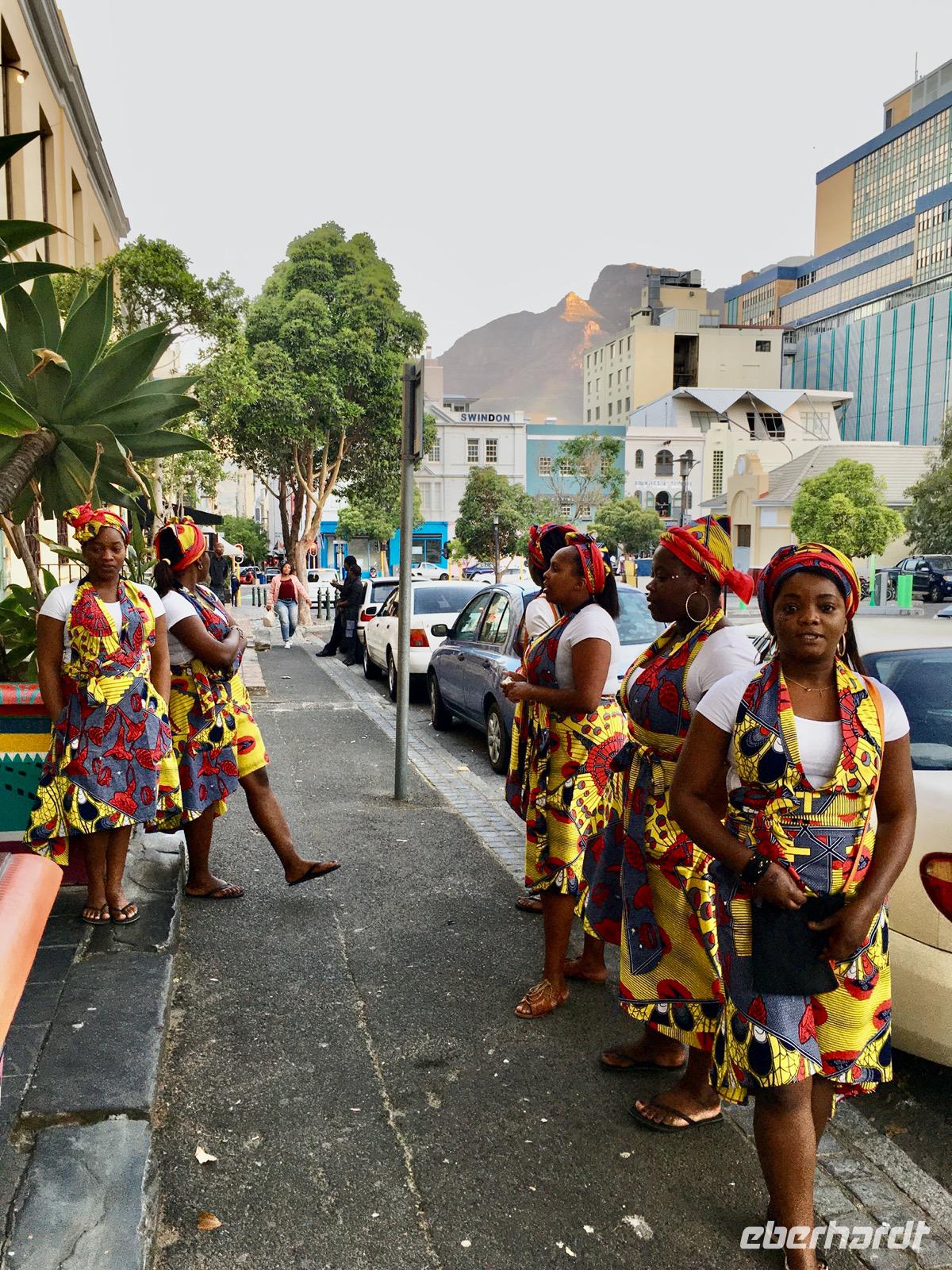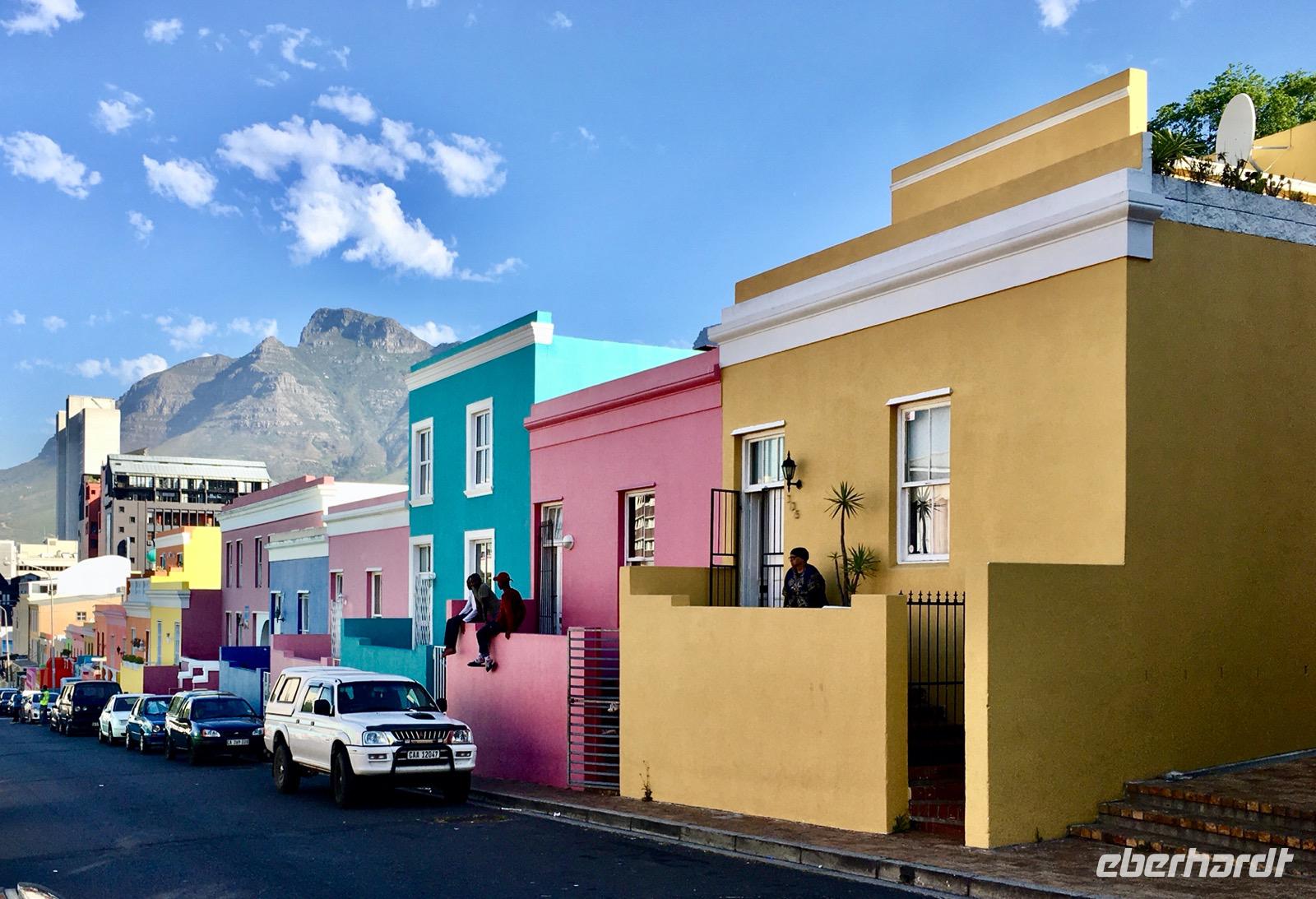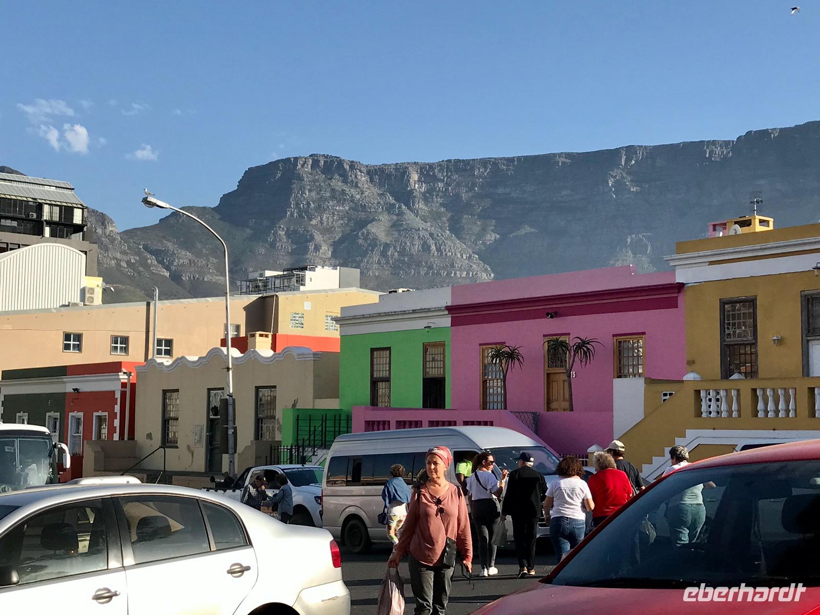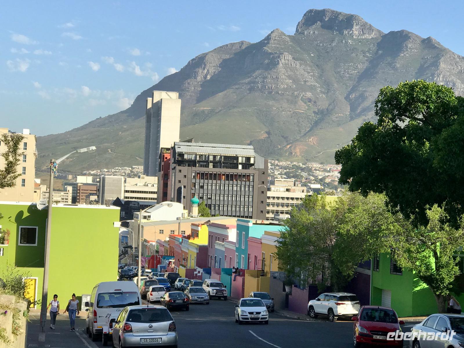 Unsere Rückfahrt führt über Fish Hoek, Kalk Bay und Muizenberg nach Kapstadt. In Kapstadt selbst machen wir noch einen kurzen Spaziergang durch das Bo Kaap-Viertel, die traditionelle Heimat der Kapmuslime mit seinen schmalen weißen und pastellfarbenen Häuserfronten. Hier gibt es einen Gewürzladen, dessen Duft uns einen Vorgeschmack auf das anstehende Abendessen liefert.