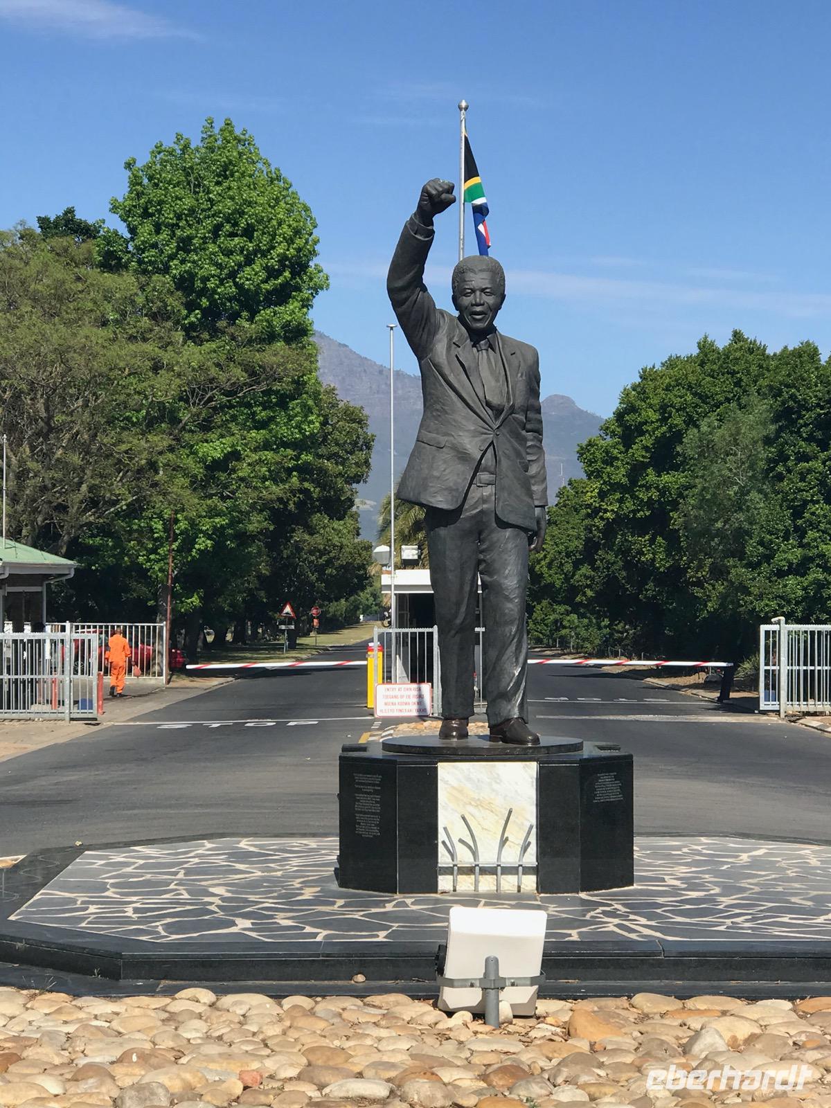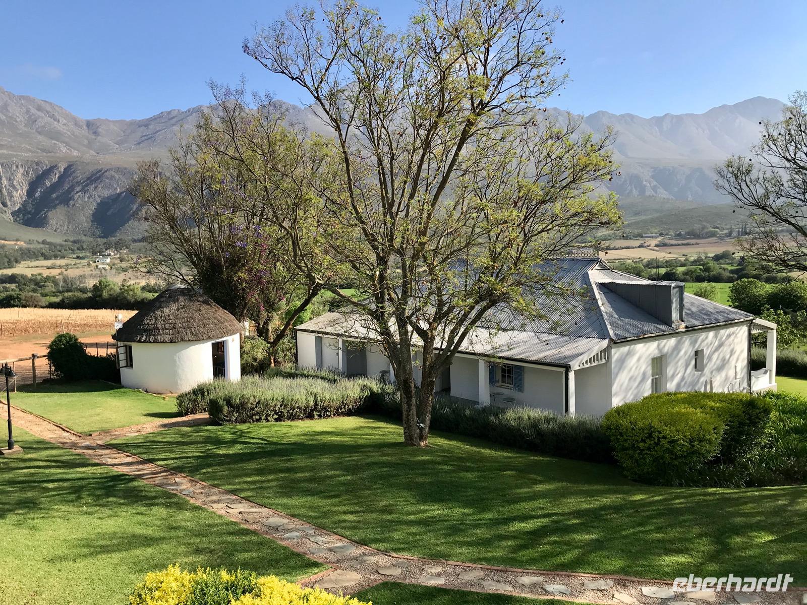 Wir fahren in die Kap-Weinregion. Von Kapstadt aus geht es zunächst nach Paarl. Es ist die Region, wo ab 1687 holländische Kolonisten Farmland erhielten. So bedeutet „Paarl" Perle, benannt nach den Paarl Mountains mit seinen drei abgerundeten Spitzen aus Granitstein, die in der Sonne wie Perlen glänzen. Der fruchtbare Boden und das mediterrane Klima eignen sich hervorragend für die landwirtschaftliche Nutzung. Die Siedler legten Obstplantagen und Gemüsegärten an und entwickelten vor allem den Weinanbau. Heute wird hier etwa ein Fünftel der südafrikanischen Weine produziert. Wir fahren durch den Ort und an manchen Stellen meint man, die Zeit sei angehalten worden, so freundlich begrüßen uns die weißen Häuser im kapholländischen Stil. Wir halten zunächst für einen Fotostopp in Groot Drakenstein. Hier befindet sich das Haus von Nelson Mandelas letztem Gefängnis im Drakenstein Correctional Center.