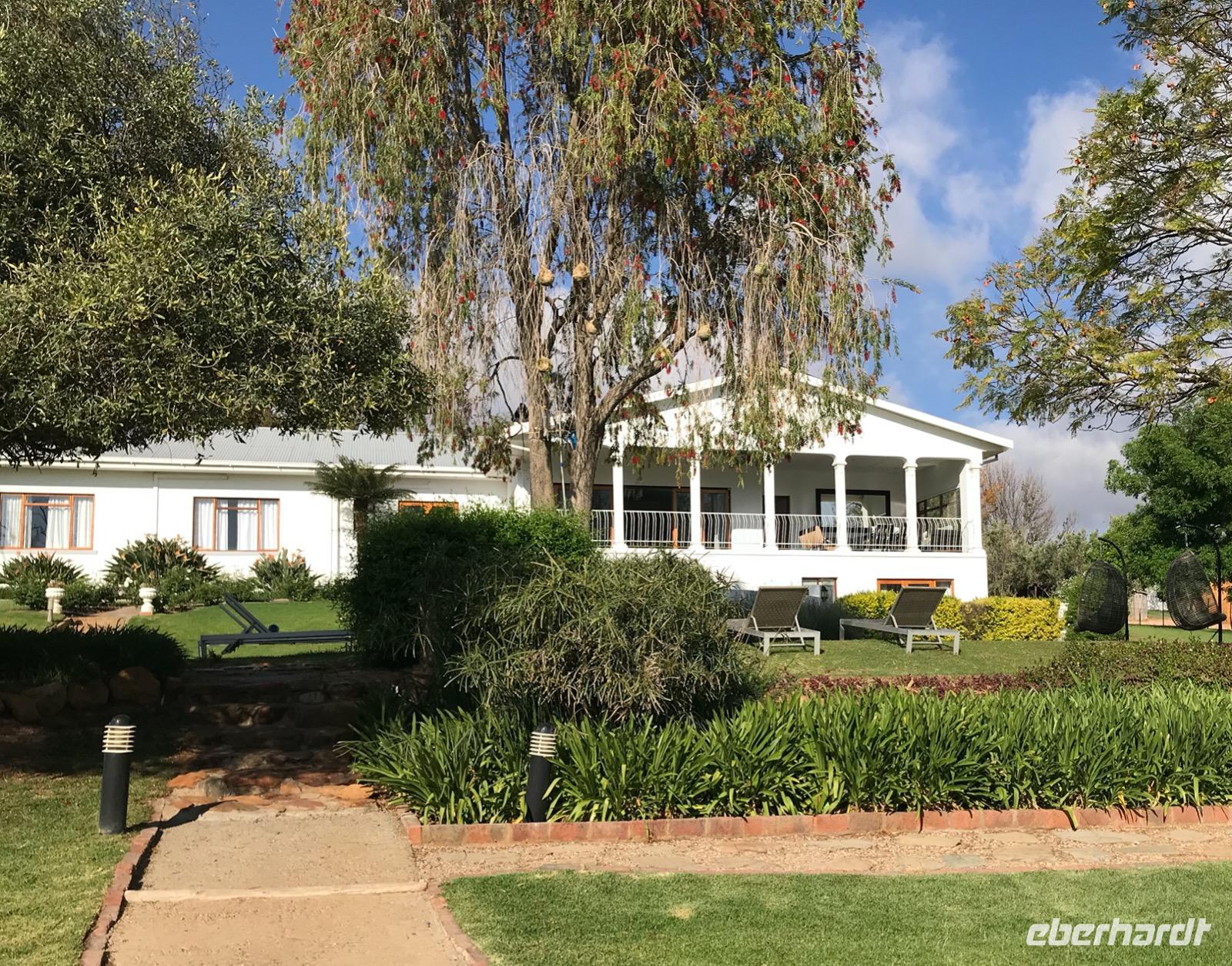 Weiter geht unsere Fahrt über den Robinson Pass nach Oudtshoorn am Fuße der Swartberge, die Straußenhauptstadt in Südafrika. Hier entstanden wunderschöne prächtige Villen der „Straußenbarone" während des Straußenfeder-Booms um 1880. Die Kleine Karoo, in der Oudtshoorn liegt, bietet mit seinem heißen und trockenen Klima ideale Voraussetzungen für die Straußenzucht. Es war für uns heute eine lange Busfahrt und wir sind froh, als wir endlich unser Hotel erreichen. Wir übernachten im SWARTBERG COUNTRY MANOR. Es ist eine kleine Anlage von eleganten kapholländischen Häusern einer ehemaligen Farm. Hier kann man sich gut vom Tag erholen und hat einen weiten Blick in die Landschaft. Und manch einer träumt davon, auch einmal Straußenbaron zu sein.