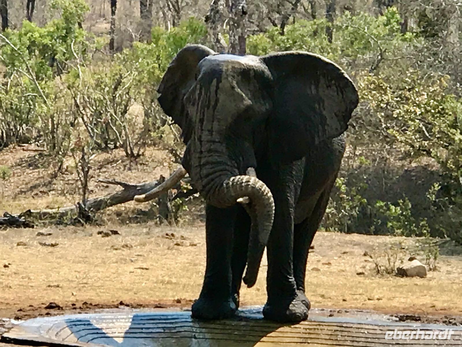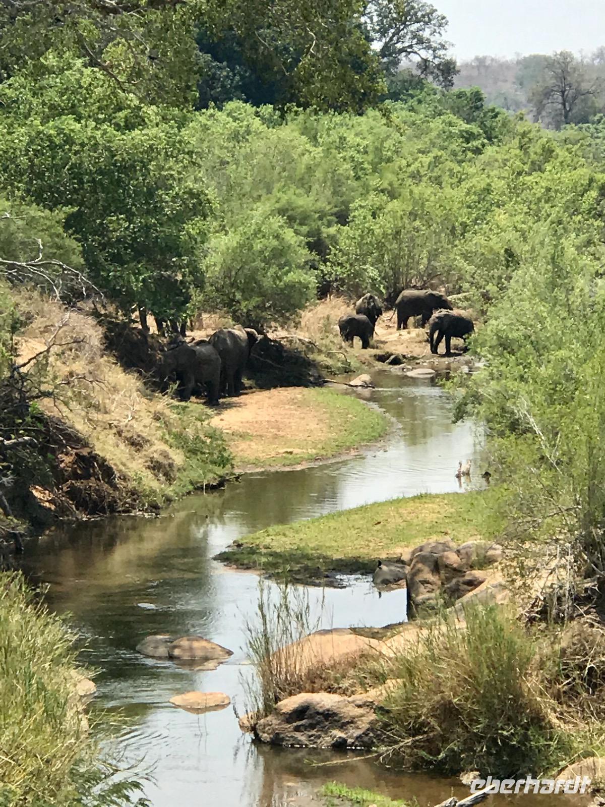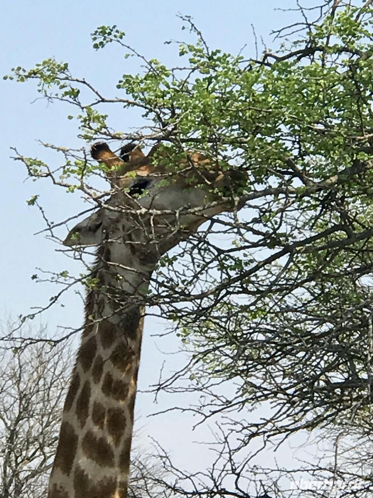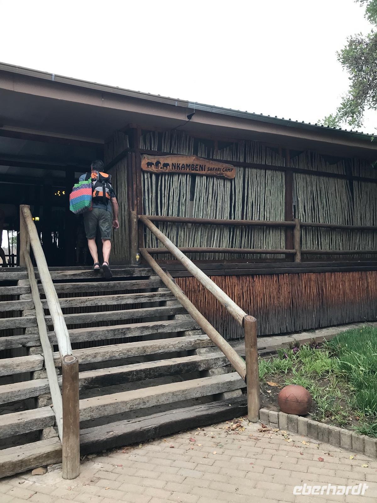 Wir fahren weiter über Hazyview zum NKAMBENI SAFARI CAMP, das sich ganz in der Nähe des Krüger Nationalparks am Numbi Tor befindet. Es ist ein kleines Dorf aus einzelnstehenden Häuschen auf Holzpodests. Die Wände und das Dach der Häuschen bestehen aus Zeltplanen. Gewöhnungsbedürftig, aber interessant. Es gibt sogar drei Duschen, eine innen und zwei außen. Da ist man zunächst skeptisch, aber das ist einfachen nur idyllisch, draußen zu duschen, zumal die Lufttemperaturen inzwischen über 40°C liegen. In der Nacht überrascht uns ein Gewitter mit Prasselregen, grellen Blitzen und kräftigem Donner. Das hat man noch kaum jemals erlebt und einigen von uns ist es nicht gleichgültig im Zelt. Am nächsten Tag ist alles vergessen und die Sonne scheint schon wieder unermüdlich.