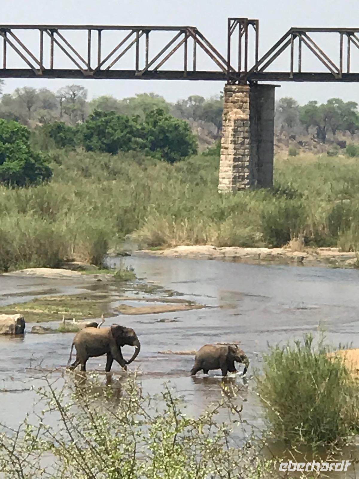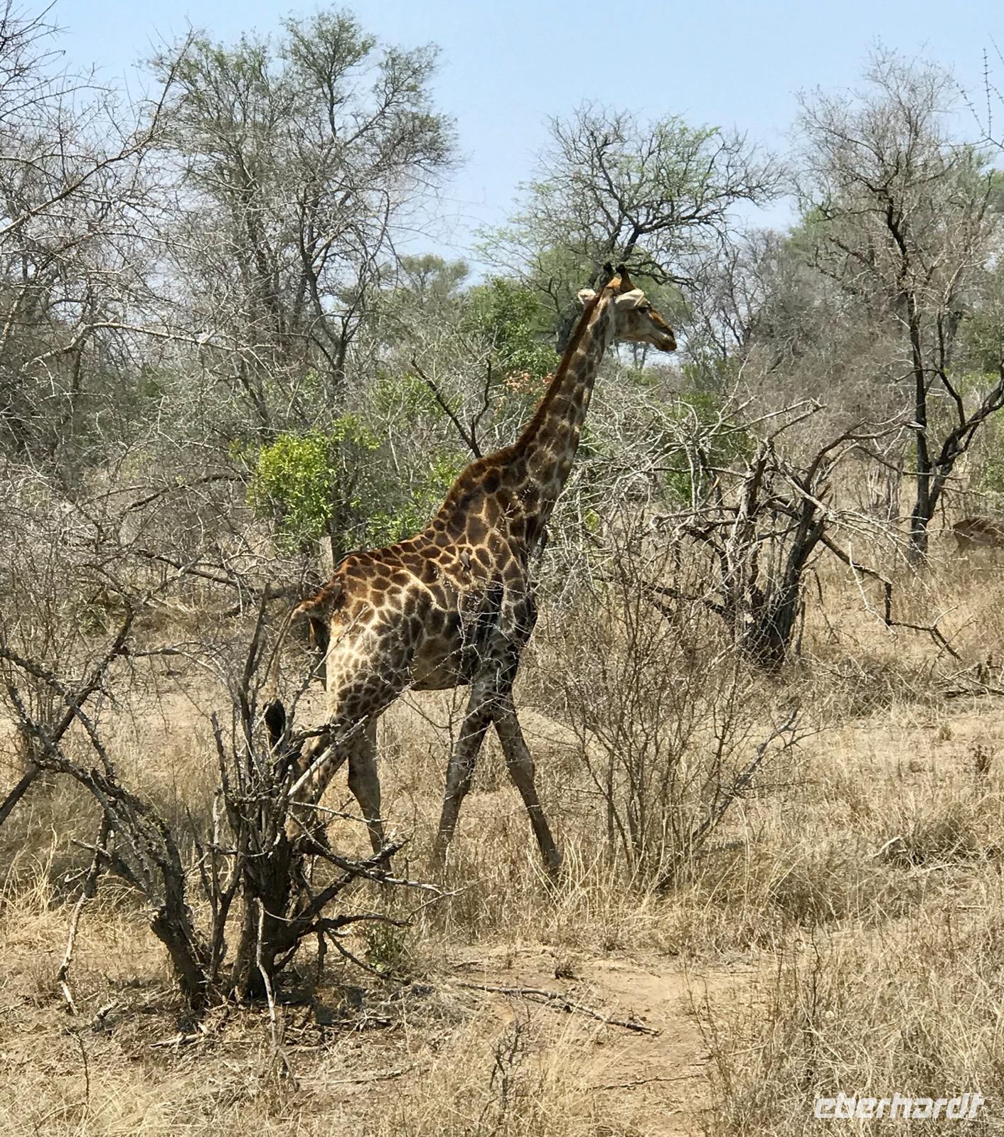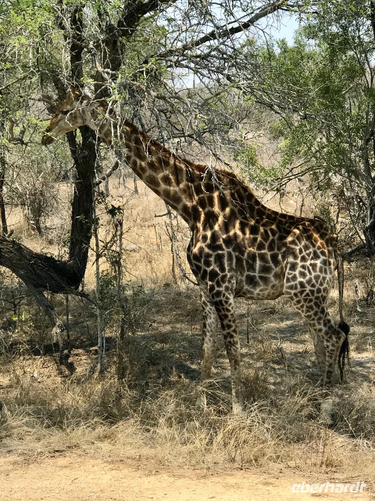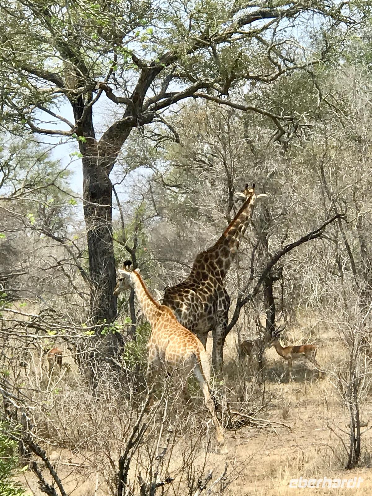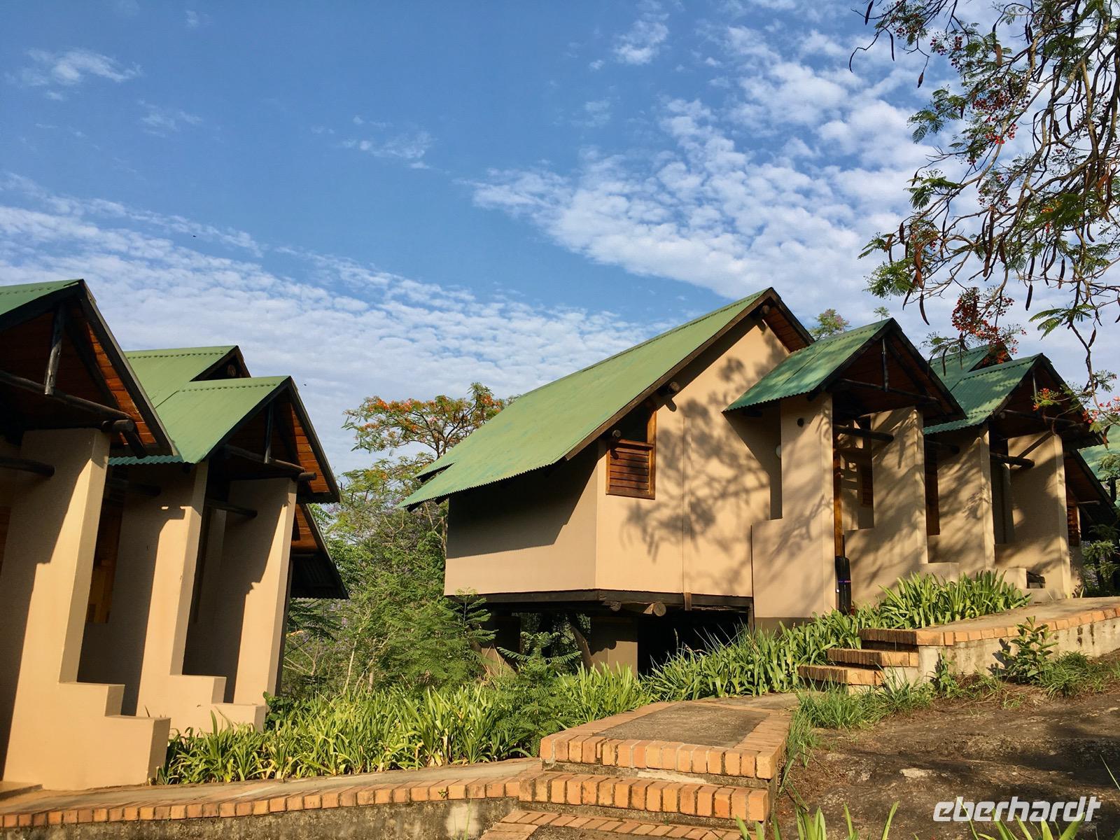 Wir fahren weiter über Hazyview zum NKAMBENI SAFARI CAMP, das sich ganz in der Nähe des Krüger Nationalparks am Numbi Tor befindet. Es ist ein kleines Dorf aus einzelnstehenden Häuschen auf Holzpodests. Die Wände und das Dach der Häuschen bestehen aus Zeltplanen. Gewöhnungsbedürftig, aber interessant. Es gibt sogar drei Duschen, eine innen und zwei außen. Da ist man zunächst skeptisch, aber das ist einfachen nur idyllisch, draußen zu duschen, zumal die Lufttemperaturen inzwischen über 40°C liegen. In der Nacht überrascht uns ein Gewitter mit Prasselregen, grellen Blitzen und kräftigem Donner. Das hat man noch kaum jemals erlebt und einigen von uns ist es nicht gleichgültig im Zelt. Am nächsten Tag ist alles vergessen und die Sonne scheint schon wieder unermüdlich.