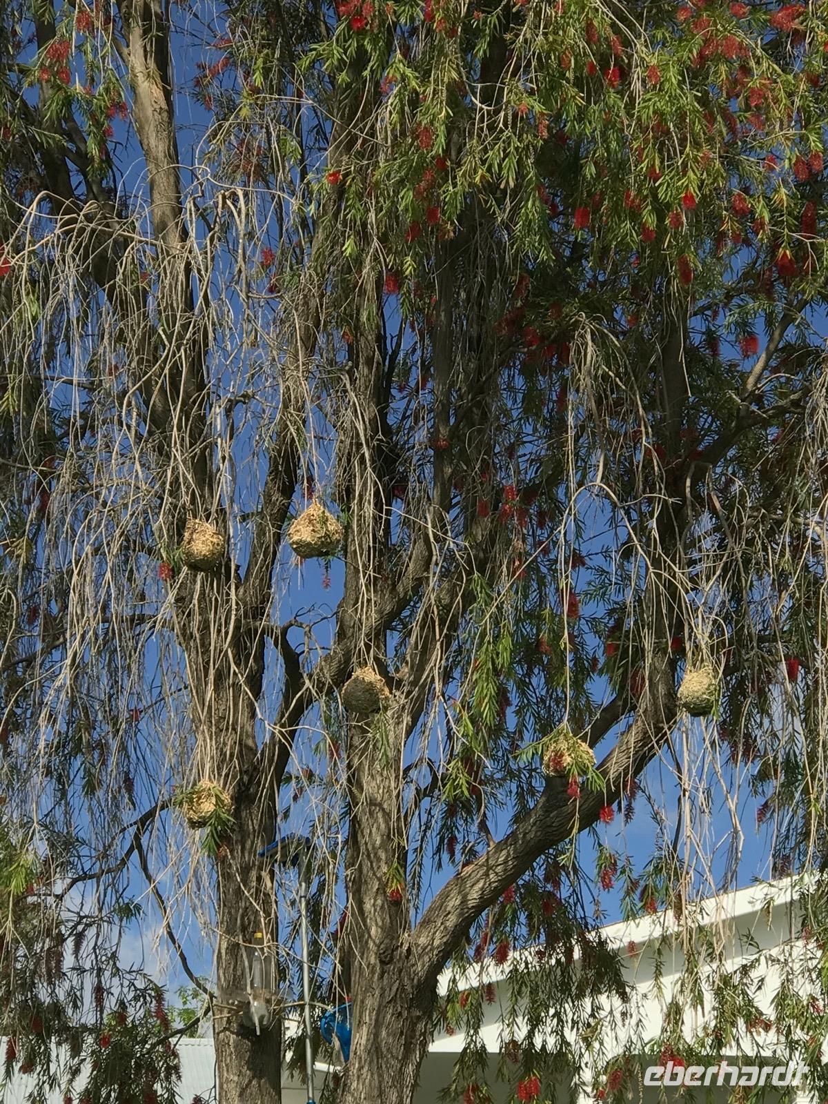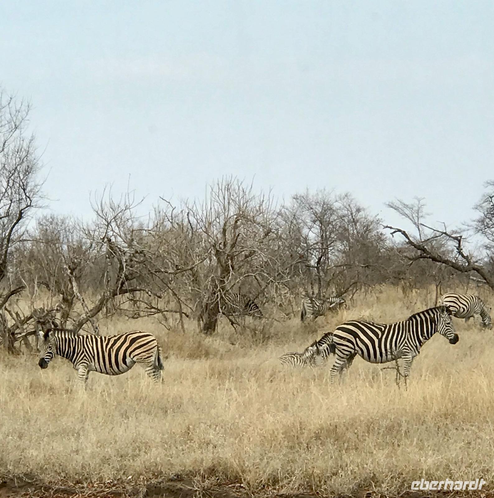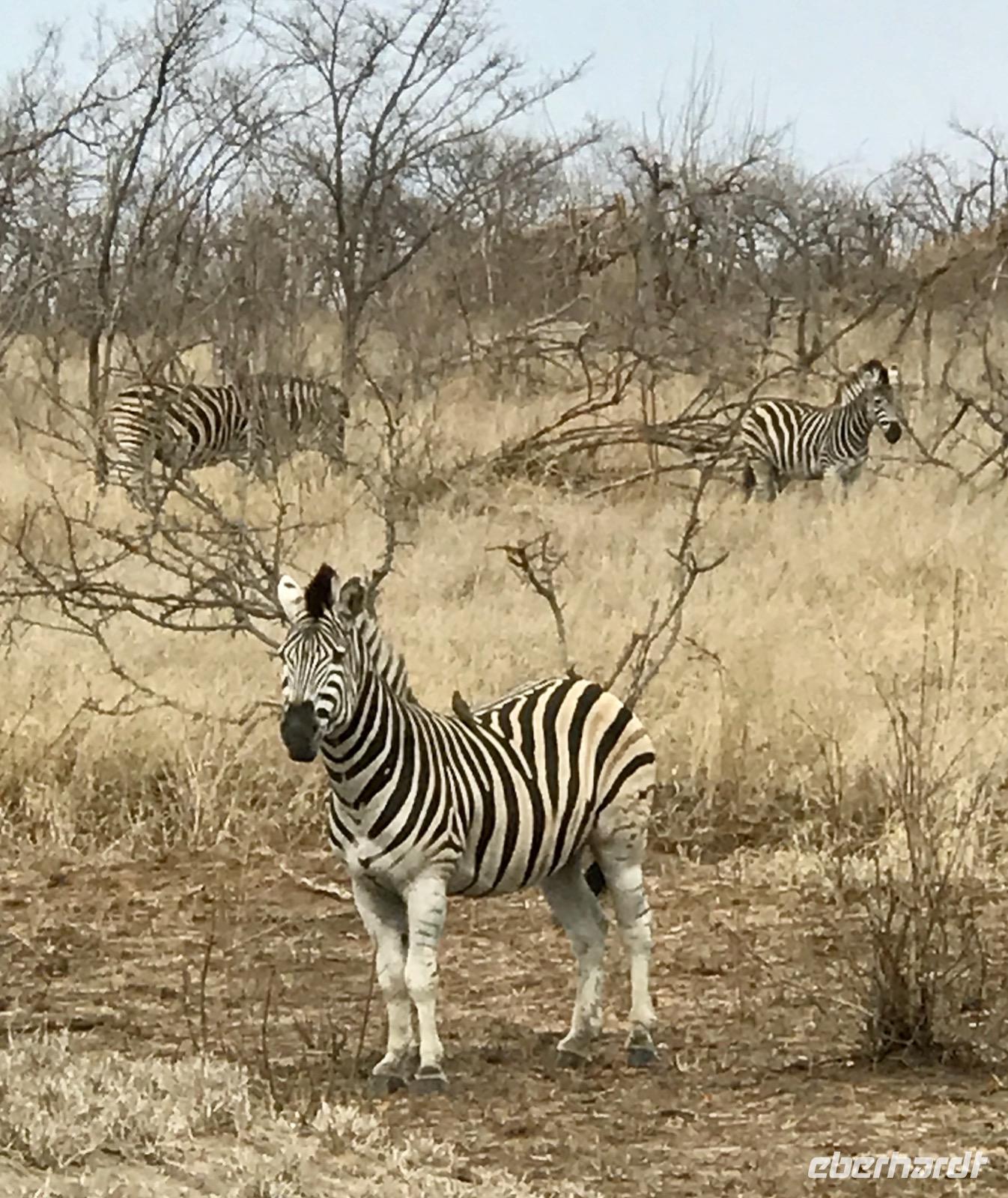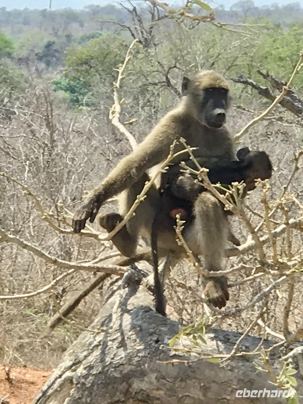 Wir fahren weiter über Hazyview zum NKAMBENI SAFARI CAMP, das sich ganz in der Nähe des Krüger Nationalparks am Numbi Tor befindet. Es ist ein kleines Dorf aus einzelnstehenden Häuschen auf Holzpodests. Die Wände und das Dach der Häuschen bestehen aus Zeltplanen. Gewöhnungsbedürftig, aber interessant. Es gibt sogar drei Duschen, eine innen und zwei außen. Da ist man zunächst skeptisch, aber das ist einfachen nur idyllisch, draußen zu duschen, zumal die Lufttemperaturen inzwischen über 40°C liegen. In der Nacht überrascht uns ein Gewitter mit Prasselregen, grellen Blitzen und kräftigem Donner. Das hat man noch kaum jemals erlebt und einigen von uns ist es nicht gleichgültig im Zelt. Am nächsten Tag ist alles vergessen und die Sonne scheint schon wieder unermüdlich.