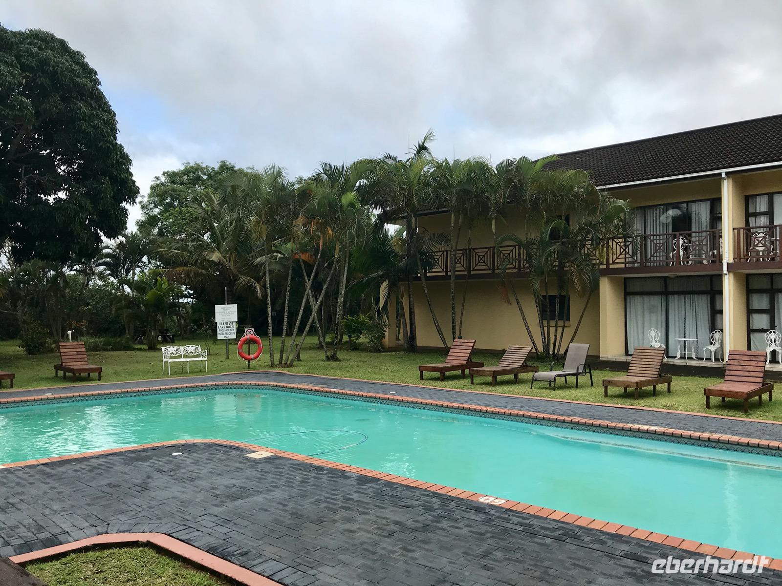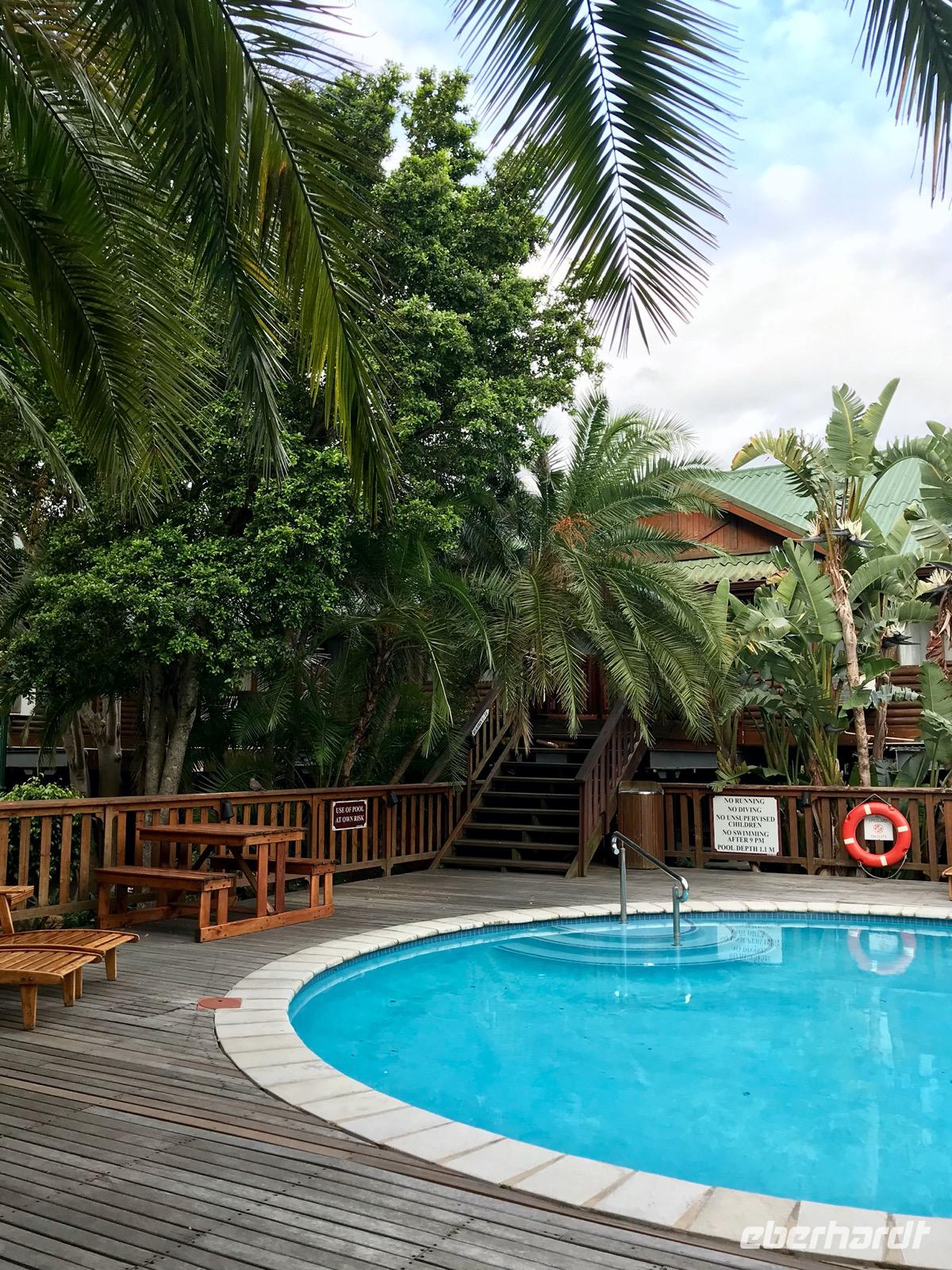Am Abend übernachten wir im ELEPHANT LAKE Hotel in St. Lucia. Das Dorf liegt auf einer Halbinsel, die den Indischen Ozean von dem großen St. Lucia-See trennt. Es ist wohl einer der wenigen Orte in Südafrika, wo allabendlich Flusspferde und Warzenschweine auf den Straßen und in den Gärten zu finden sind, vielleicht sogar im Pool unseres Hotels. Es wird zumindest erzählt, gesehen haben wir es nicht.