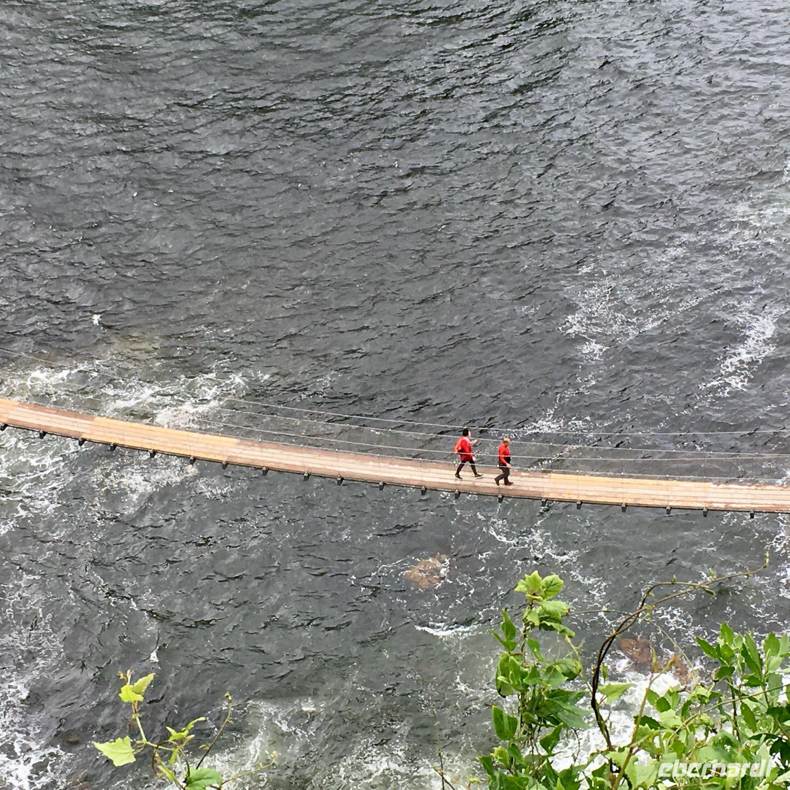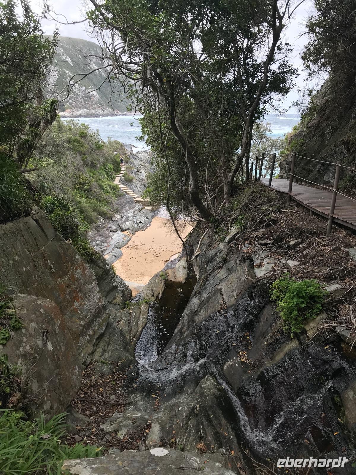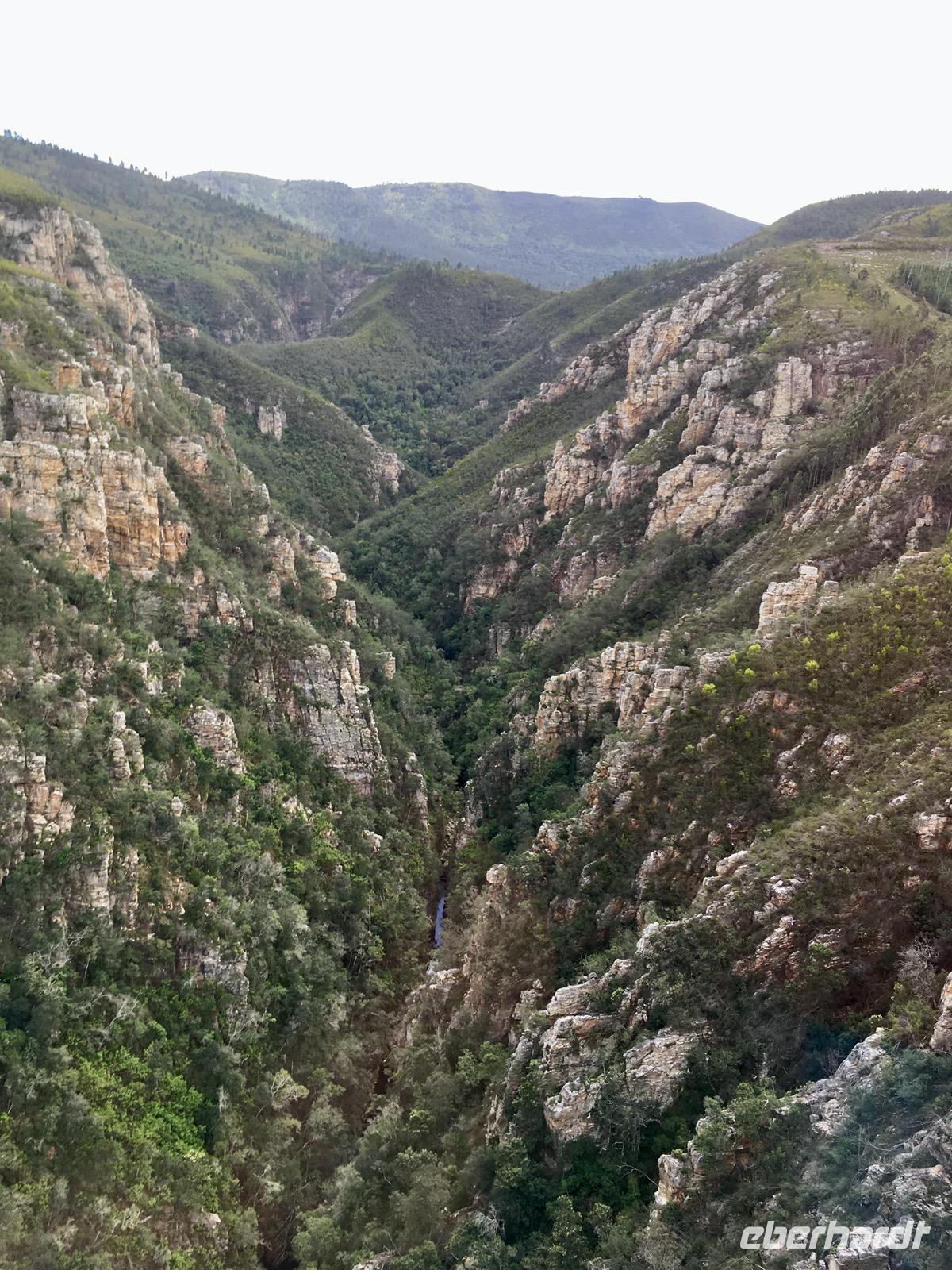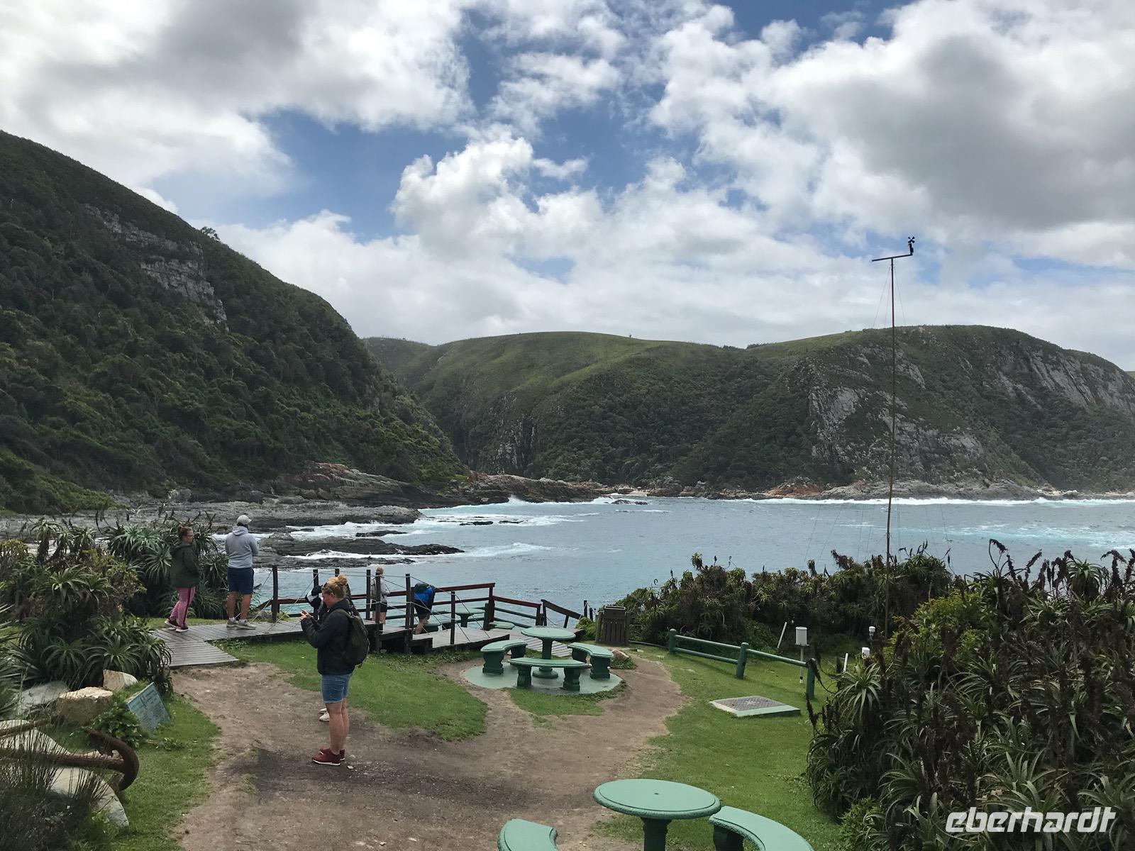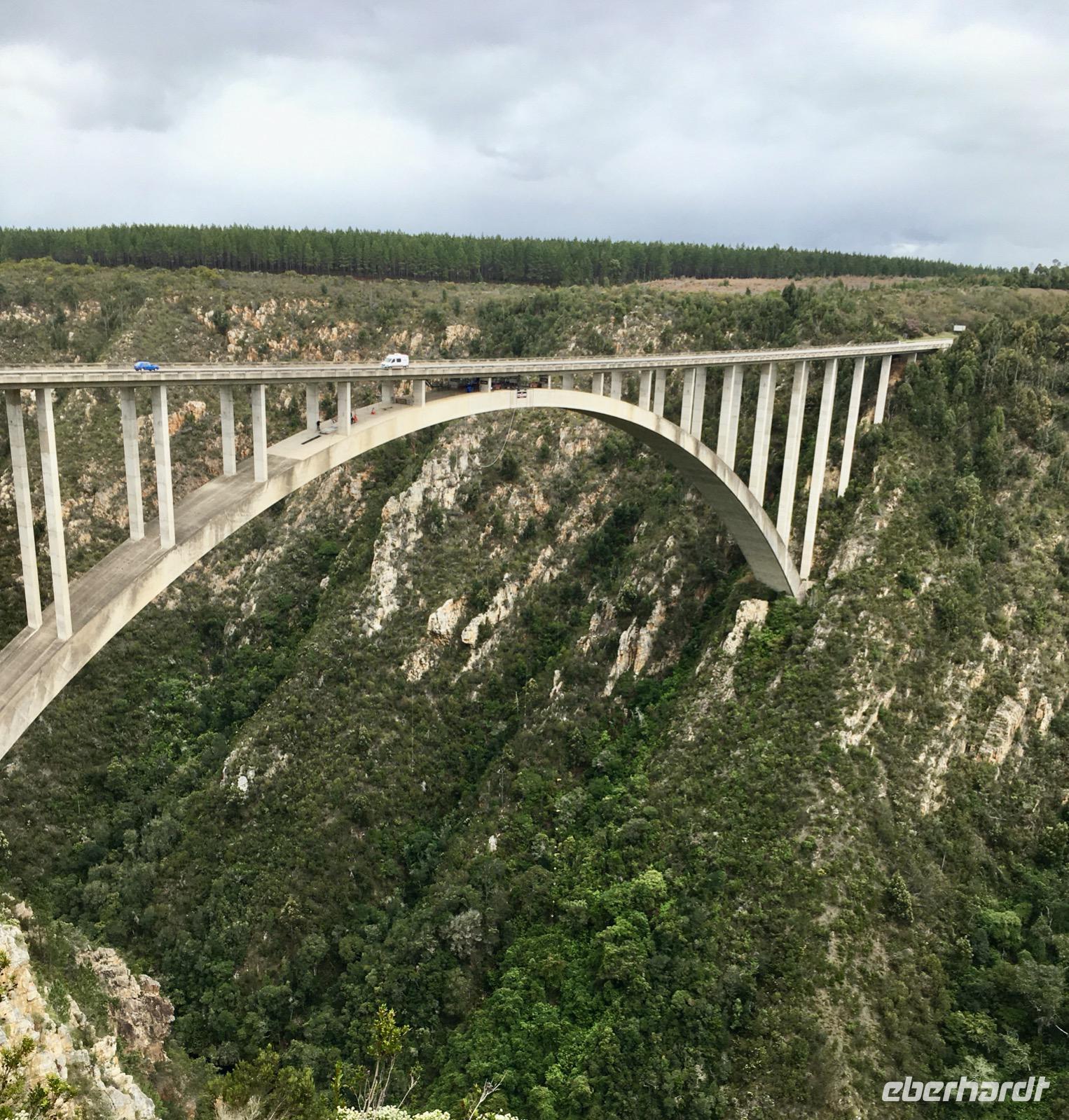 Zunächst wollen wir den Tsitsikamma National Park besuchen. An der Brücke über den Bloukrans River halten wir an, um den wagehalsigen Bungee-Springern beim Sprung in die 216 m tiefe Schlucht zusehen zu können, der weltweit höchste Bungee-Sprung. Später erreichen wir eine Bucht, wo wir eine kleine Wanderung auf einem befestigten Weg unternehmen und über Hängebrücken die Flussarme überwinden müssen. Bei der Rückkehr nach diesem Abenteuer wartet auf uns ein deftiges Picknick mit afrikanischen Spezialitäten und der Wein fehlt auch nicht. Danke an Eberhardt Travel für diese Überraschung.