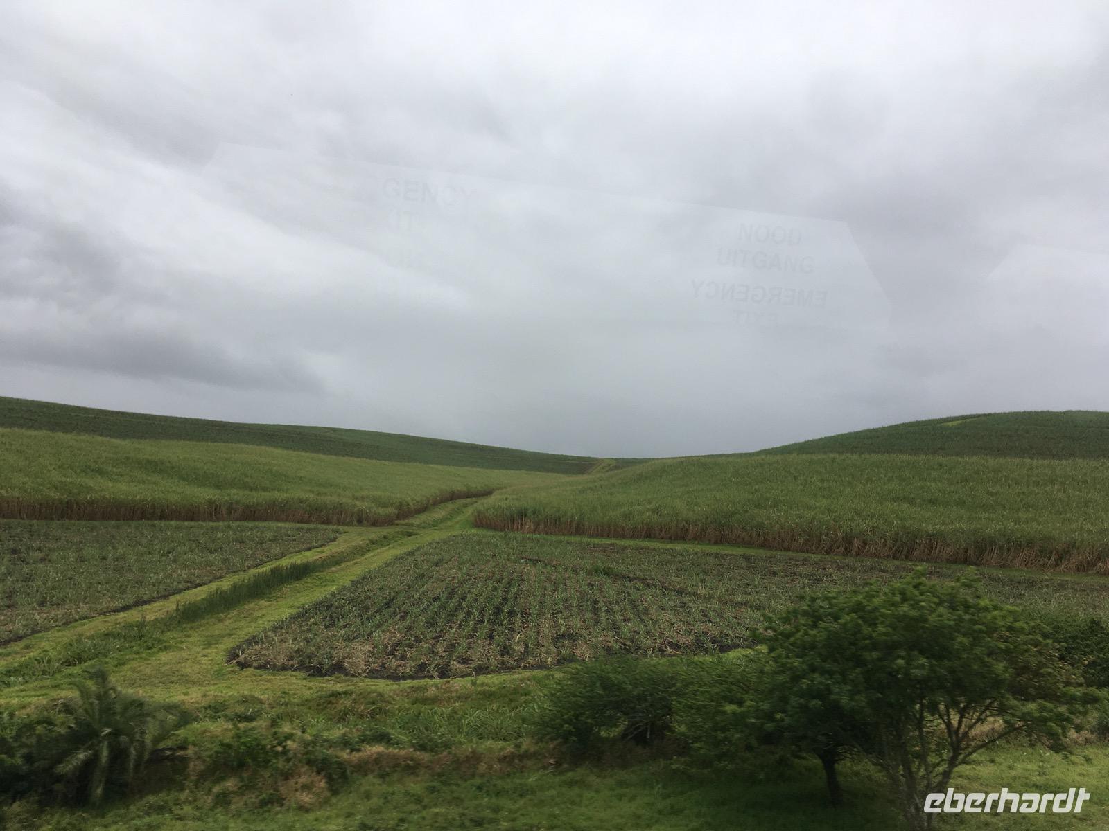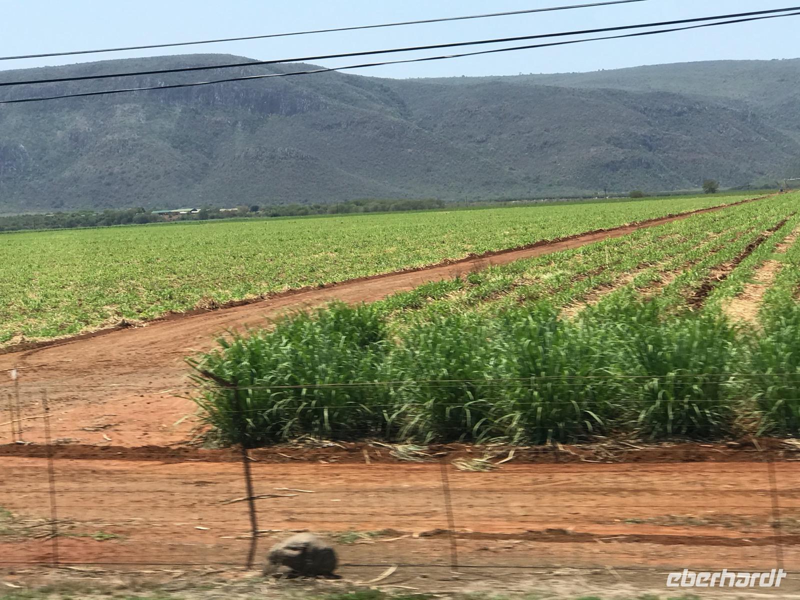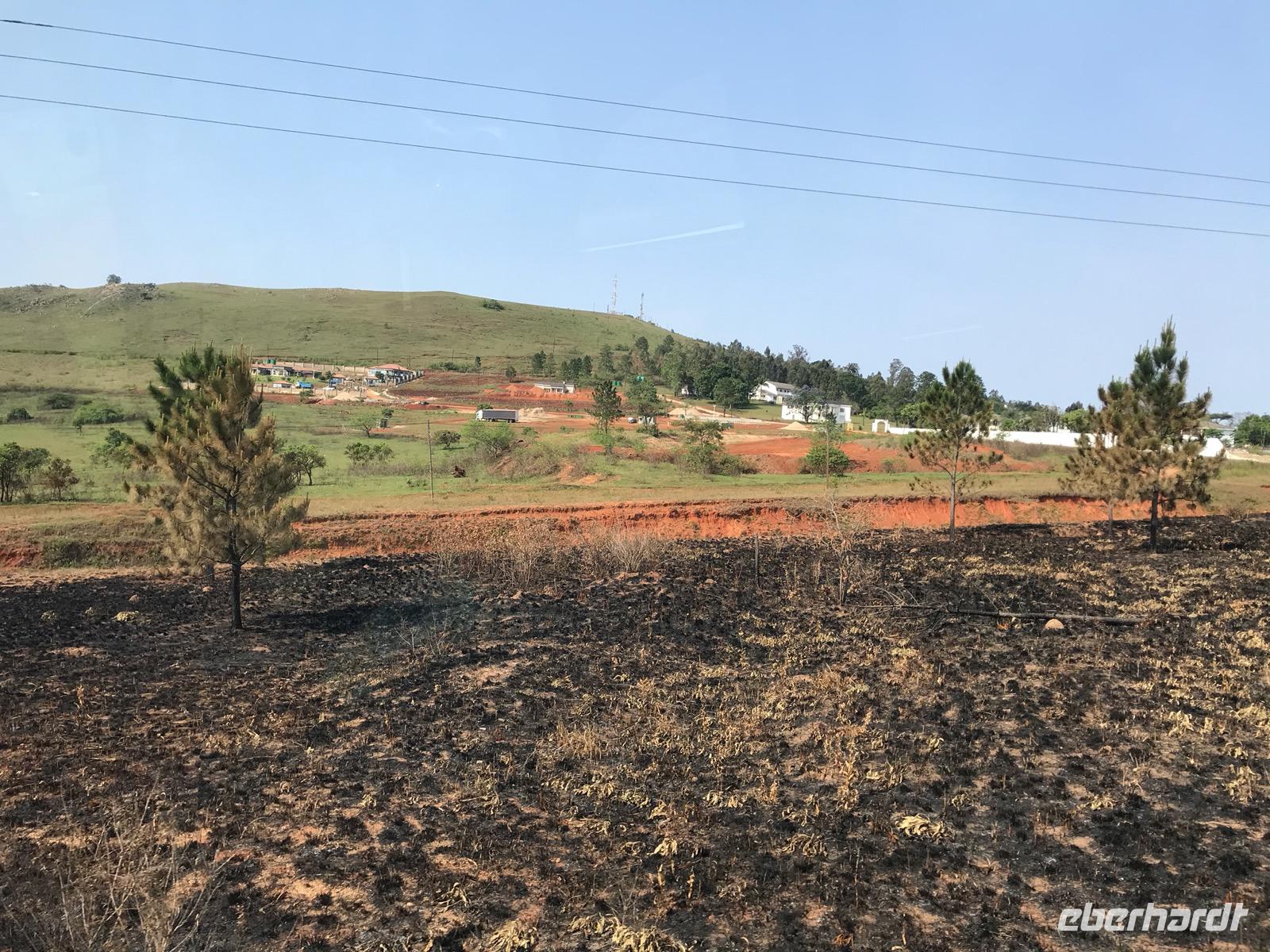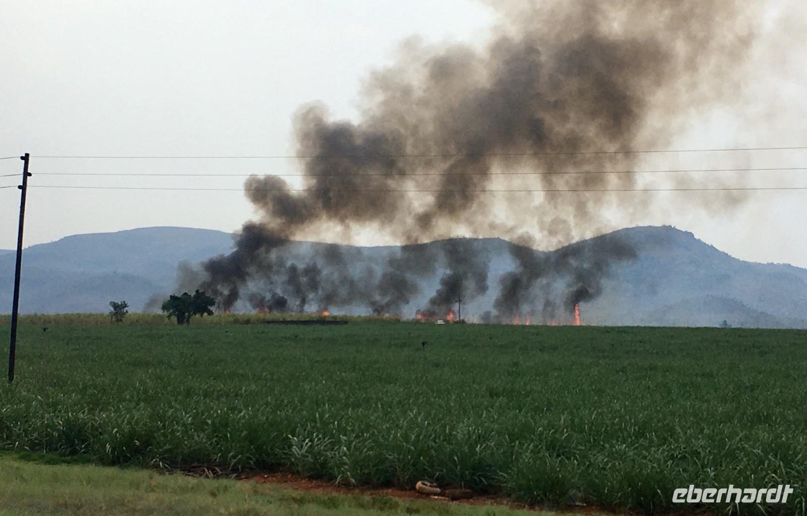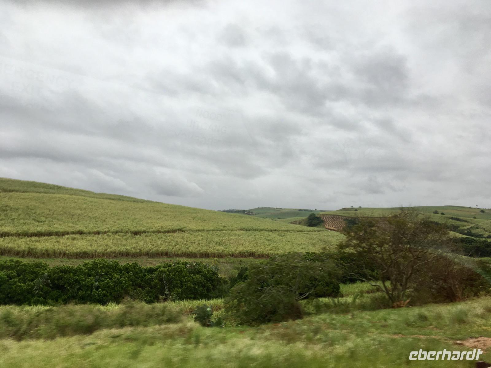 Wir setzen unsere Reise auf der N2 durch die Region KwaZulu-Natal recht zügig fort, denn der Weg ist noch weit. Welliges Hügelland, schöne Strände und wildes Bergland bestimmen die östliche Kapregion. Hier ist uns der warme Indische Ozean nahe. Der Portugiese Vasco da Gama war es, der Ende des 15. Jahrhunderts an einem Weihnachtstag in einer Bucht landete und diesen Ort Port Natal (Weihnachten) benannte, jetzt Durban. Heute erstrecken sich hier im subtropischen Zululand überall Zuckerrohrplantagen. Wir erleben gerade die Ernte des Zuckerrohrs und sehen, wie die Farmer das Kraut abbrennen.