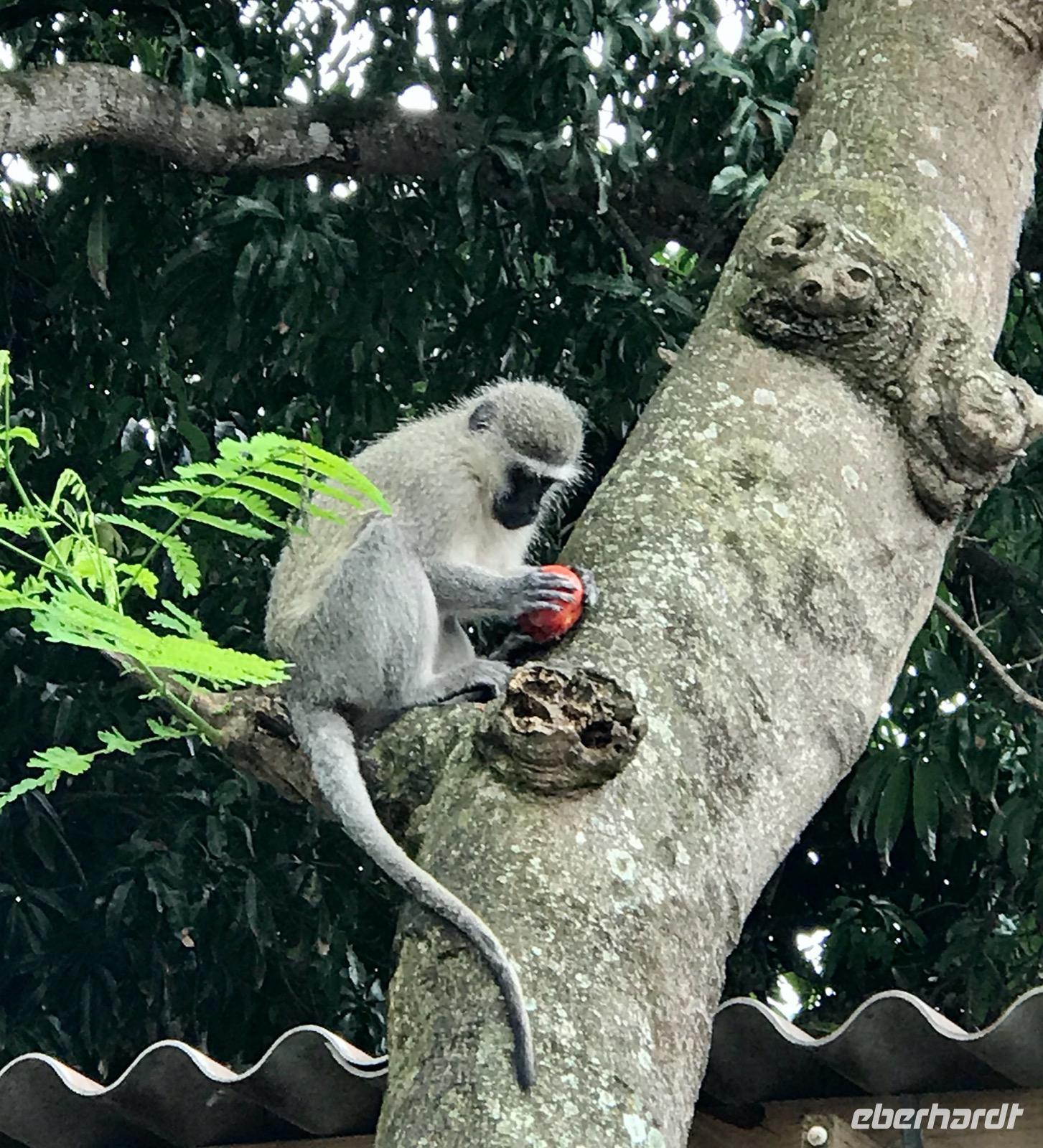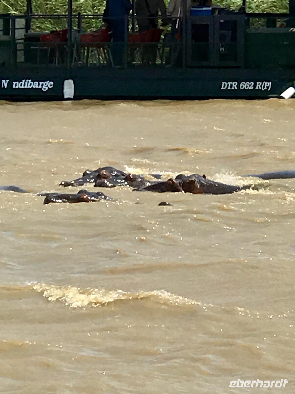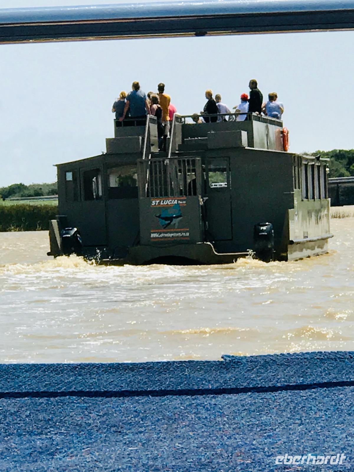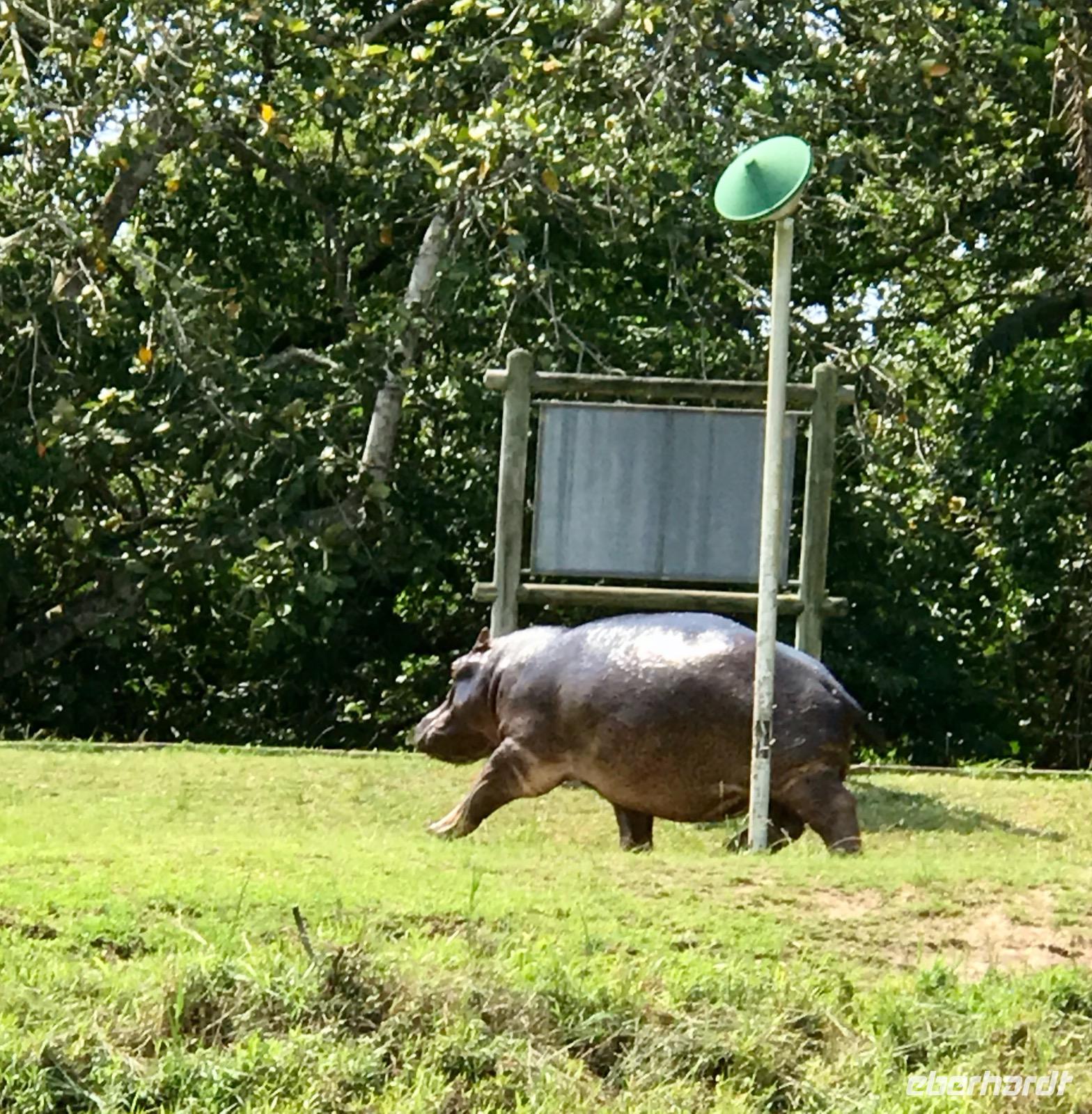 Am Vormittag begeben wir uns zur Bootsanlegestelle für unsere Bootsfahrt auf dem Lake St. Lucia. Als wir gerade das Boot bestiegen haben, erleben wir ein Naturereignis, das man nicht so oft sehen kann, wie uns der Guide bestätigt. Plötzlich tauchen aus dem See zwei männliche Flusspferde auf, wobei das jüngere ziellos in das Dorf rennt und das ältere die Verfolgung aufnimmt, aber dann doch aufgibt. Der Kampf um die männliche Vorherrschaft in der Familie. Nur gut, dass wir nicht am Ufer standen und dem Flusspferd im Wege waren. Auf dem See selbst erleben wir eine tolle Landschaft und eine ökologische Gemeinschaft von Flusspferden, Krokodilen und verschiedene Vogelarten. Anschließend bummeln wir die Hauptstraße entlang und genießen an einem Stand frische Babyananas. Da lernen wir gleich, wie man diese Frucht ganz schnell und einfach aufschneidet und sozusagen als Eistüte essen kann. Ein wunderbarer Mittagssnack.