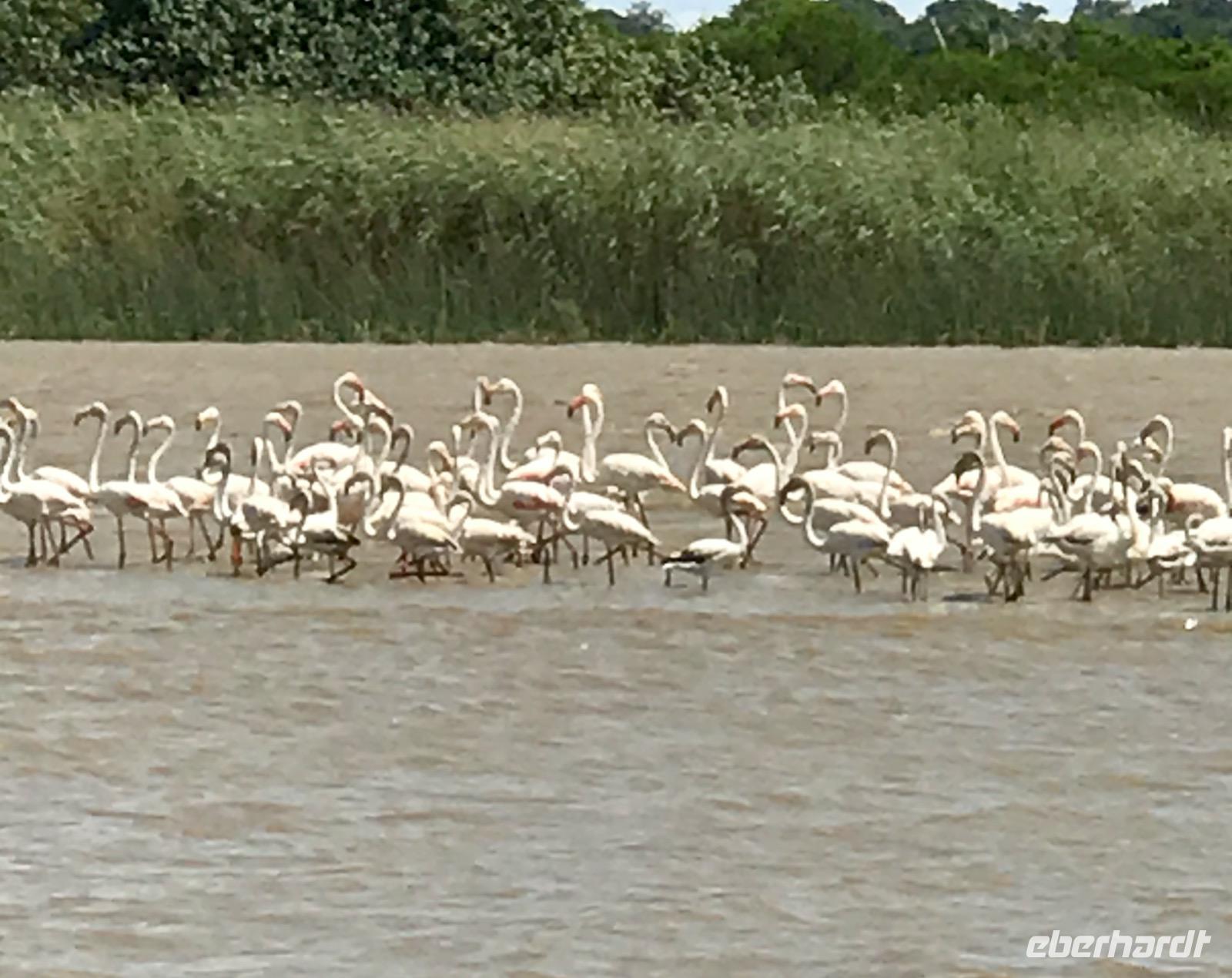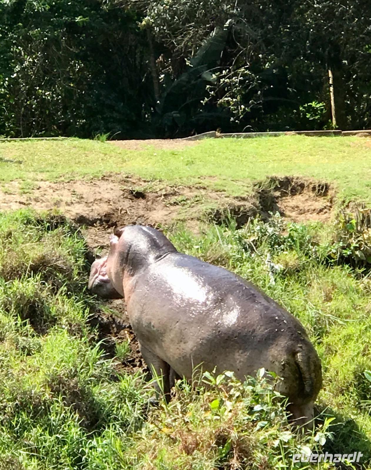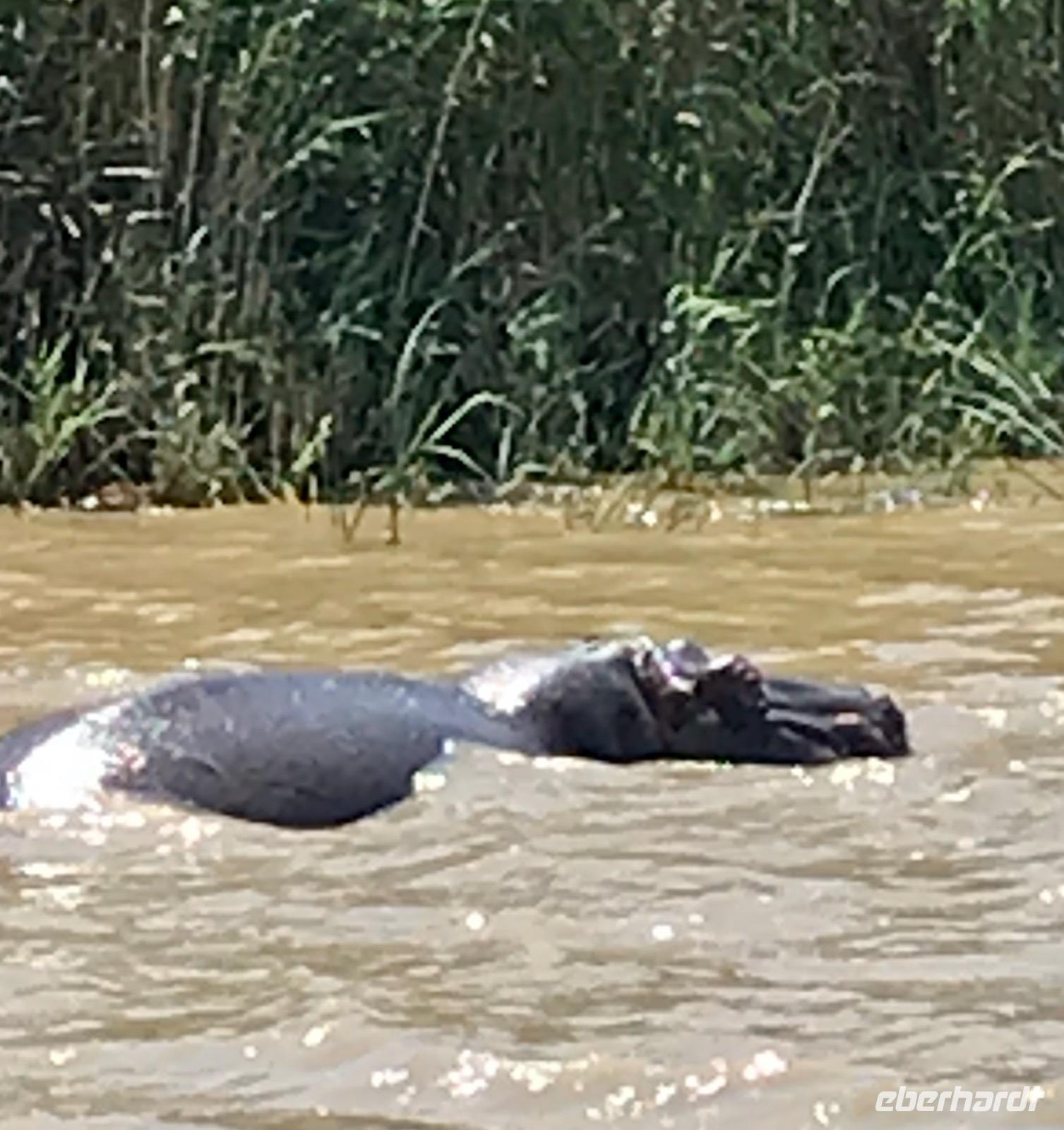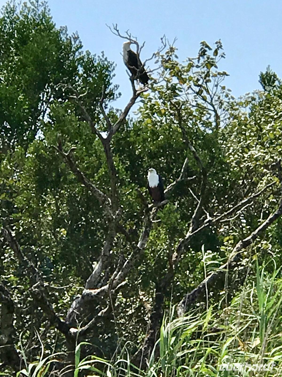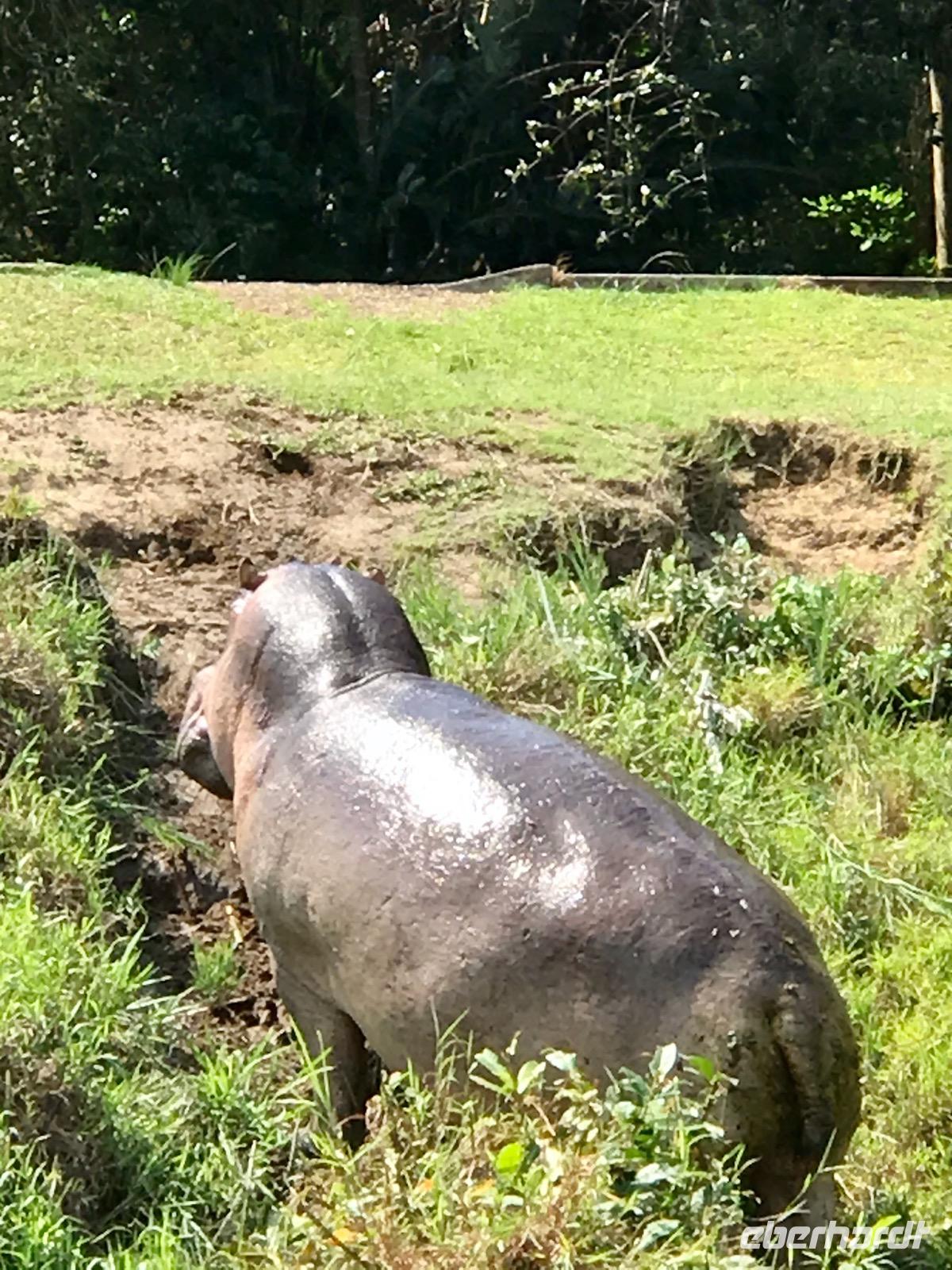 Am Vormittag begeben wir uns zur Bootsanlegestelle für unsere Bootsfahrt auf dem Lake St. Lucia. Als wir gerade das Boot bestiegen haben, erleben wir ein Naturereignis, das man nicht so oft sehen kann, wie uns der Guide bestätigt. Plötzlich tauchen aus dem See zwei männliche Flusspferde auf, wobei das jüngere ziellos in das Dorf rennt und das ältere die Verfolgung aufnimmt, aber dann doch aufgibt. Der Kampf um die männliche Vorherrschaft in der Familie. Nur gut, dass wir nicht am Ufer standen und dem Flusspferd im Wege waren. Auf dem See selbst erleben wir eine tolle Landschaft und eine ökologische Gemeinschaft von Flusspferden, Krokodilen und verschiedene Vogelarten. Anschließend bummeln wir die Hauptstraße entlang und genießen an einem Stand frische Babyananas. Da lernen wir gleich, wie man diese Frucht ganz schnell und einfach aufschneidet und sozusagen als Eistüte essen kann. Ein wunderbarer Mittagssnack.