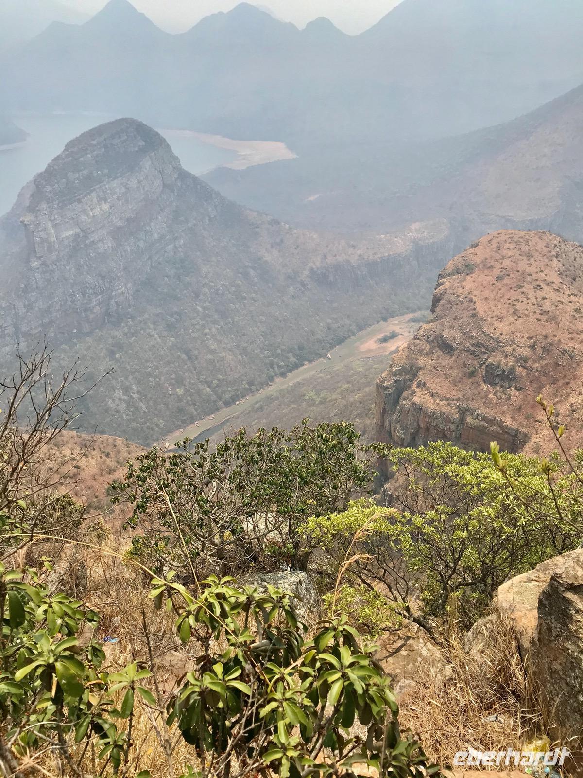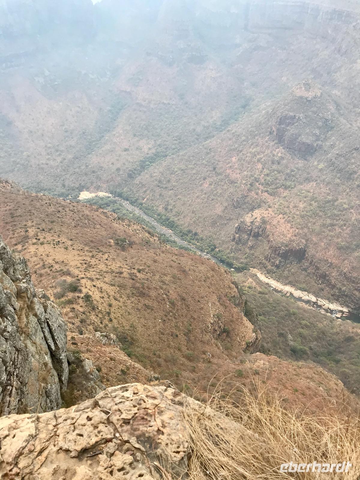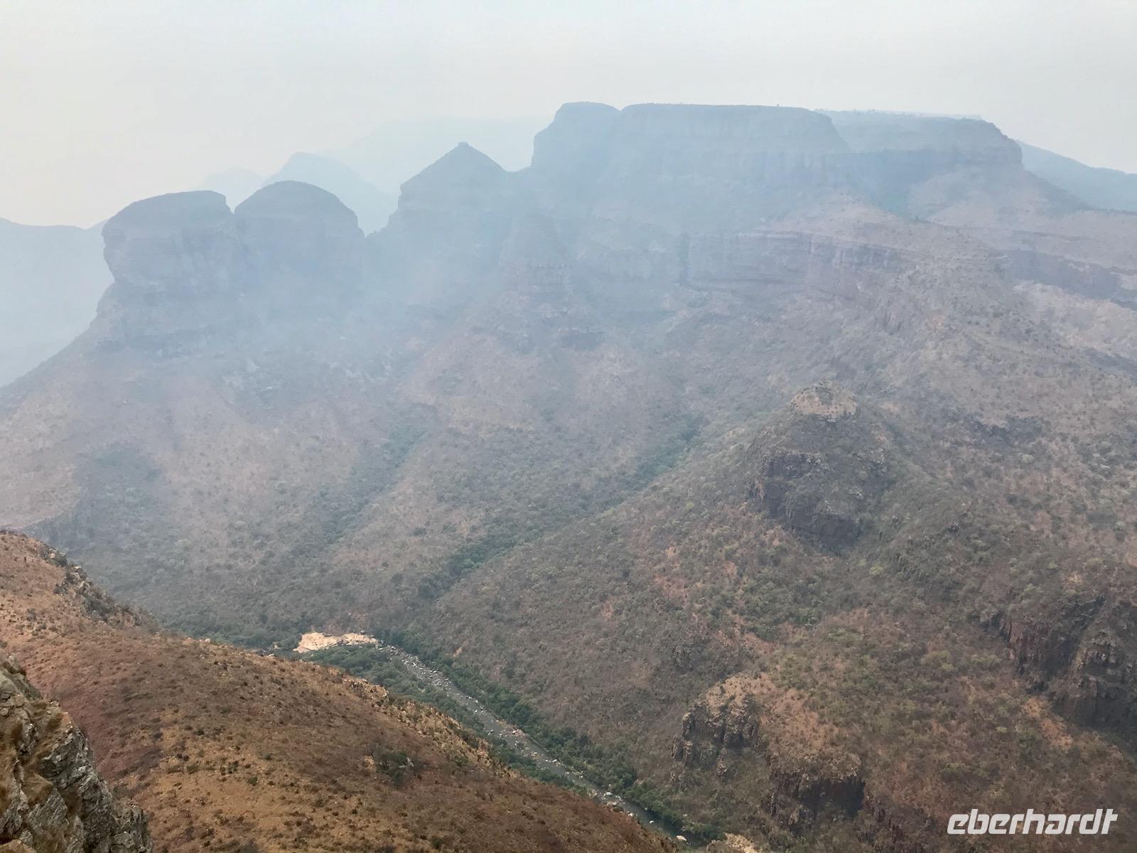 Unser heutiger Ausflug folgt einer Reihe von Ausflugszielen an der Panoramastraße. Zunächst fahren wir bis zum Blyde River Canyon, wo es mehrere Aussichtspunkte an den Klippen gibt. Der Blyde River (Fluss der Freude) hat sich über Jahrtausende eine 20 km lange Schlucht durch Schiefer- und Quarzstein geschaffen. Fast 700 Meter geht es in die Tiefe. Leider ist der Ausblick nebelverhangen und sehr diesig. Da kann man auf den Fotos das grandiose Bild dieser Landschaft nur erahnen.